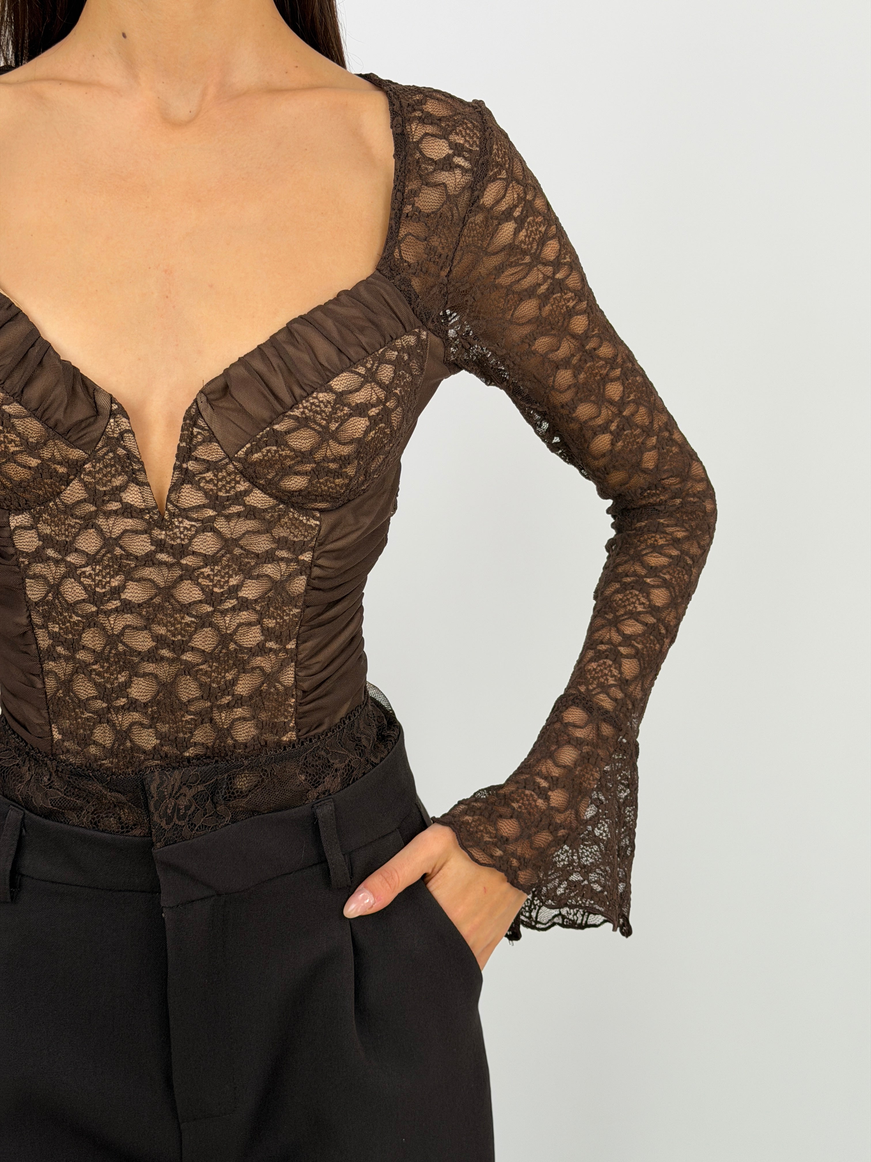Body marrone a manica lunga con coppe preformate, tessuto combinato in pizzo ed elasticizzato con arricciature