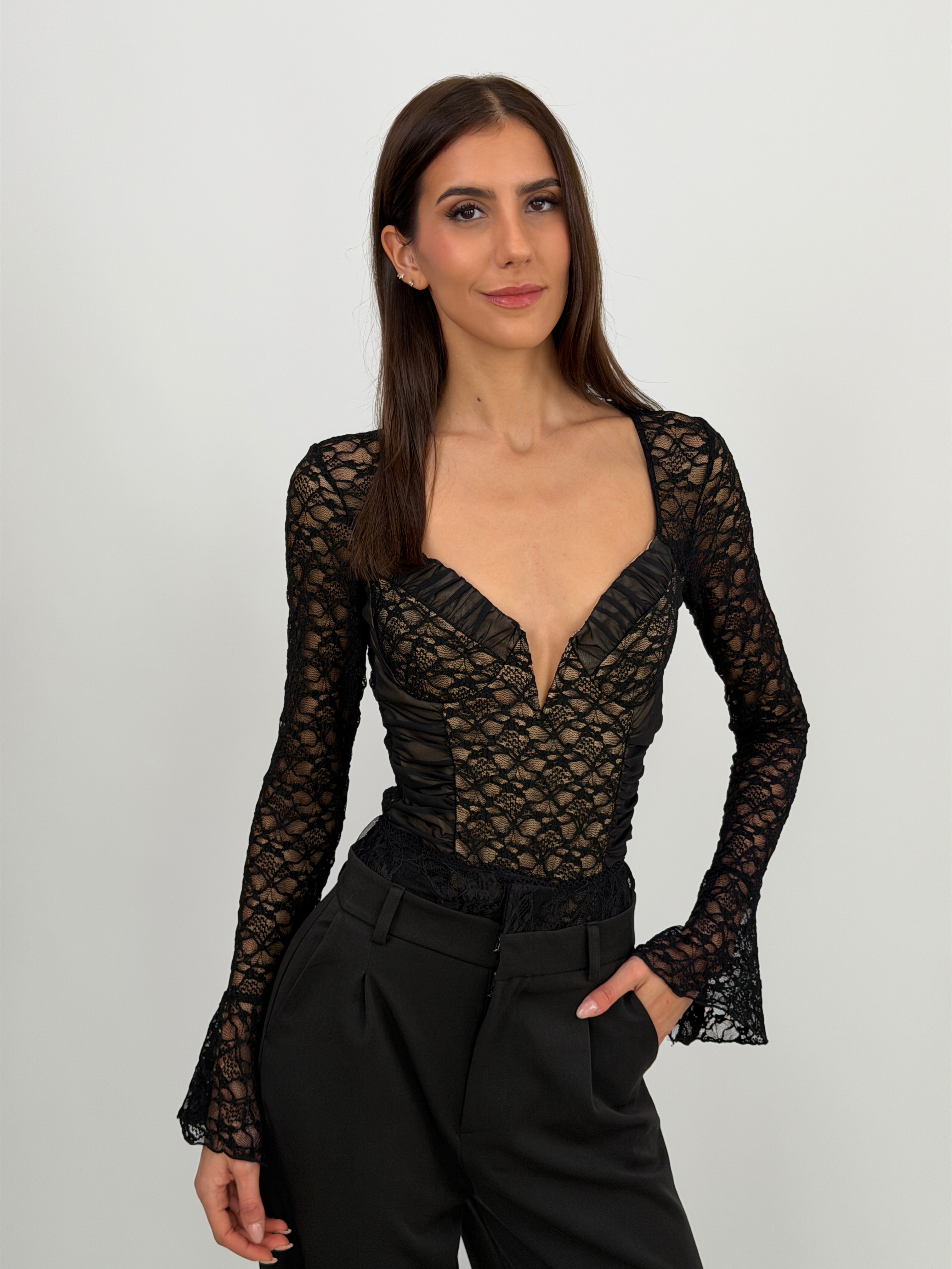 Body nero a manica lunga con coppe preformate, tessuto combinato in pizzo ed elasticizzato con arricciature