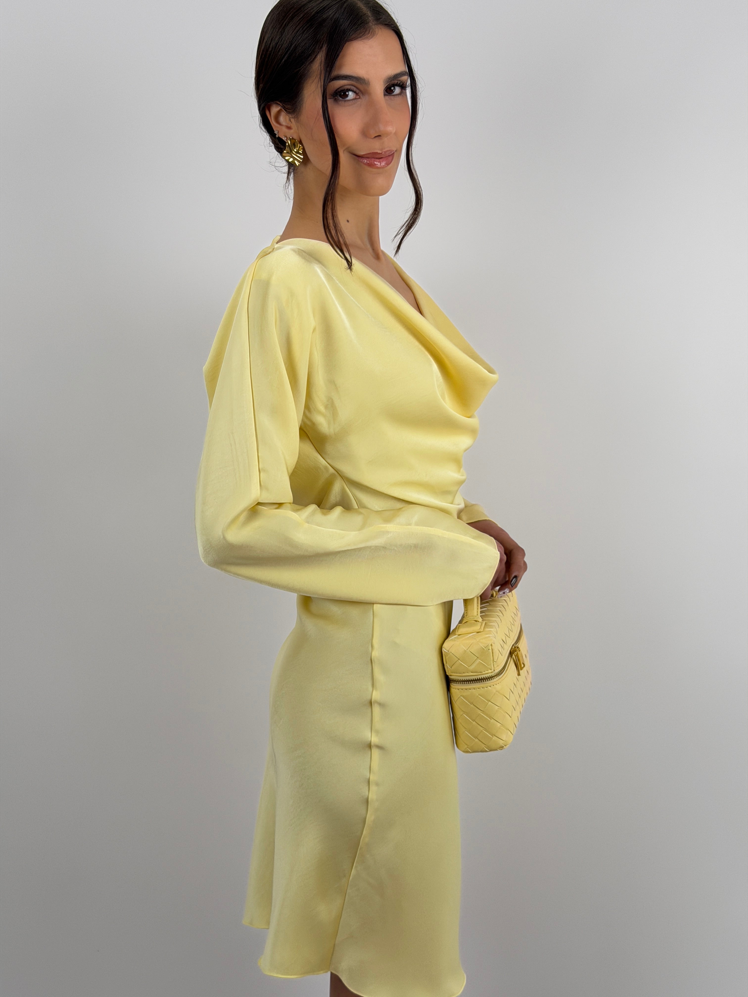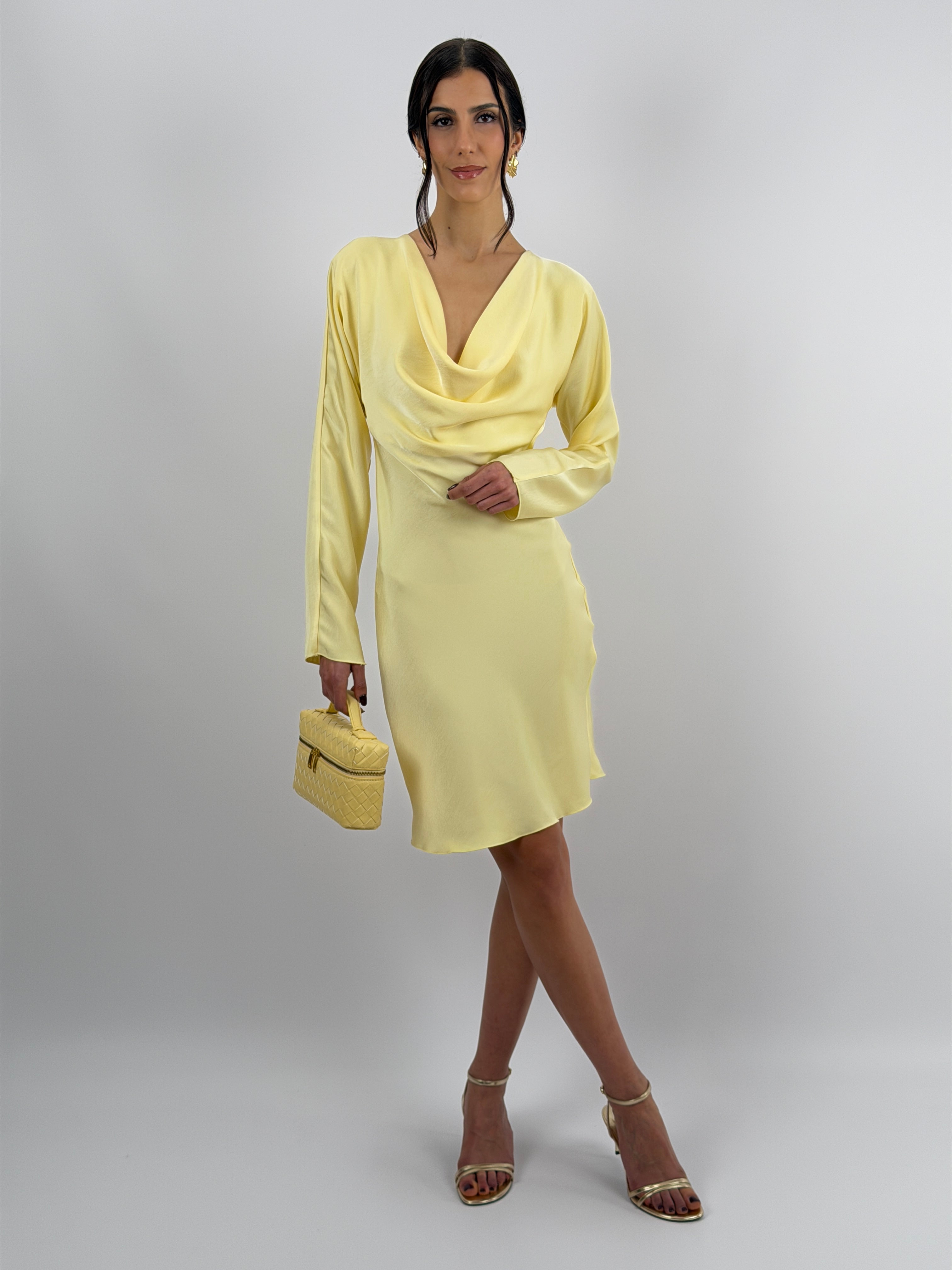 Abito giallo corto fluido in tessuto satinato con maniche lunghe e scollo morbido sul davanti e sul retro