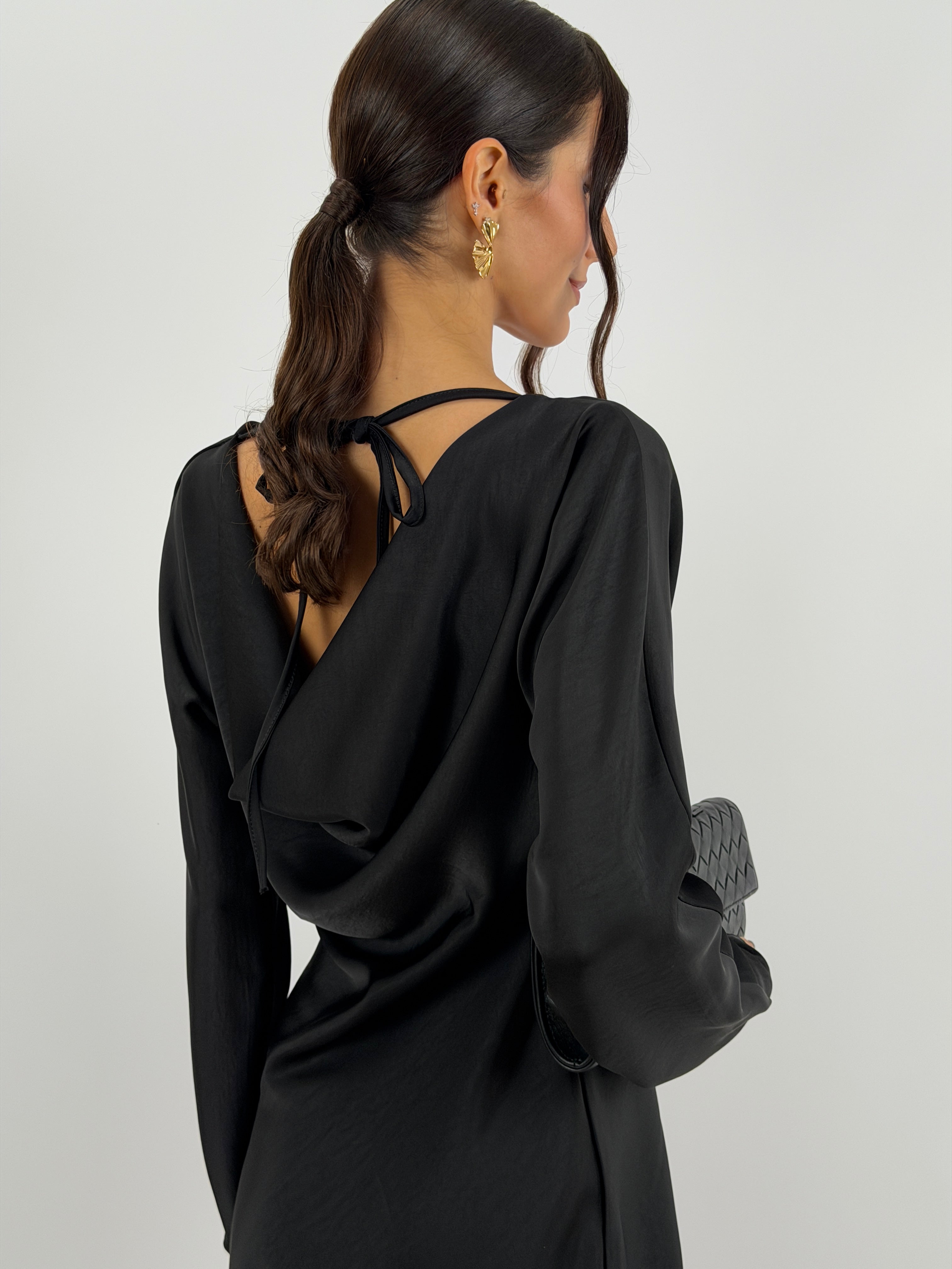 Abito nero corto fluido in tessuto satinato con maniche lunghe e scollo morbido sul davanti e sul retro