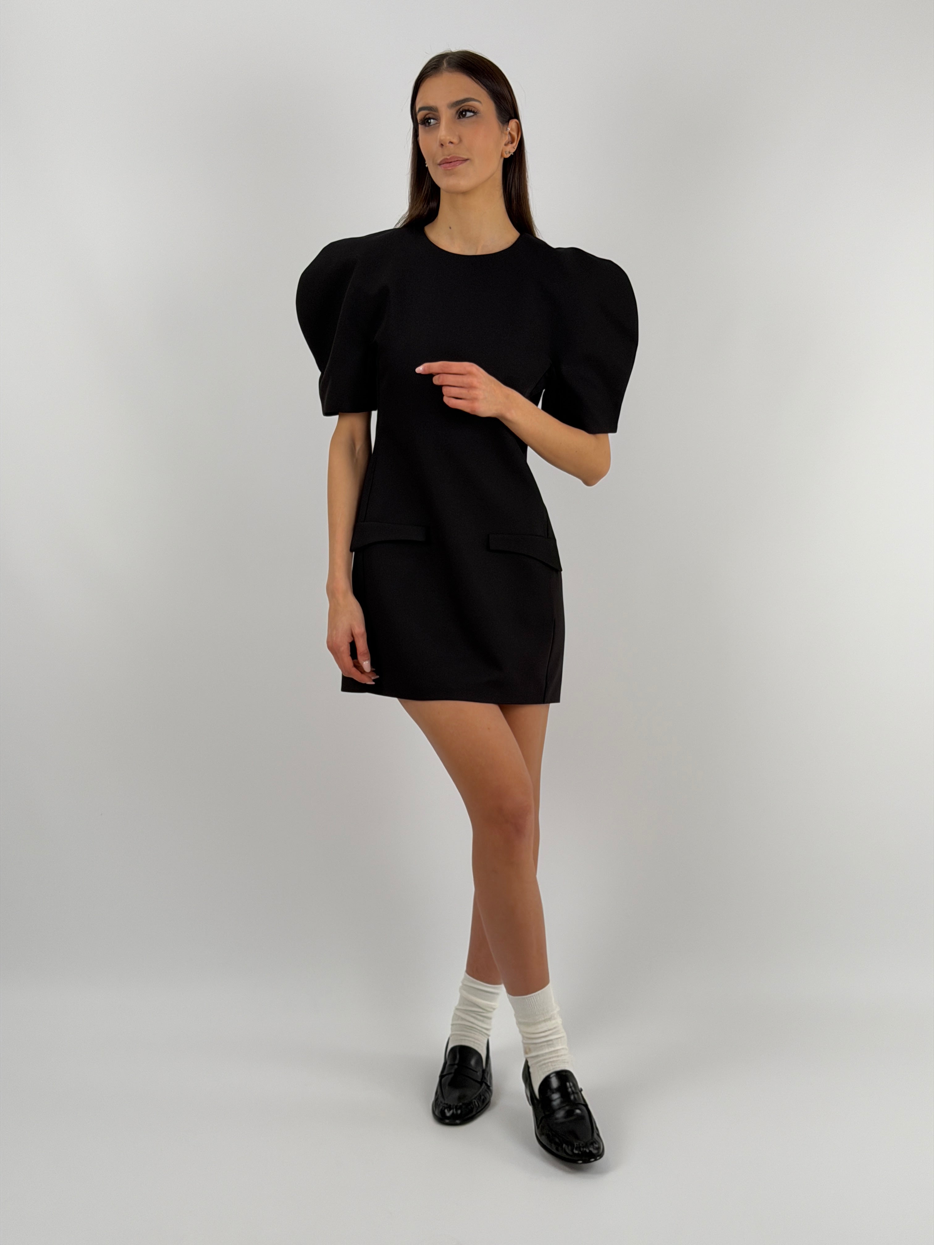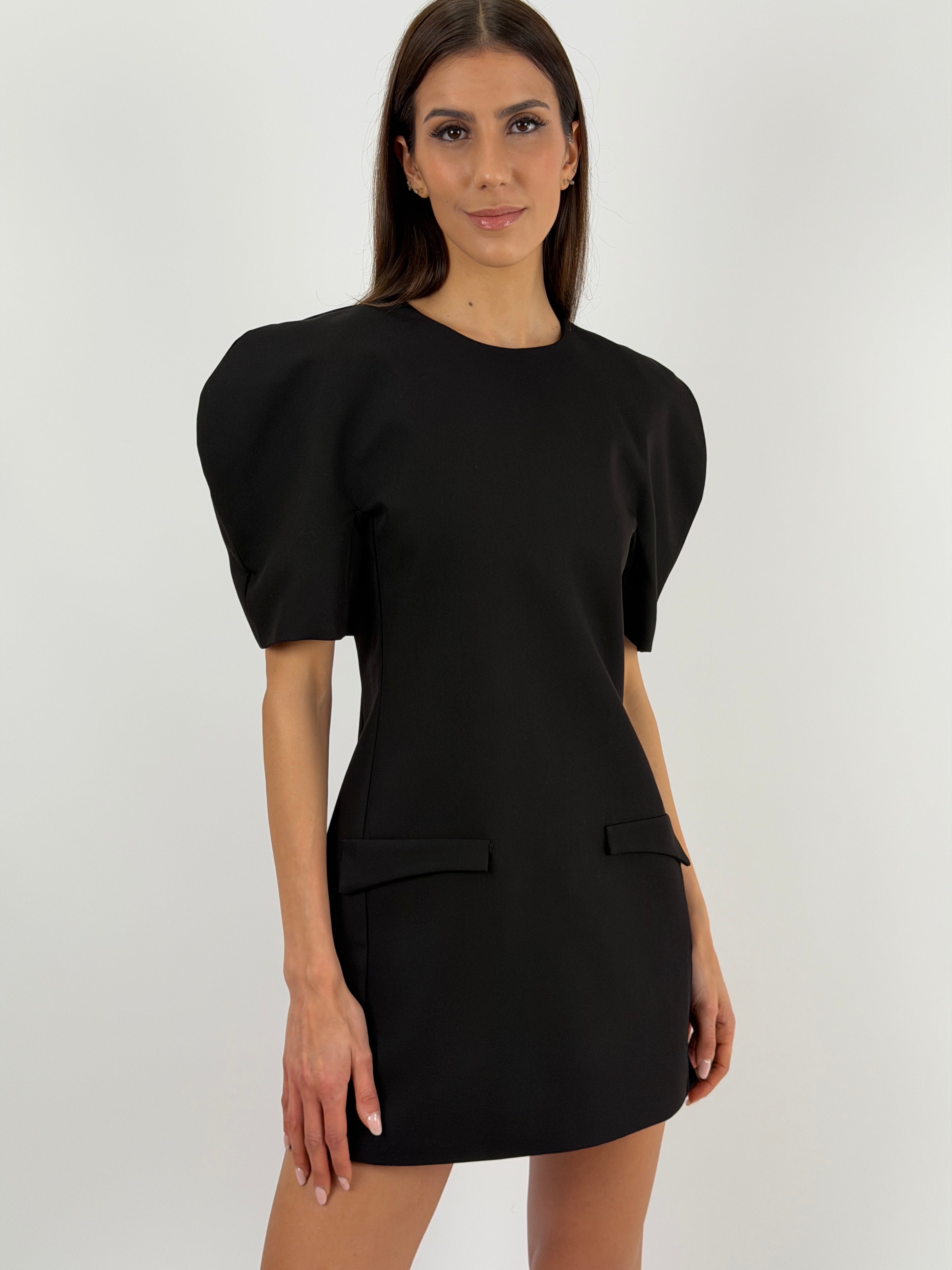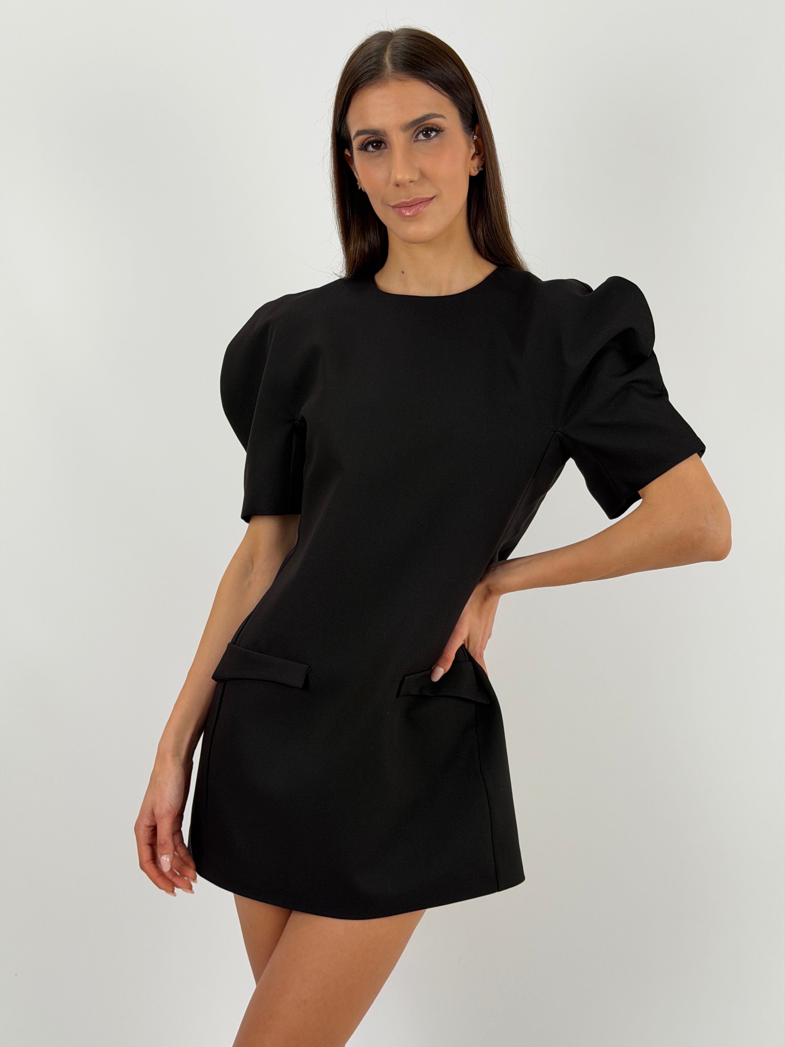 Abito corto Lumina nero con maniche corte voluminose, finte tasche con patta frontali, fodera interna e chiusura con zip sul retro