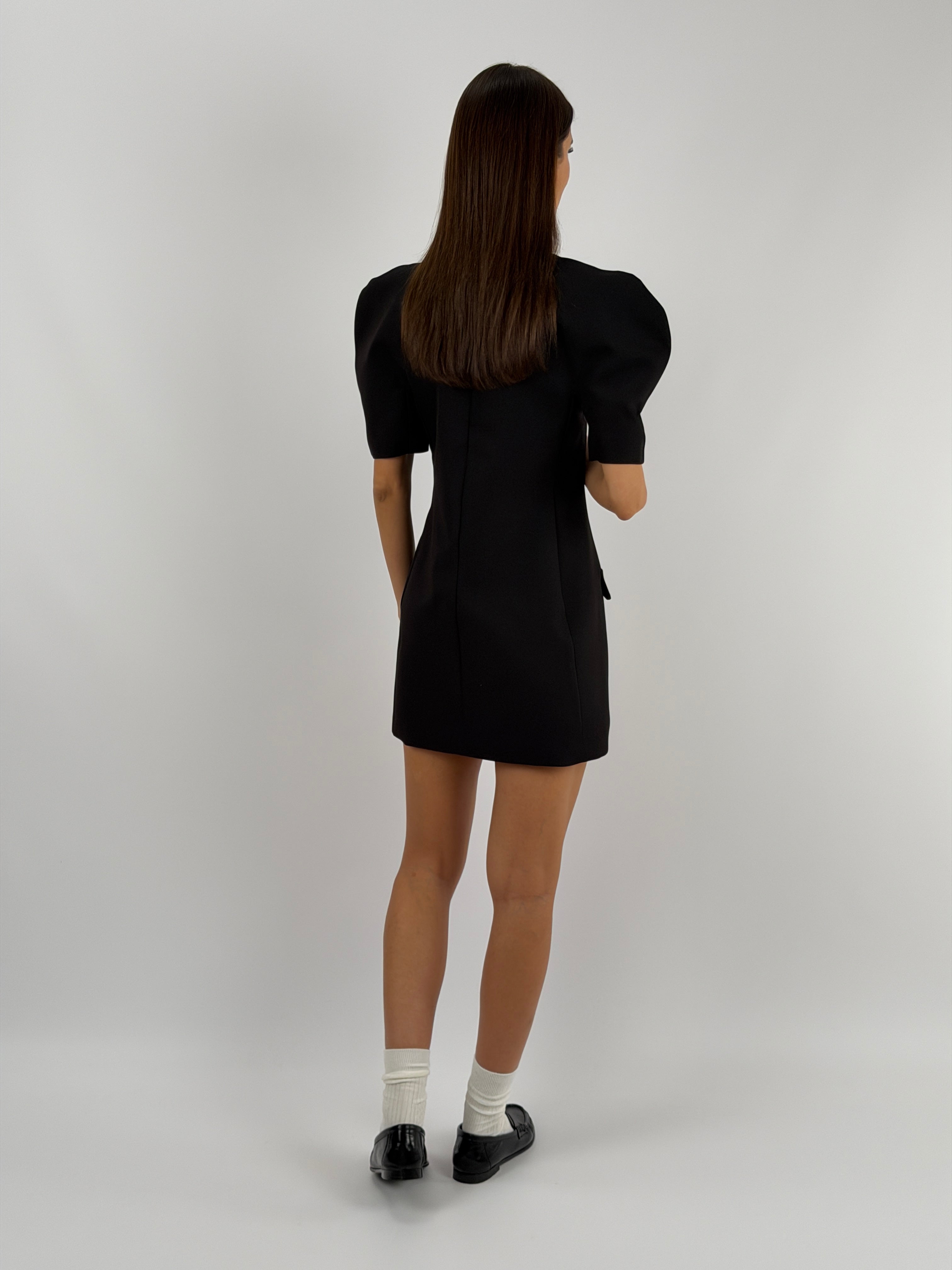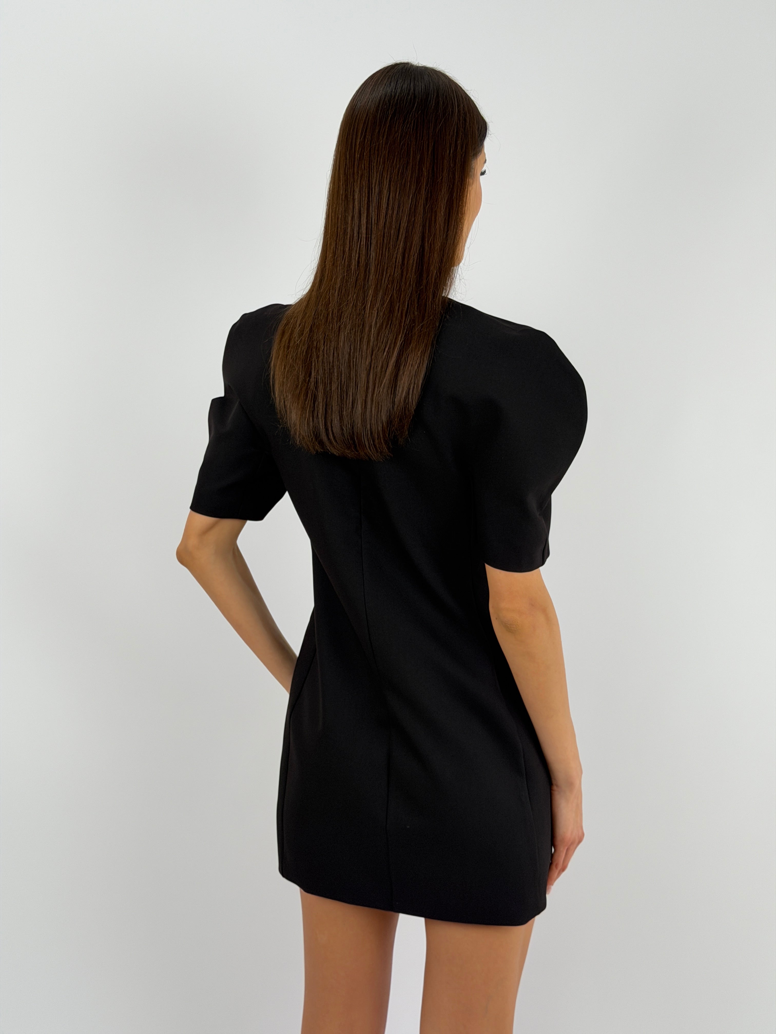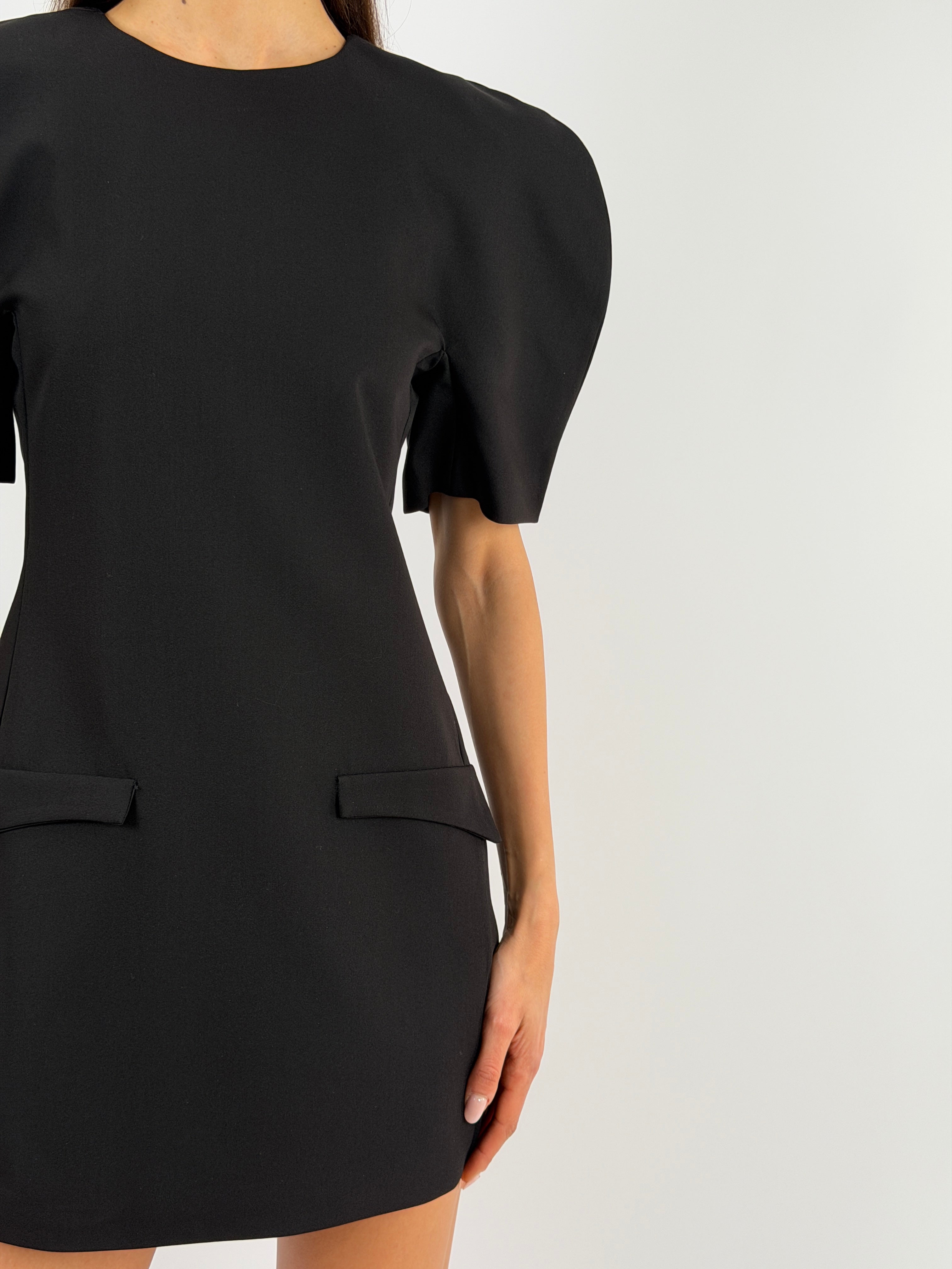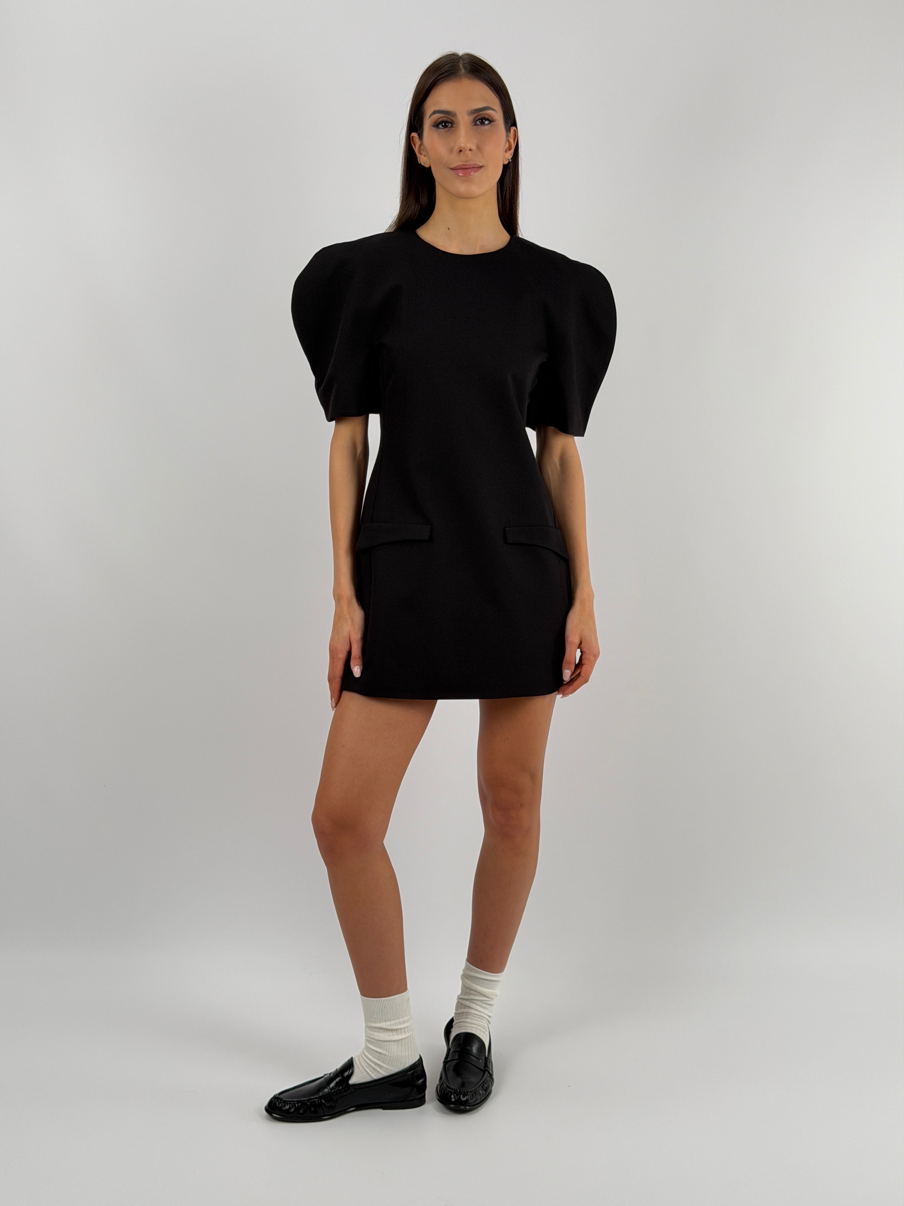 Abito corto Lumina nero con maniche corte voluminose, finte tasche con patta frontali, fodera interna e chiusura con zip sul retro