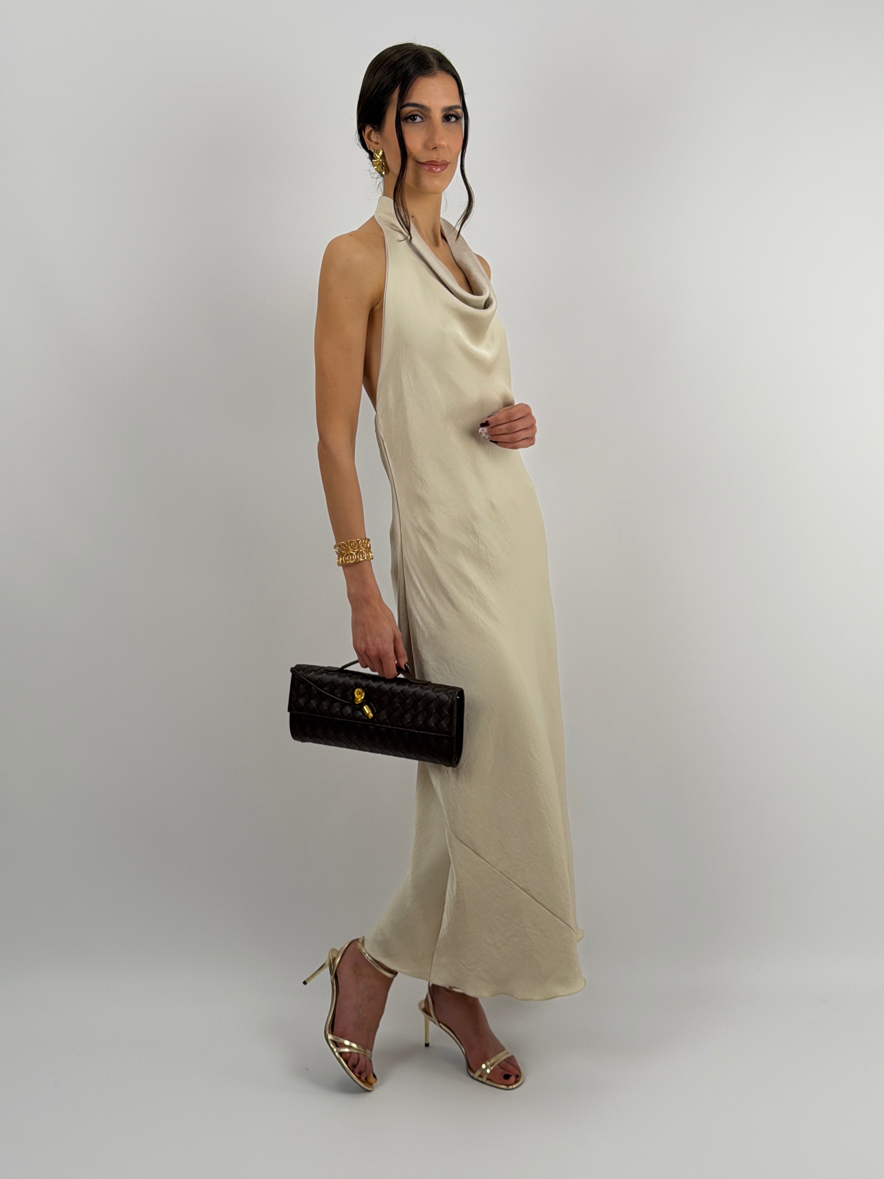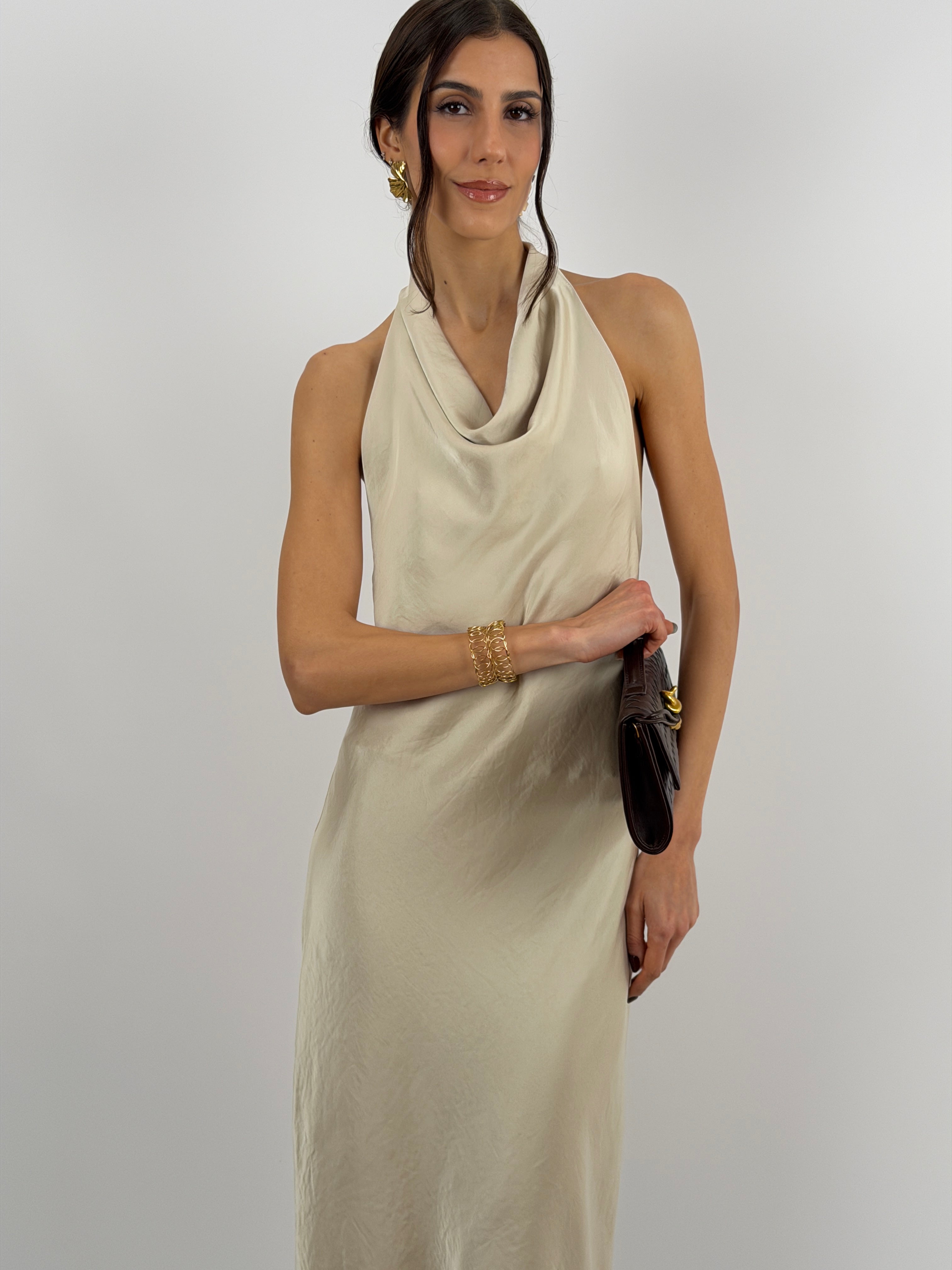 Abito beige halter lungo fluido in tessuto satinato con chiusura con bottoni al collo e schiena scoperta