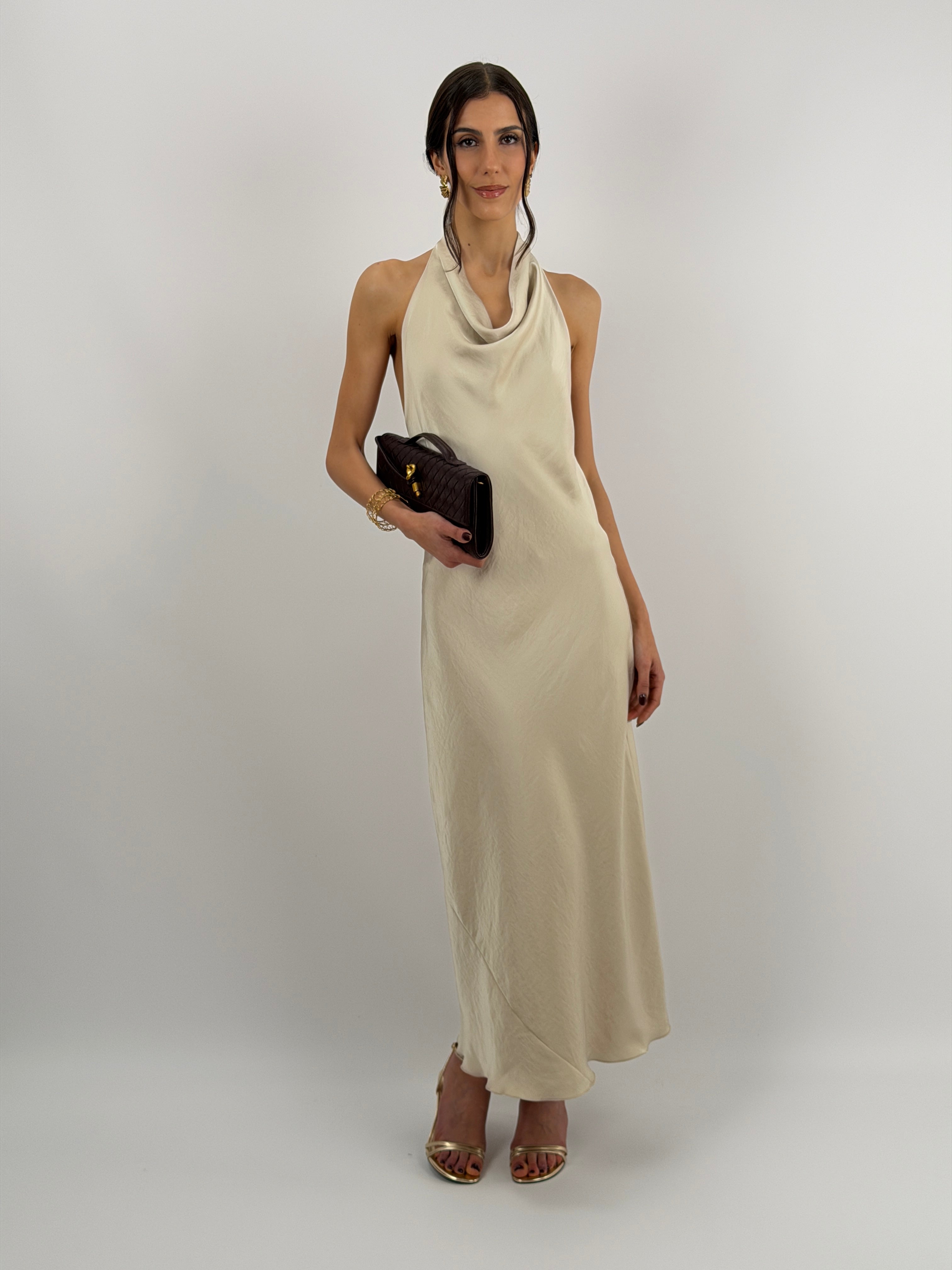 Abito Lungo Halter con Scollo Morbido Beige