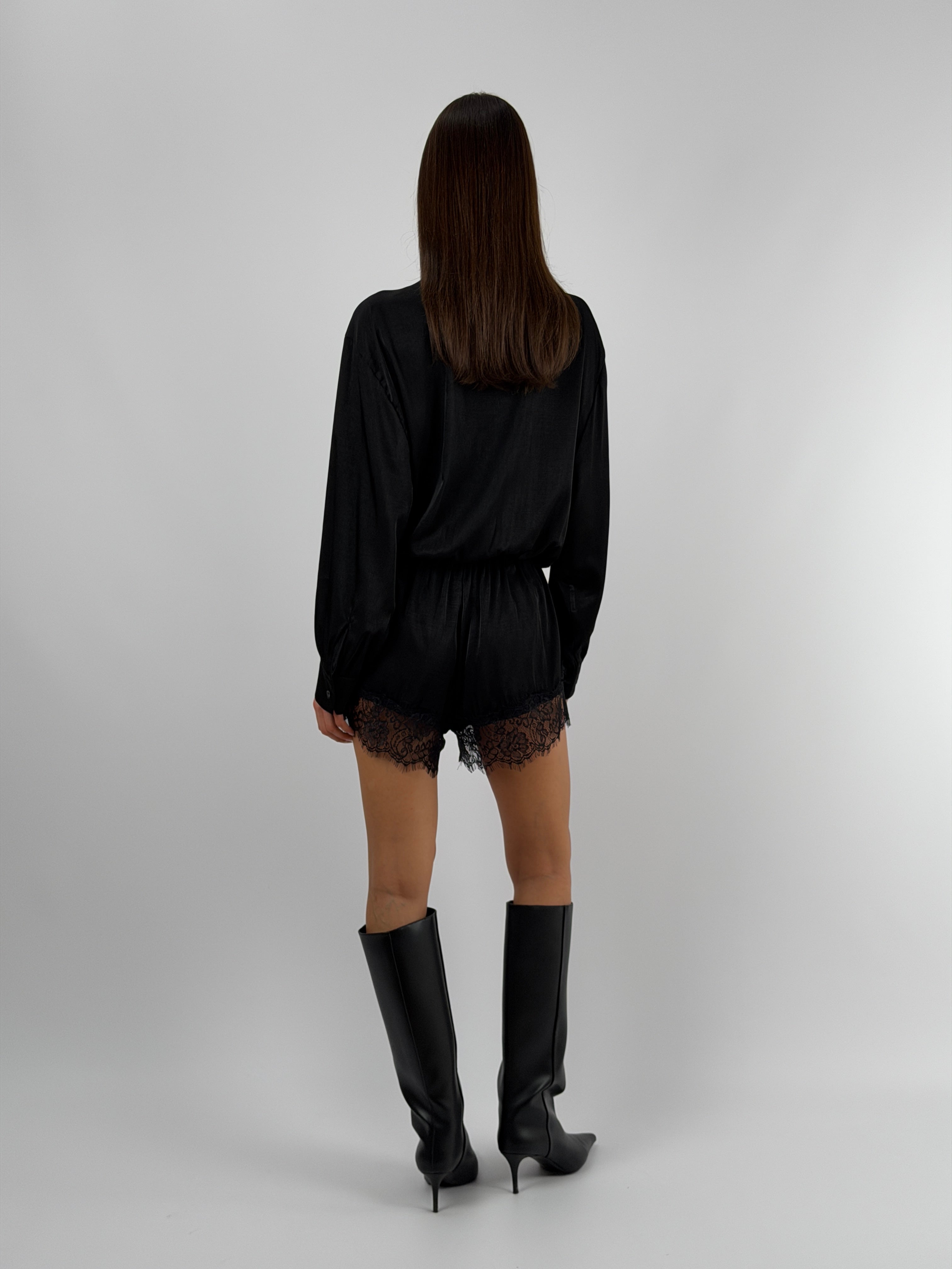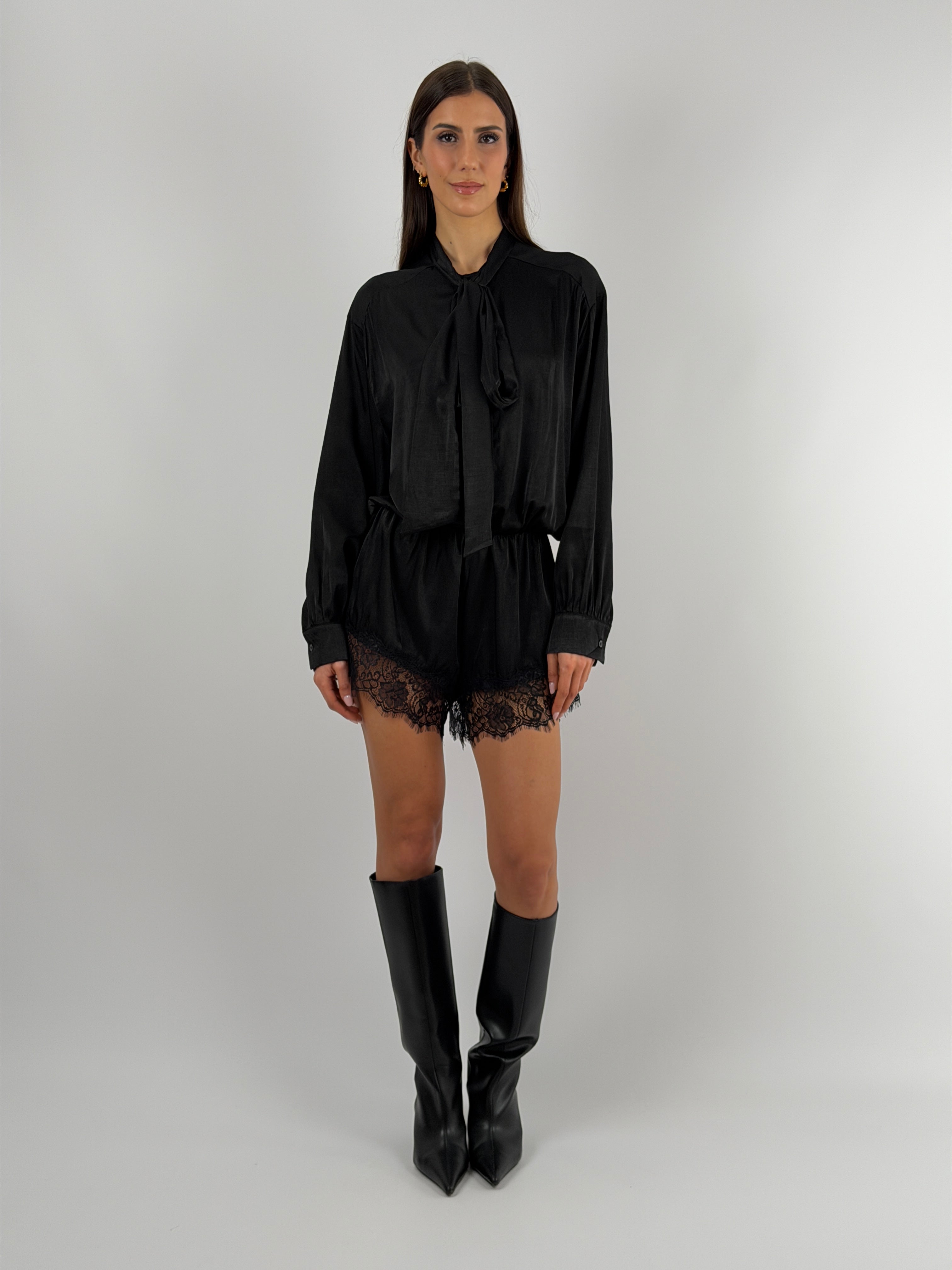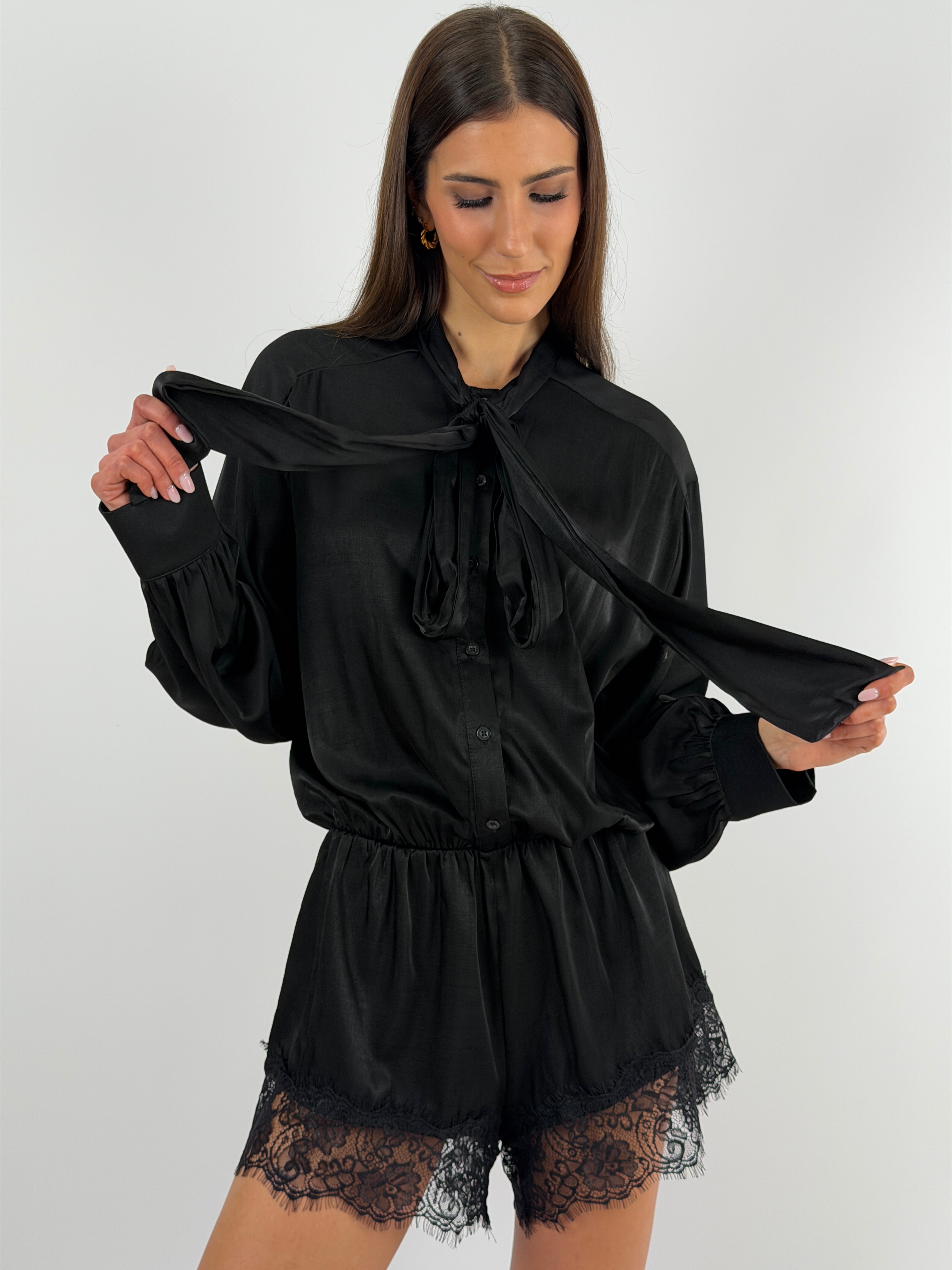 Abito Lumina corto a tuta in tessuto satinato nero con inserti in pizzo. A maniche lunghe con fiocco frontale ed elastico in vita.