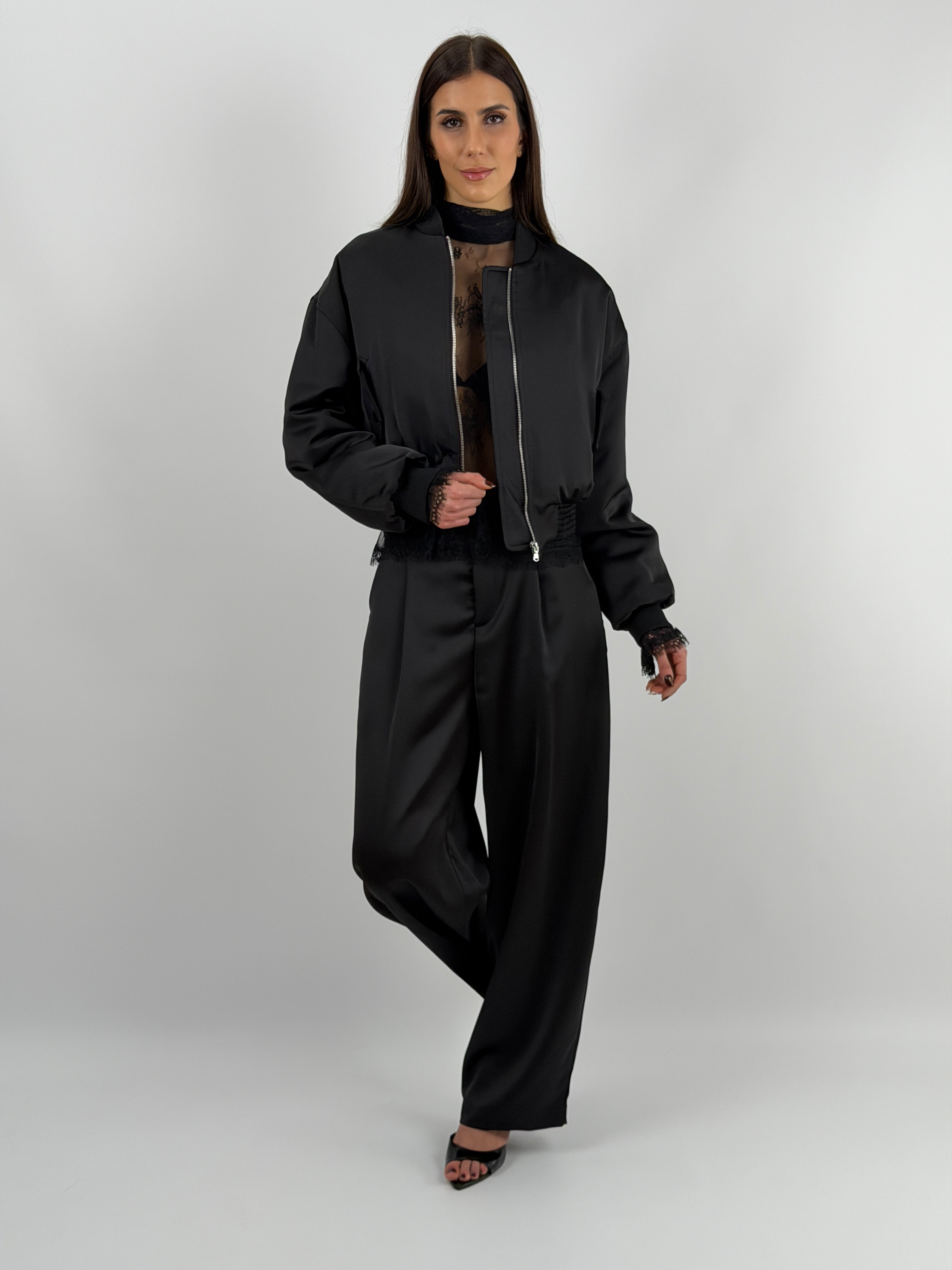 Bomber Lumina nero corto in tessuto satinato con chiusura frontale a cerniera, collo e polsi a costine, fondo arricciato, tasche frontali con bottone e fodera trapuntata.