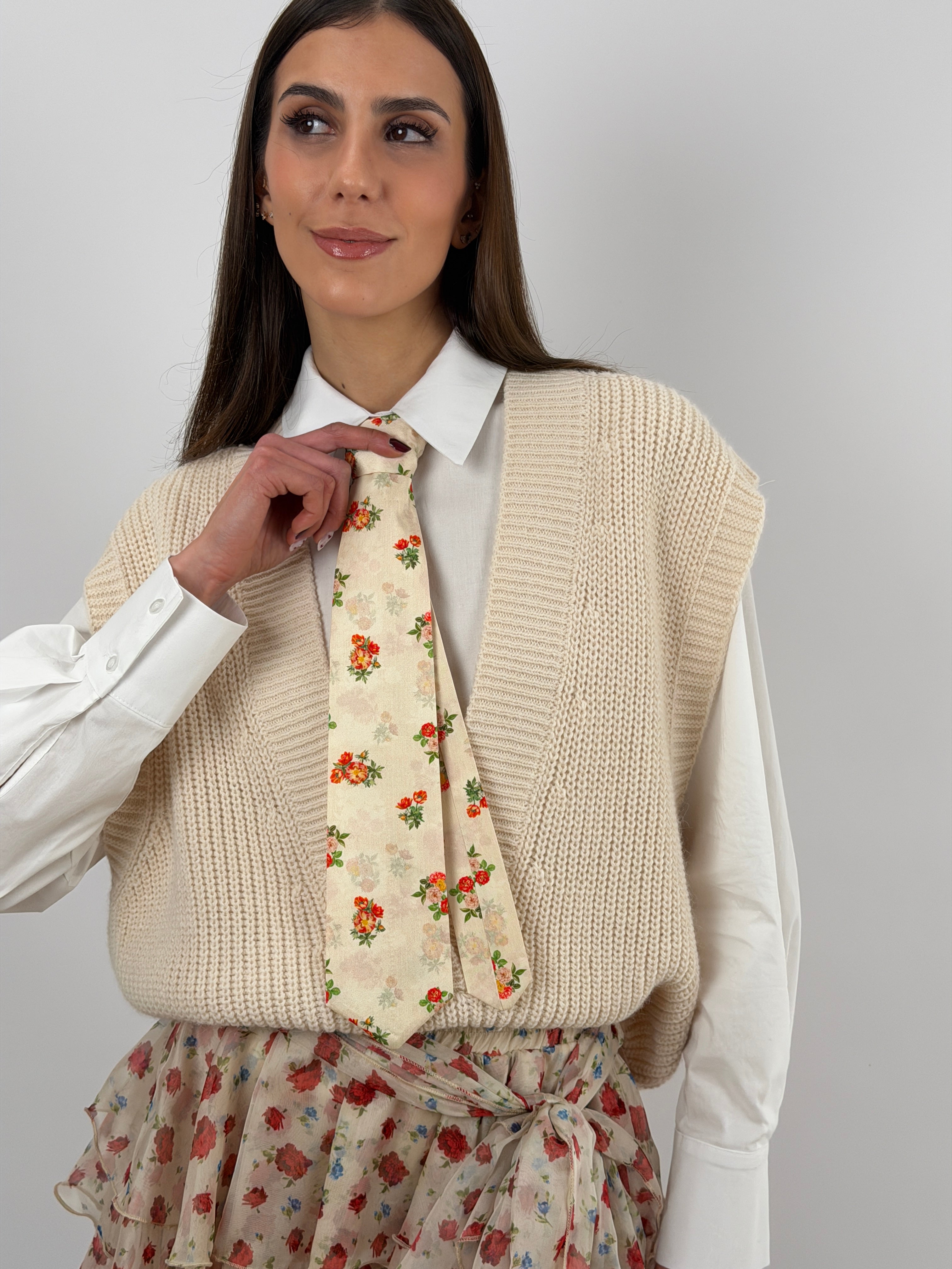 Cravatta in tessuto satinato color crema con fiori rossi