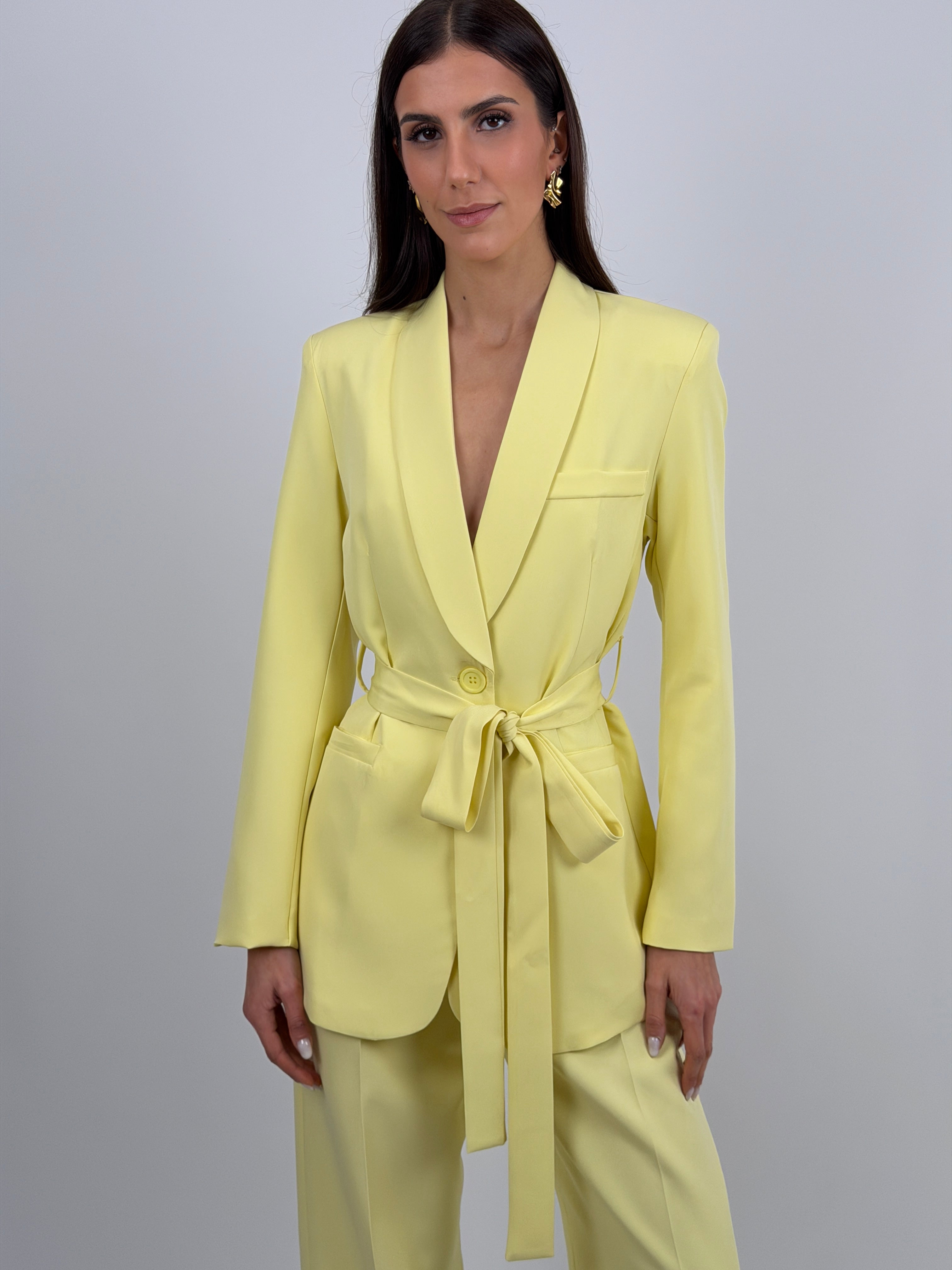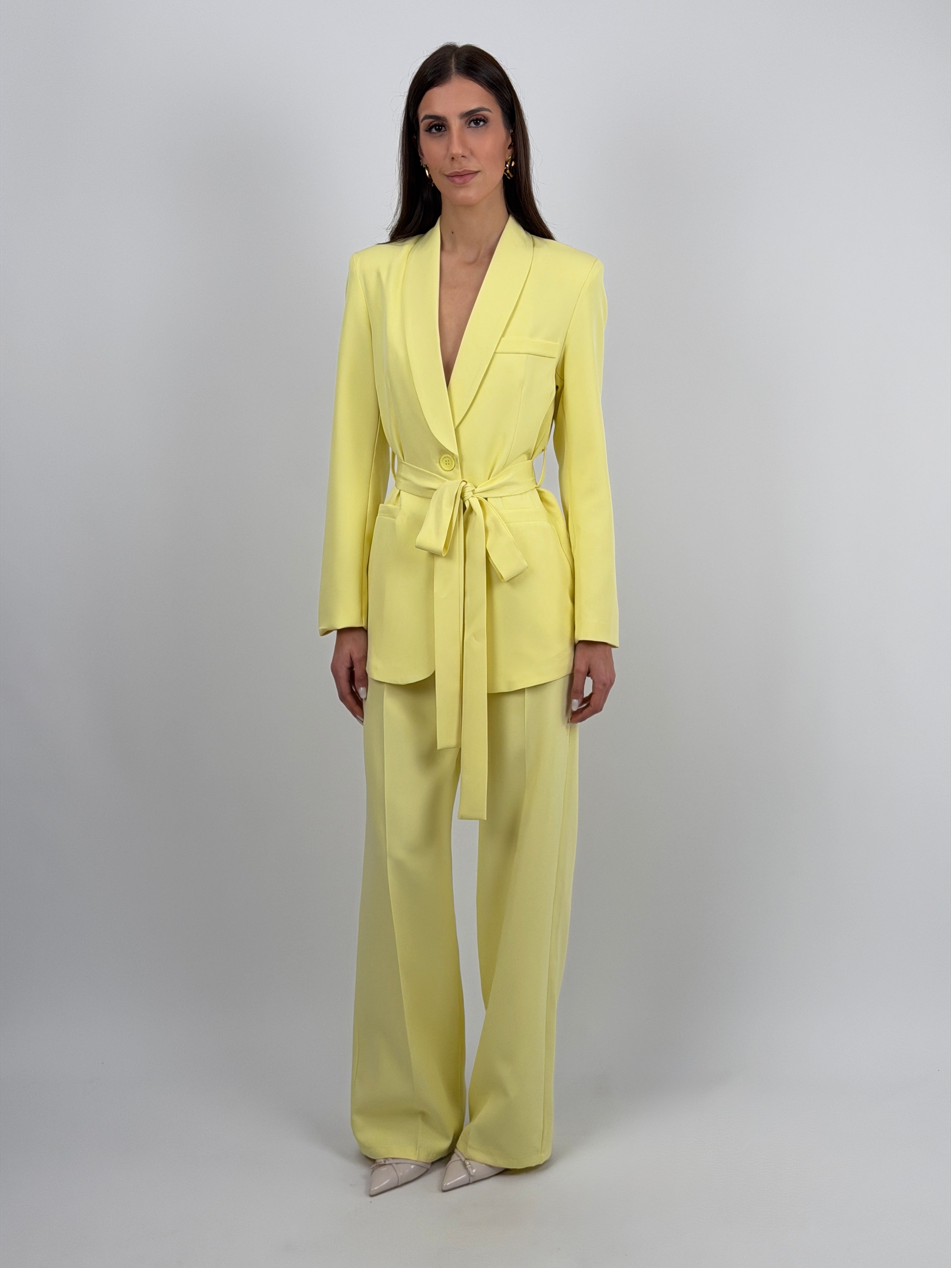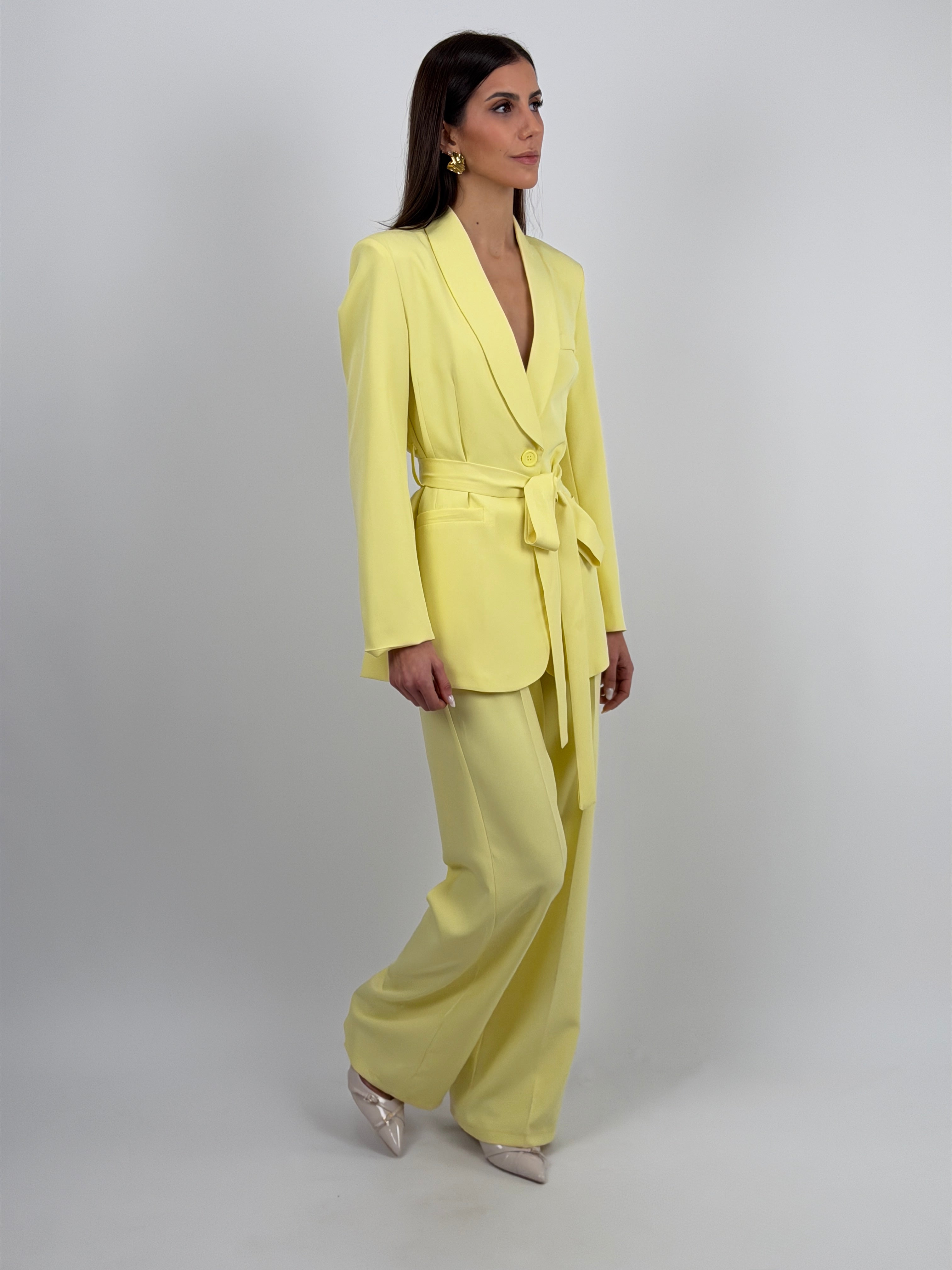 Completo giallo composto da giacca e pantalone. Giacca con revers a scialle e cintura in vita. Pantalone a palazzo con elastico sul retro, chiusura con zip e bottone, passanti per cintura e tasche laterali.