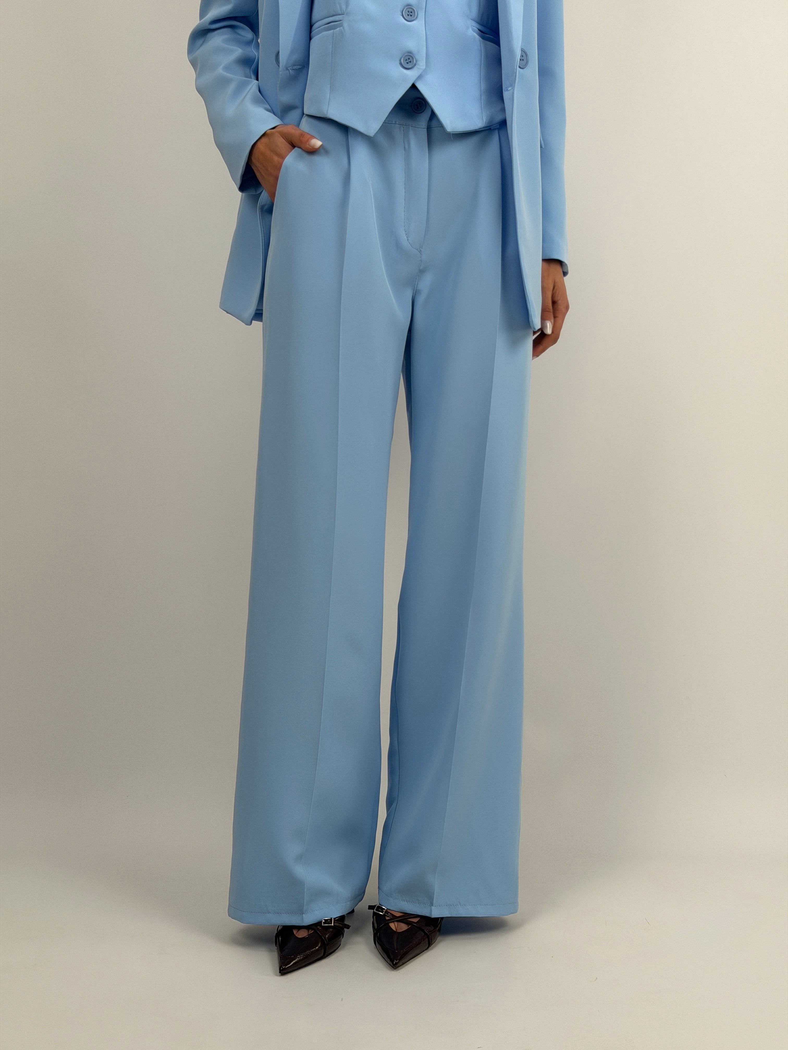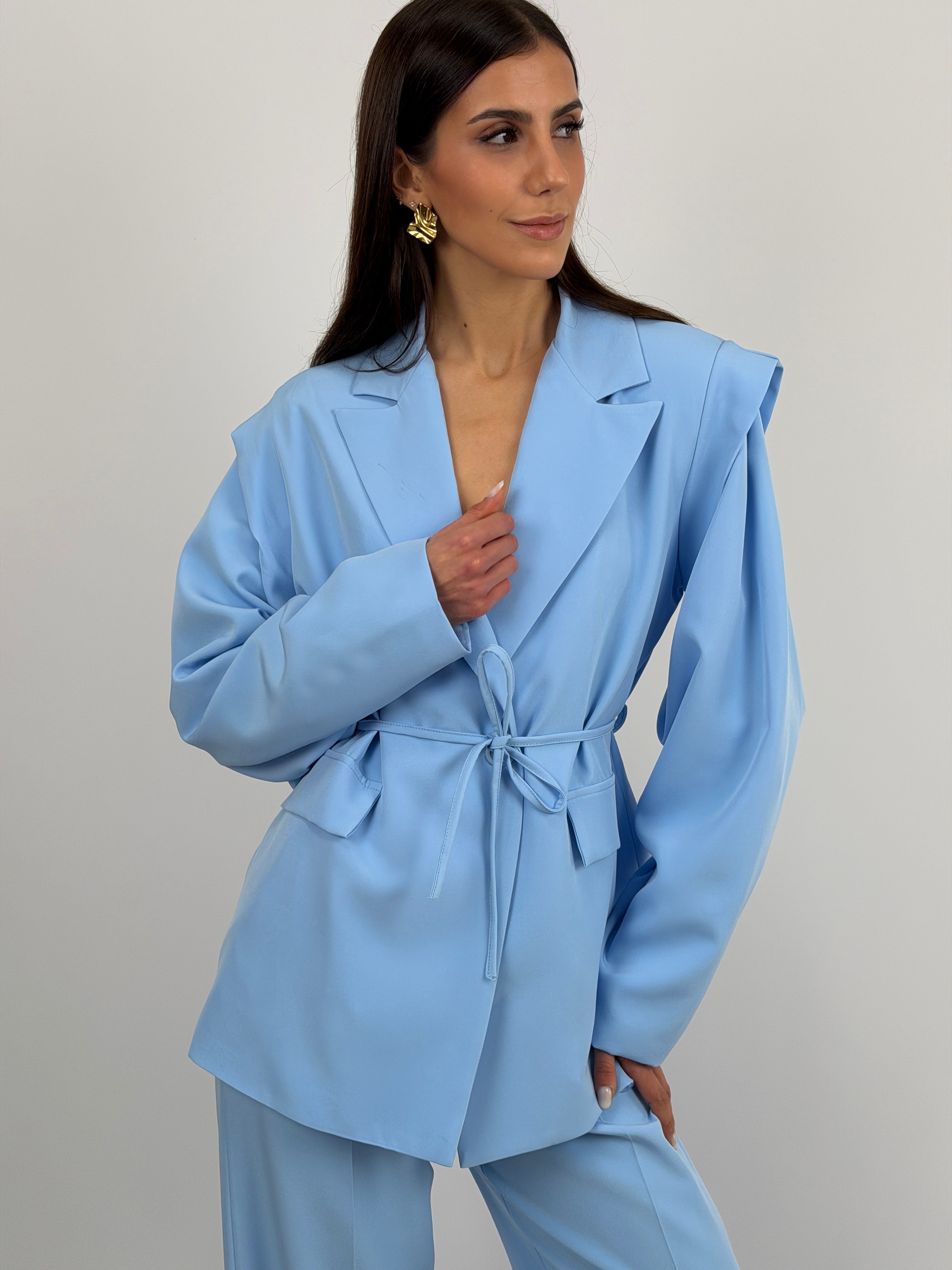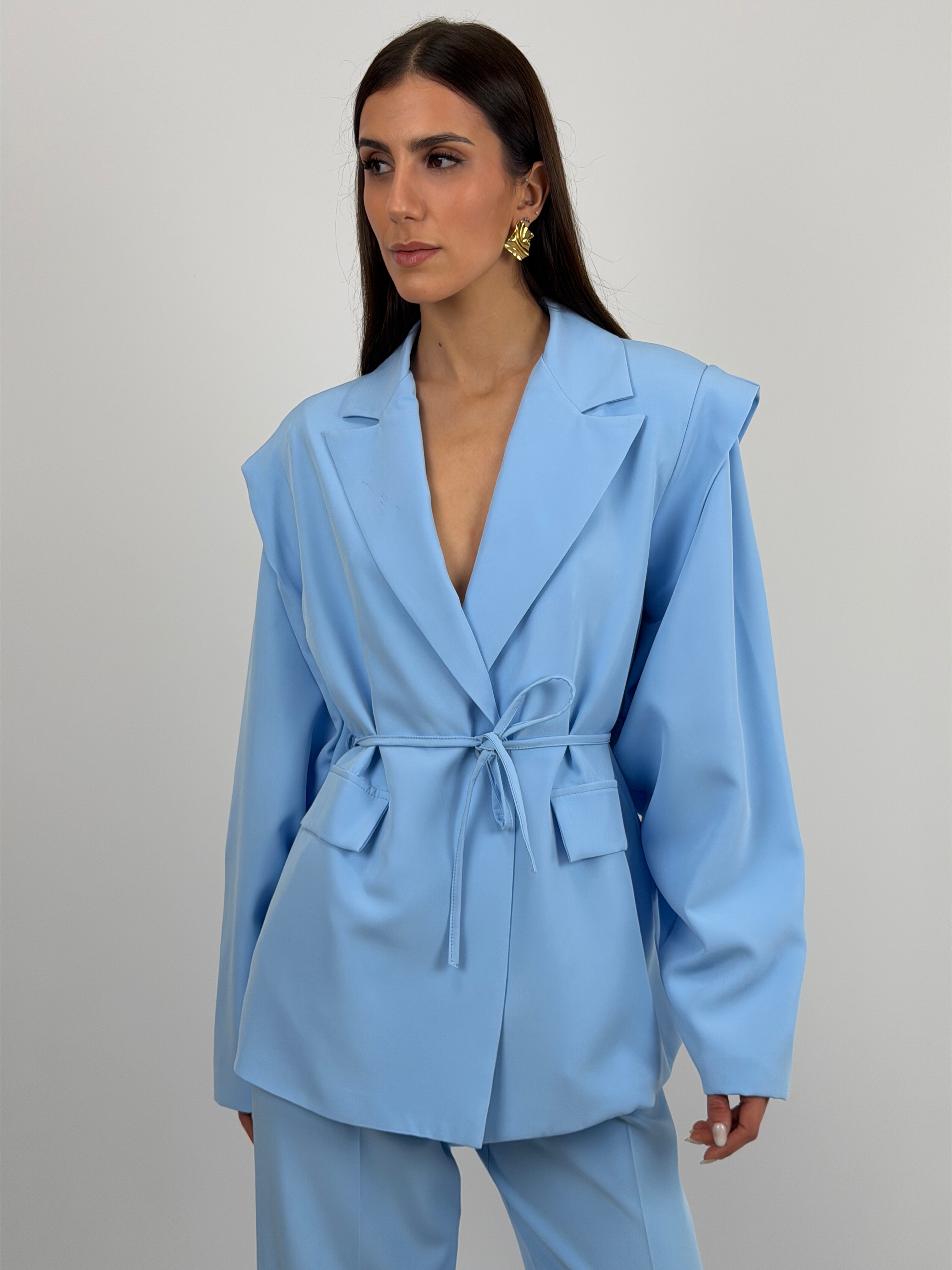Completo azzurro composto da giacca e pantalone. Giacca con revers a lancia, spalle strutturate, maniche ampie e cinturina in vita. Pantalone a palazzo con elastico sul retro, chiusura con zip e bottone, passanti per cintura e tasche laterali.
