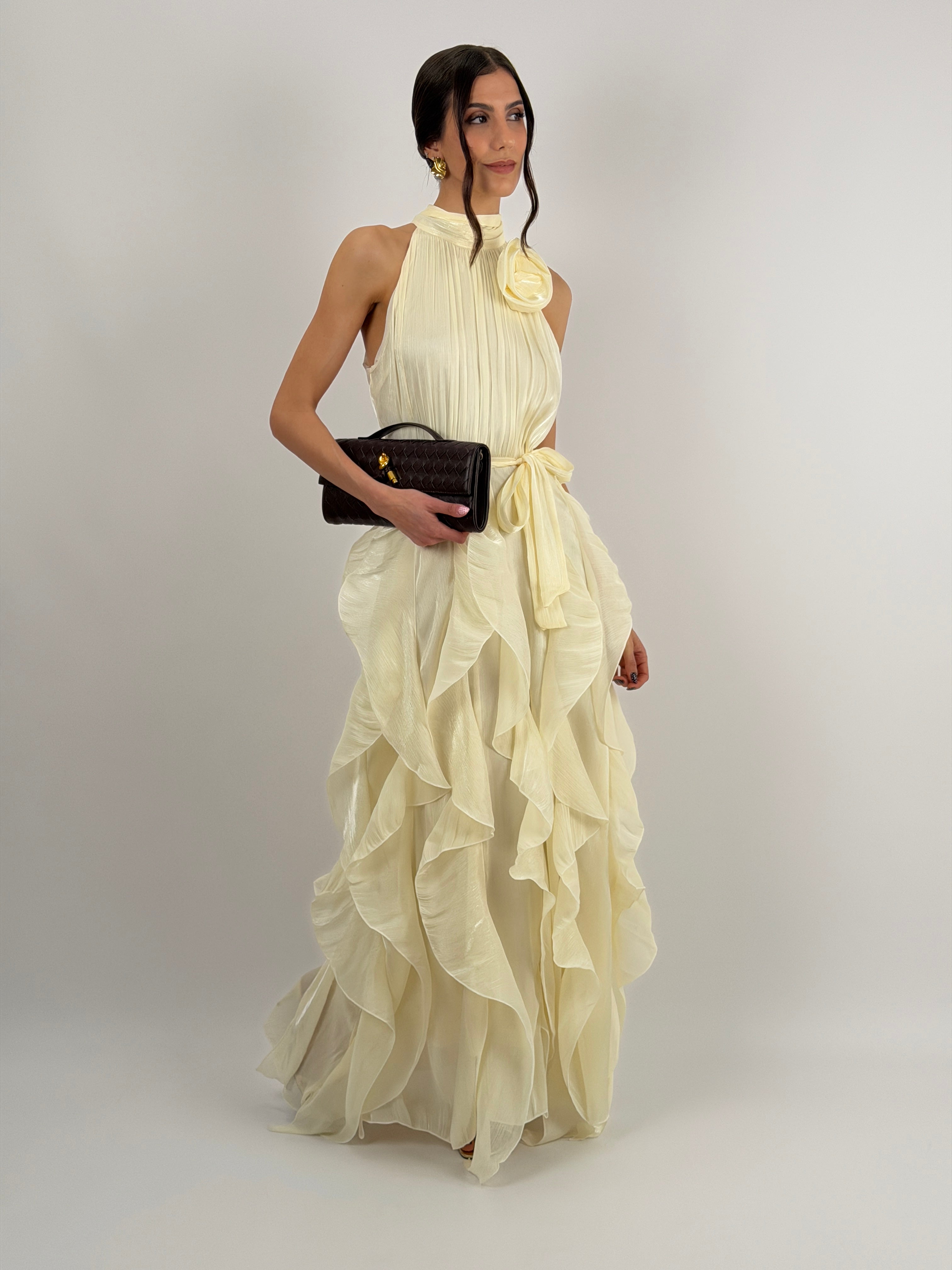 Abito lungo color avorio smanicato in chiffon con ruches sulla gonna, chiusura al collo con laccio, zip nascosta sul retro, fusciacca in vita e spilla con rosa rimovibile, fodera interna.