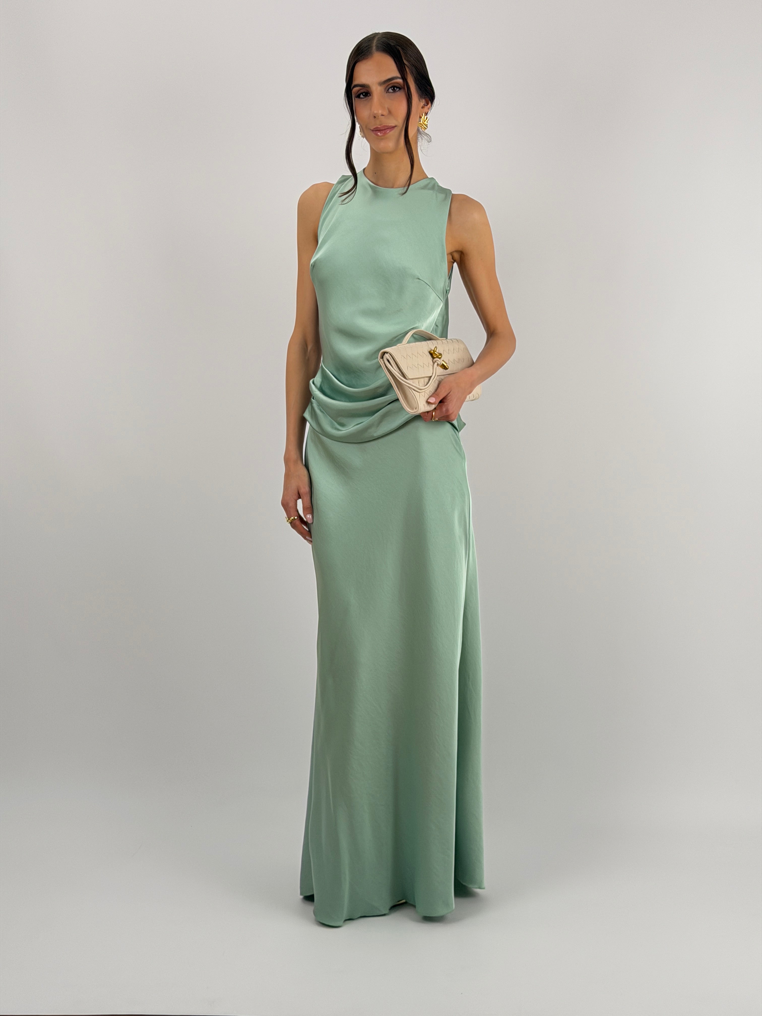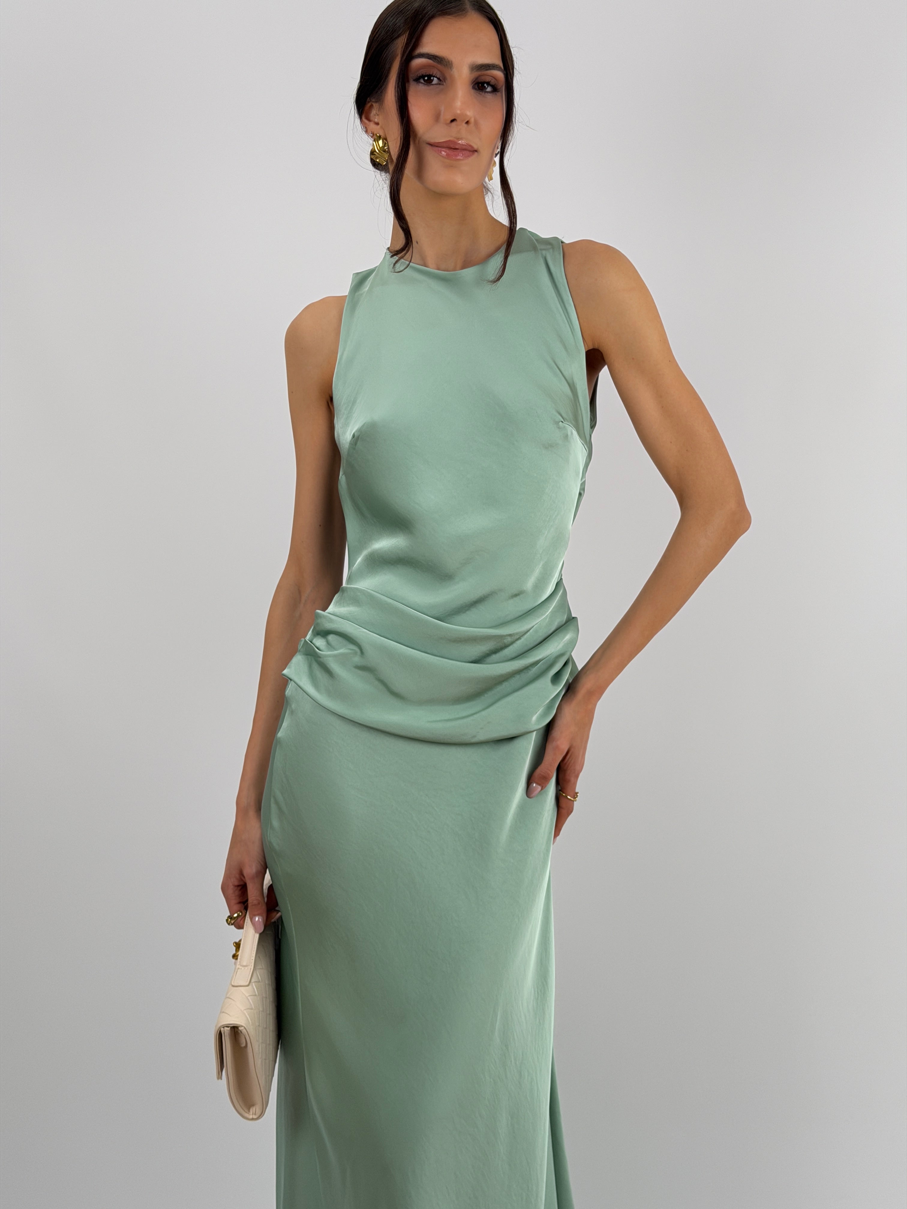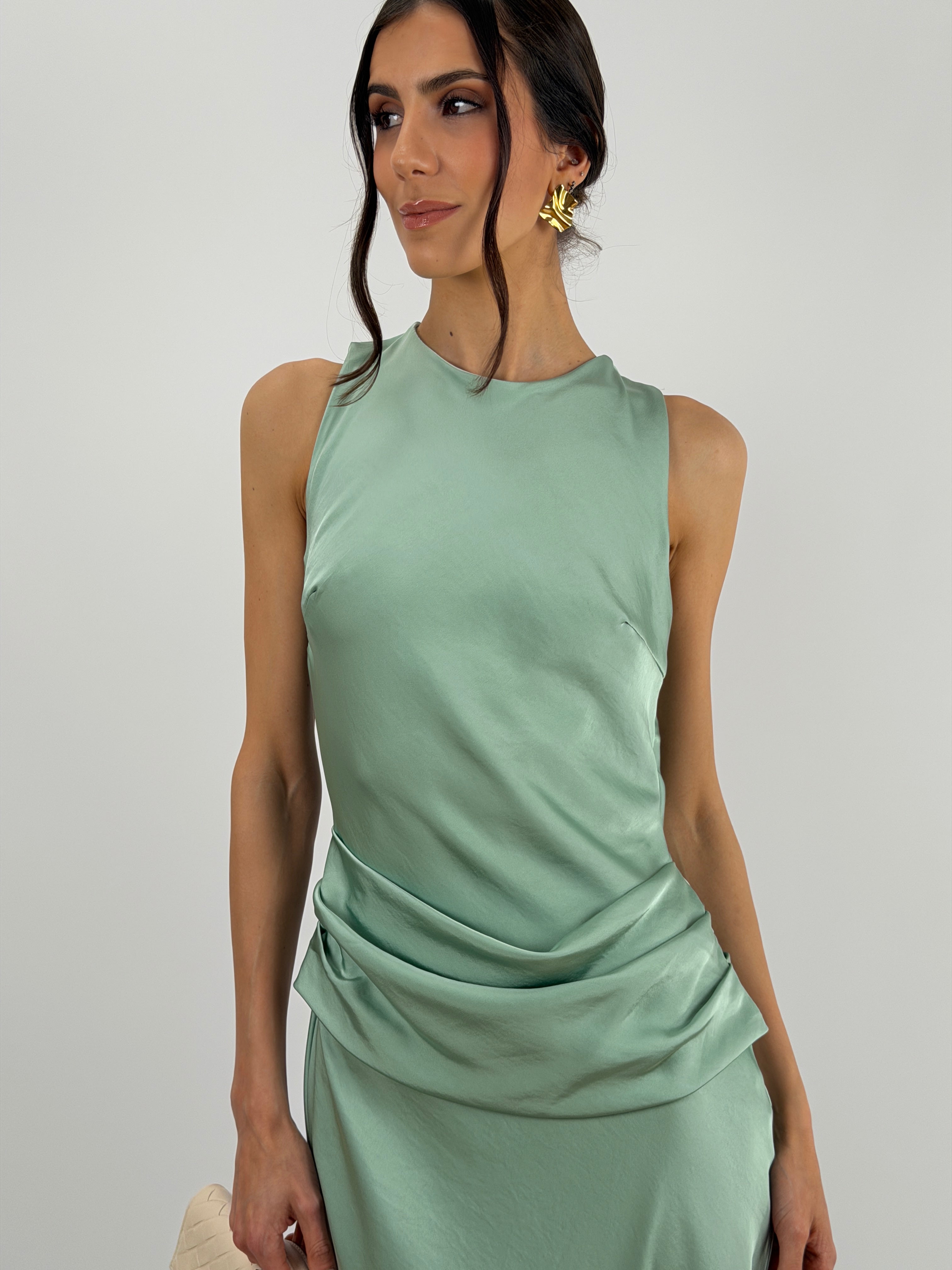 Abito lungo verde salvia in tessuto satinato fluido, smanicato con spalline larghe e girocollo, con fascia in vita drappeggiata