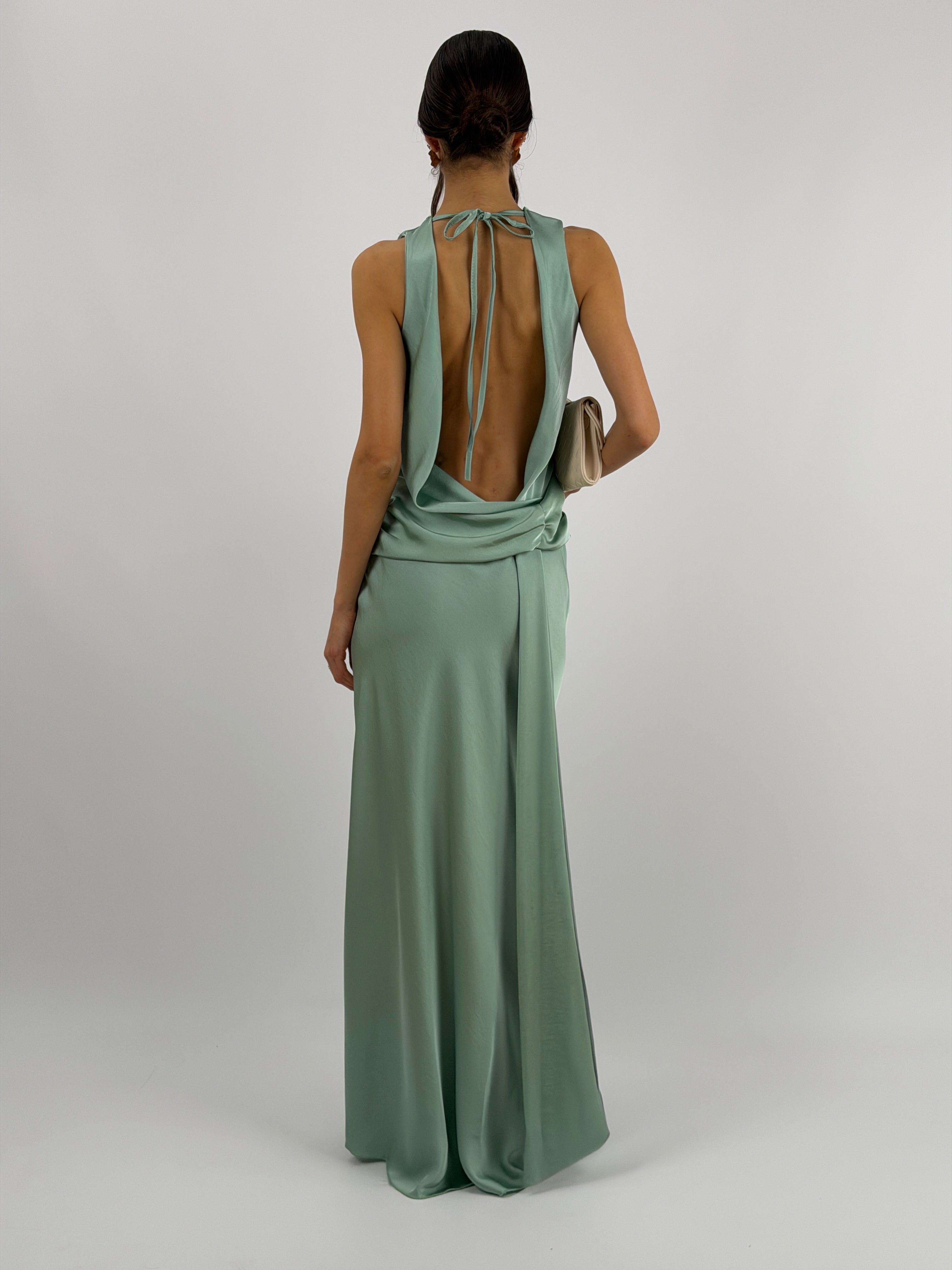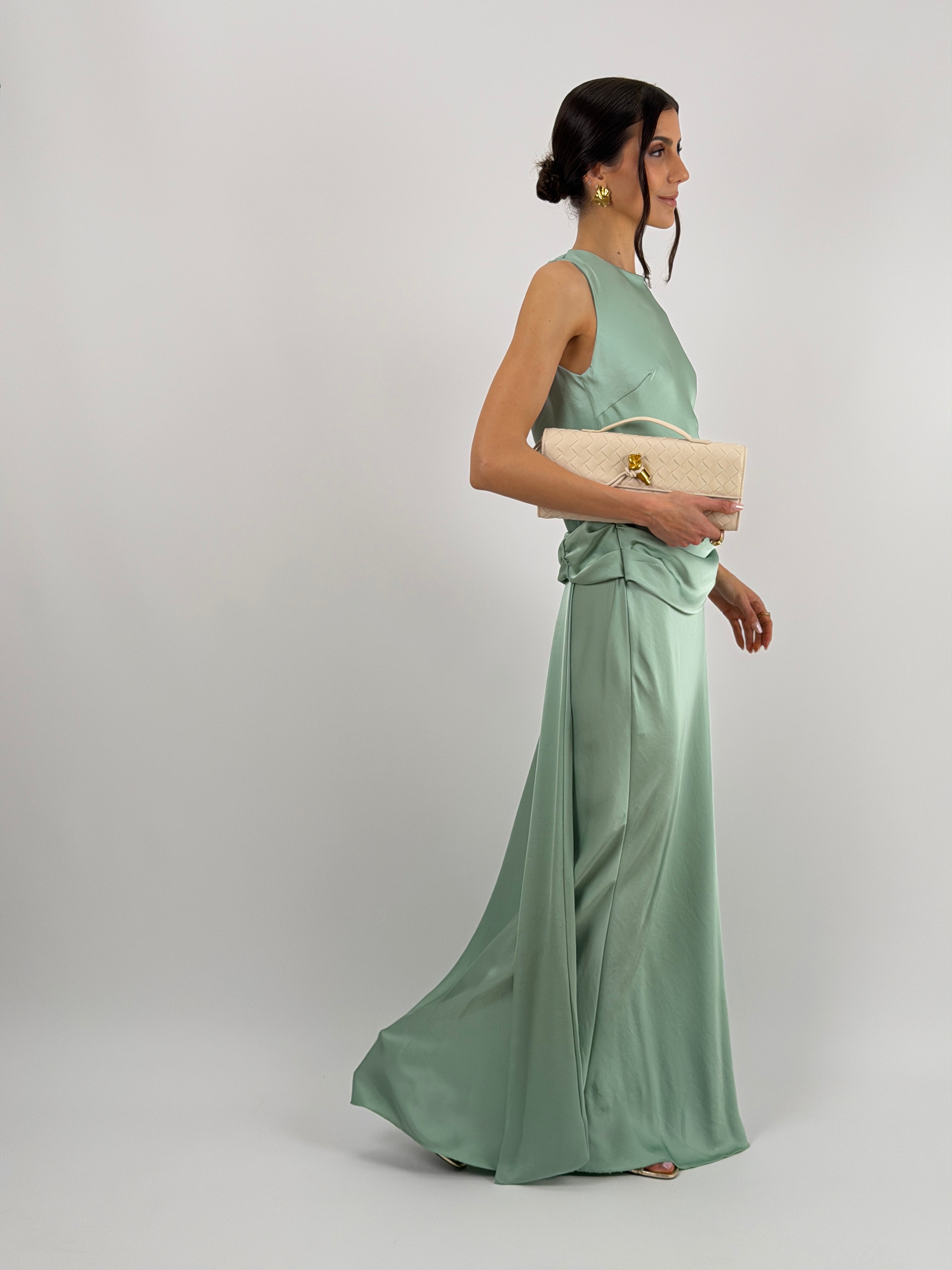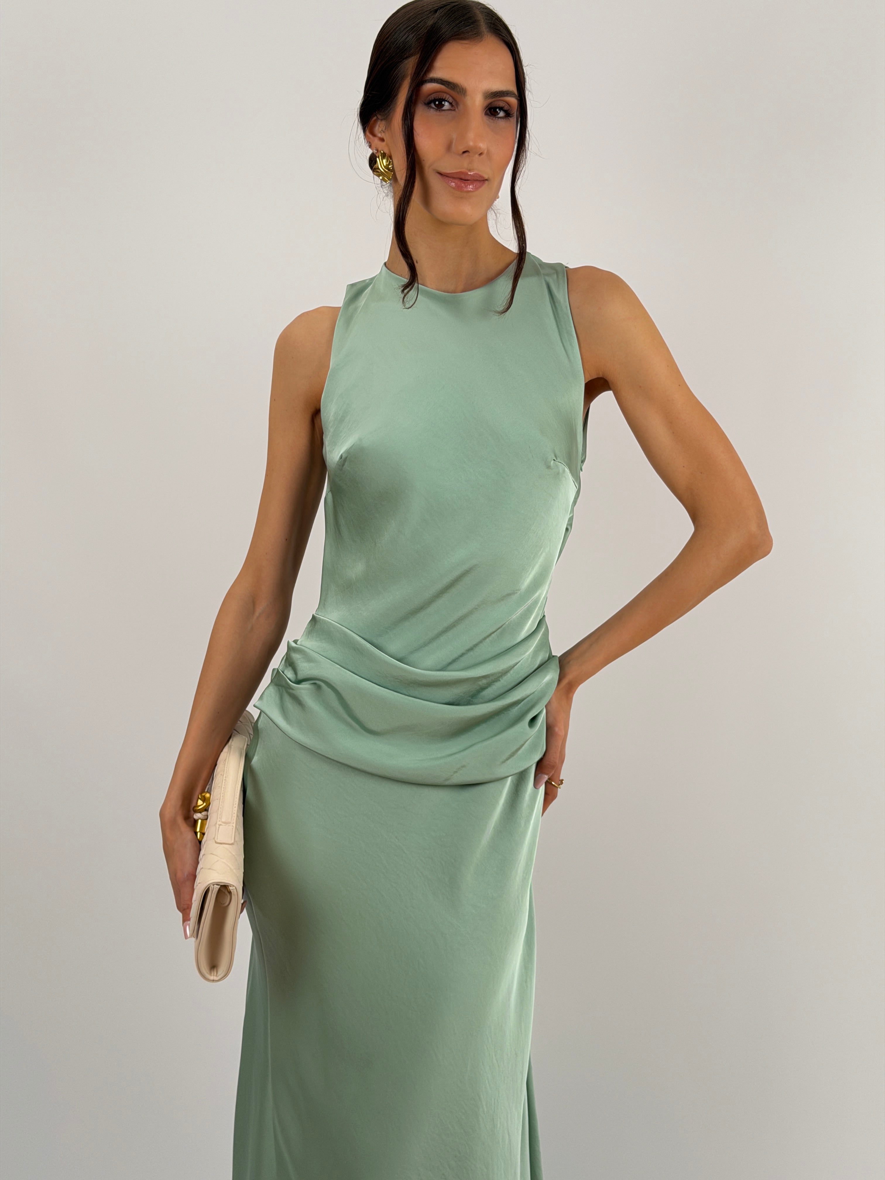 Abito lungo verde salvia in tessuto satinato fluido, smanicato con spalline larghe e girocollo, con fascia in vita drappeggiata