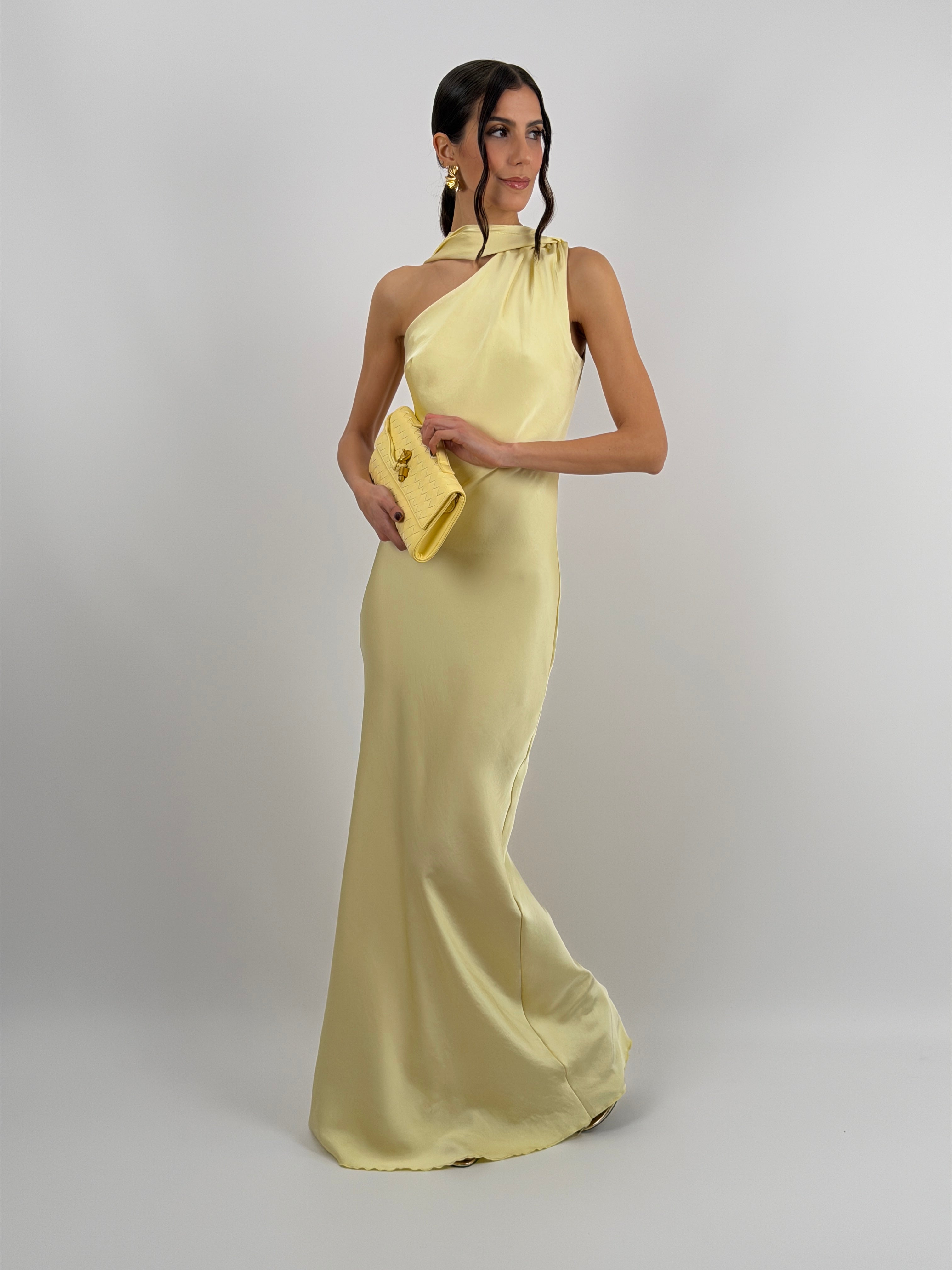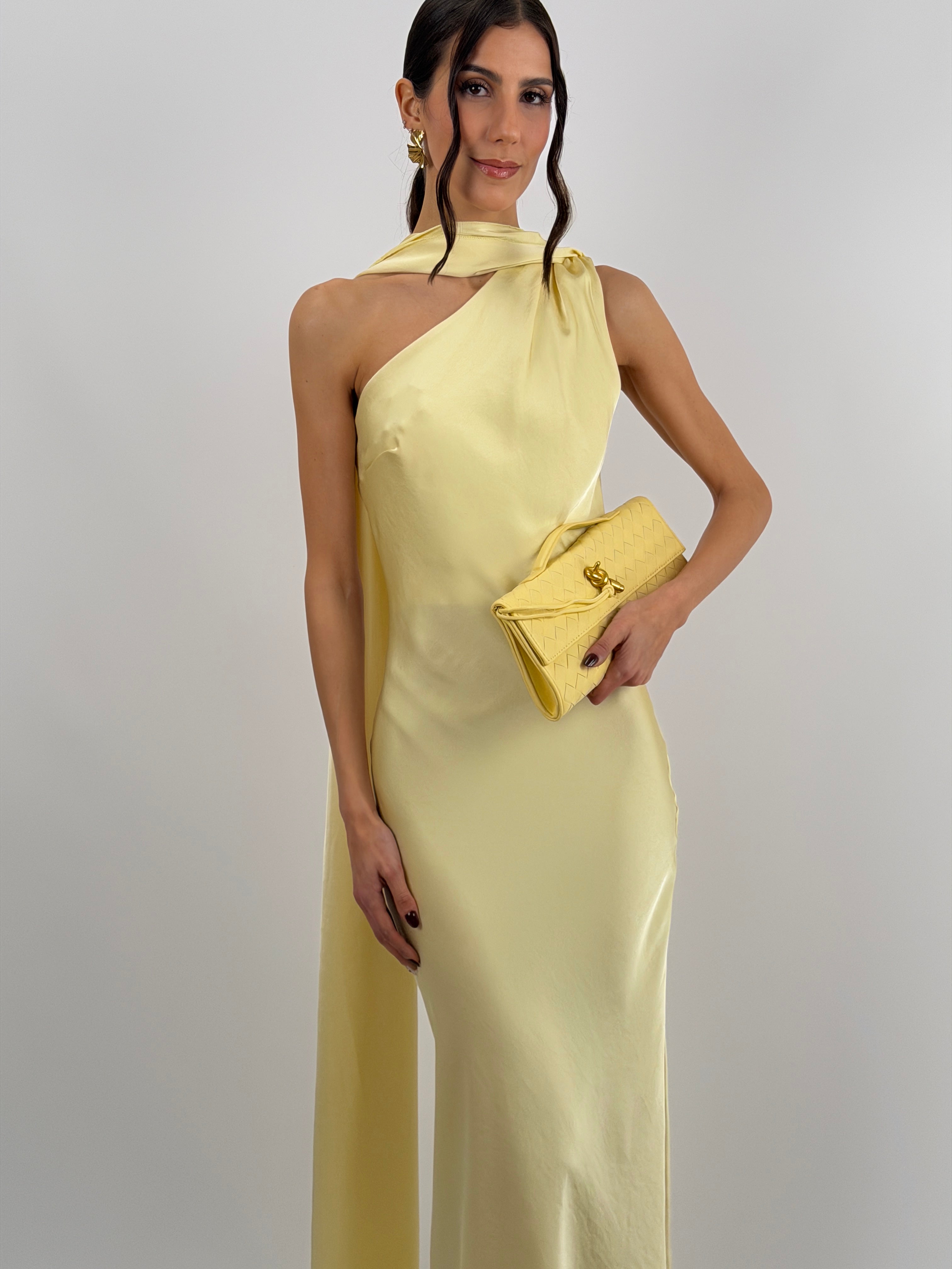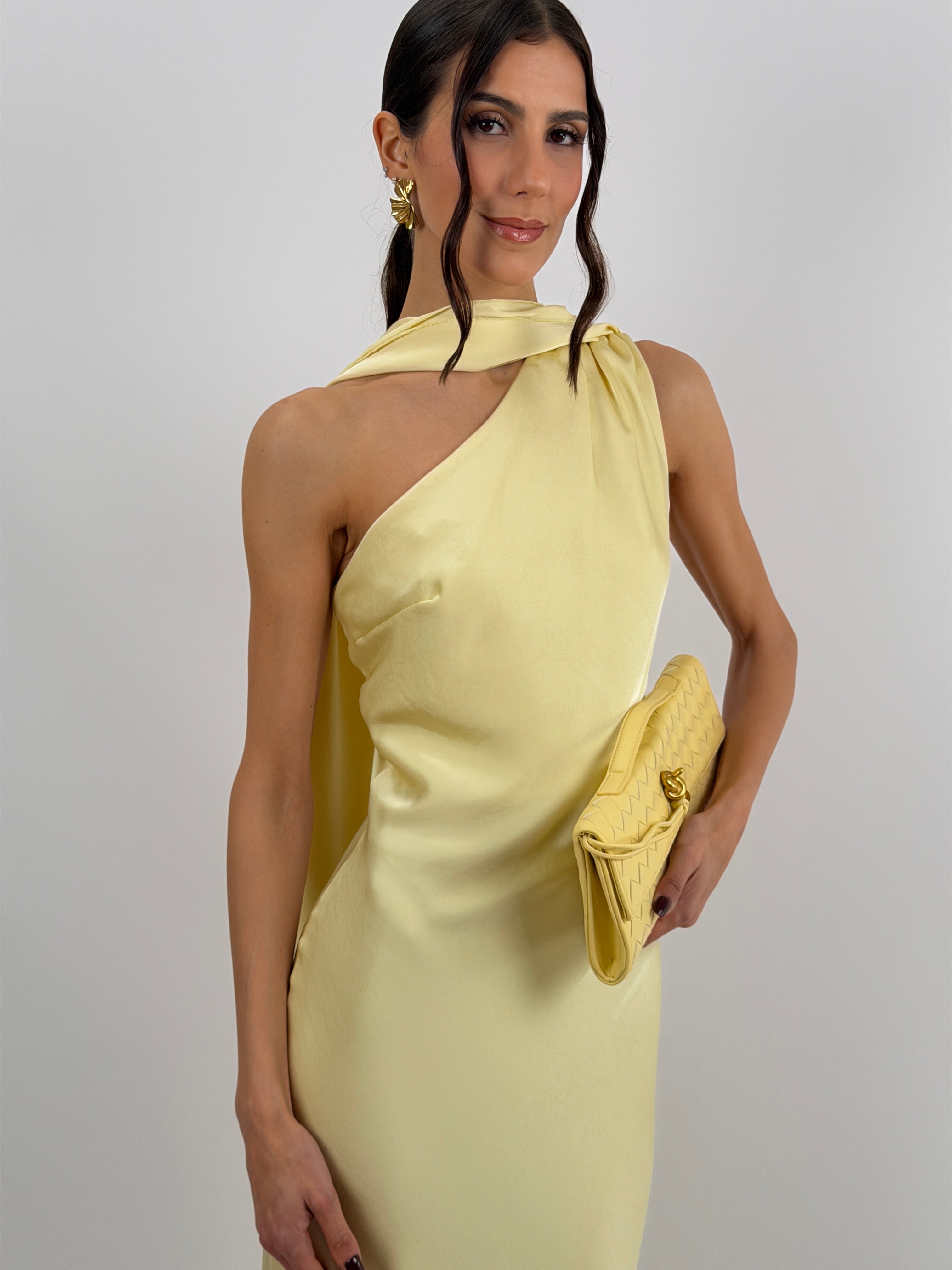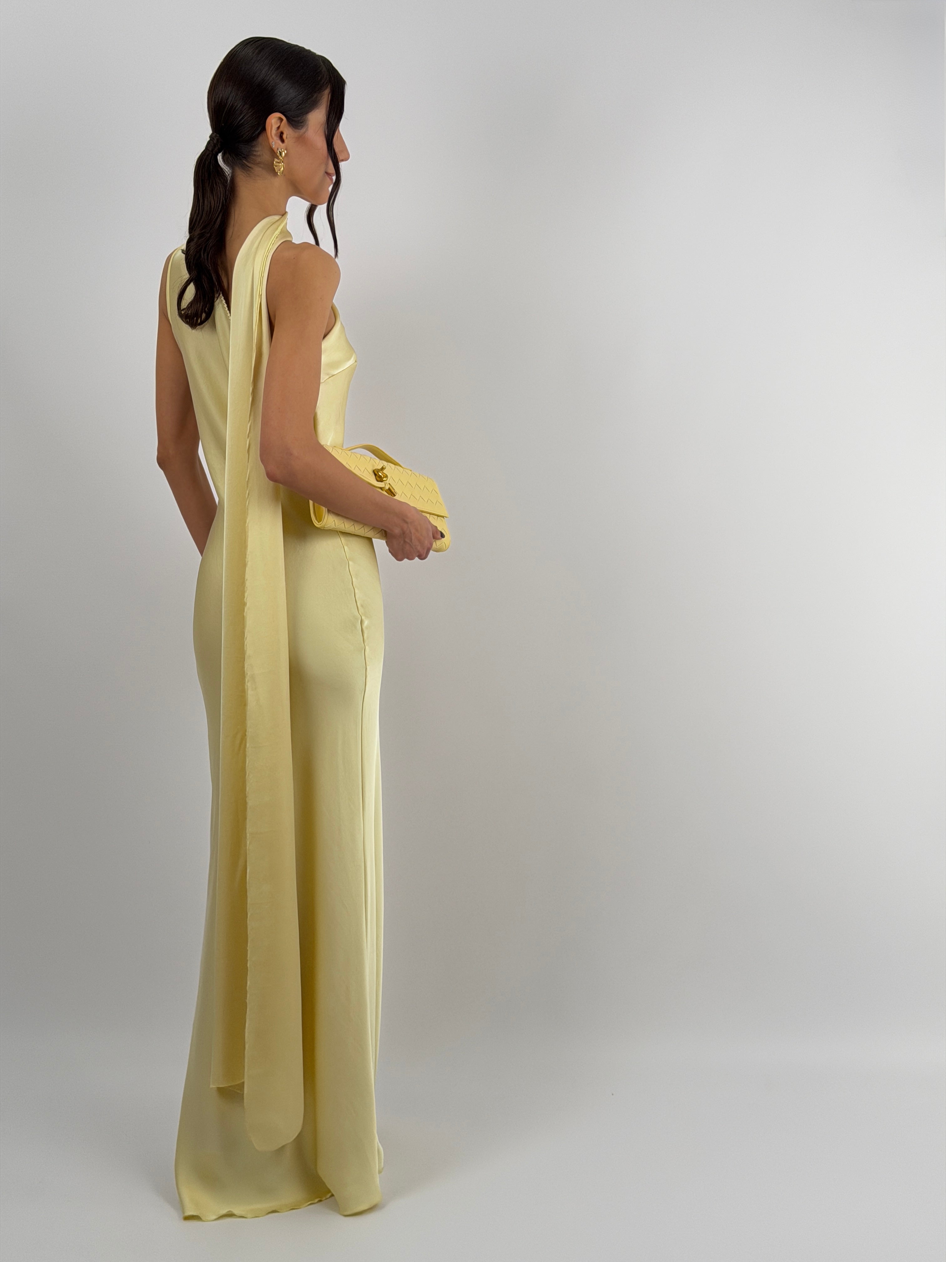 Abito giallo lungo fluido in tessuto satinato, monospalla con stola incorporata