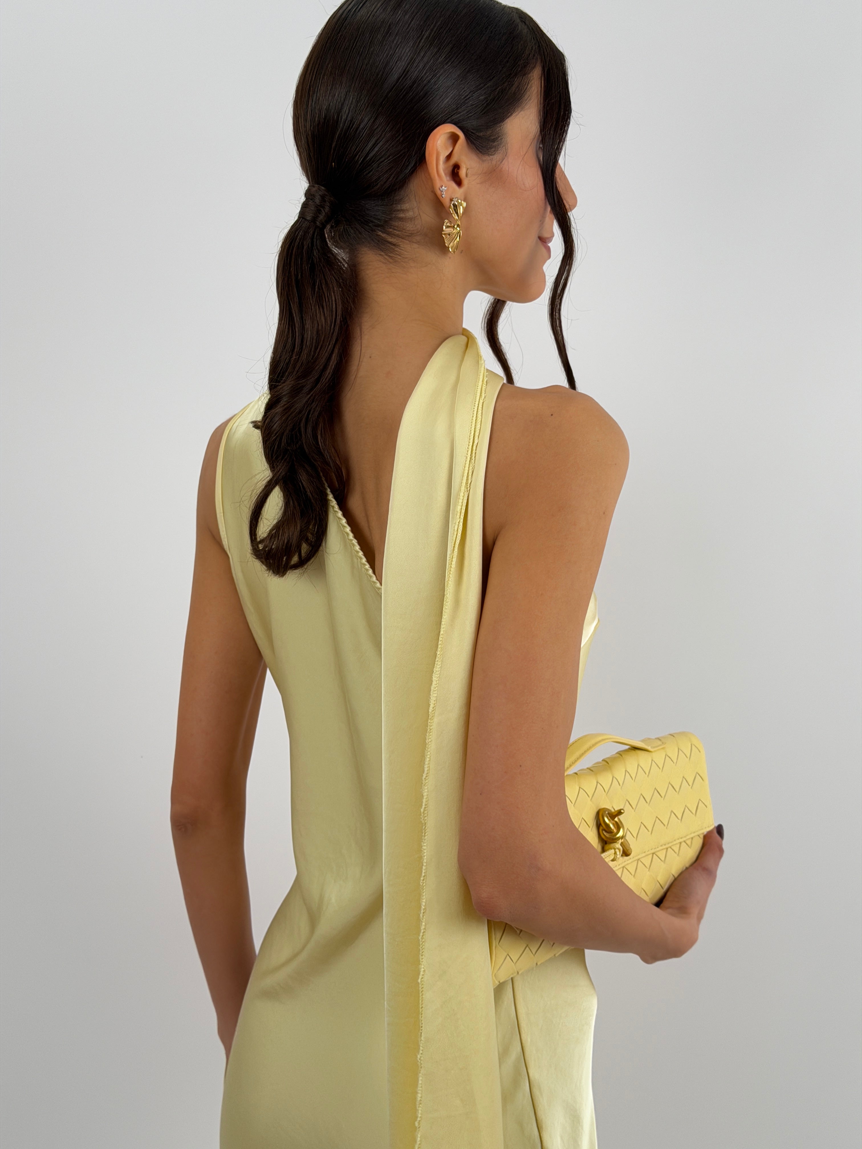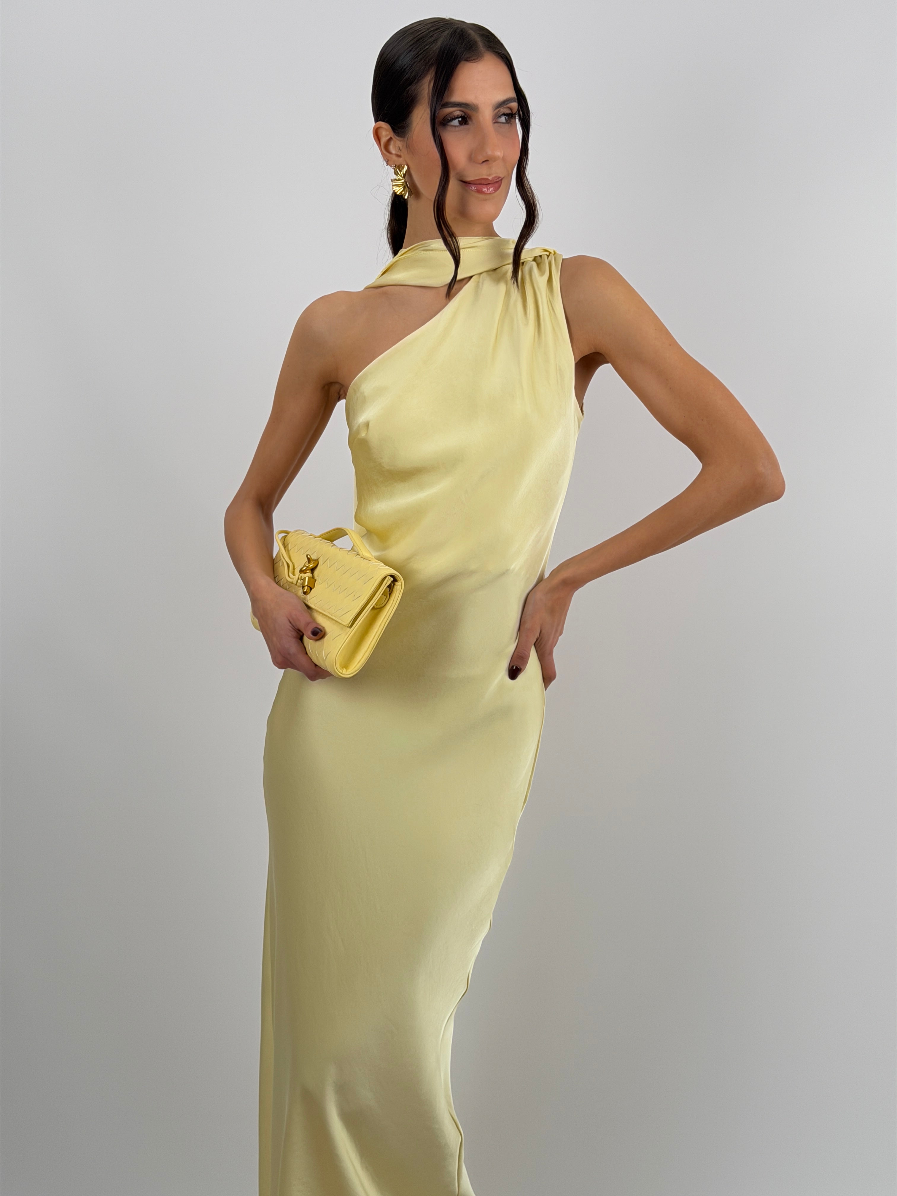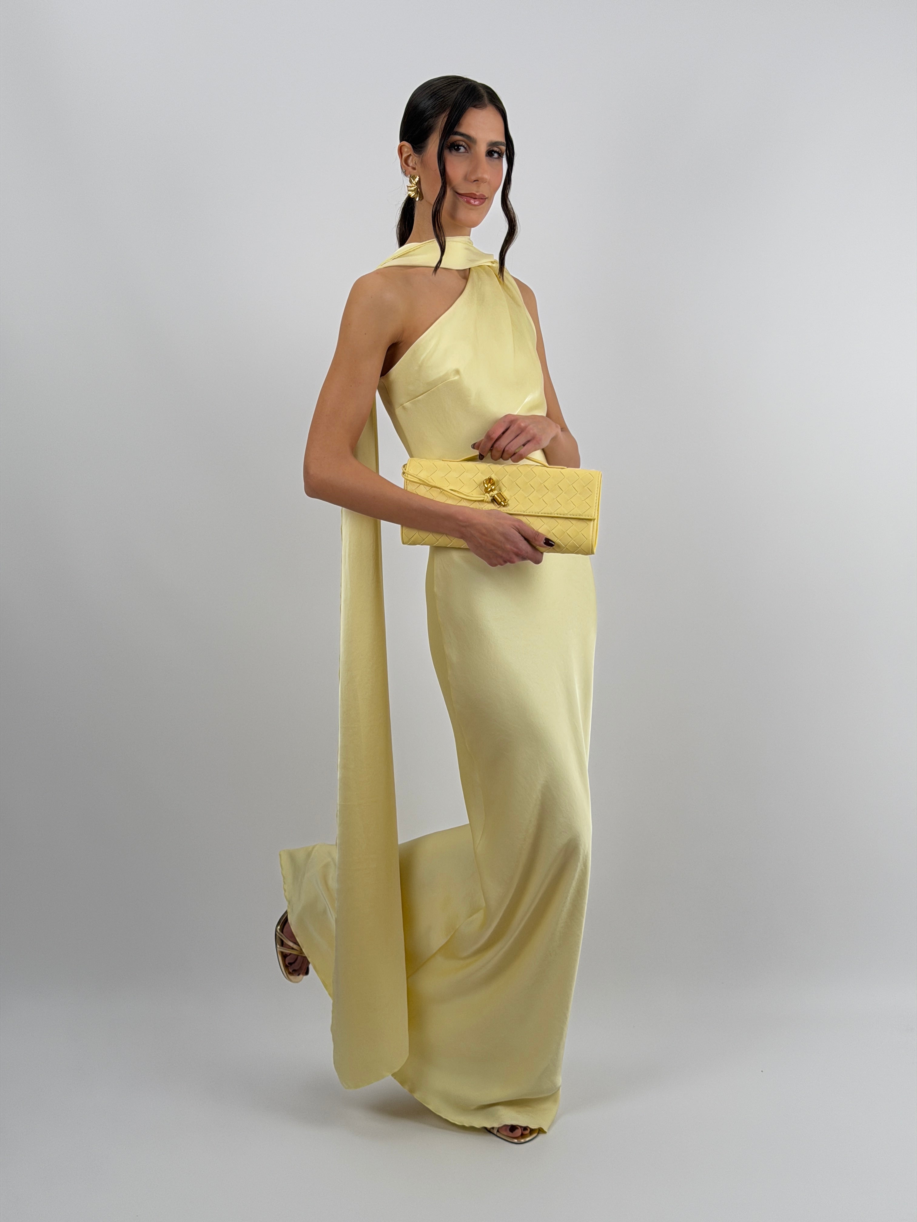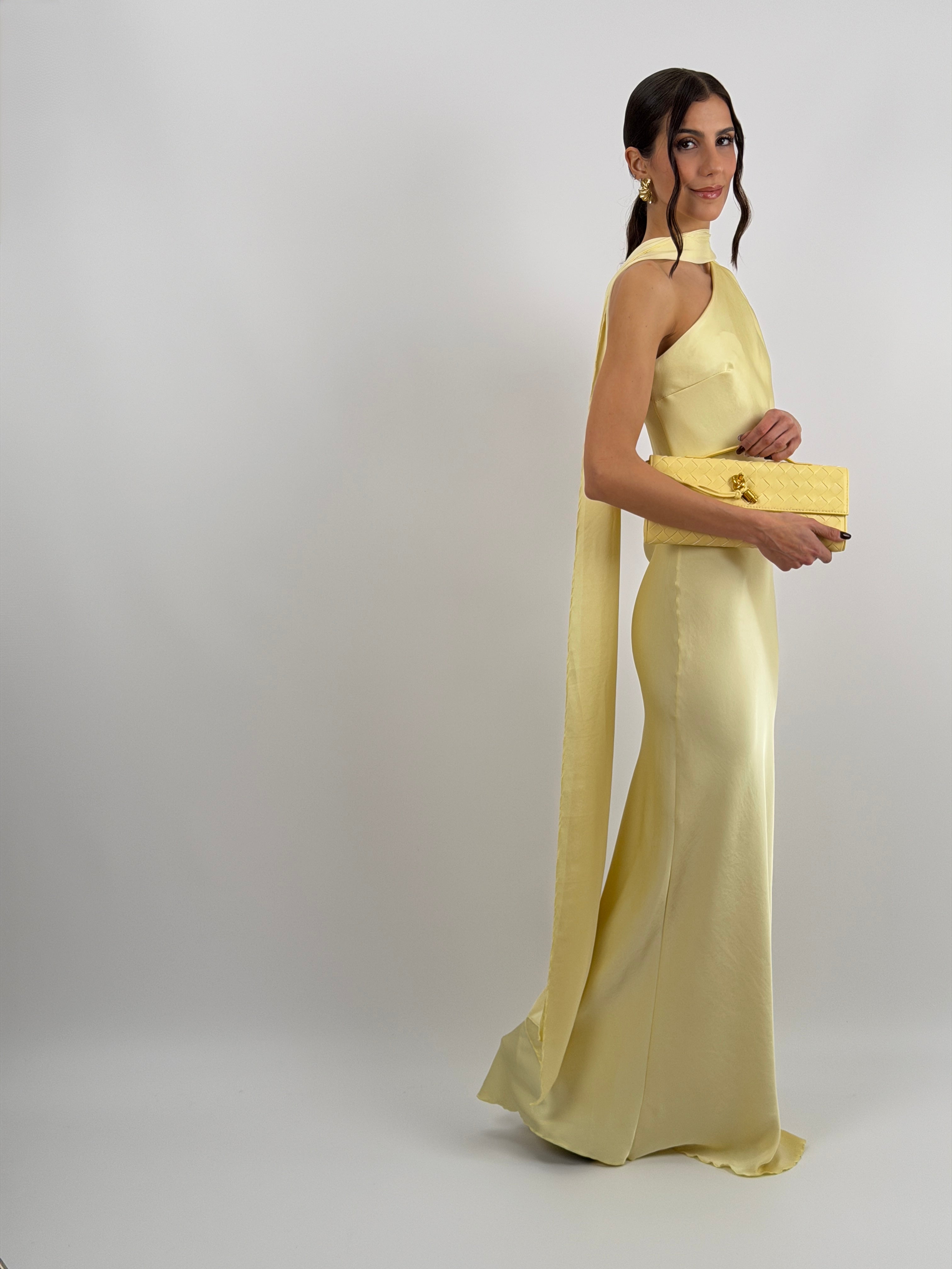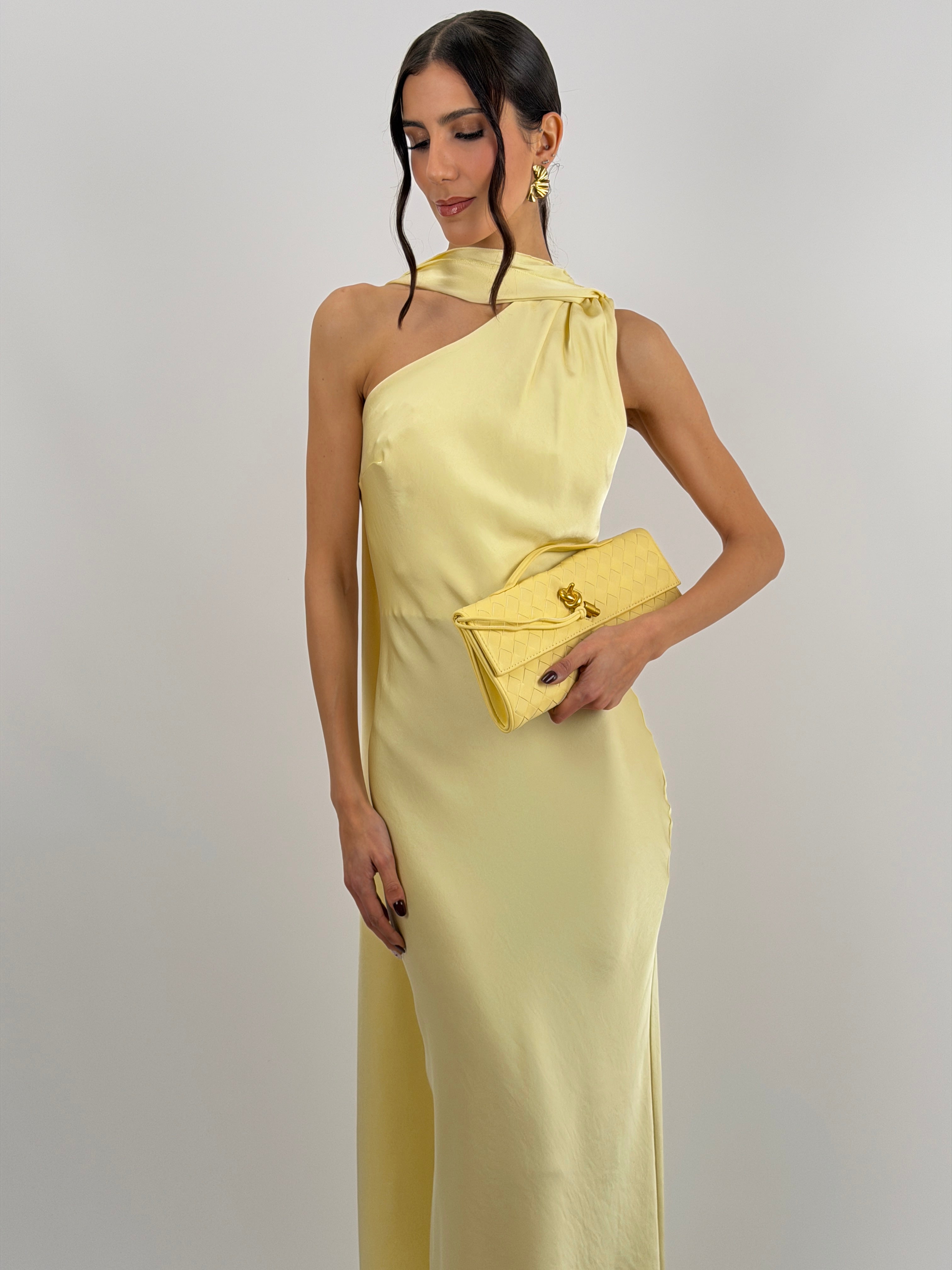 Abito giallo lungo fluido in tessuto satinato, monospalla con stola incorporata