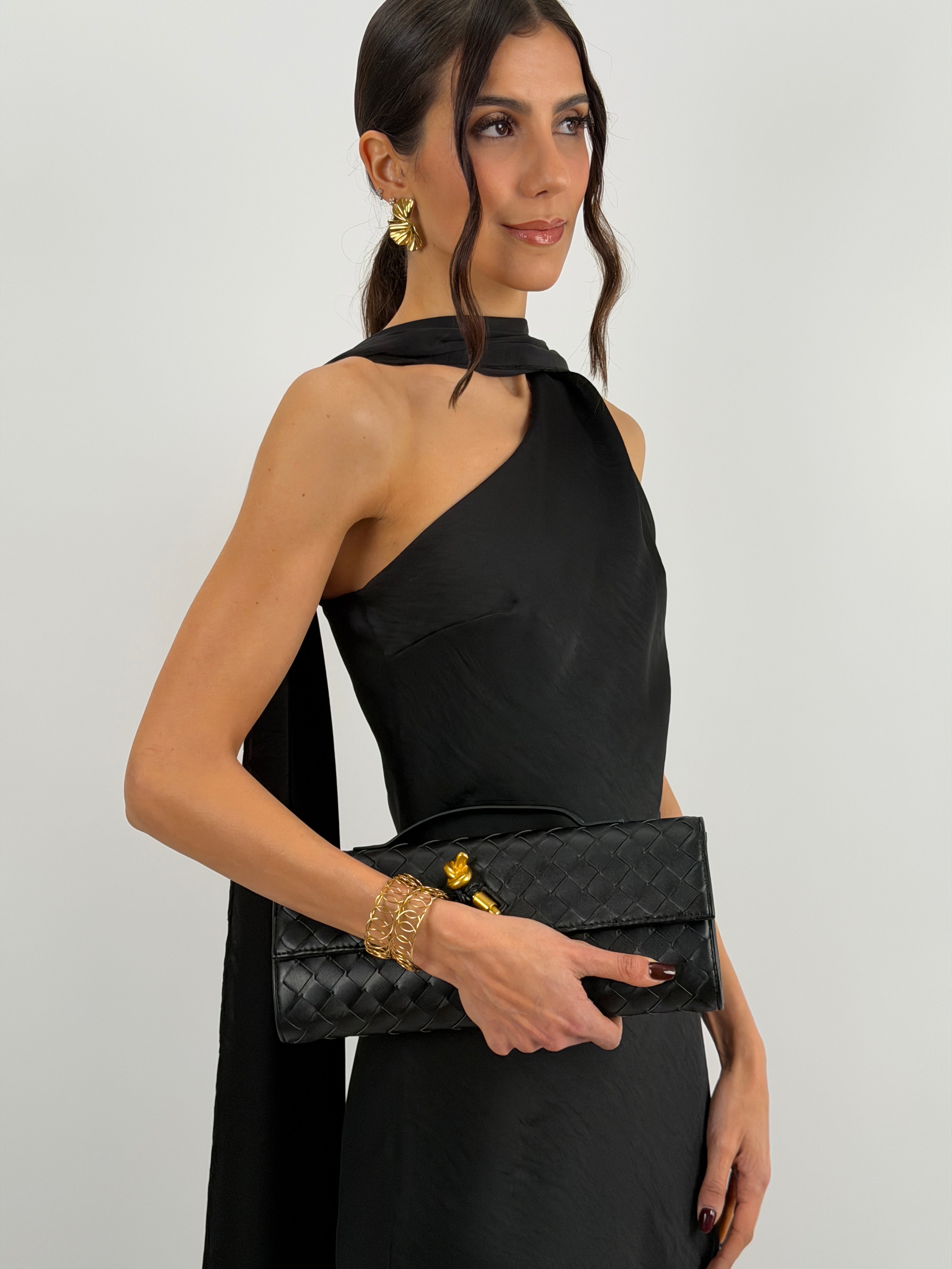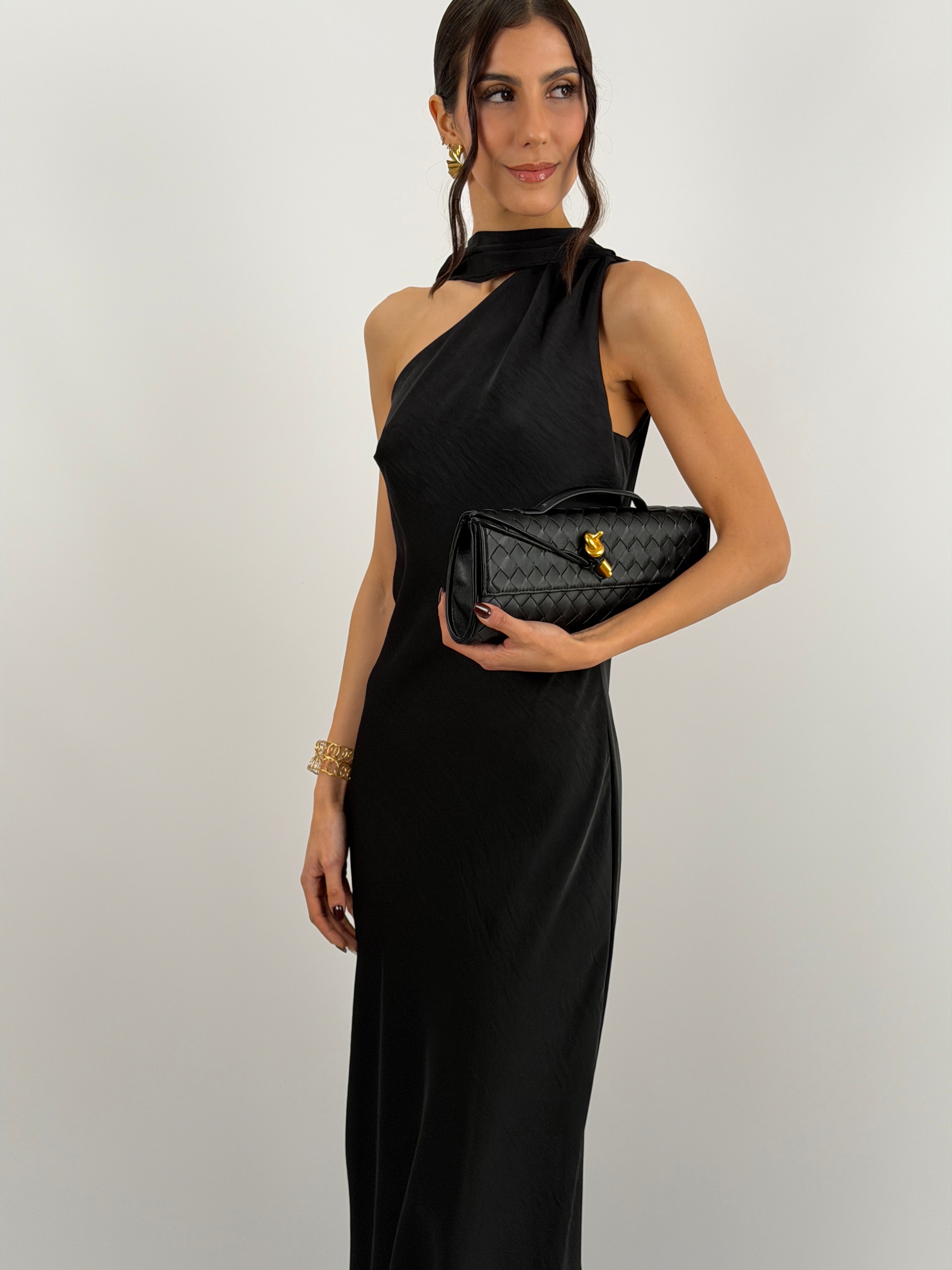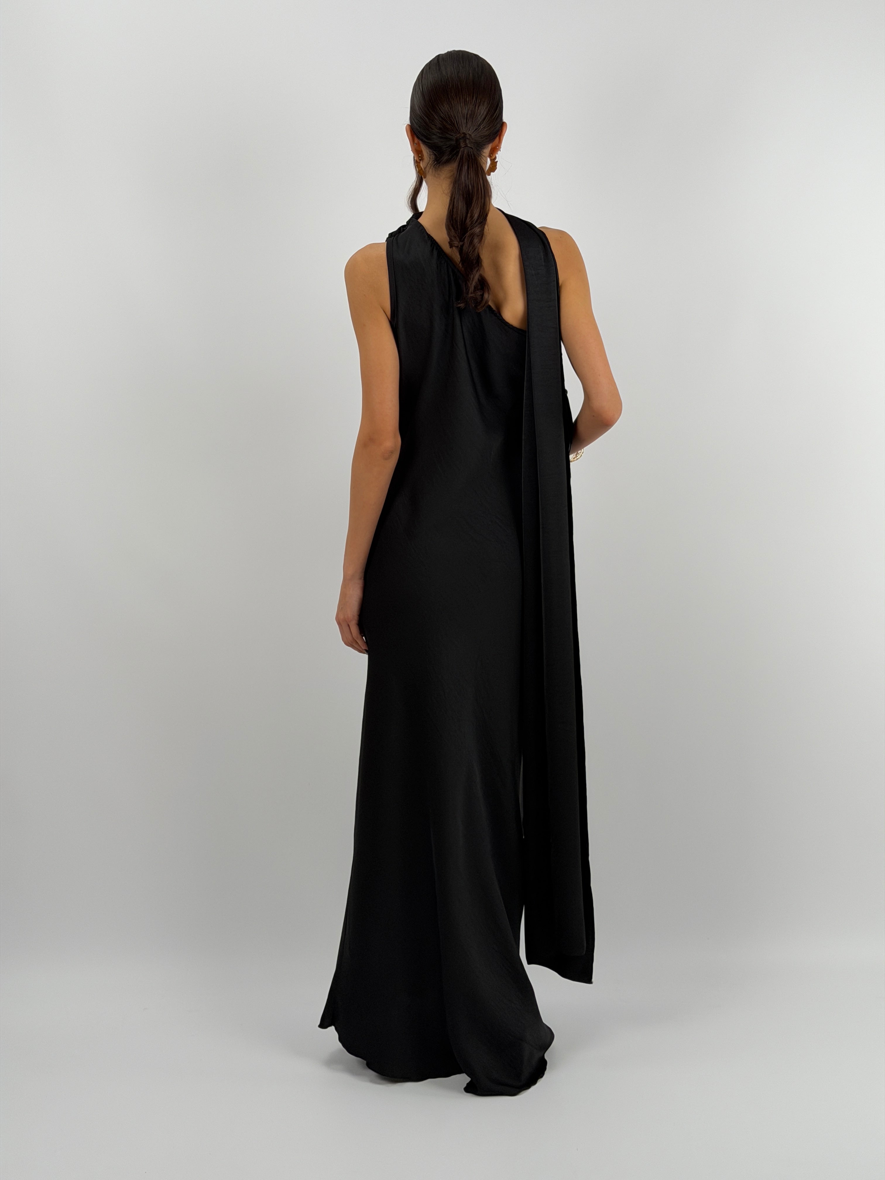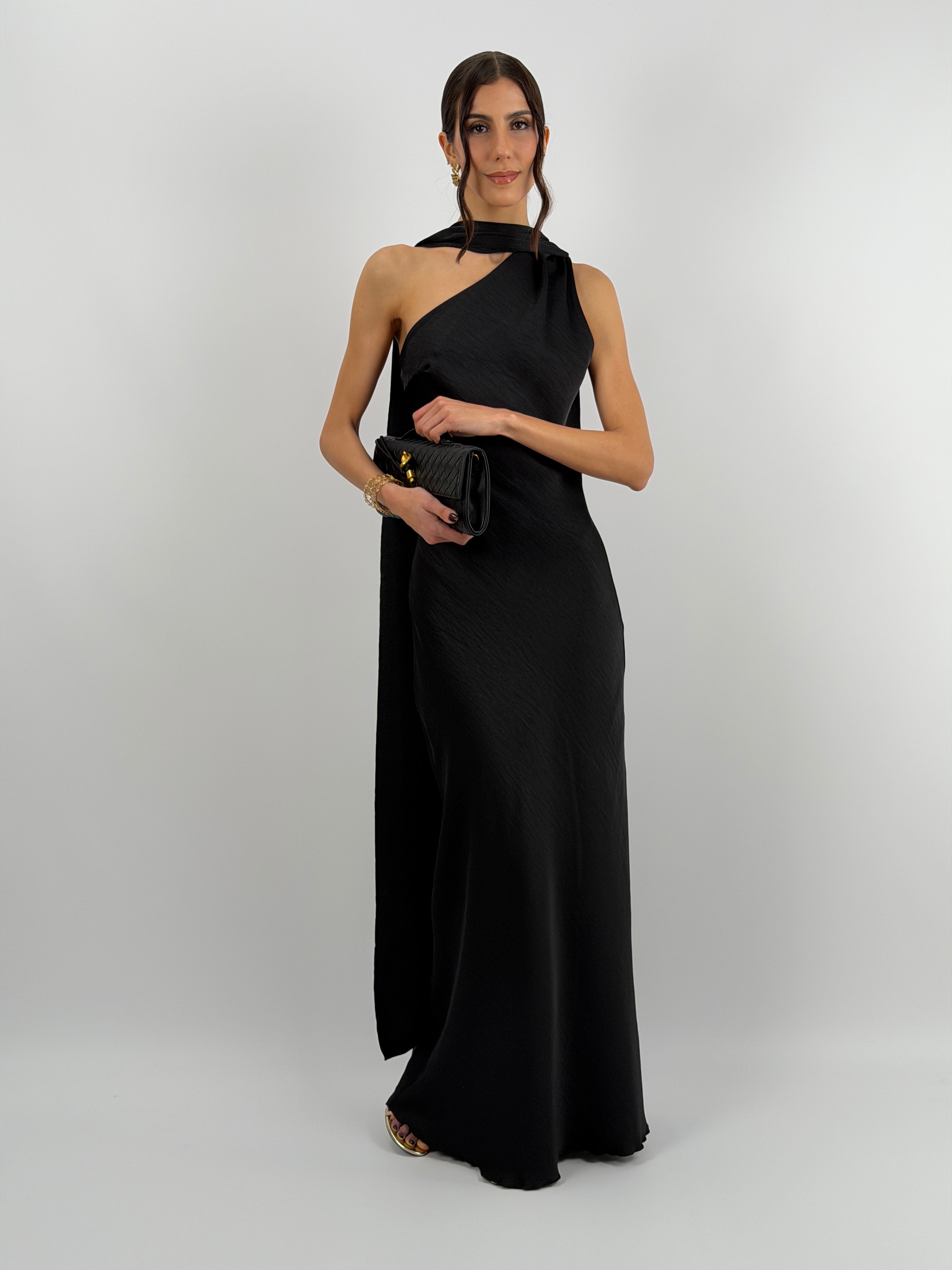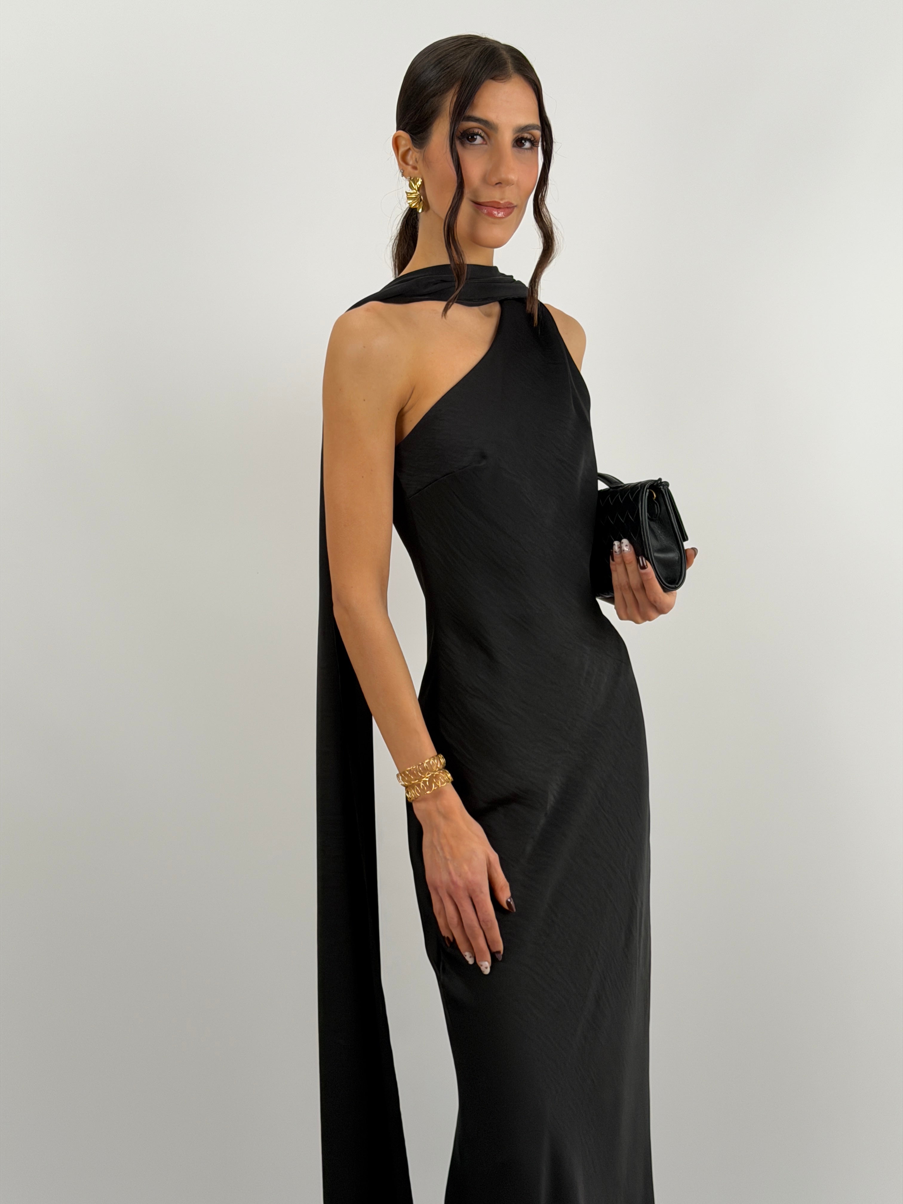 Abito nero lungo fluido in tessuto satinato, monospalla con stola incorporata