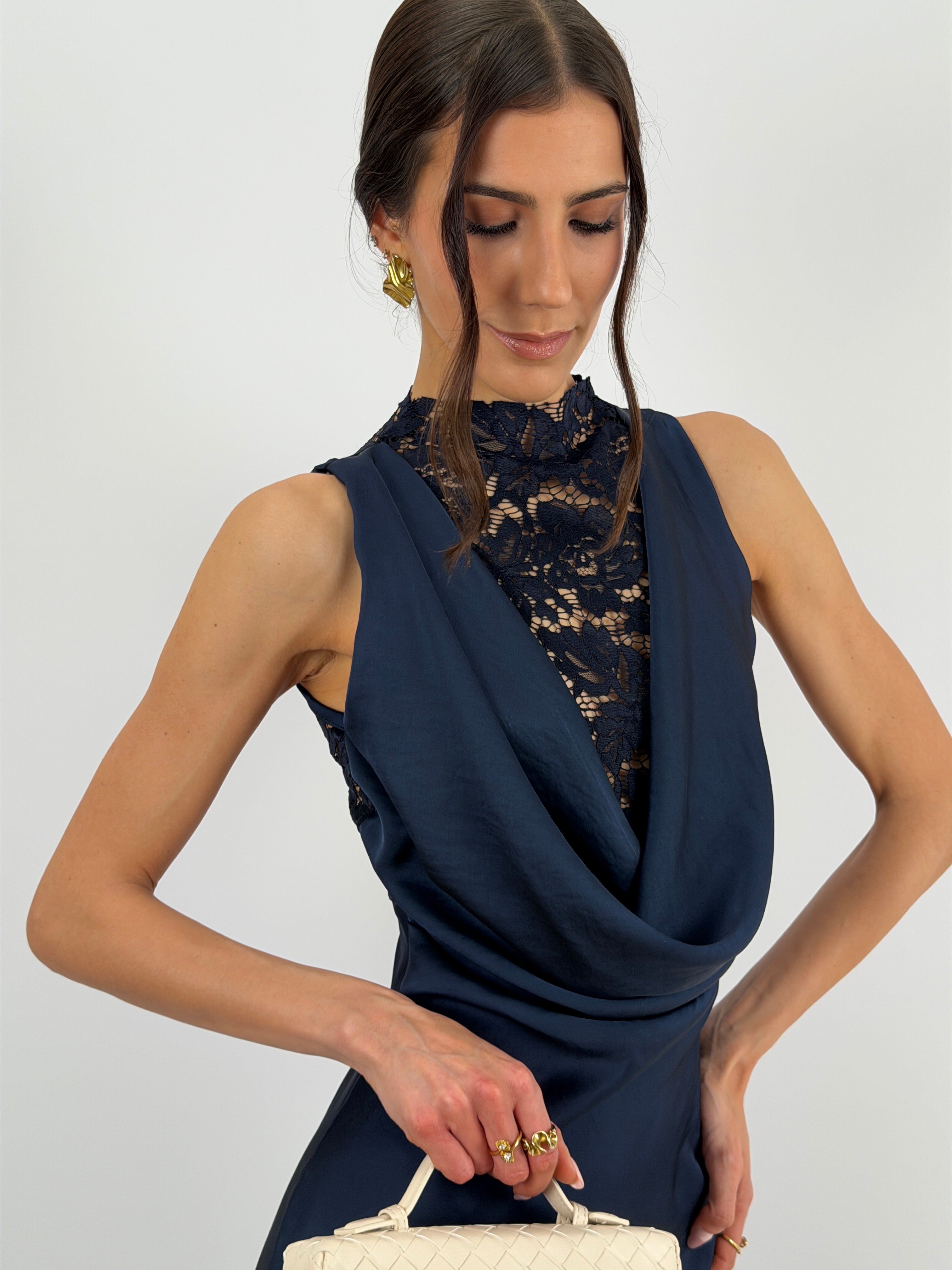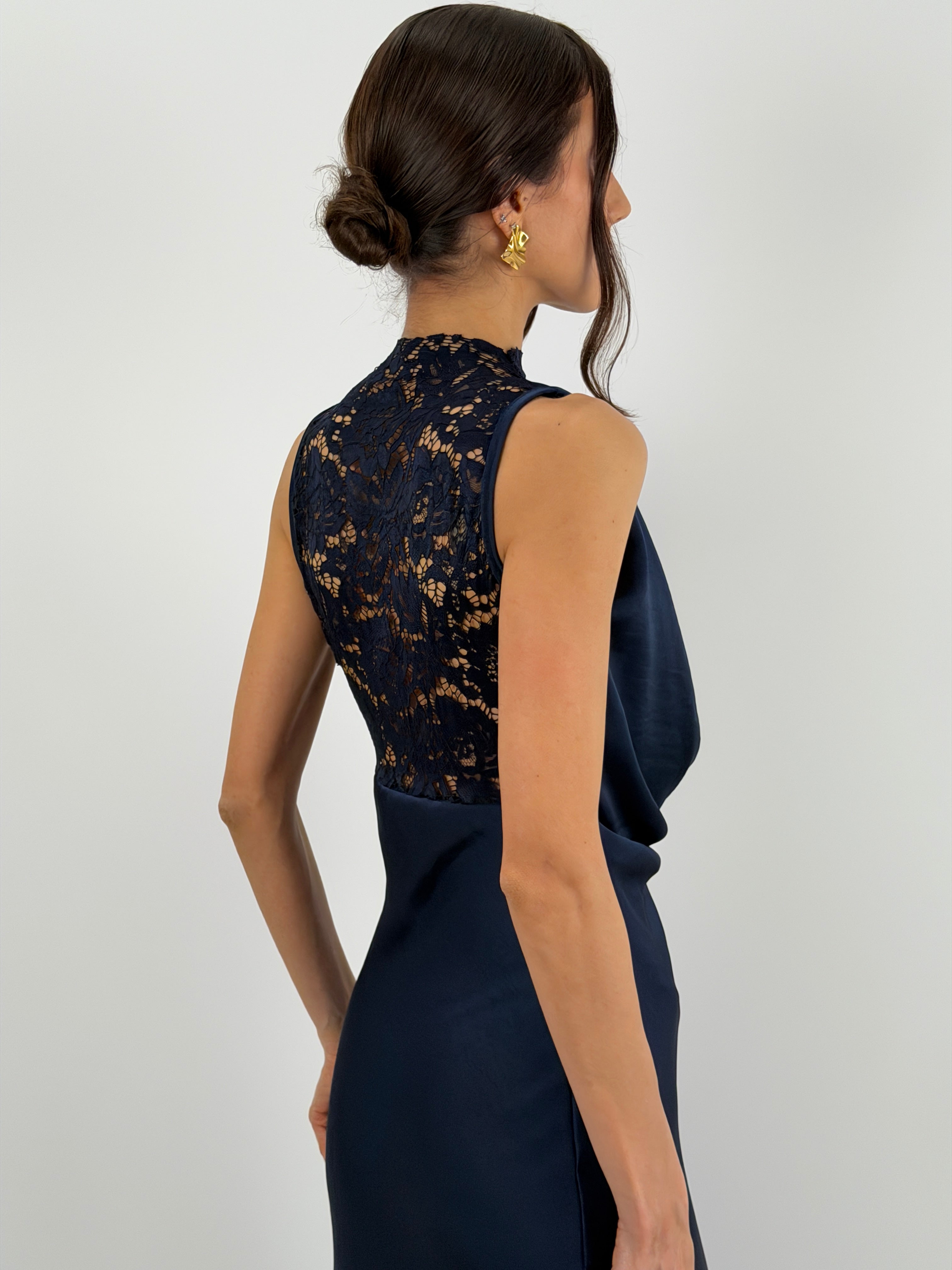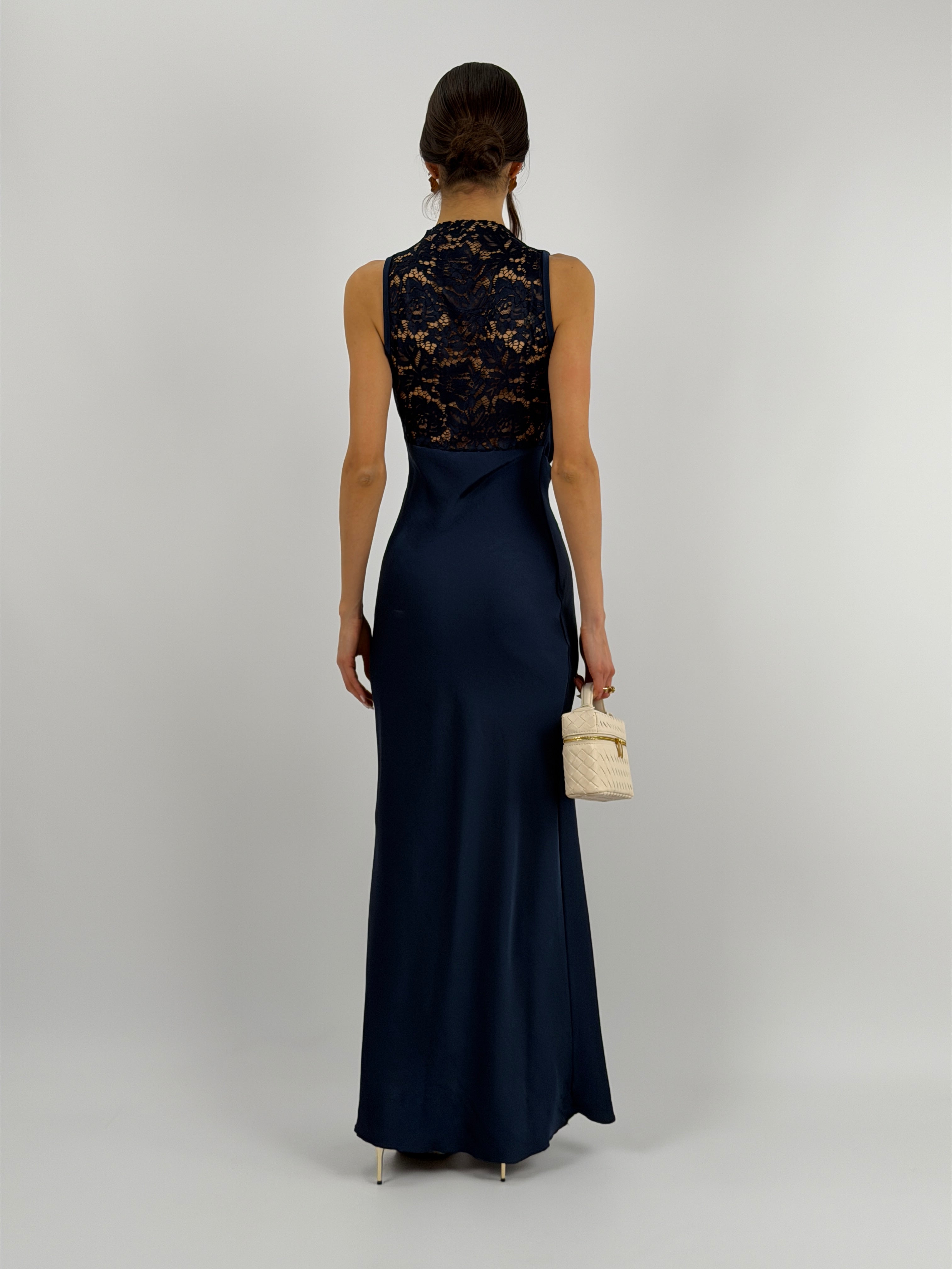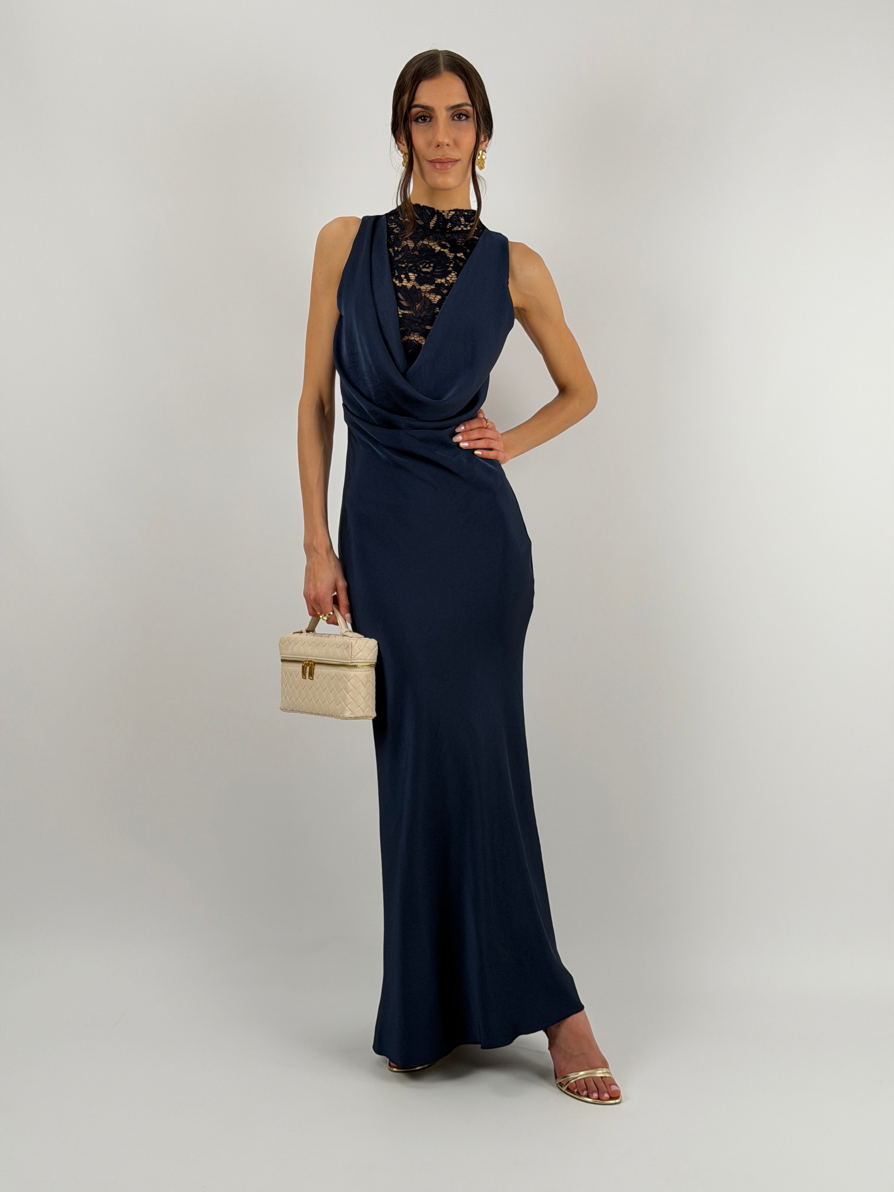 Abito blu lungo fluido in tessuto satinato con scollo morbido e inserti in pizzo tono su tono sul davanti e sul retro