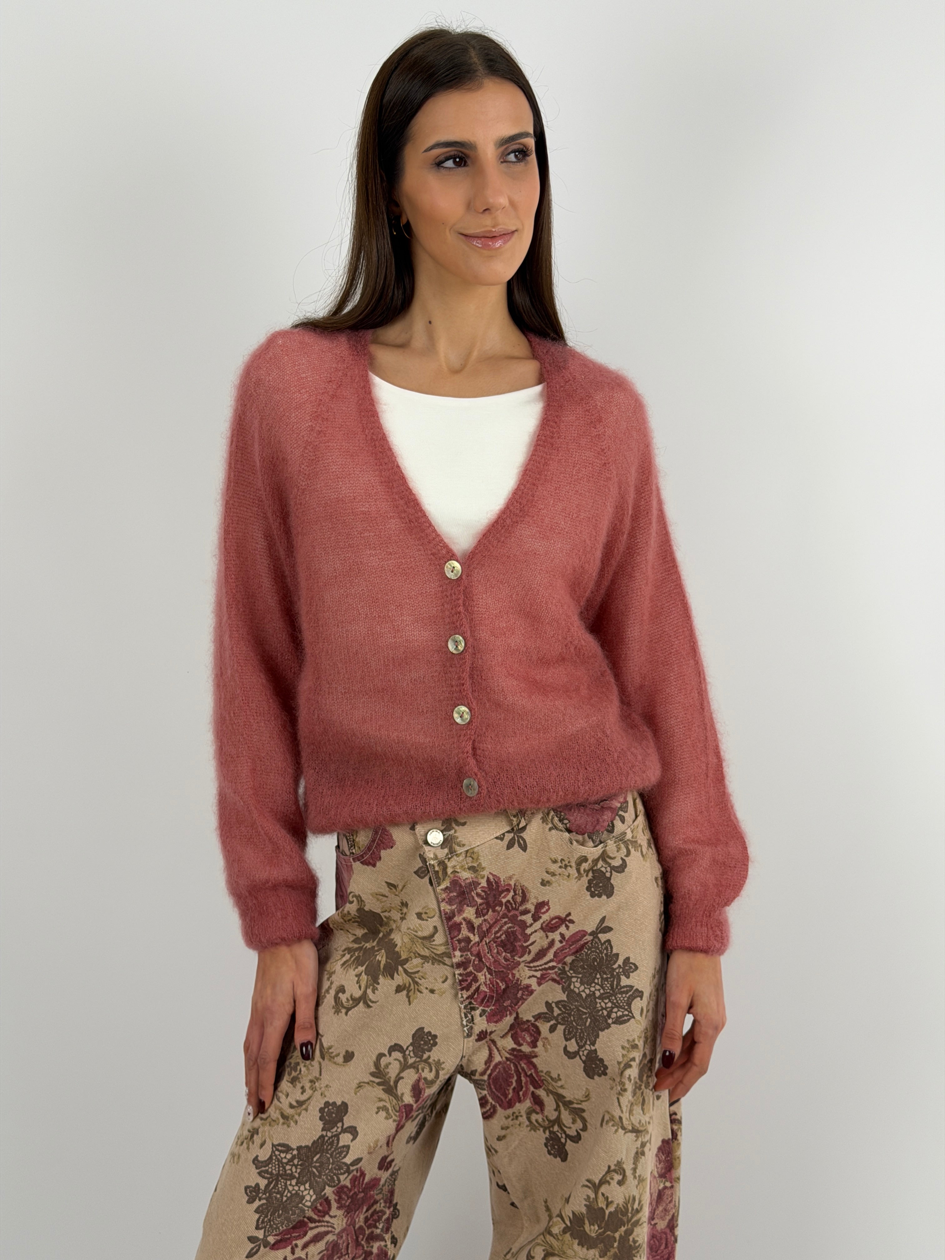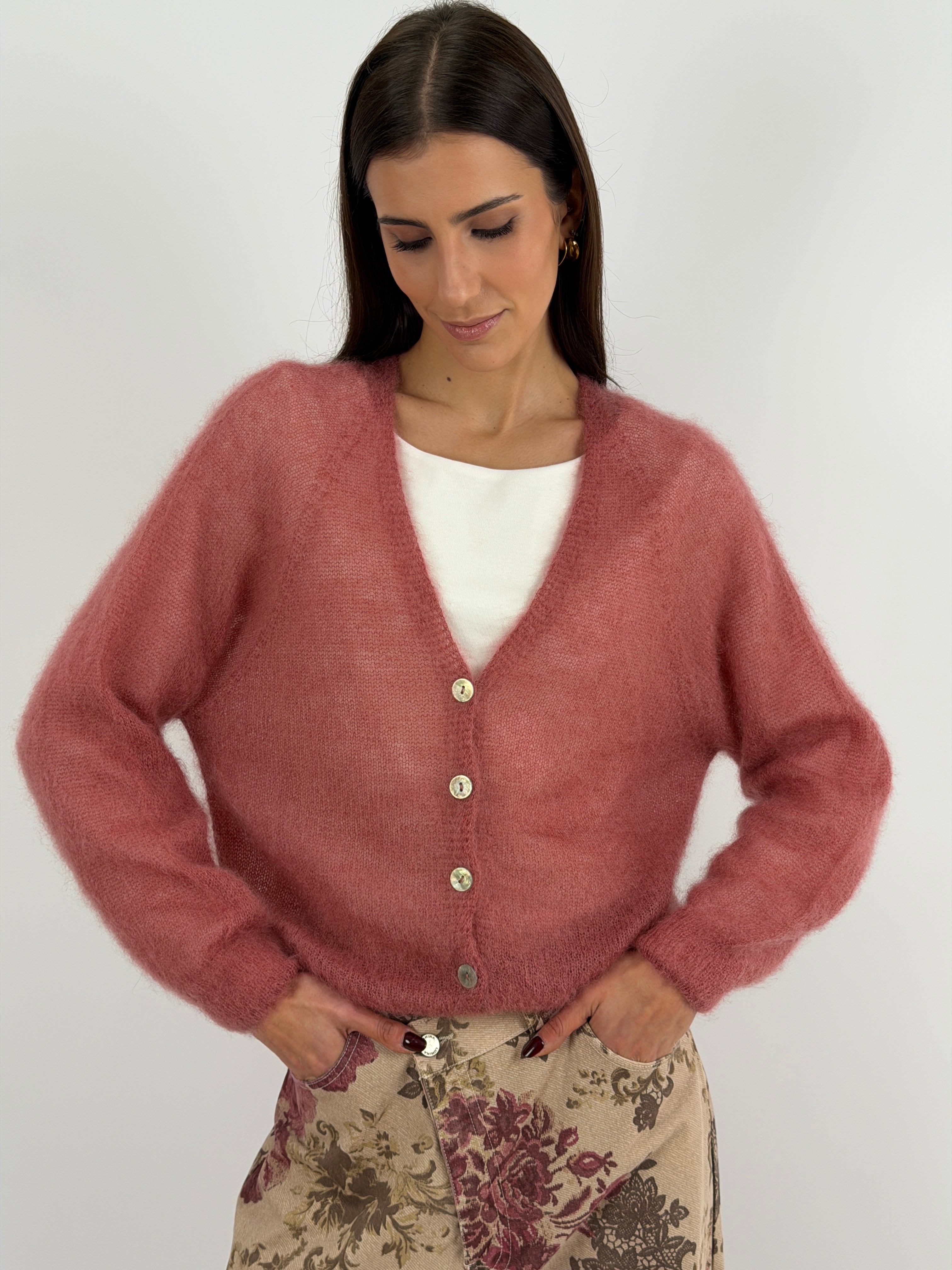 Butter-soft V-neck cardigan with buttons. Made from ultra-light and soft kid mohair, it doesn't itch.
