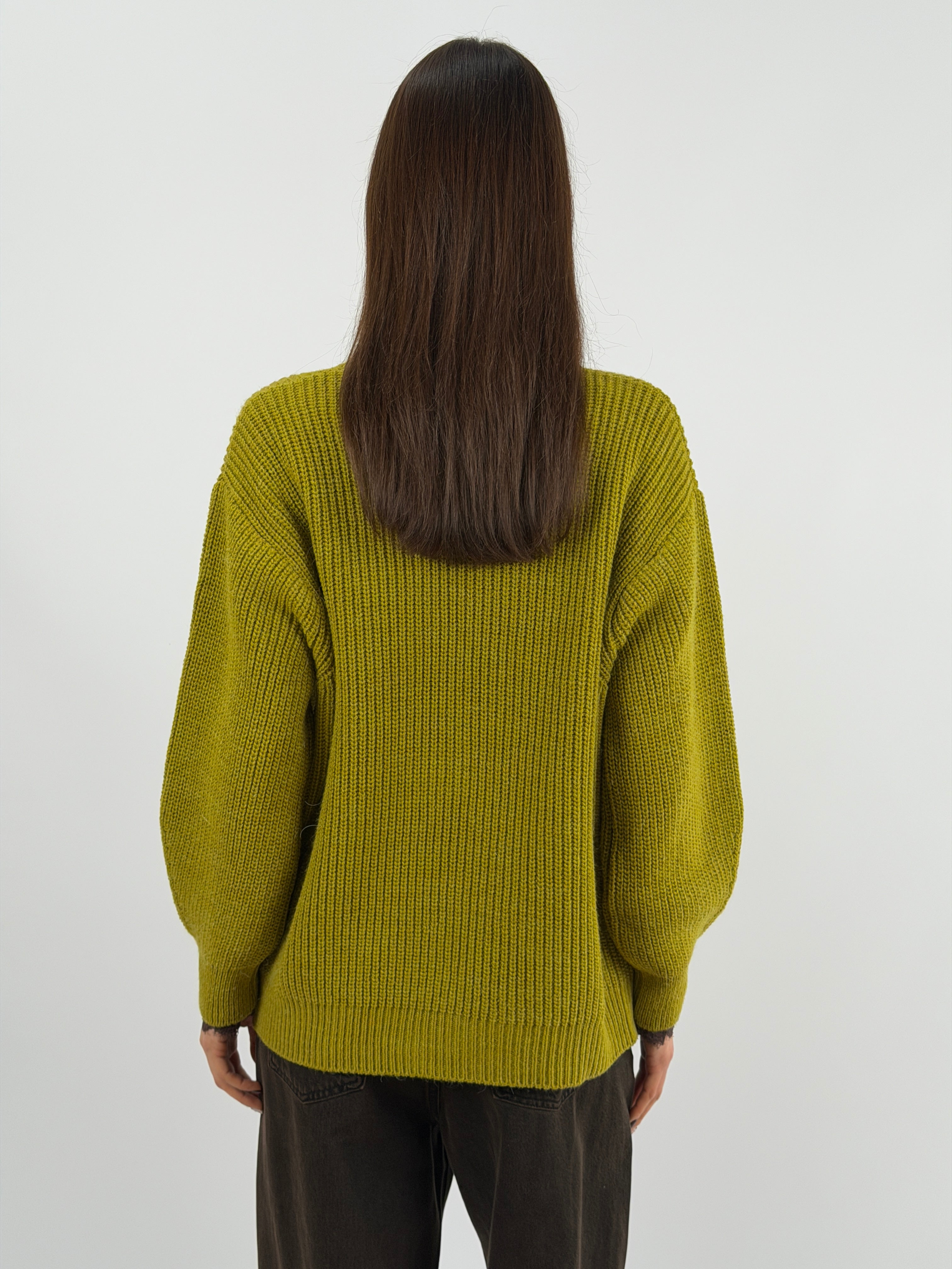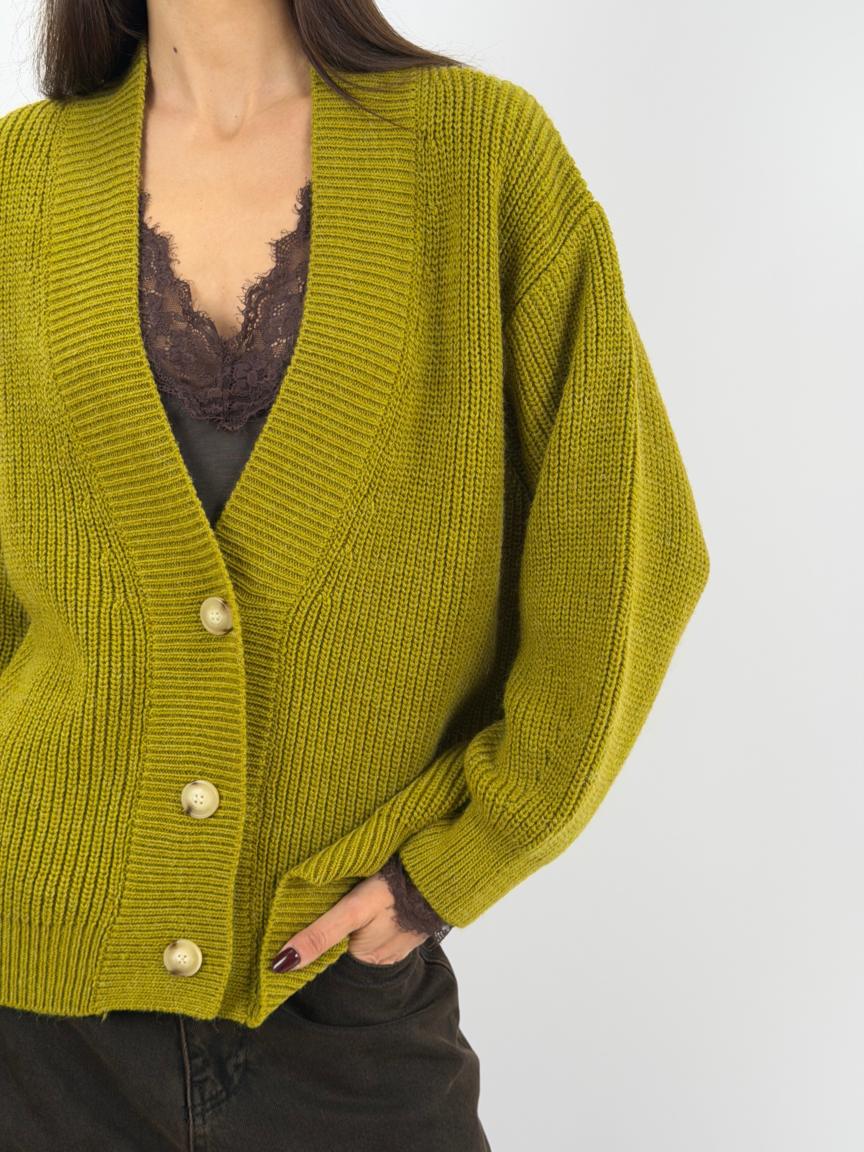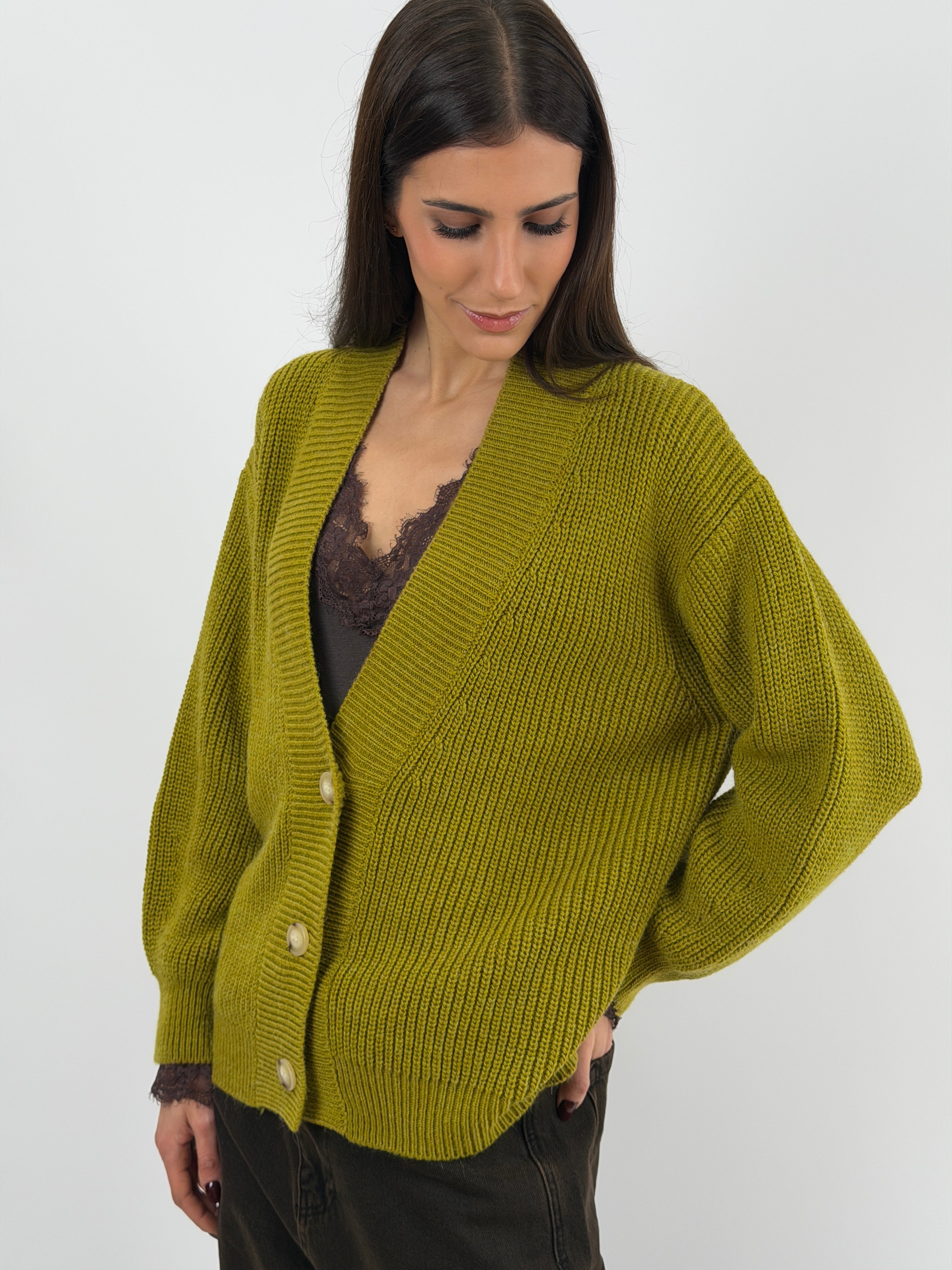 Cardigan over Lumina verde in maglia con finiture a costine e chiusura frontale con bottoni