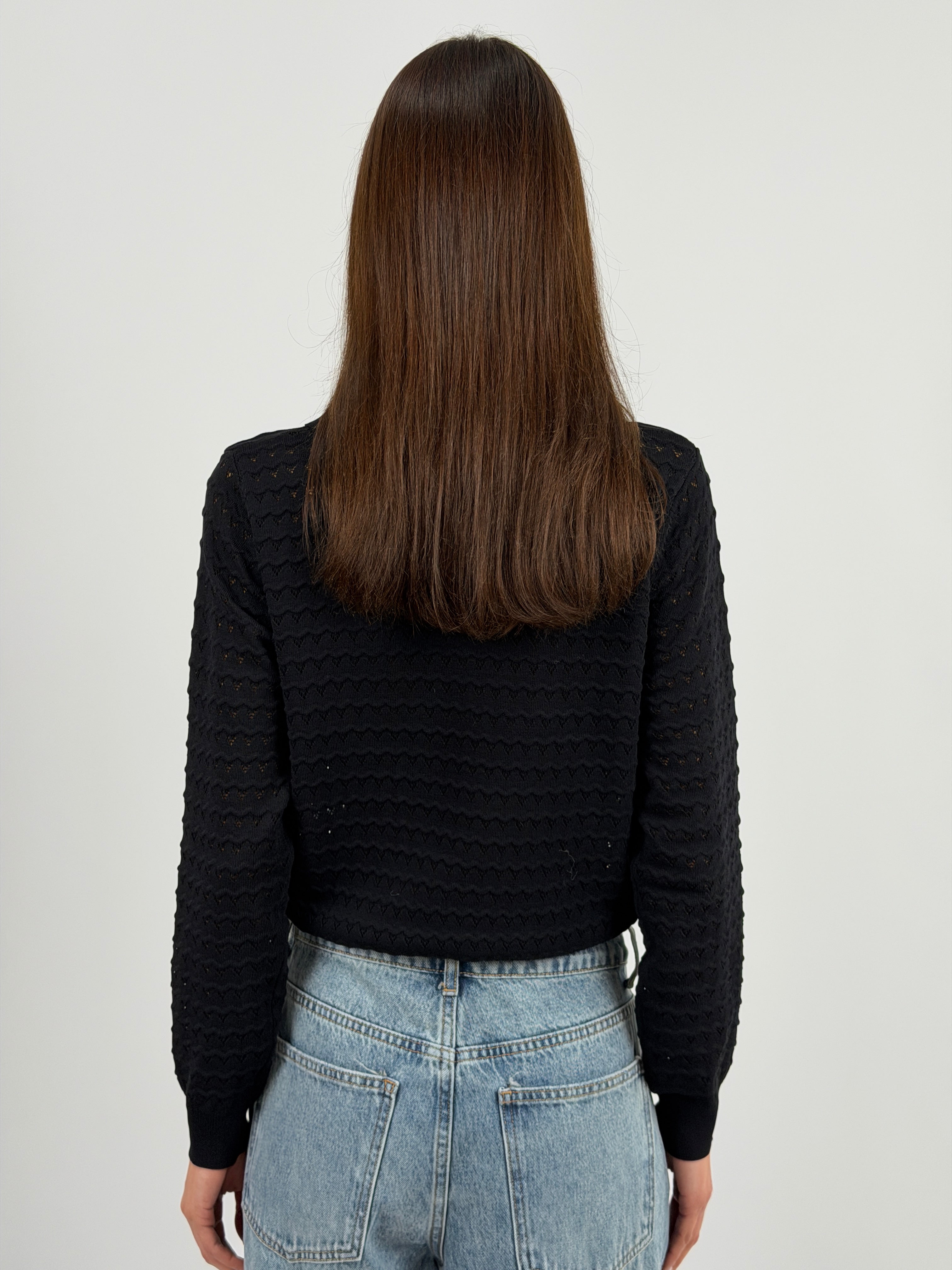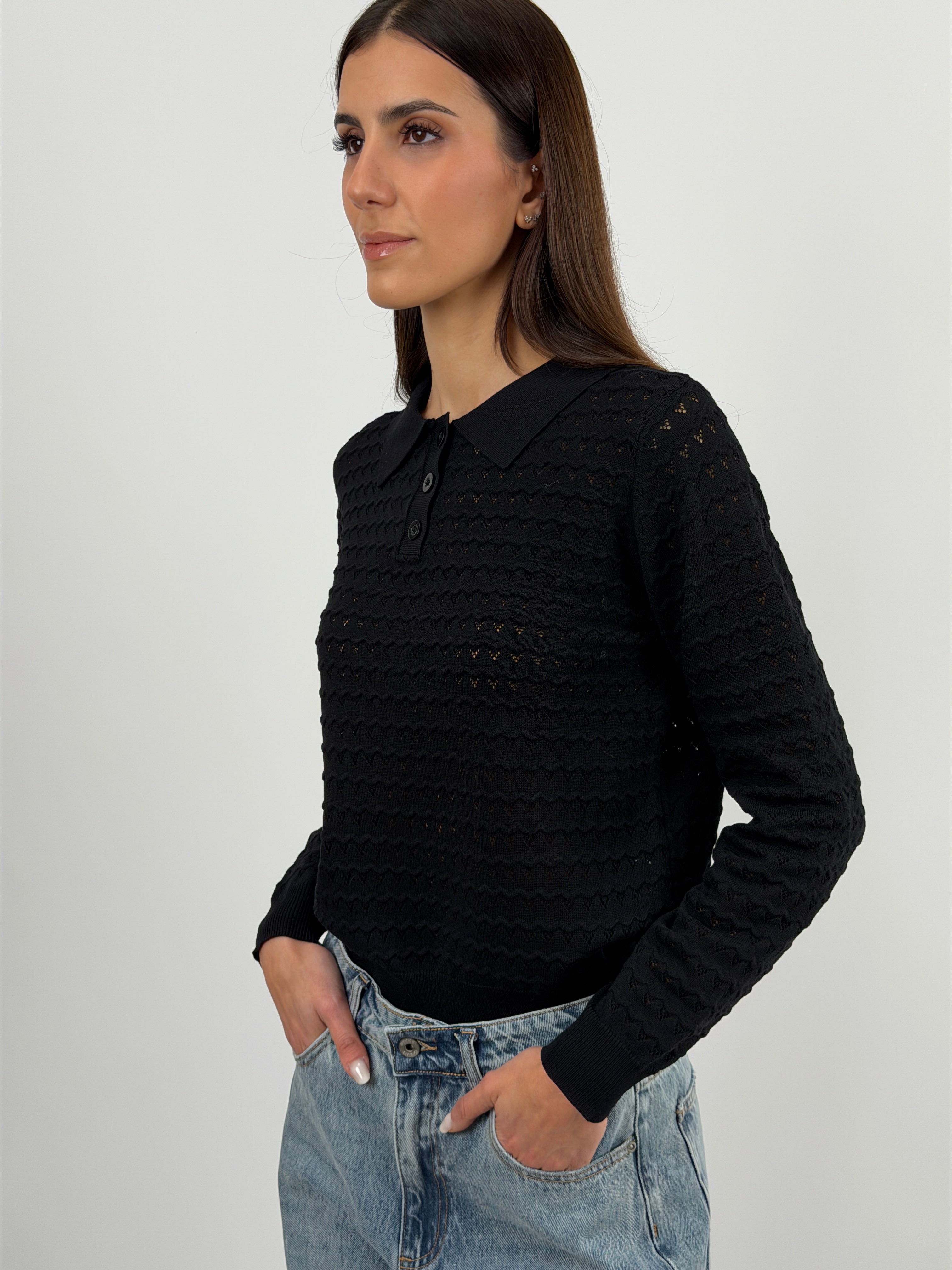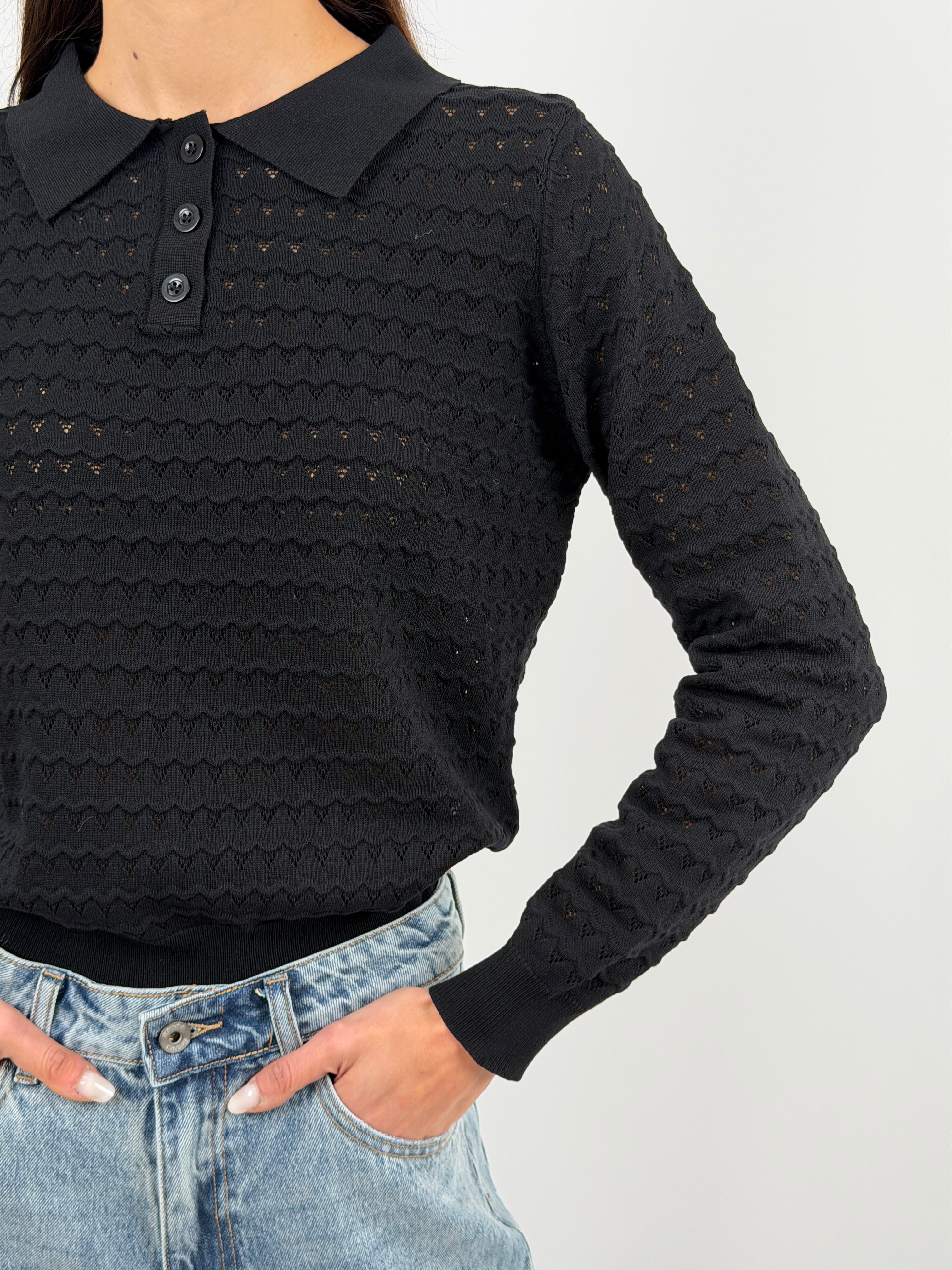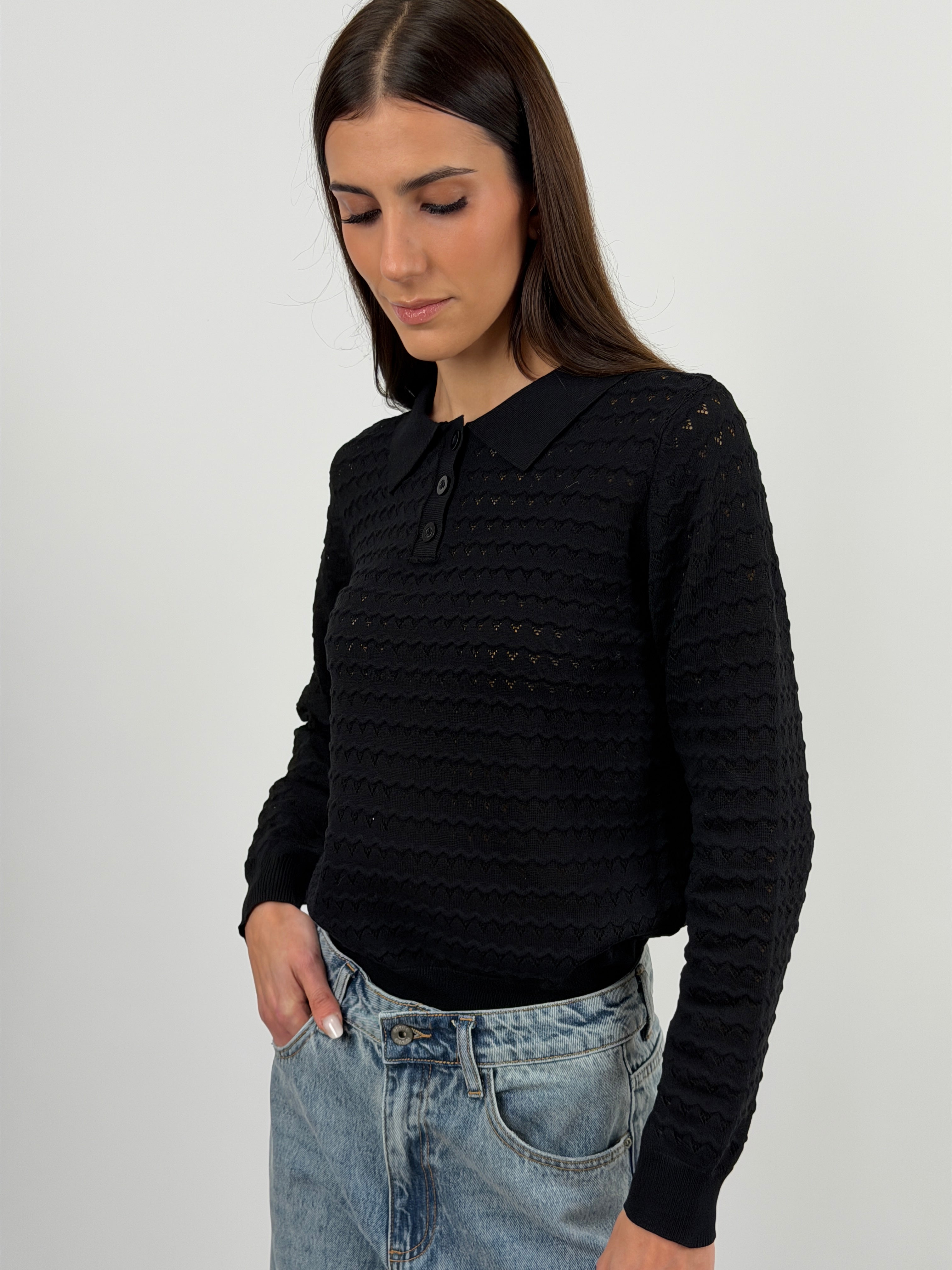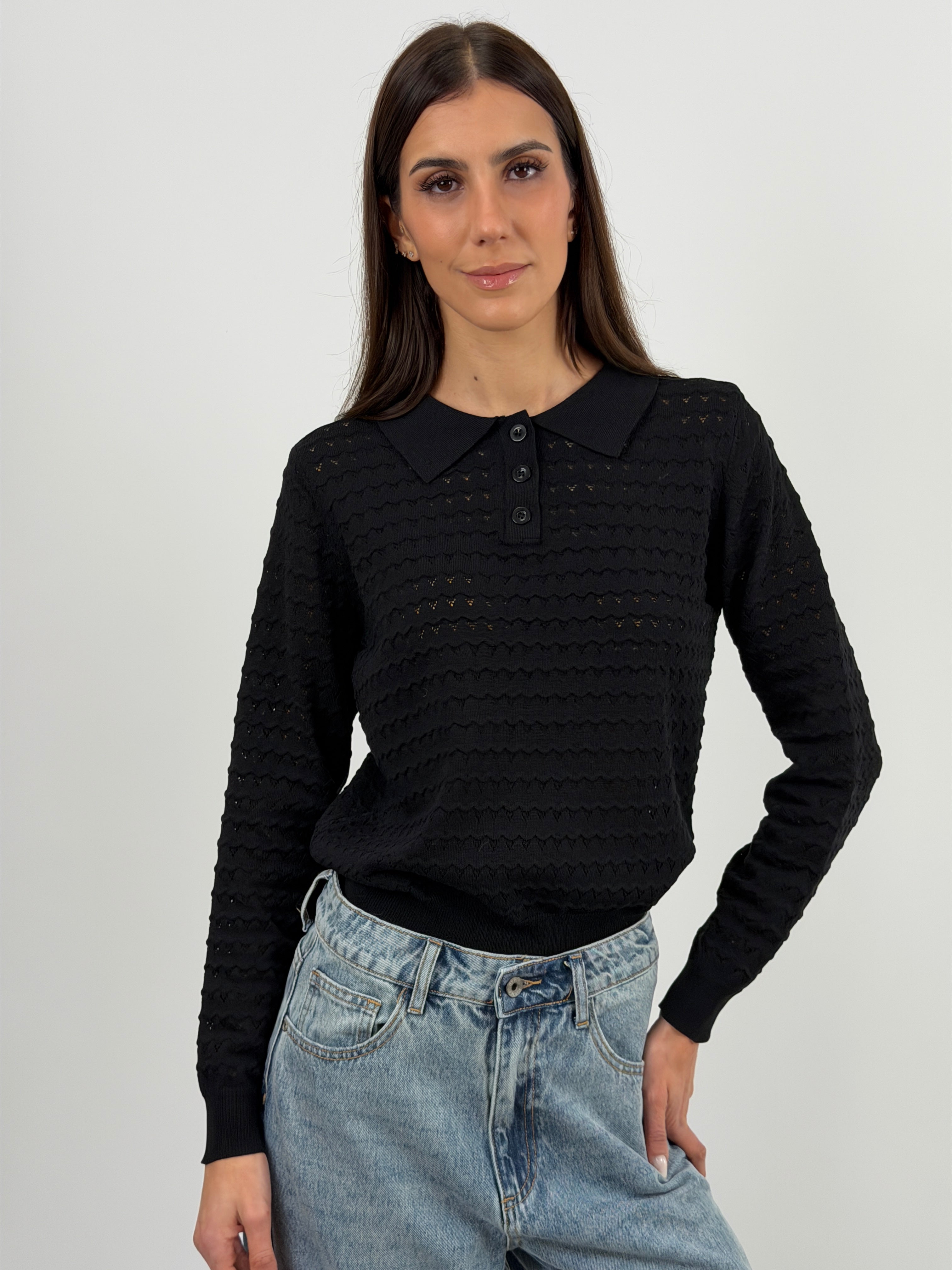 Maglia polo nera con colletto e bottoncini, maniche lunghe e tessuto con lavorazione