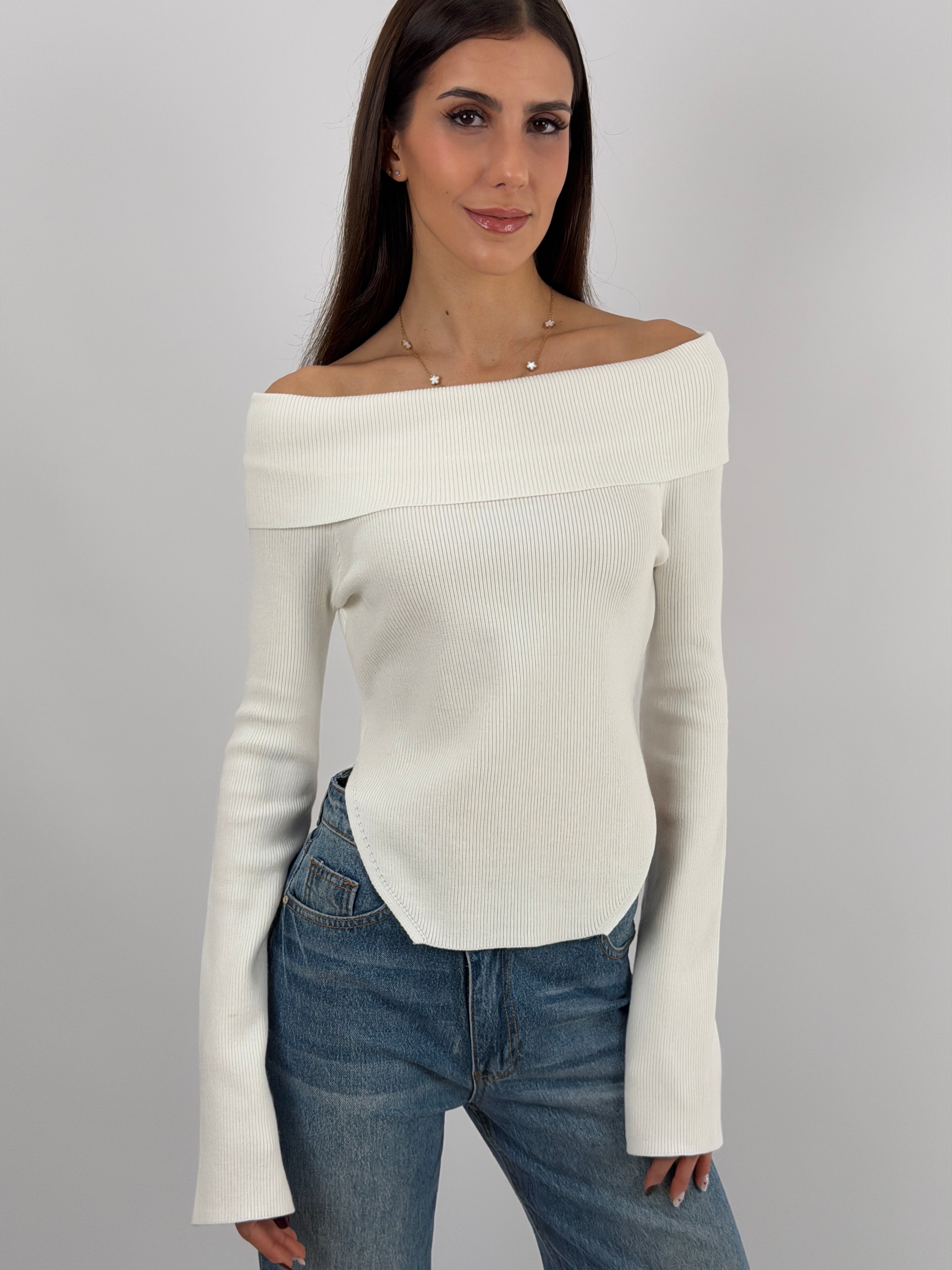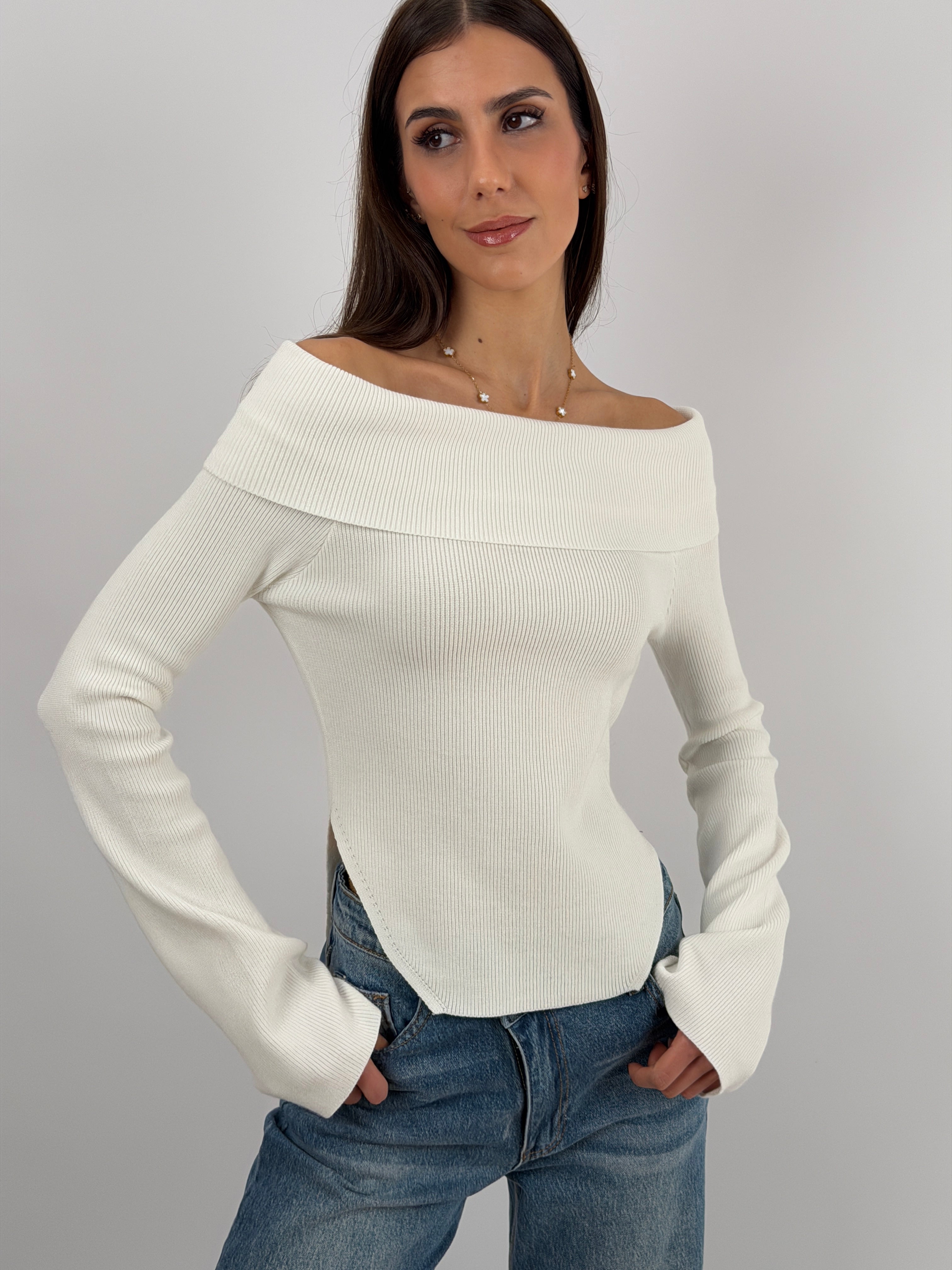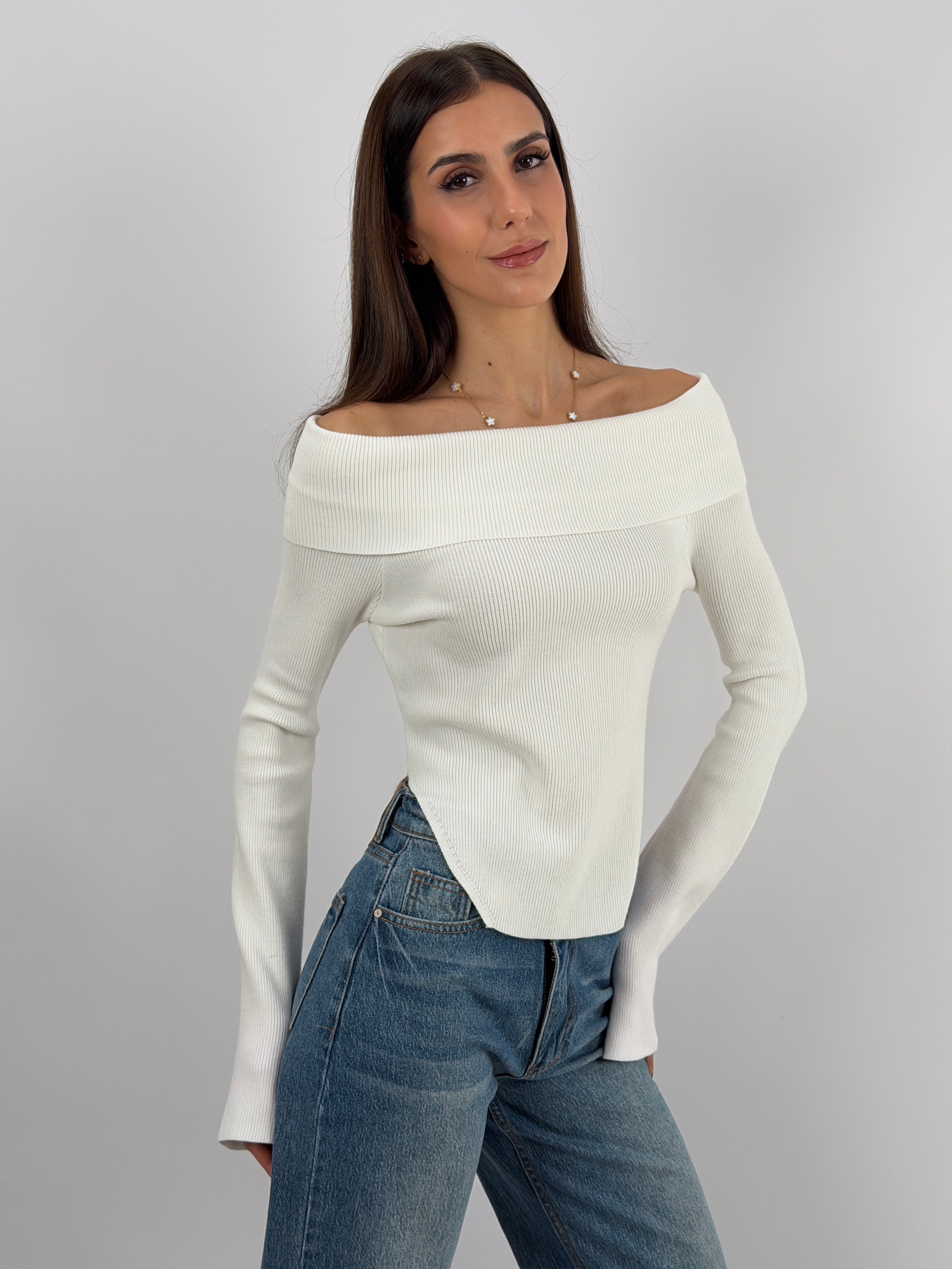 Maglia bianca a coste con maniche lunghe, spalle scoperte e taglio asimmetrico sul fondo