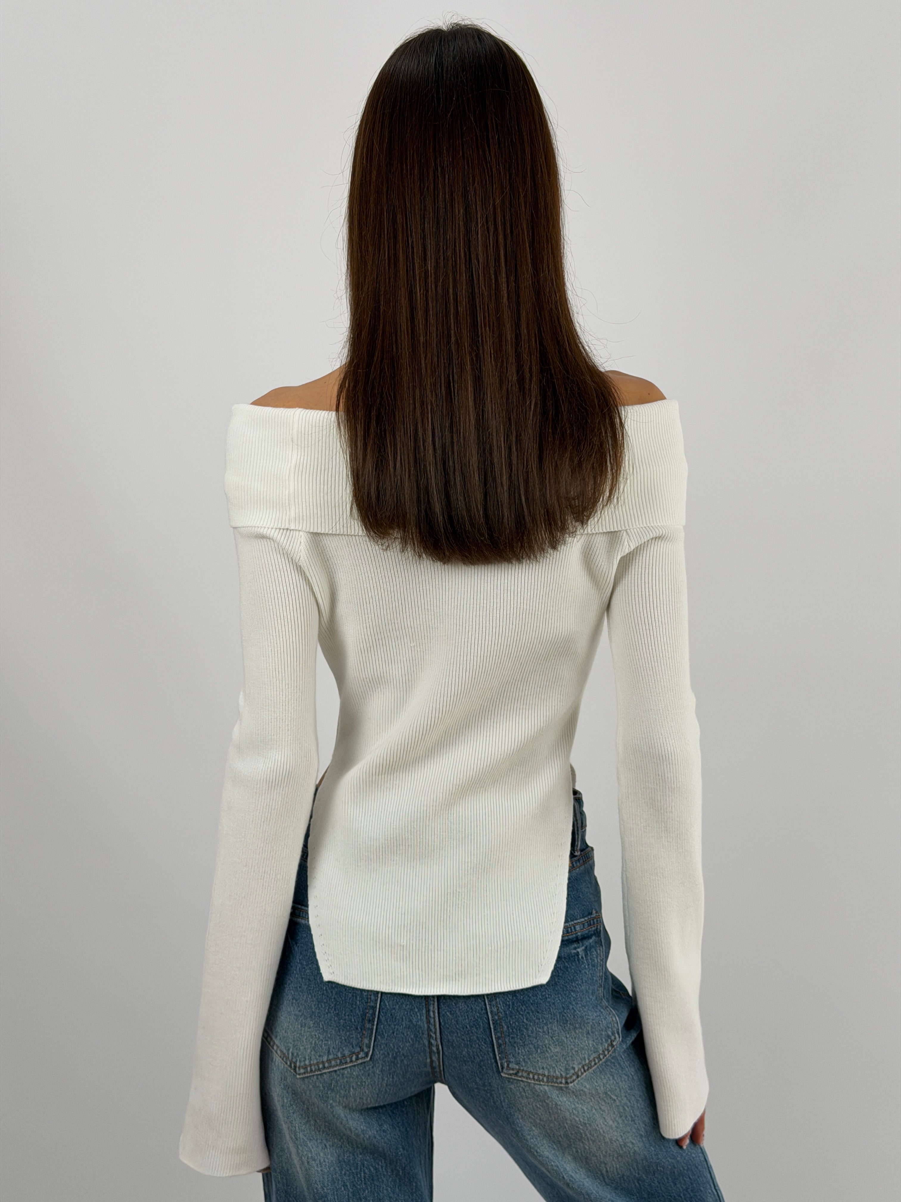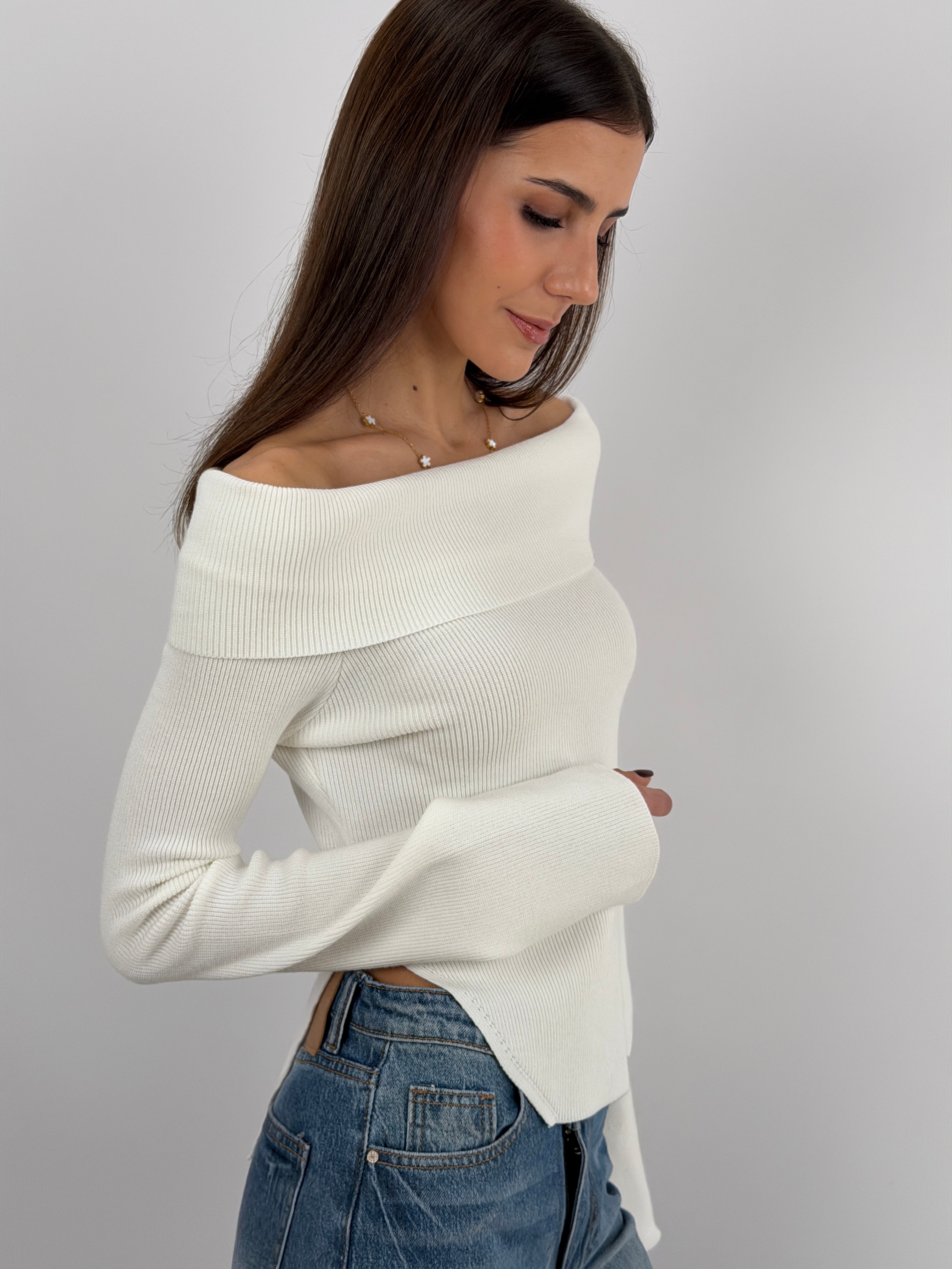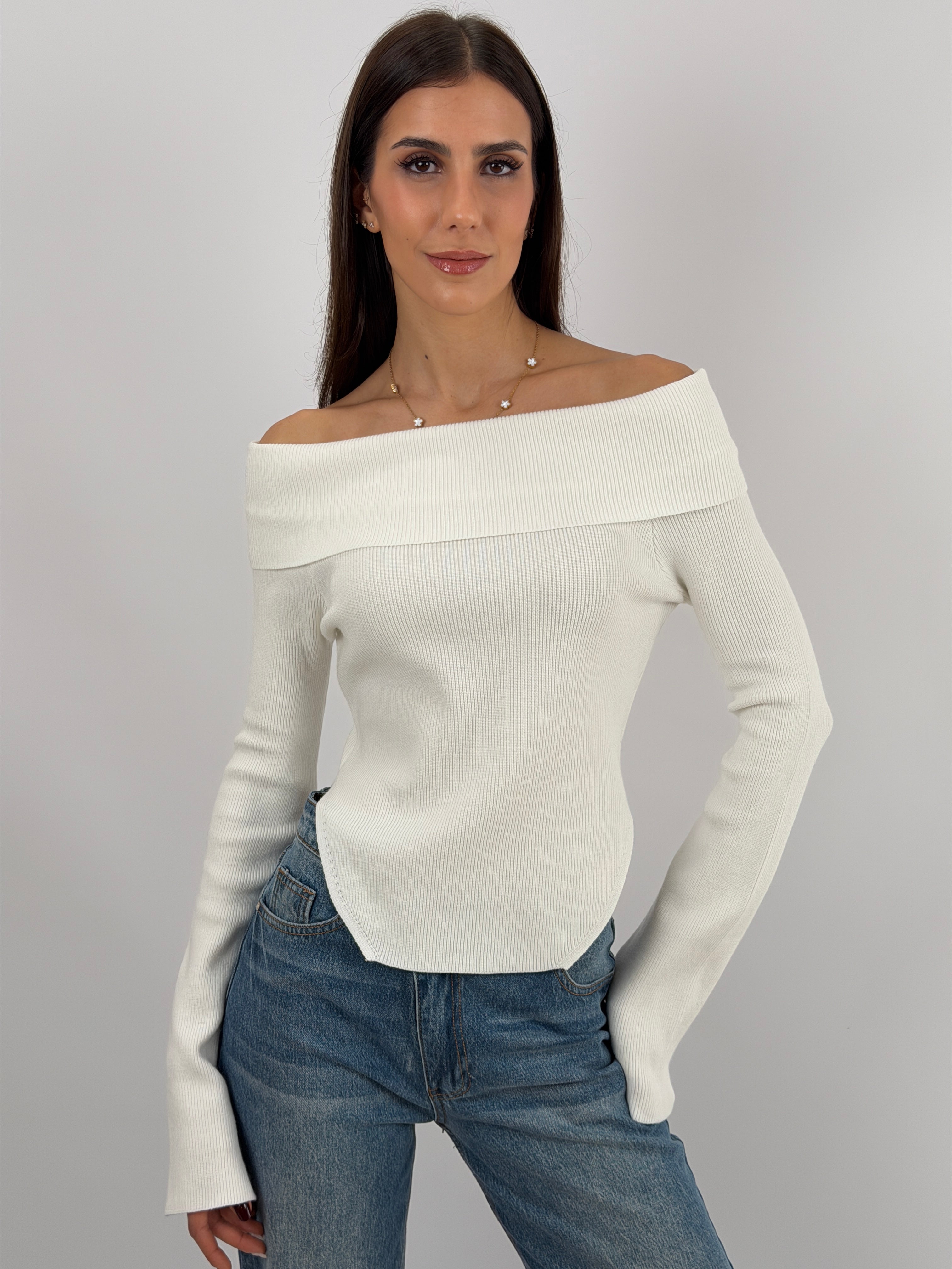 Maglia bianca a coste con maniche lunghe, spalle scoperte e taglio asimmetrico sul fondo