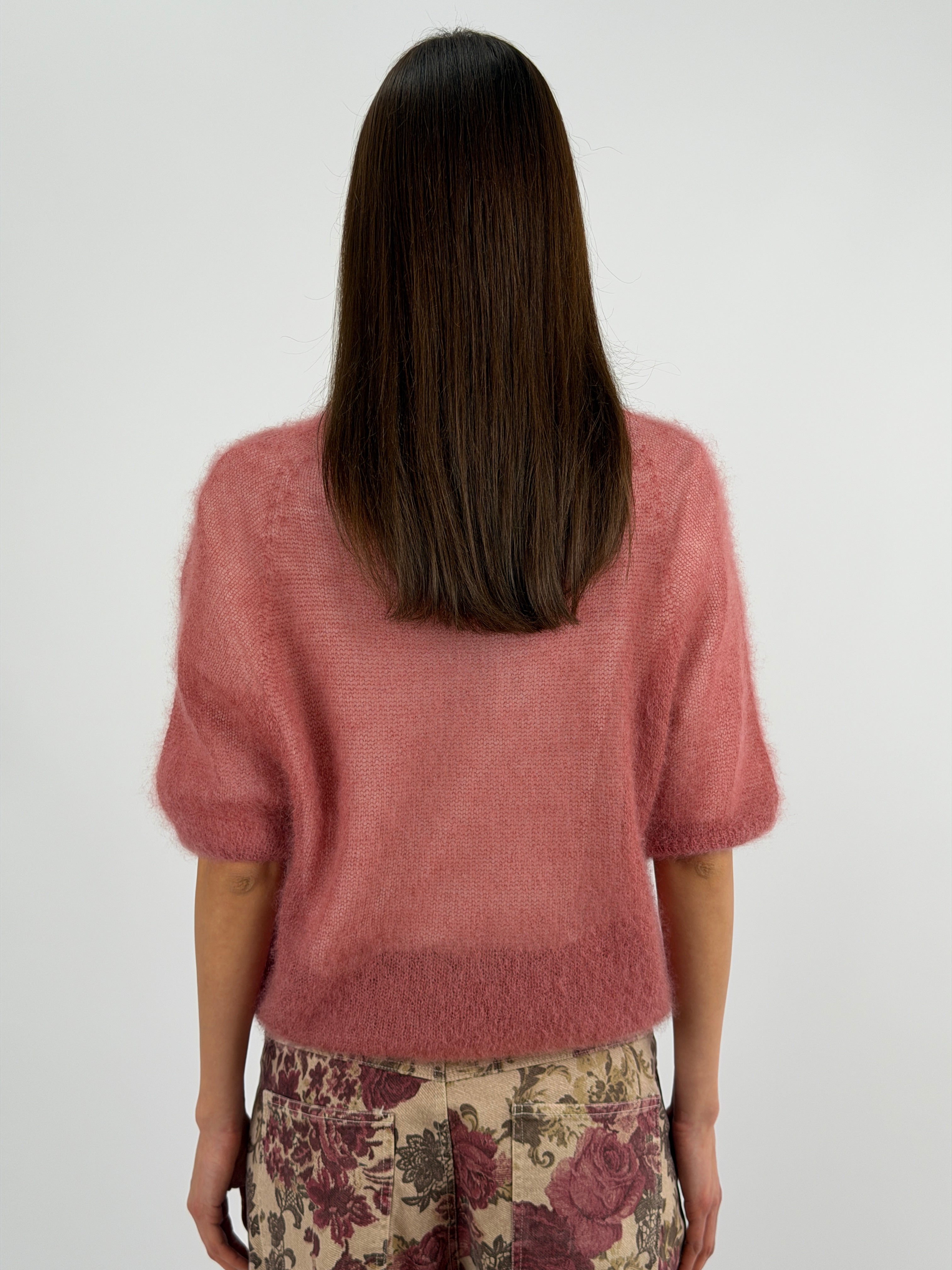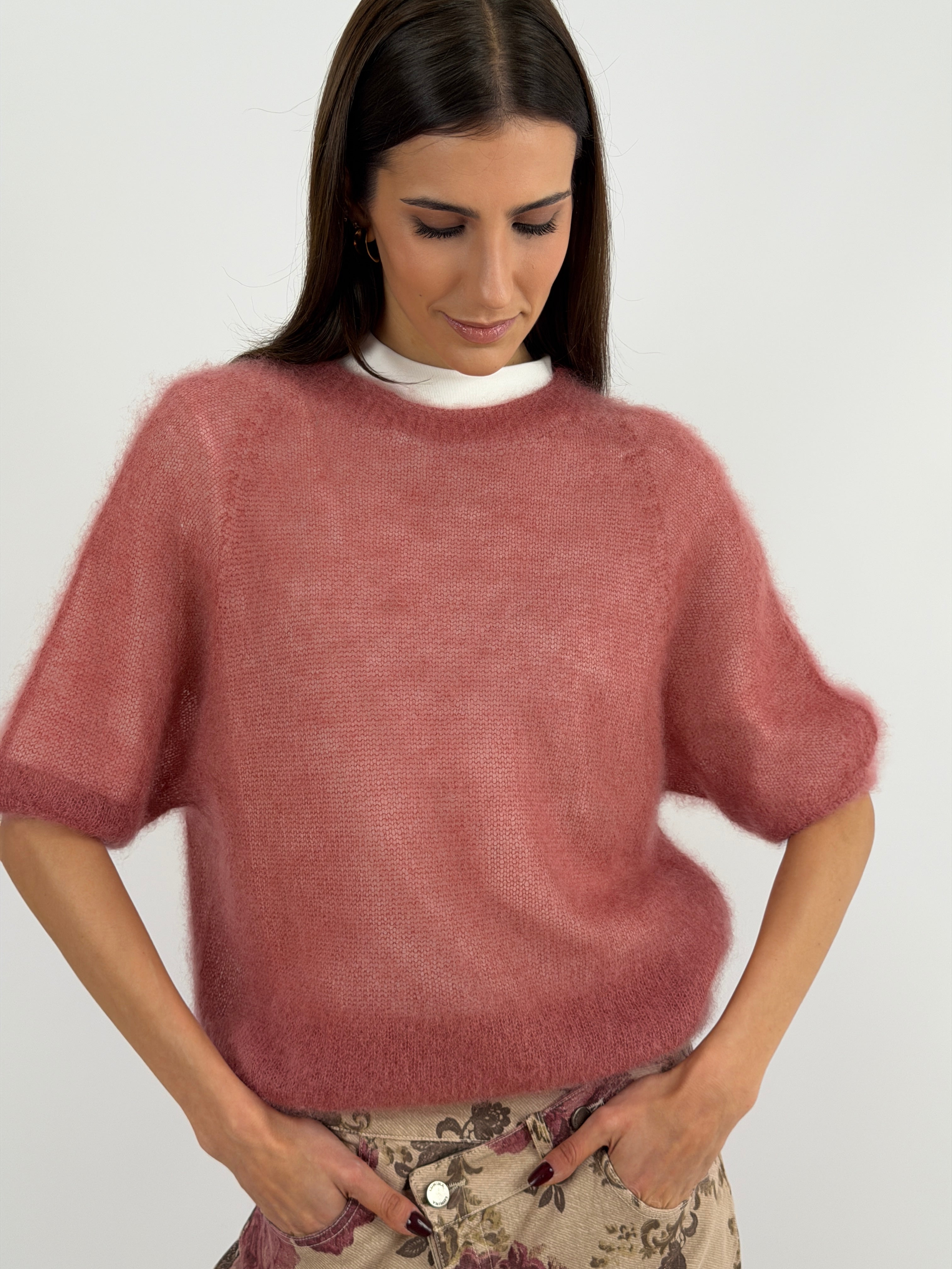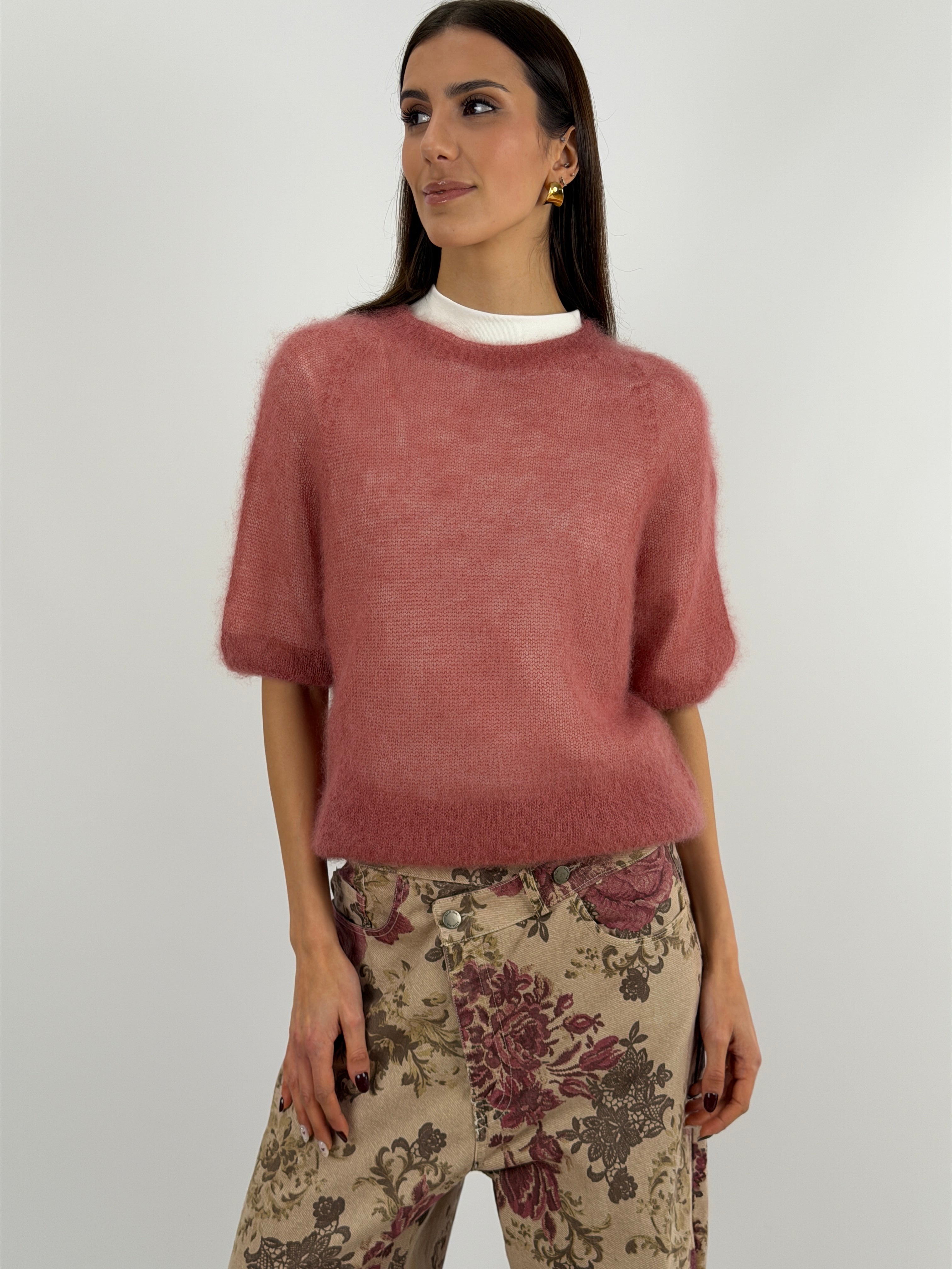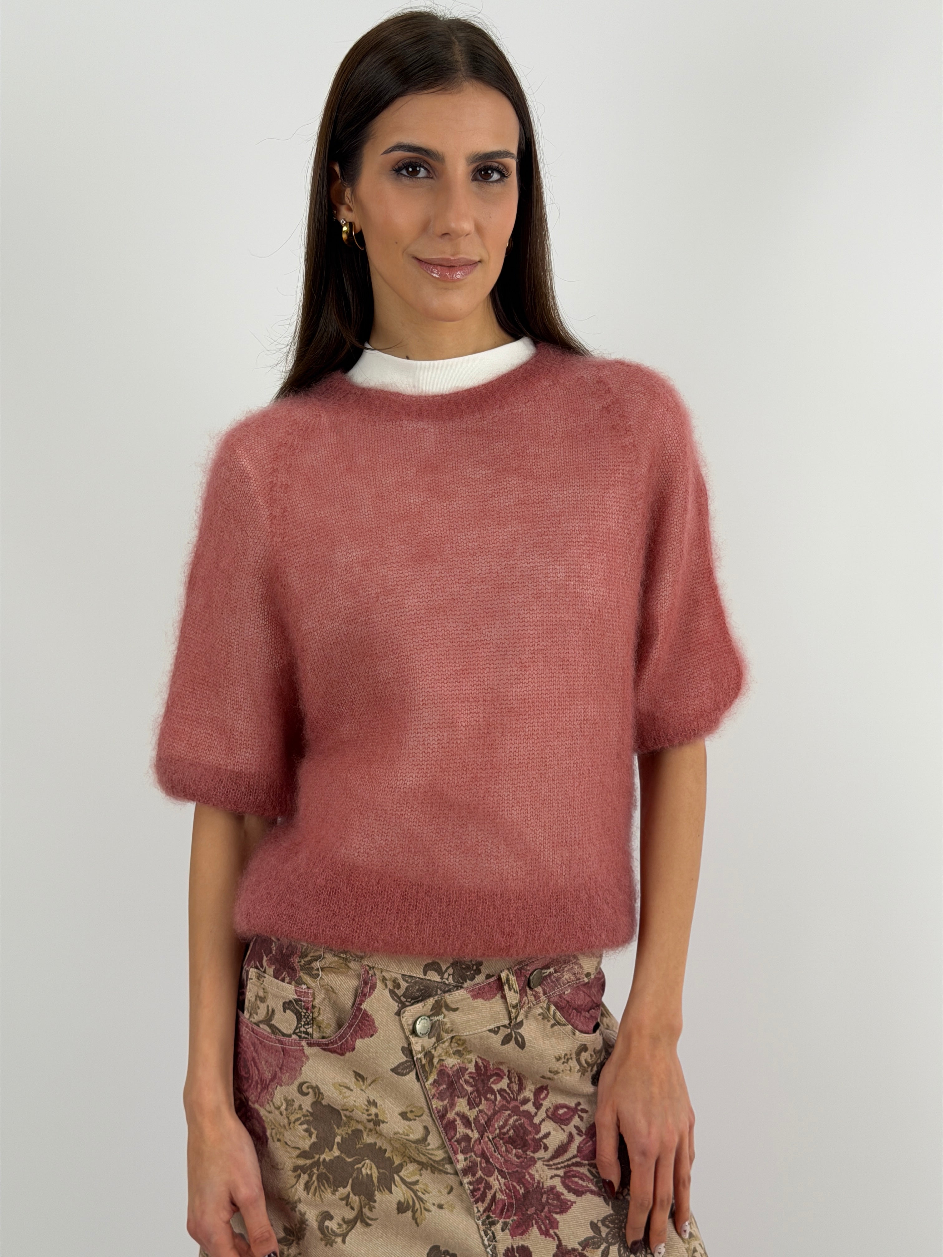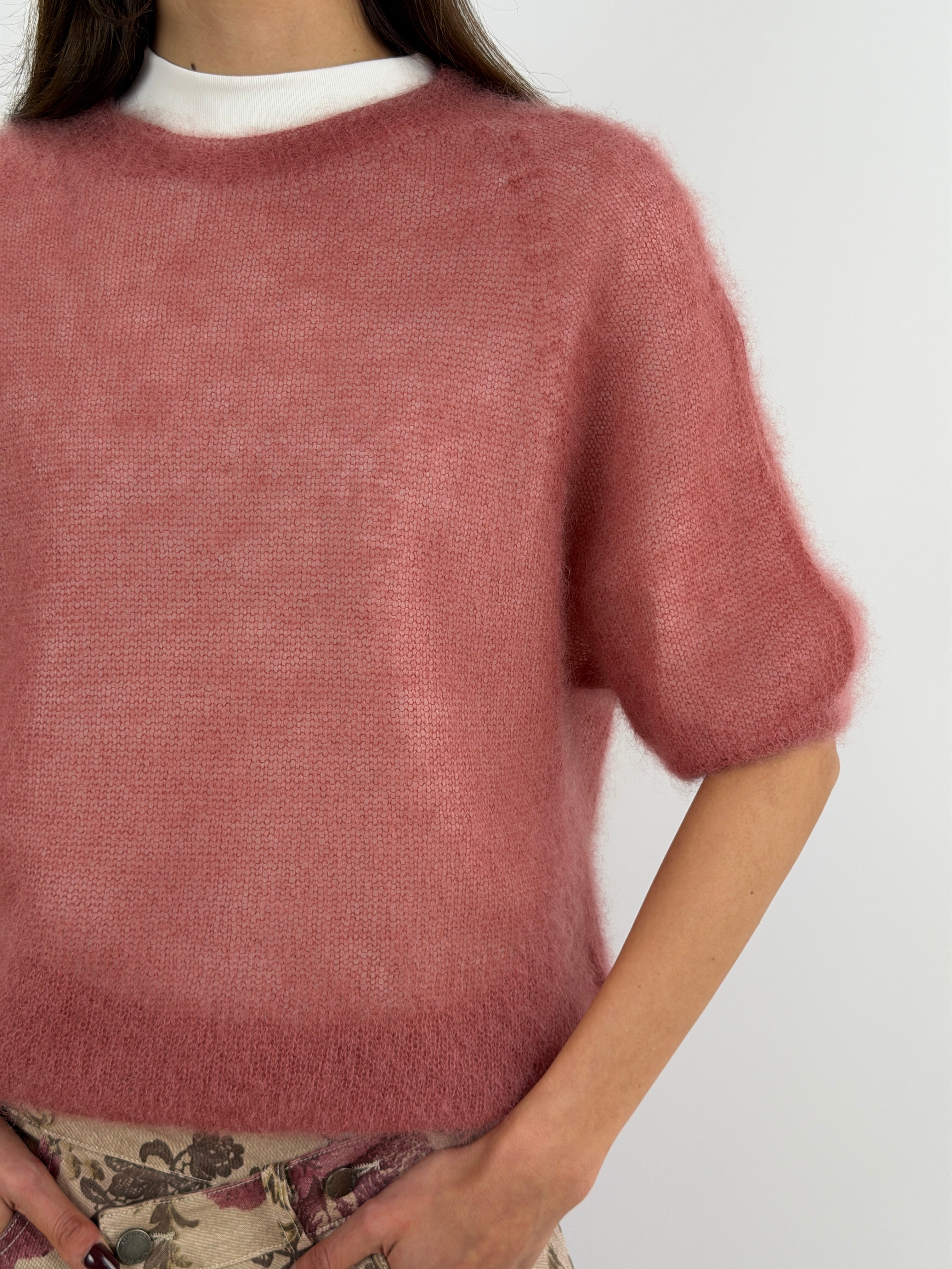 Light blue crewneck sweater in kid mohair with short sleeves, ultra-light and soft. It doesn't itch.