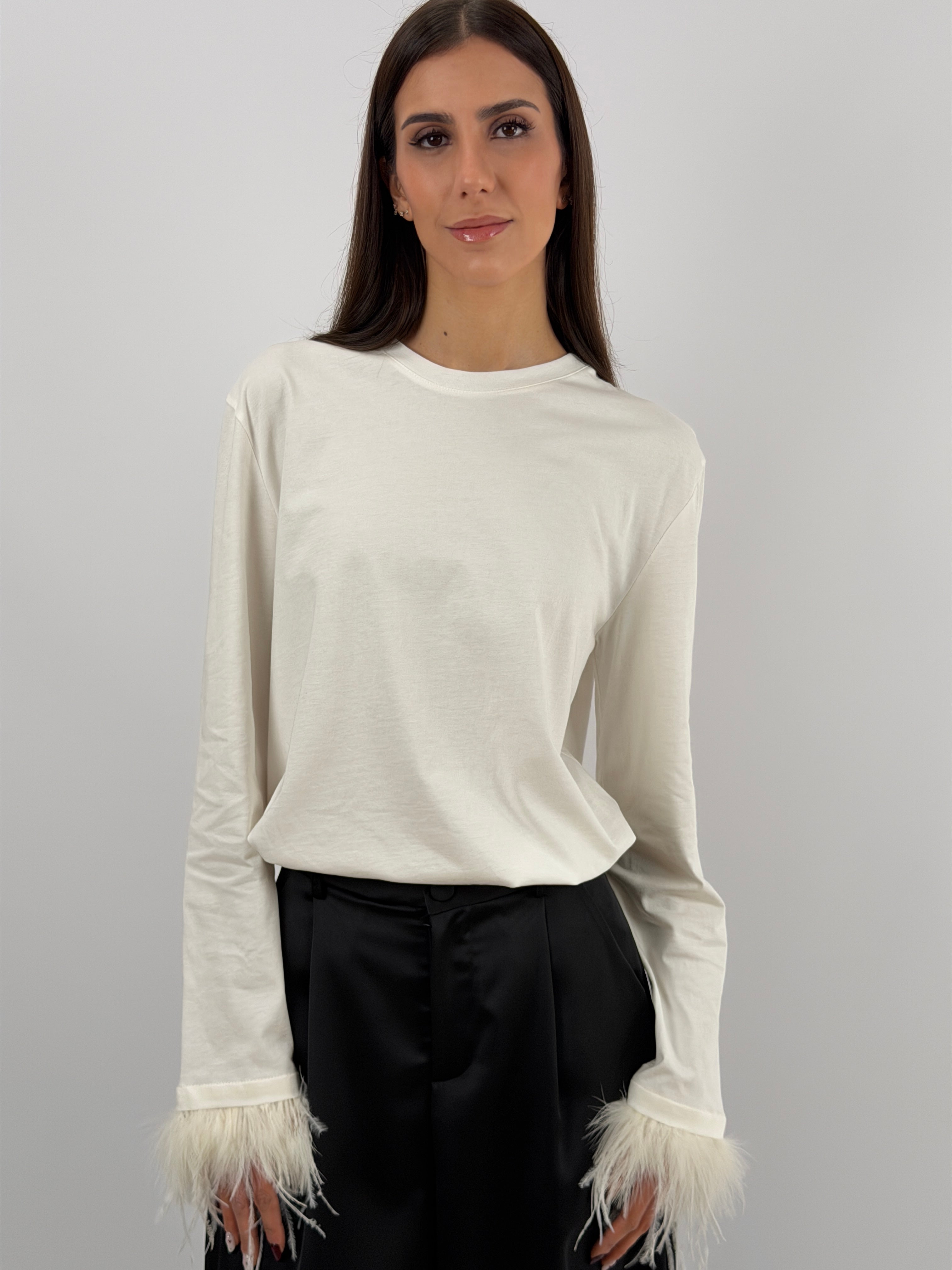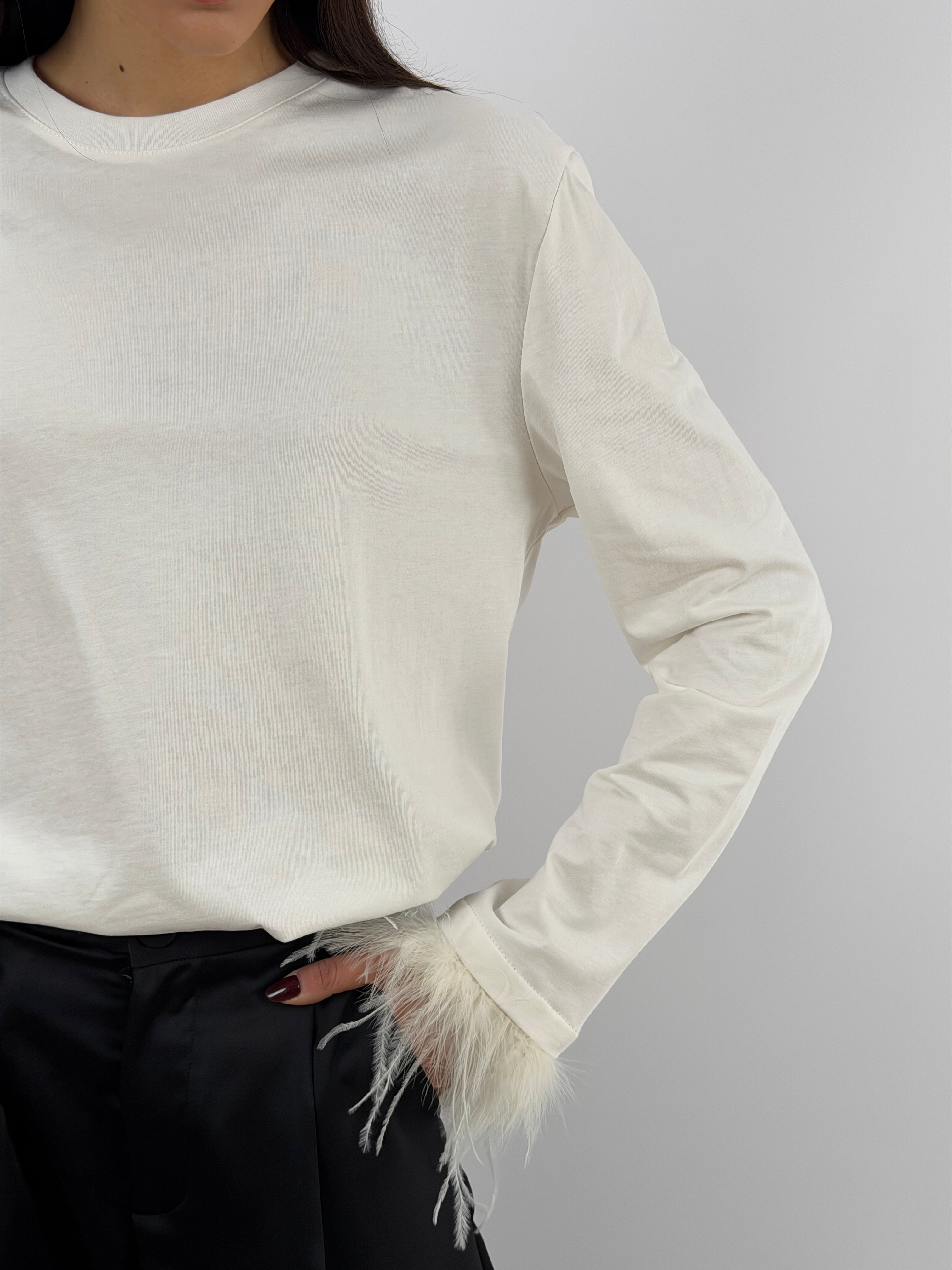 Maglia bianca a maniche lunghe e girocollo in cotone, con applicazioni di piume sul polso