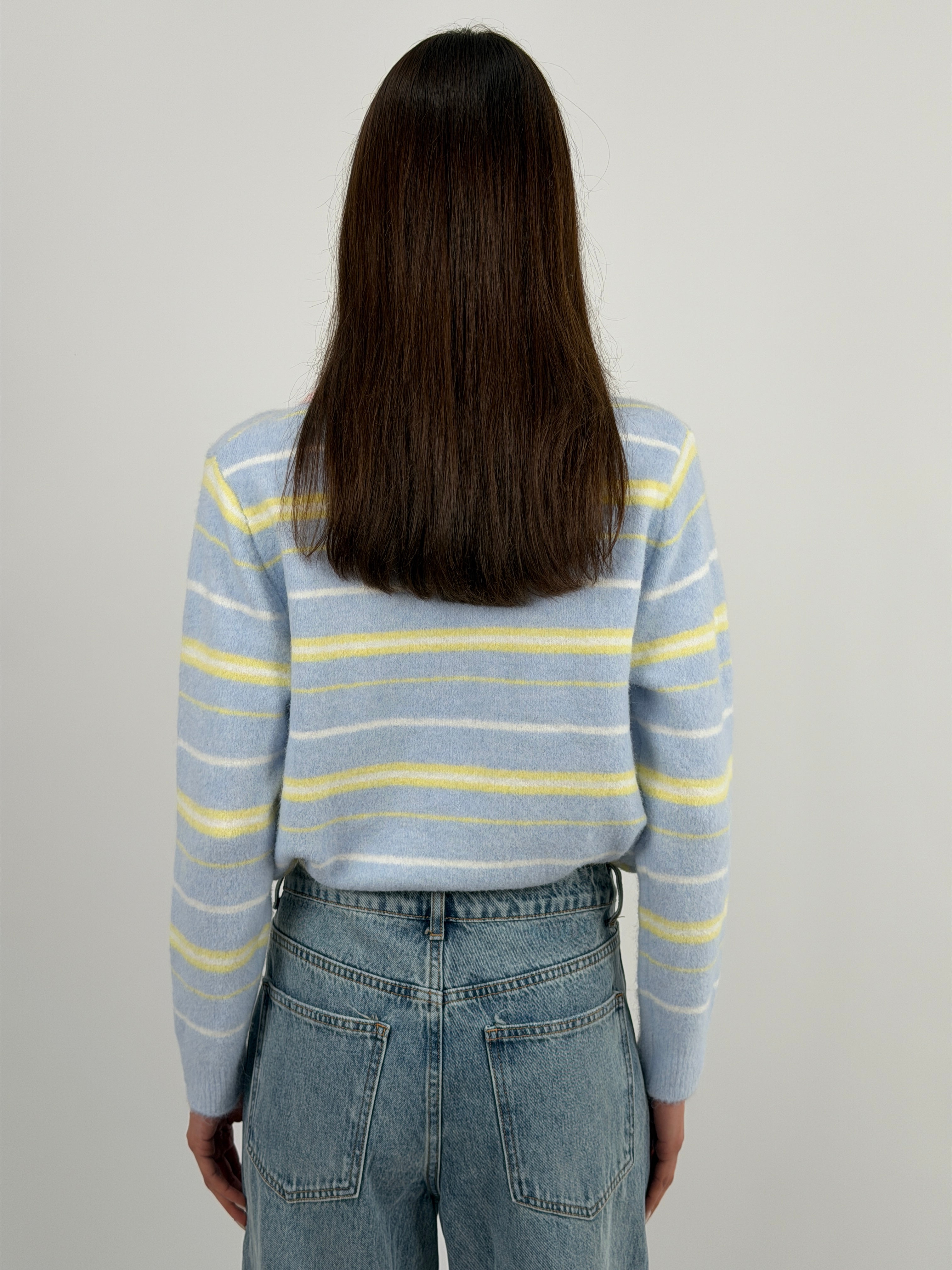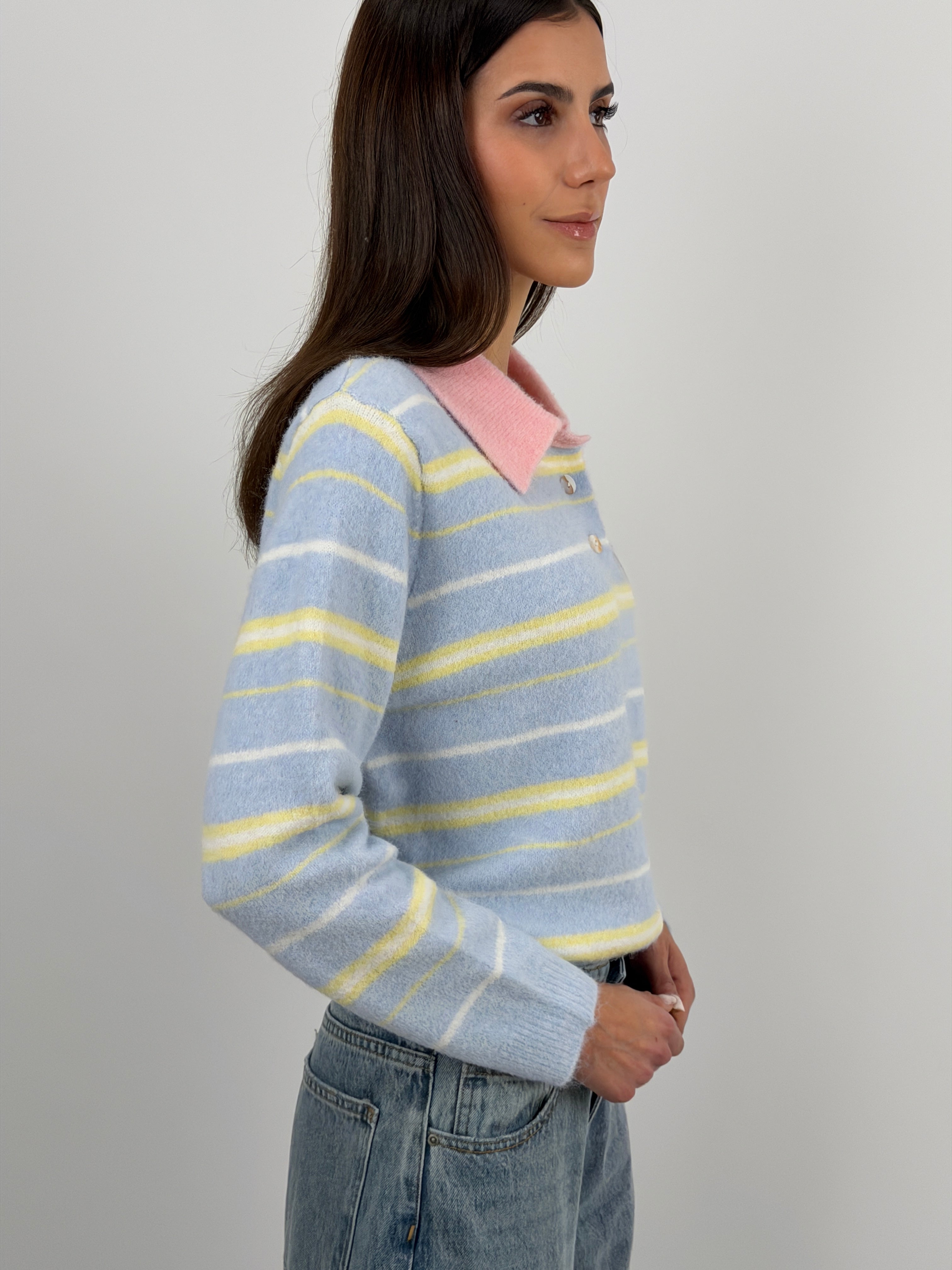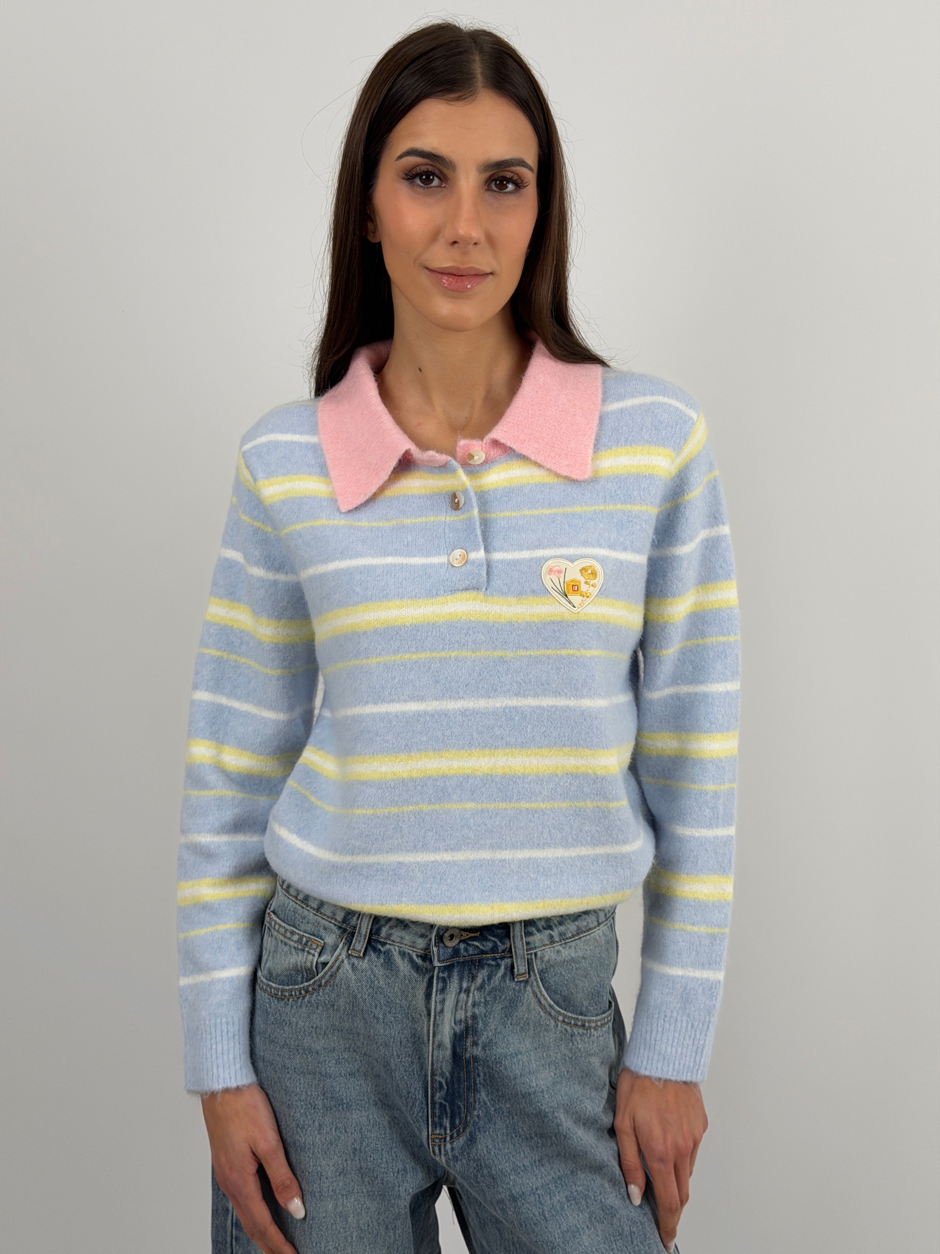 Pullover azzurra con colletto e bottoncini a righe a contrasto, arricchito da patches applicate sul lato cuore