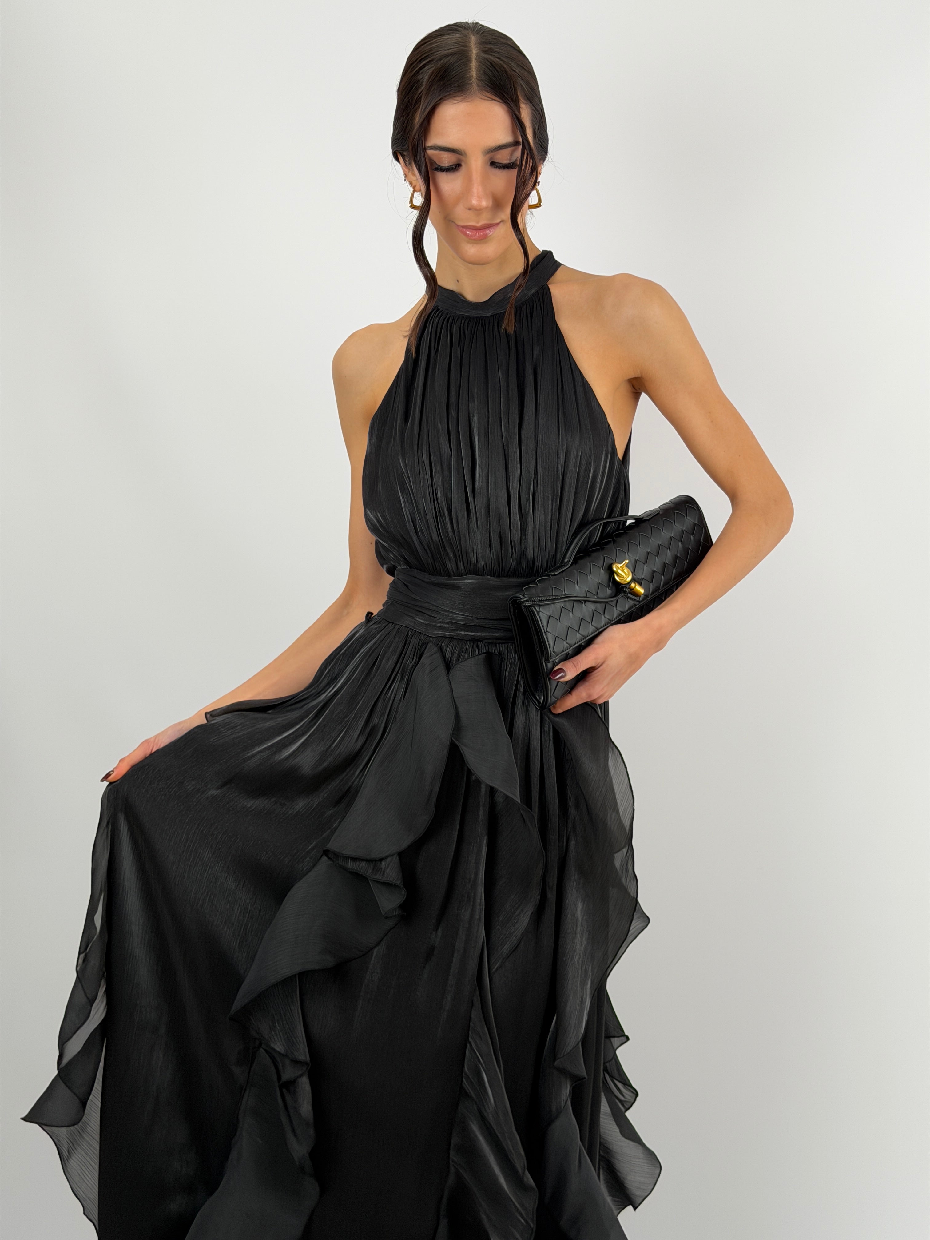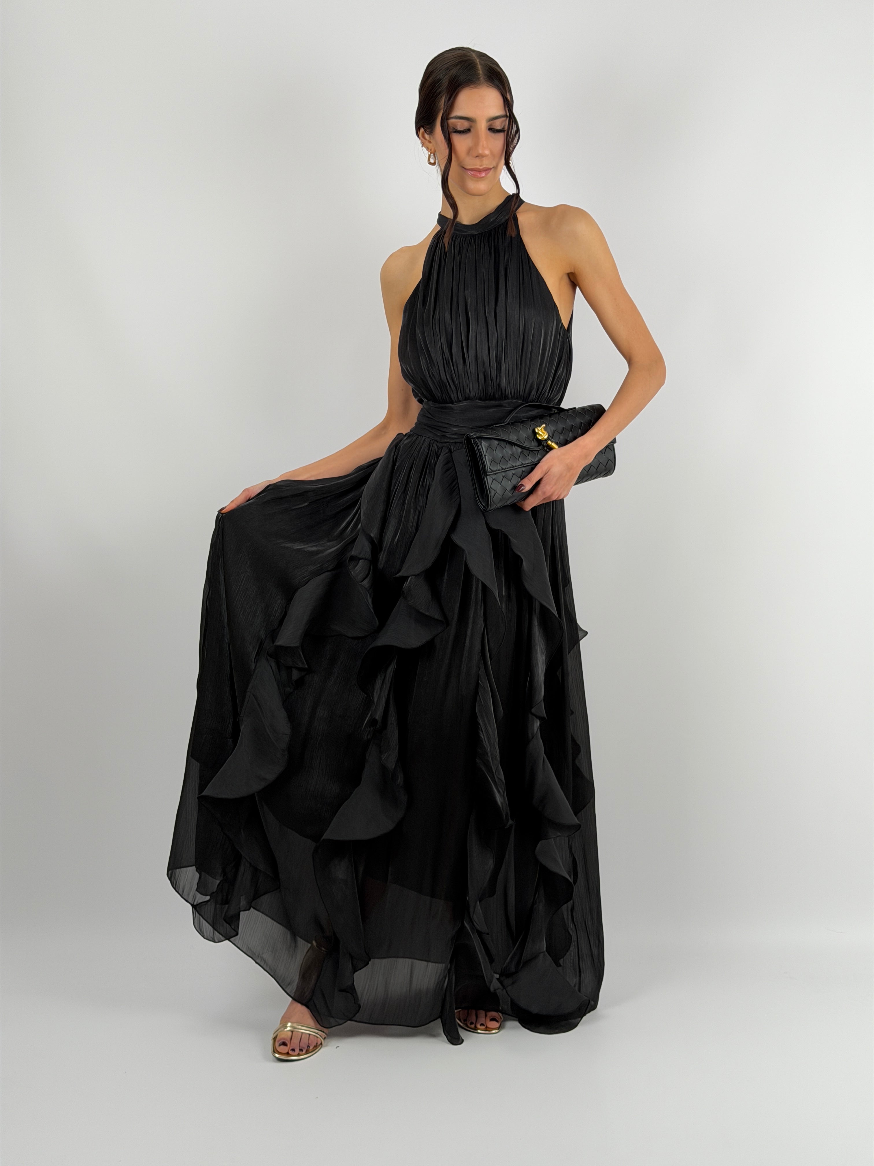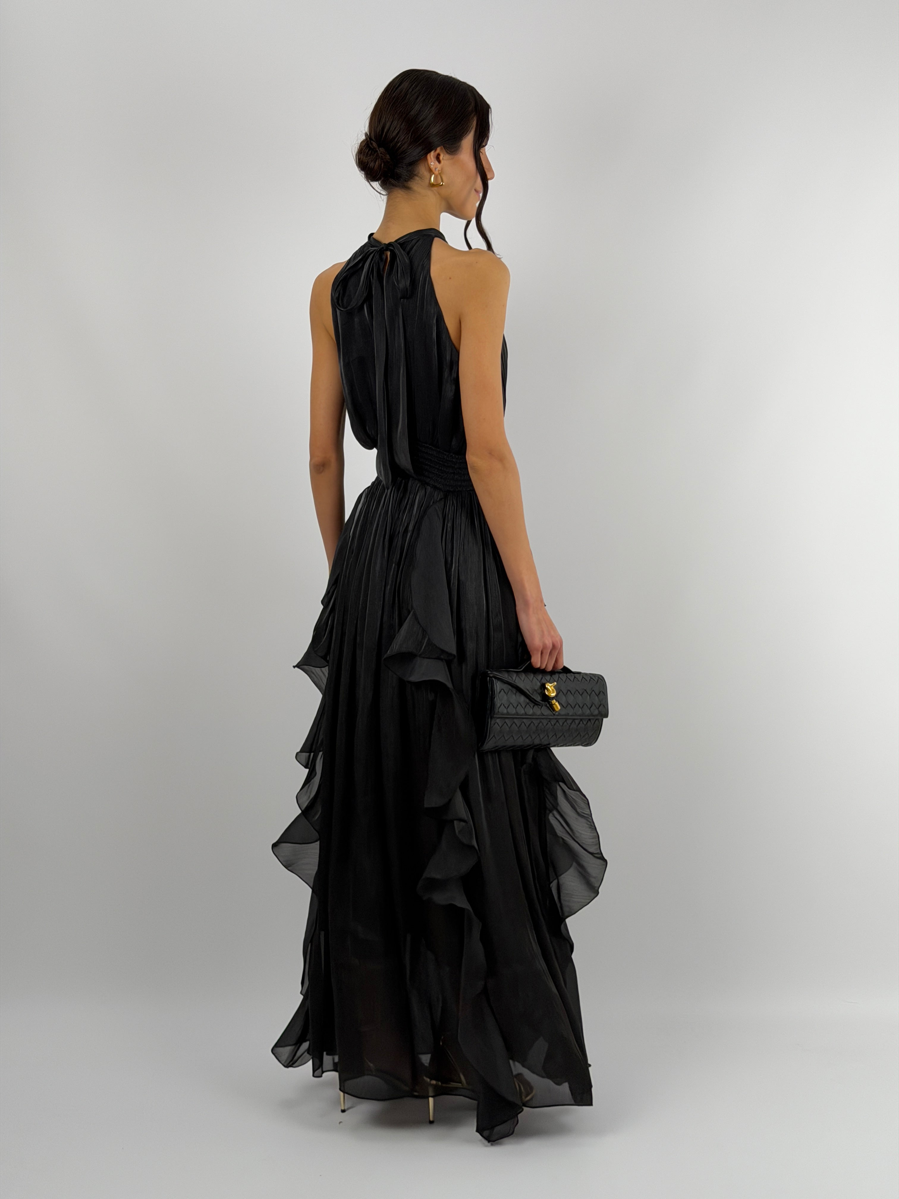 Abito lungo nero smanicato in chiffon con volant sulla gonna, chiusura al collo con lacci e elastico in vita