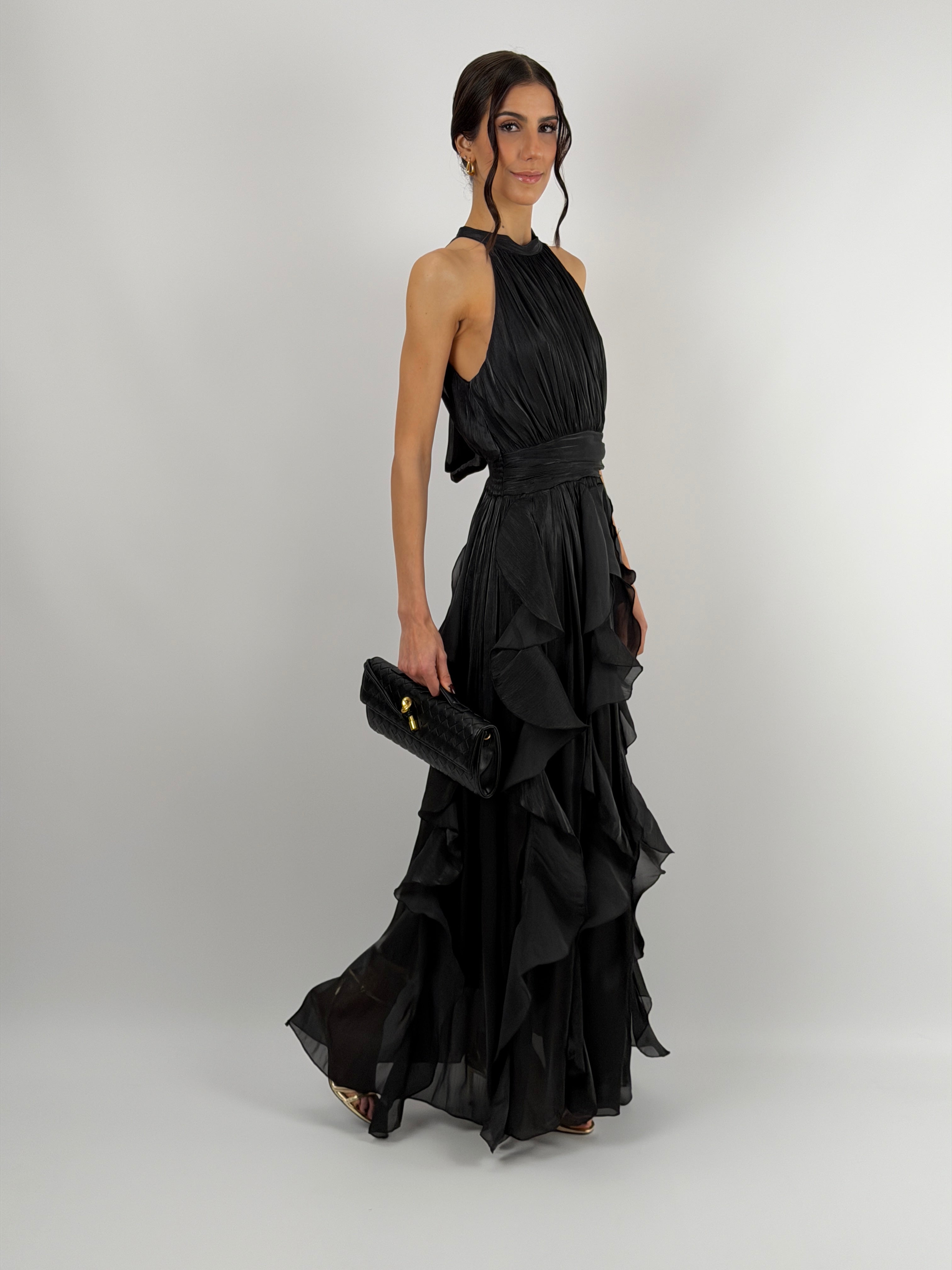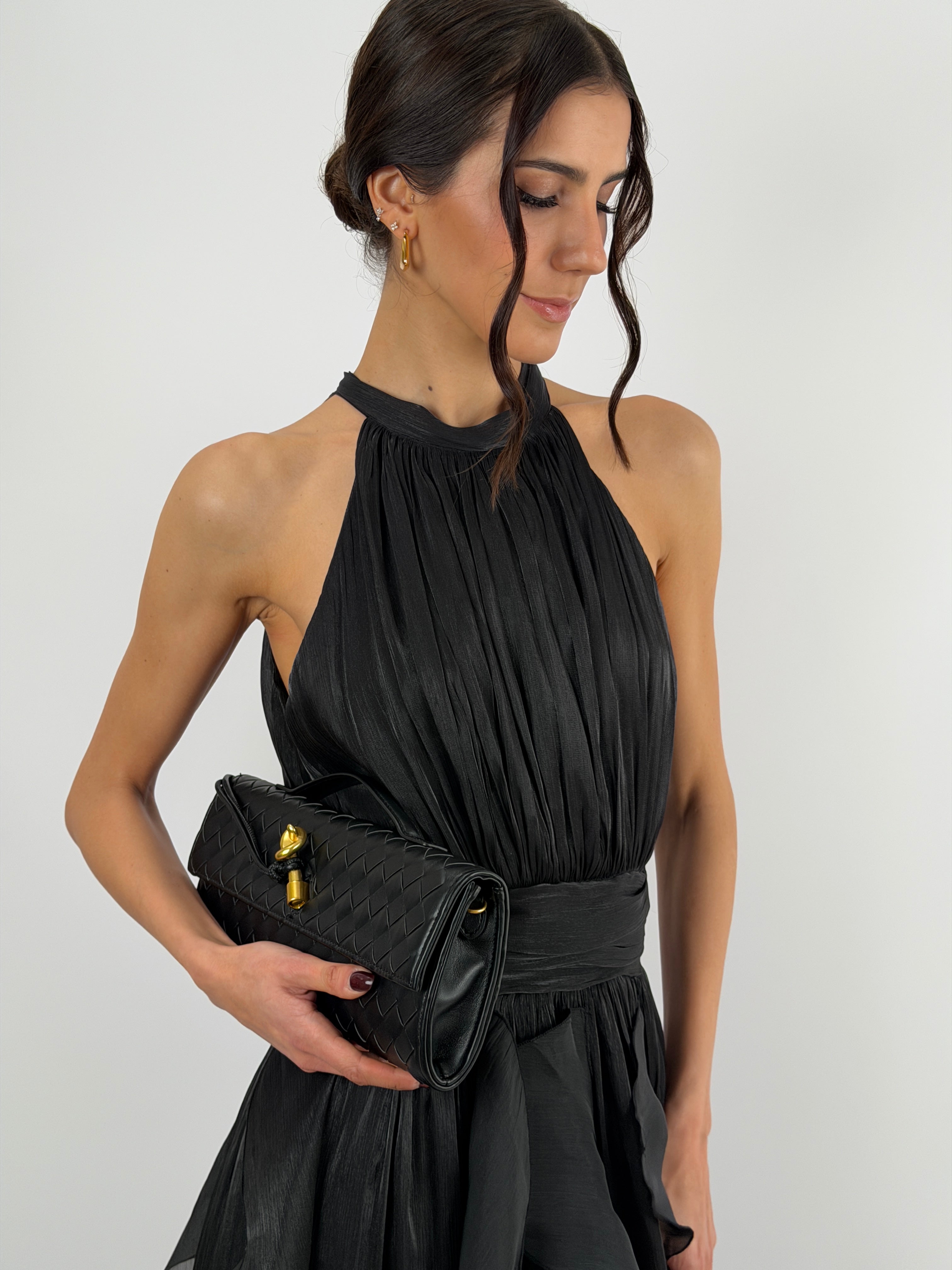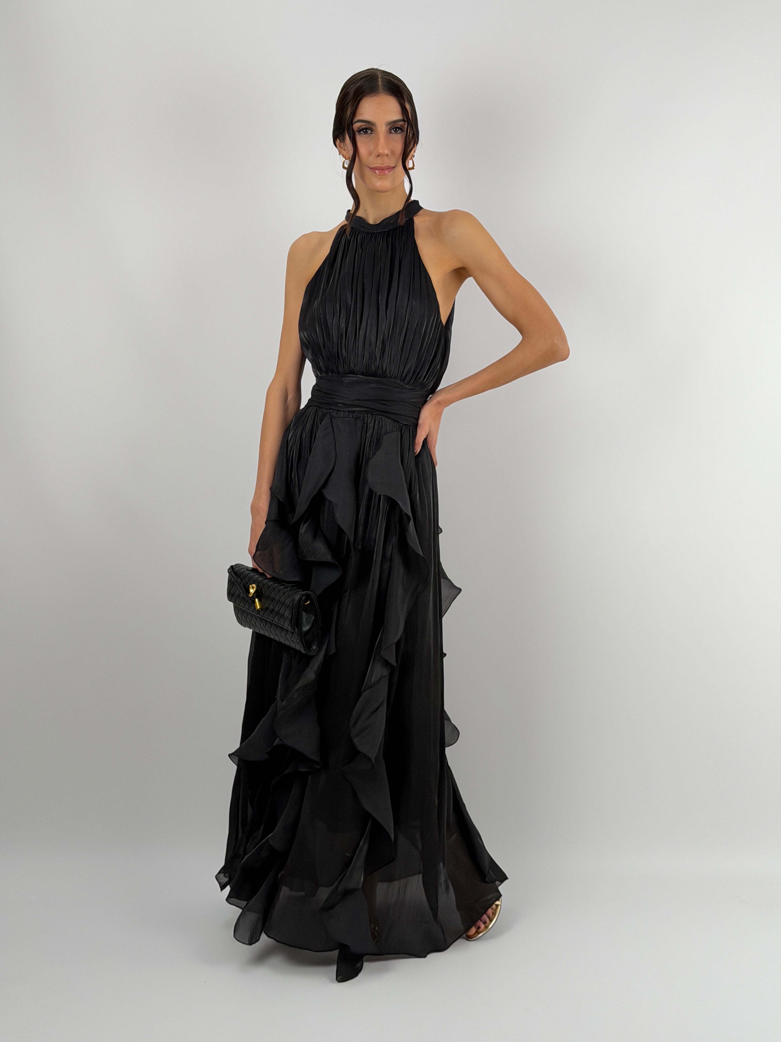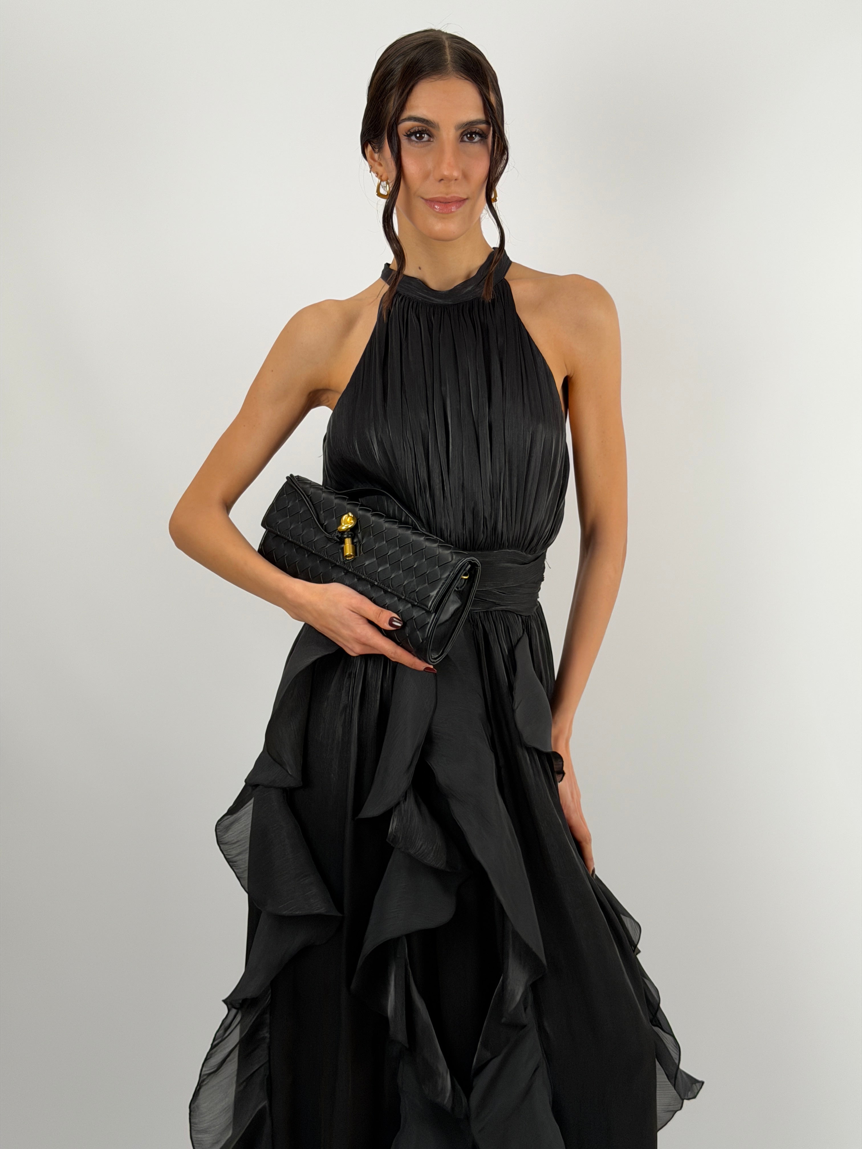 Abito lungo nero smanicato in chiffon con volant sulla gonna, chiusura al collo con lacci e elastico in vita