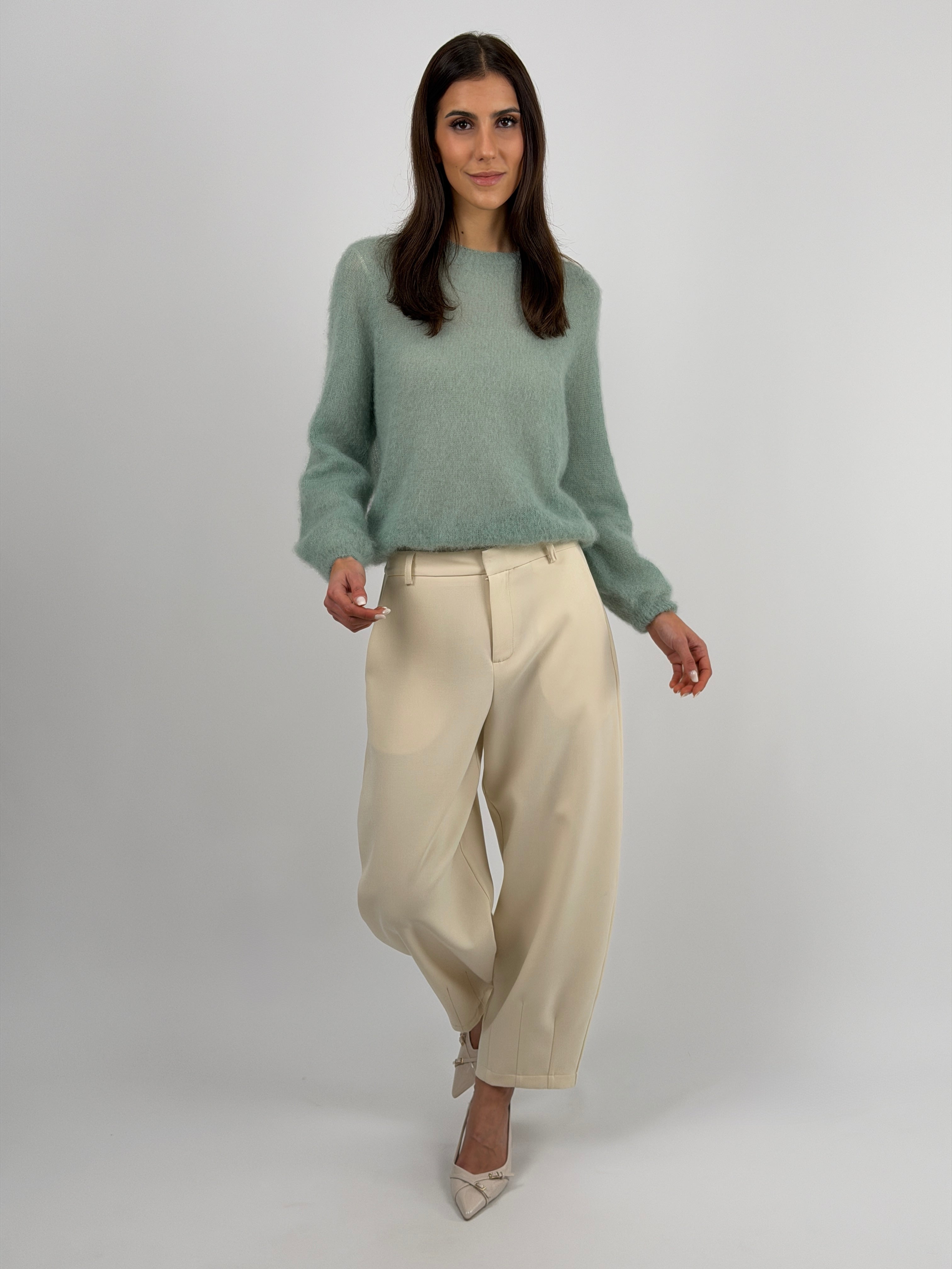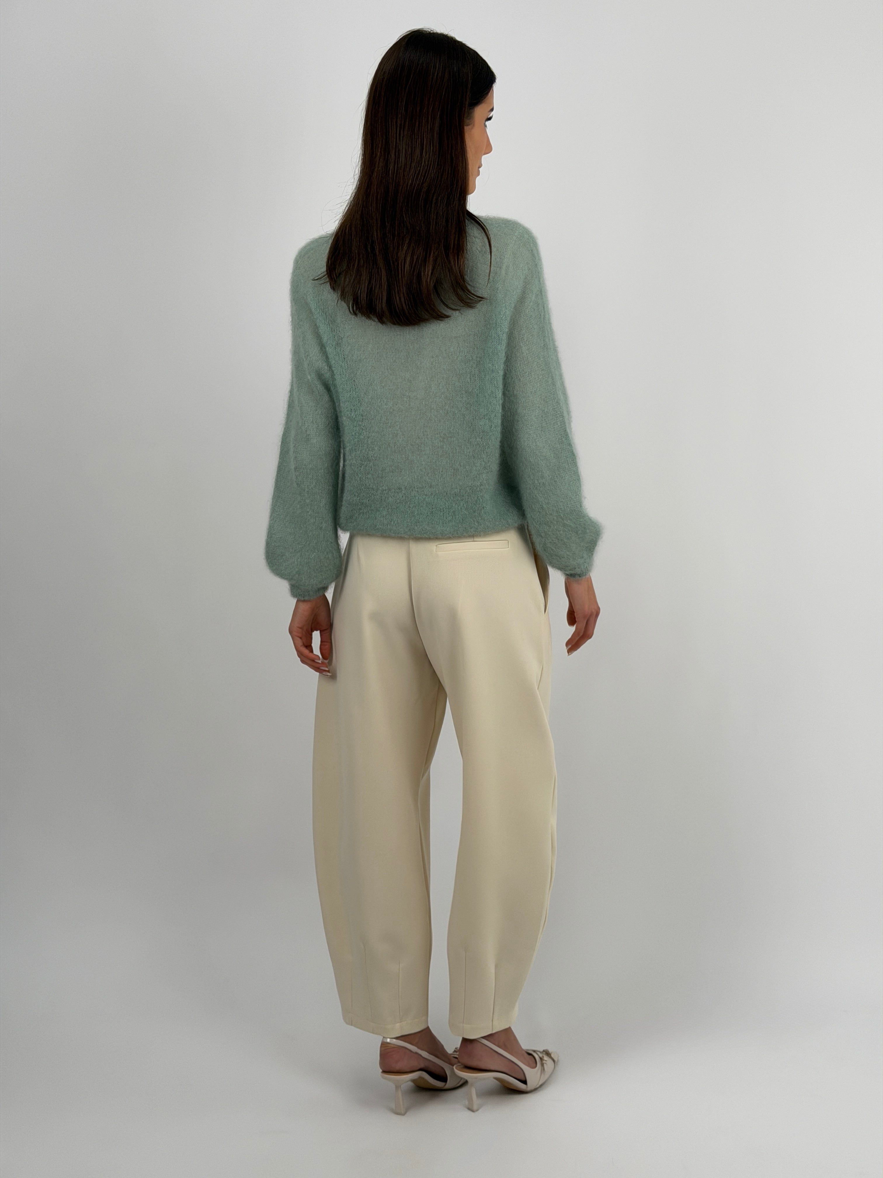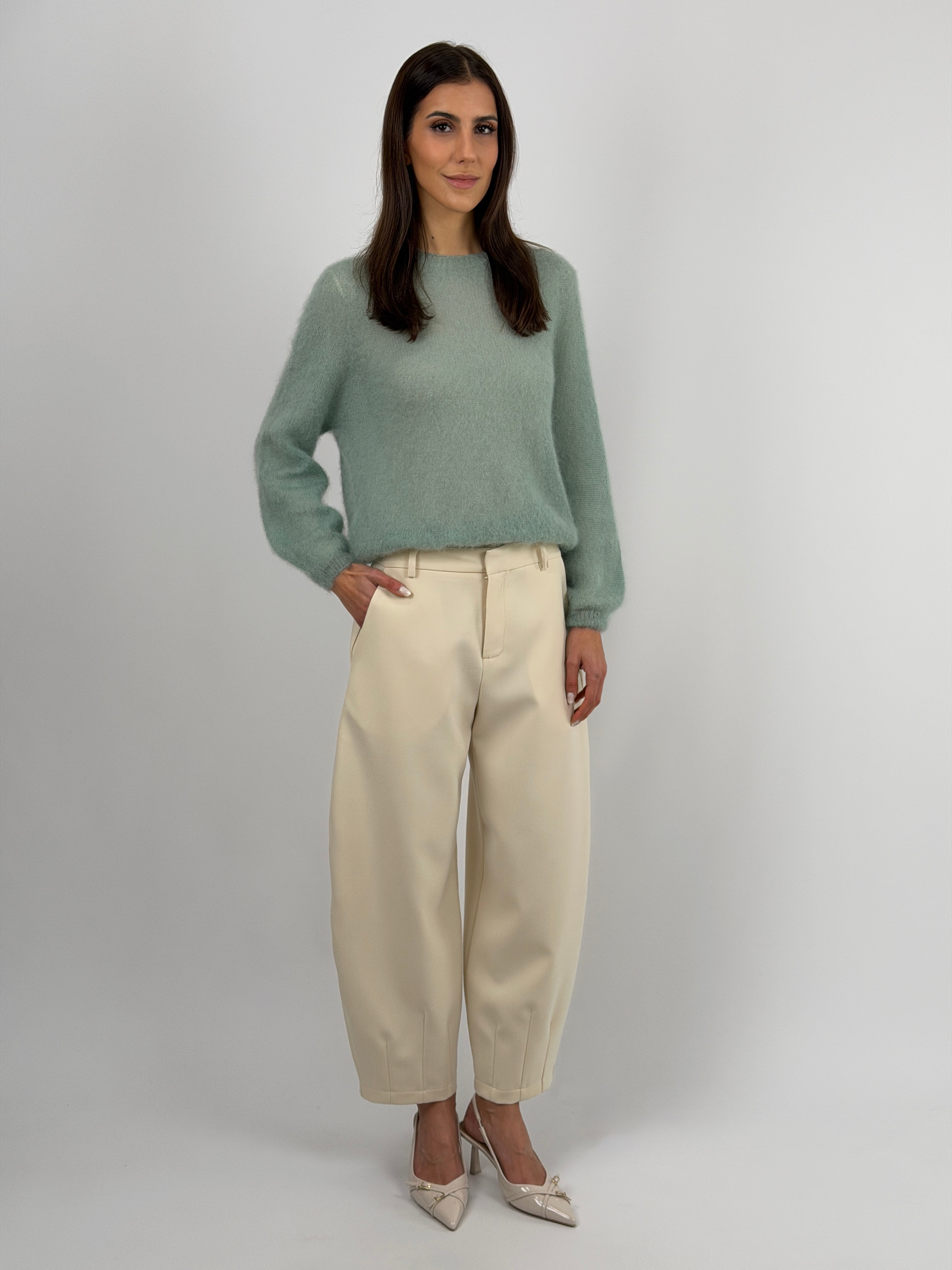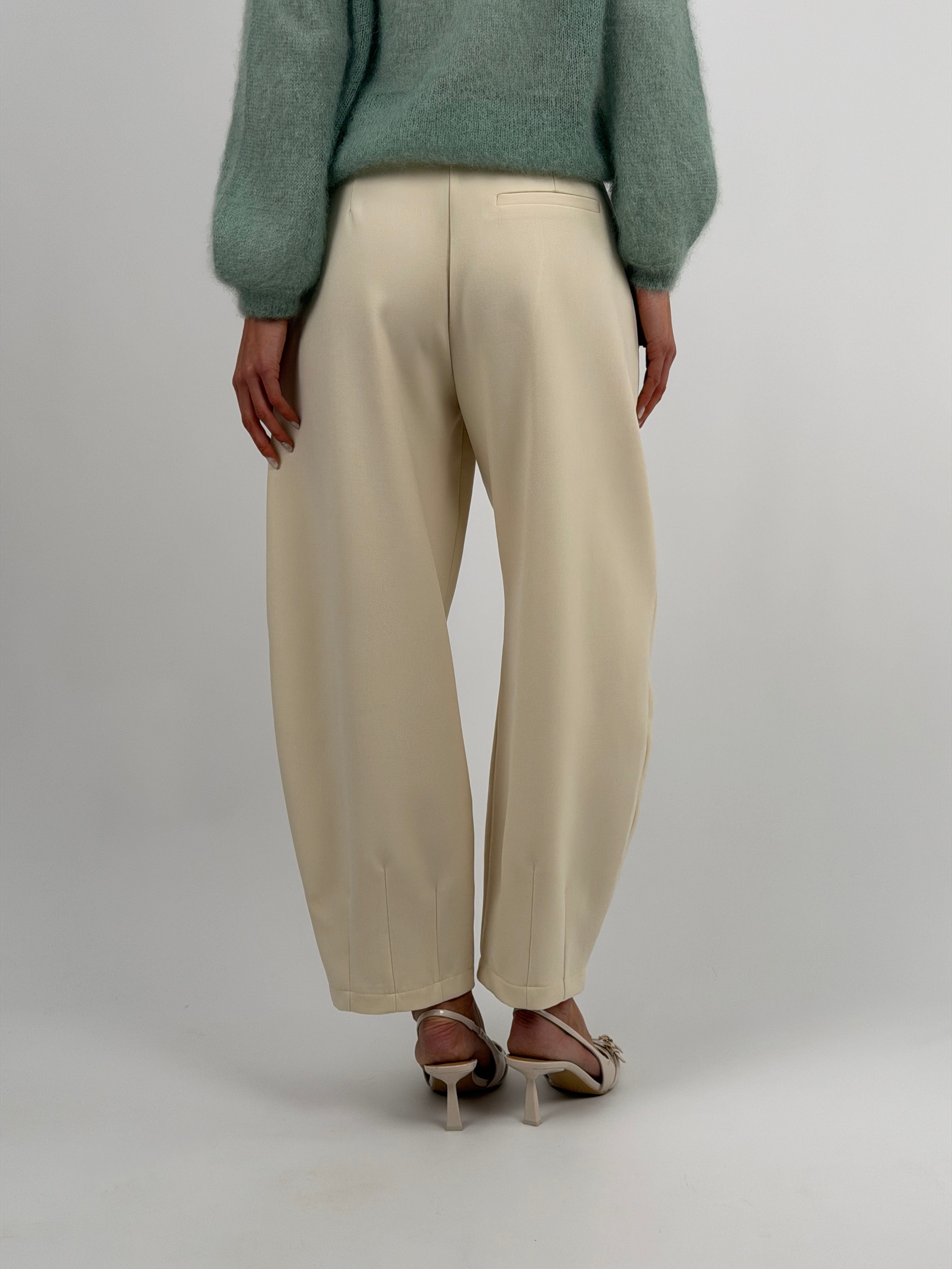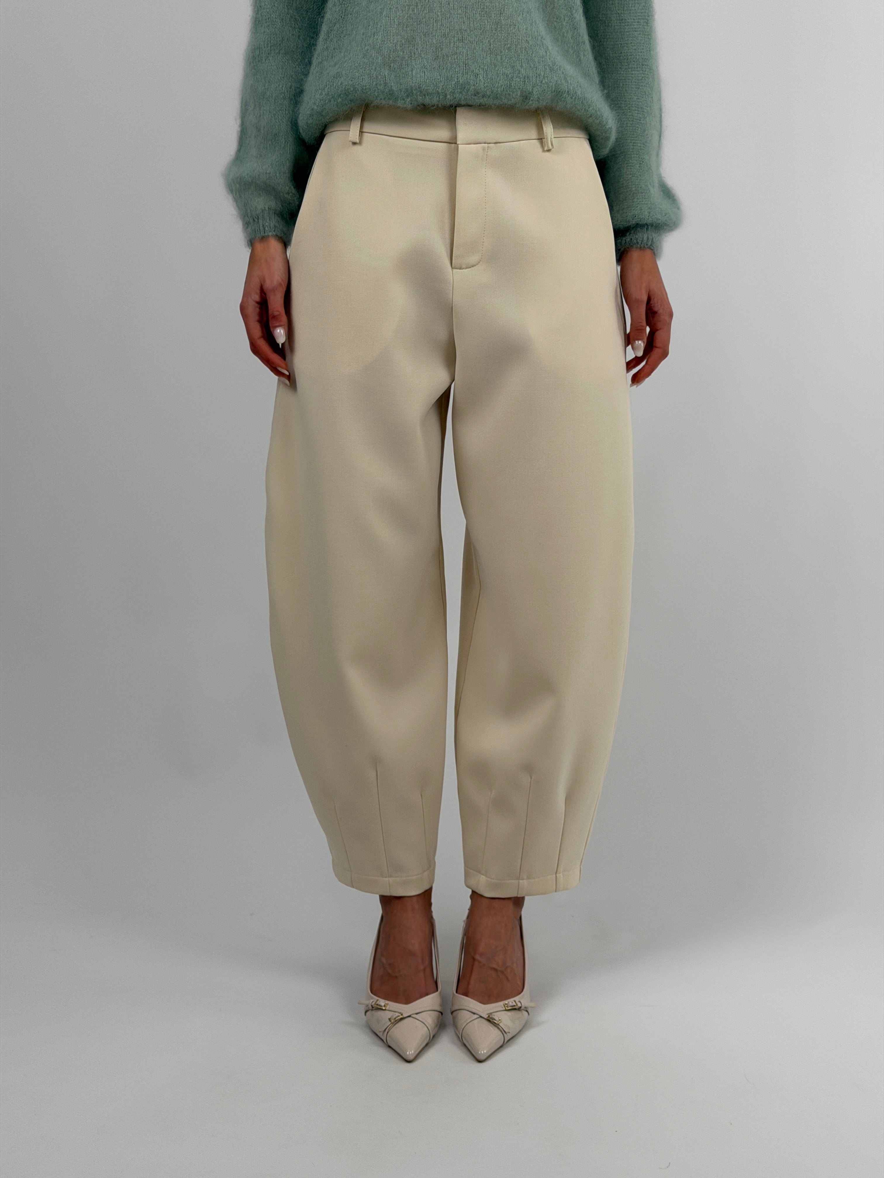Brown balloon trousers with side pockets, zip, button and hook fastening, completed with belt loops