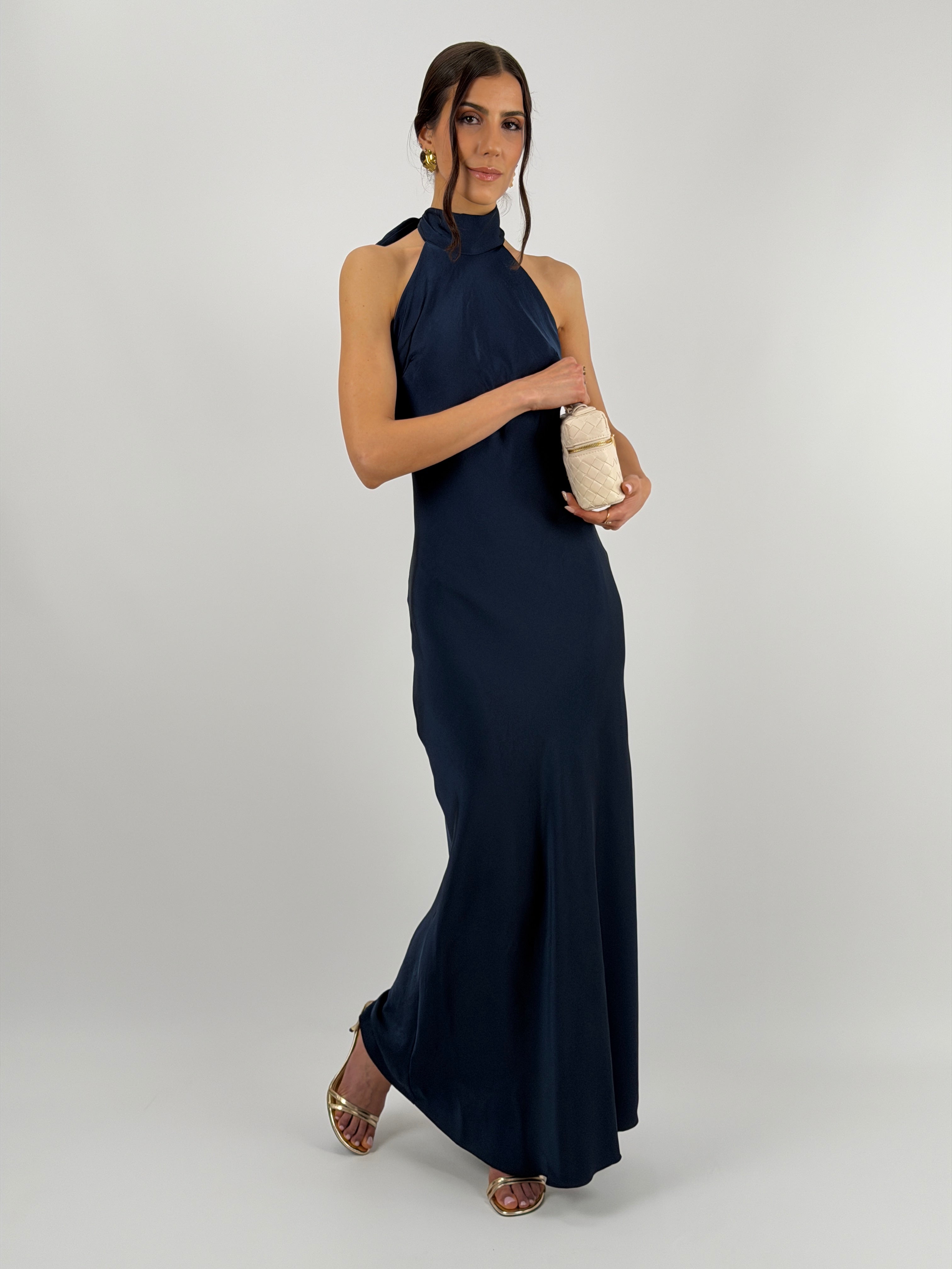 Abito blu halter lungo fluido in tessuto satinato con allacciatura al collo e schiena scoperta