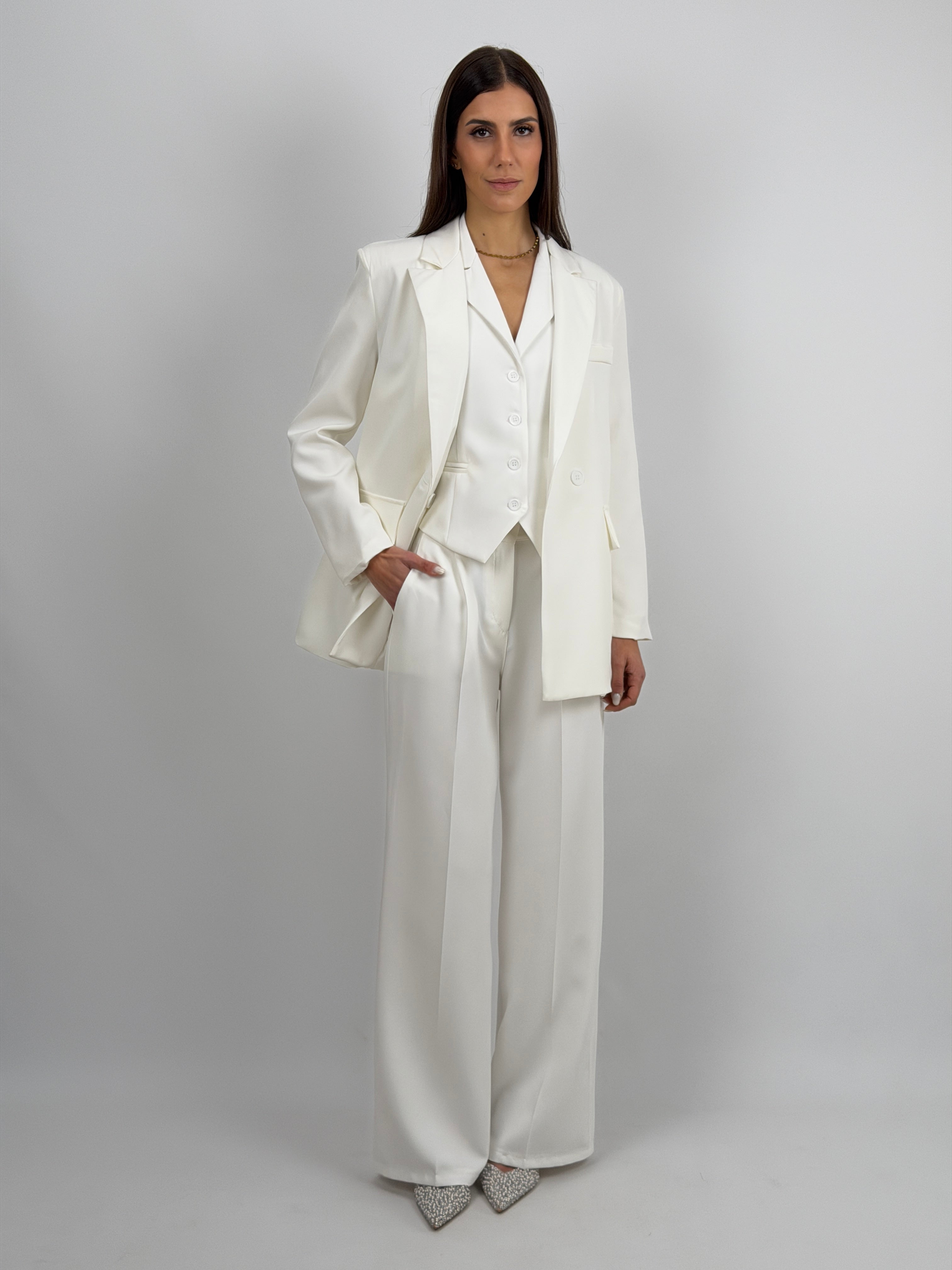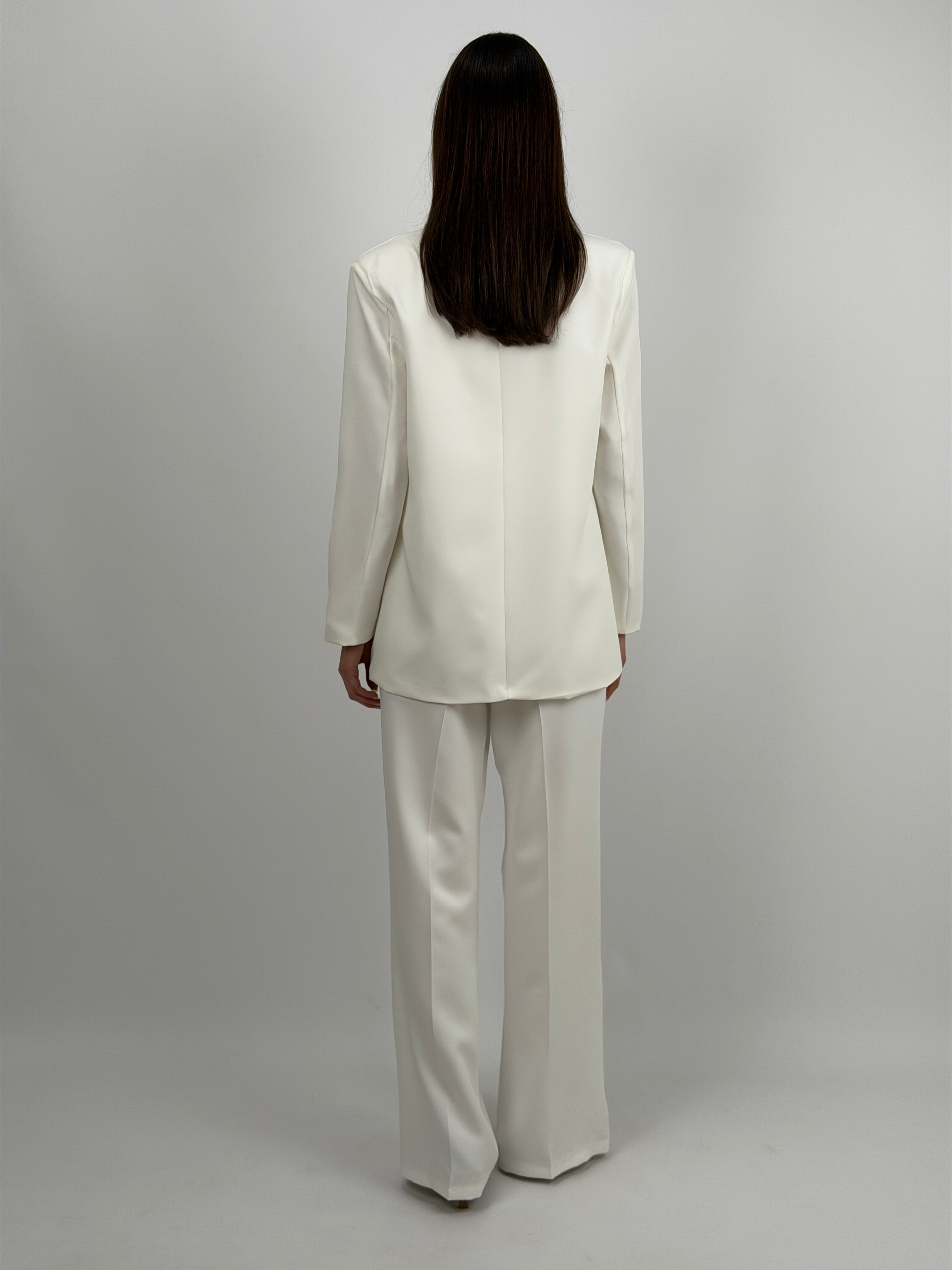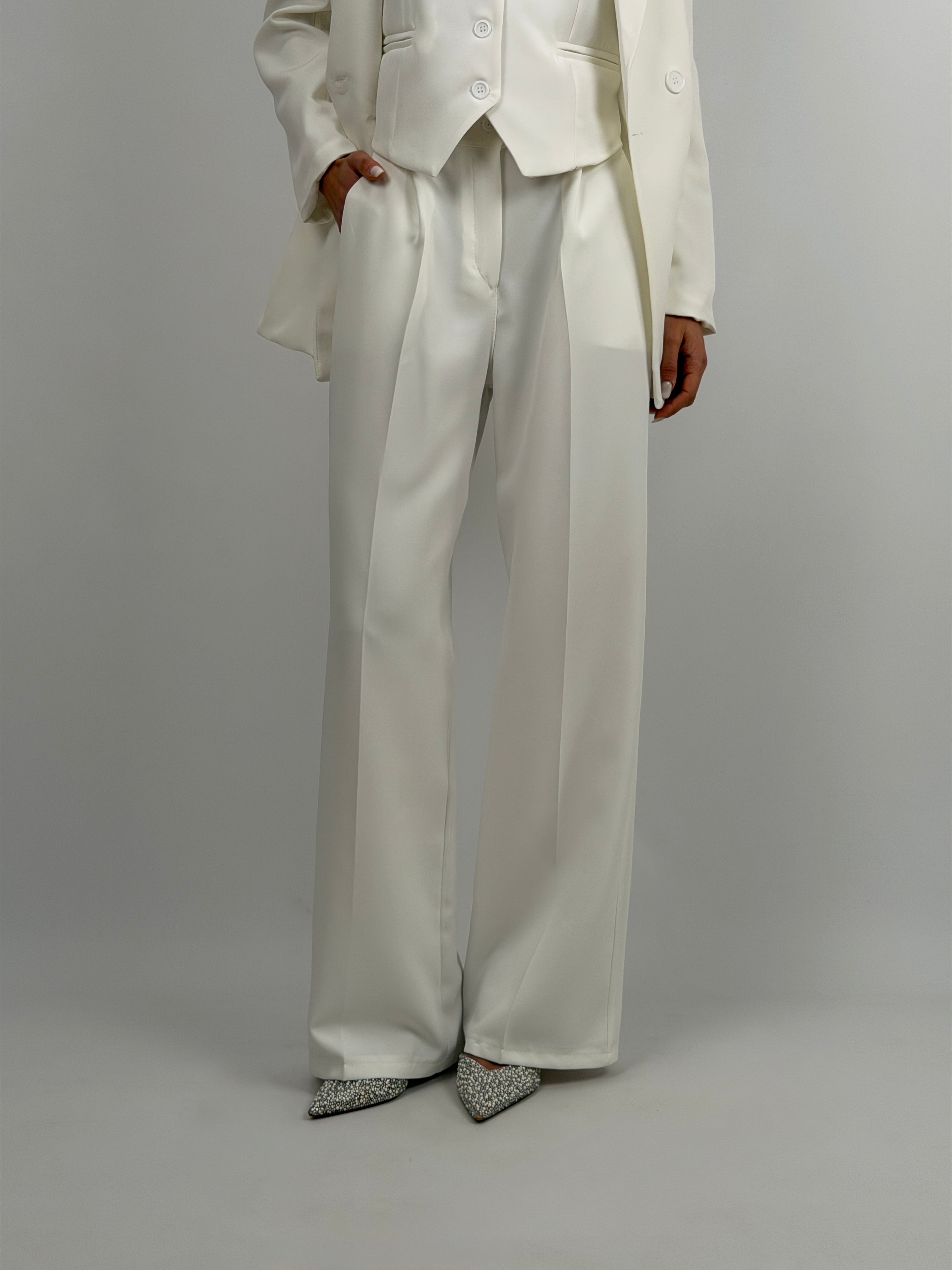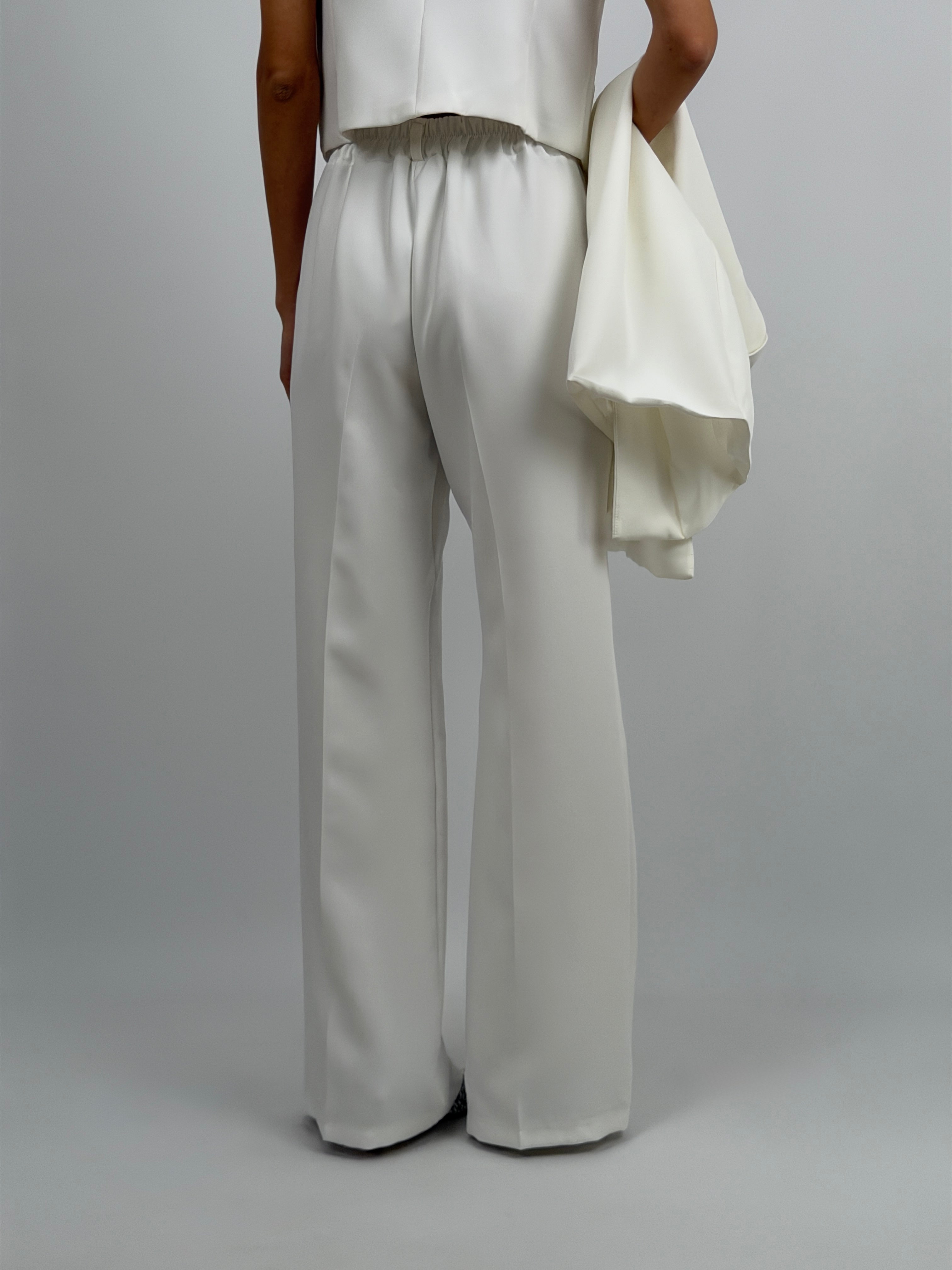 Pantalone bianco da completo a palazzo con elastico sul retro, chiusura con zip e bottone, passanti per cintura e tasche laterali.