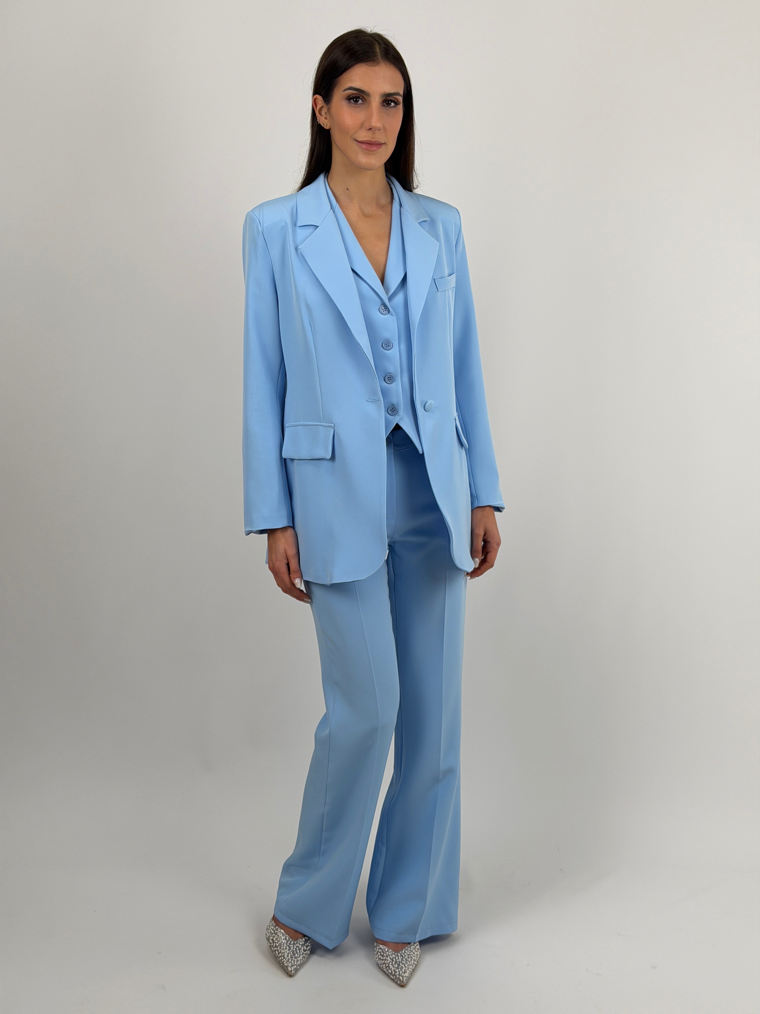 Pantalone azzurro da completo modello flare con chiusura con zip e bottone, passanti per cintura e tasche laterali.