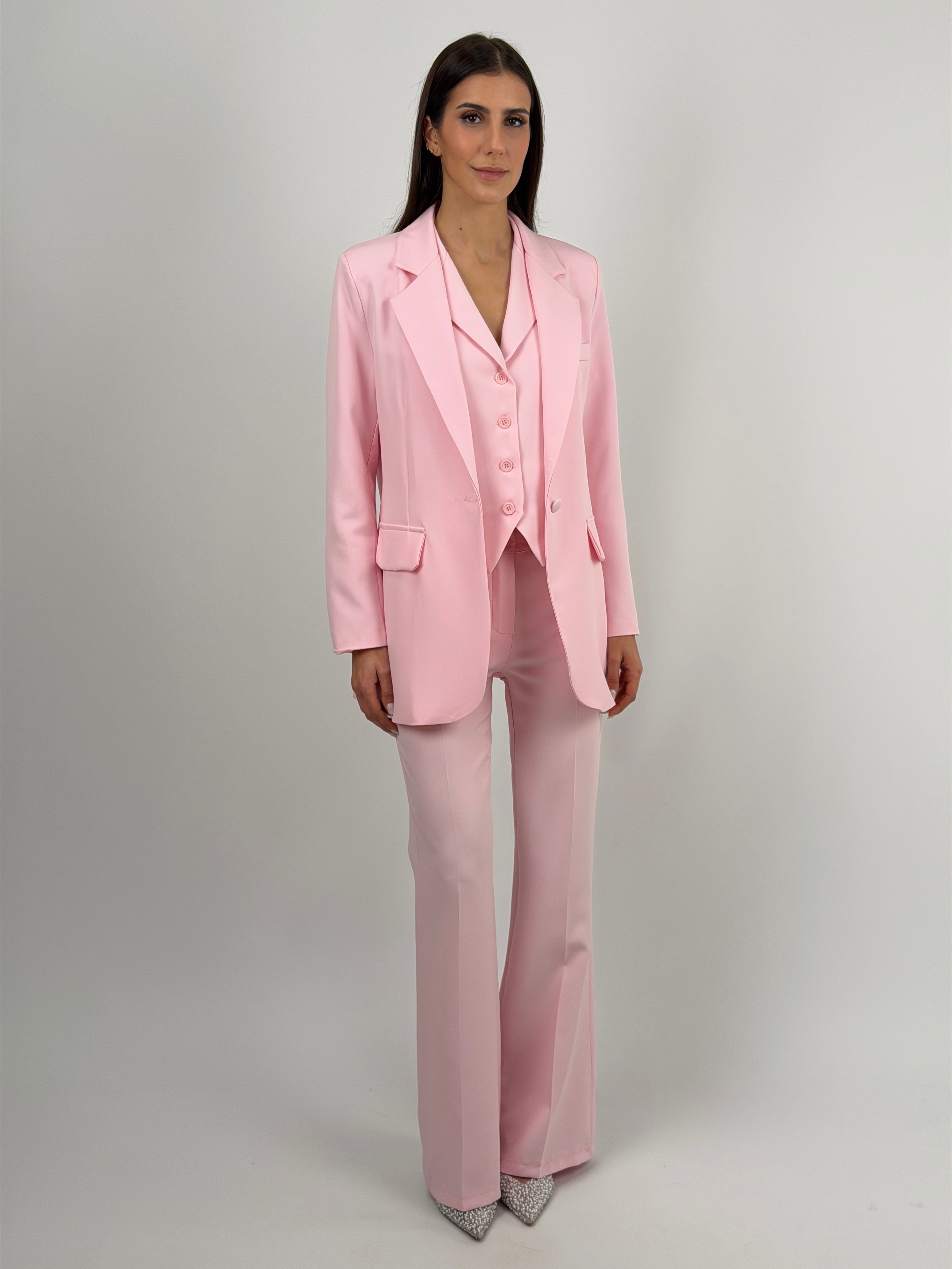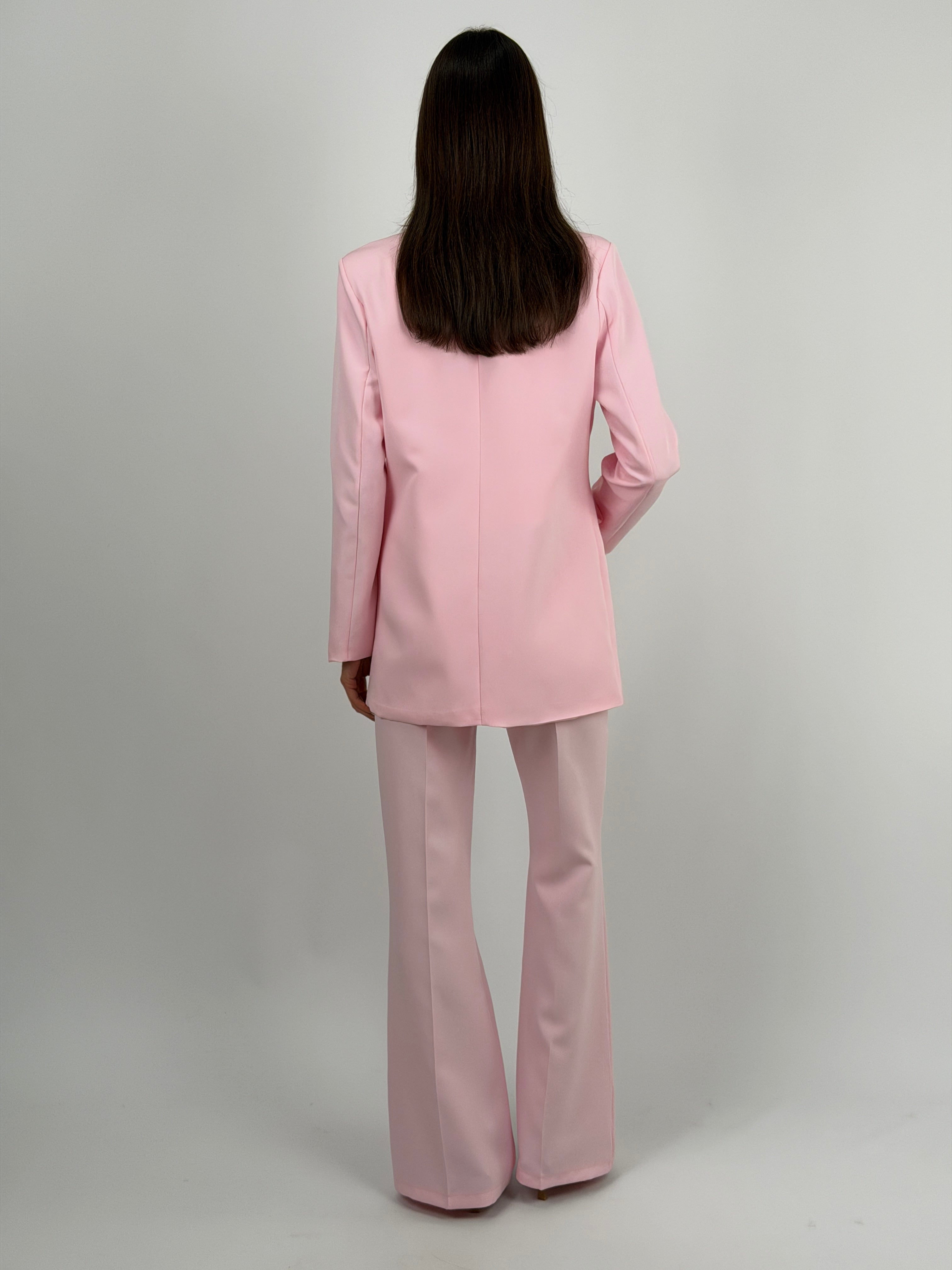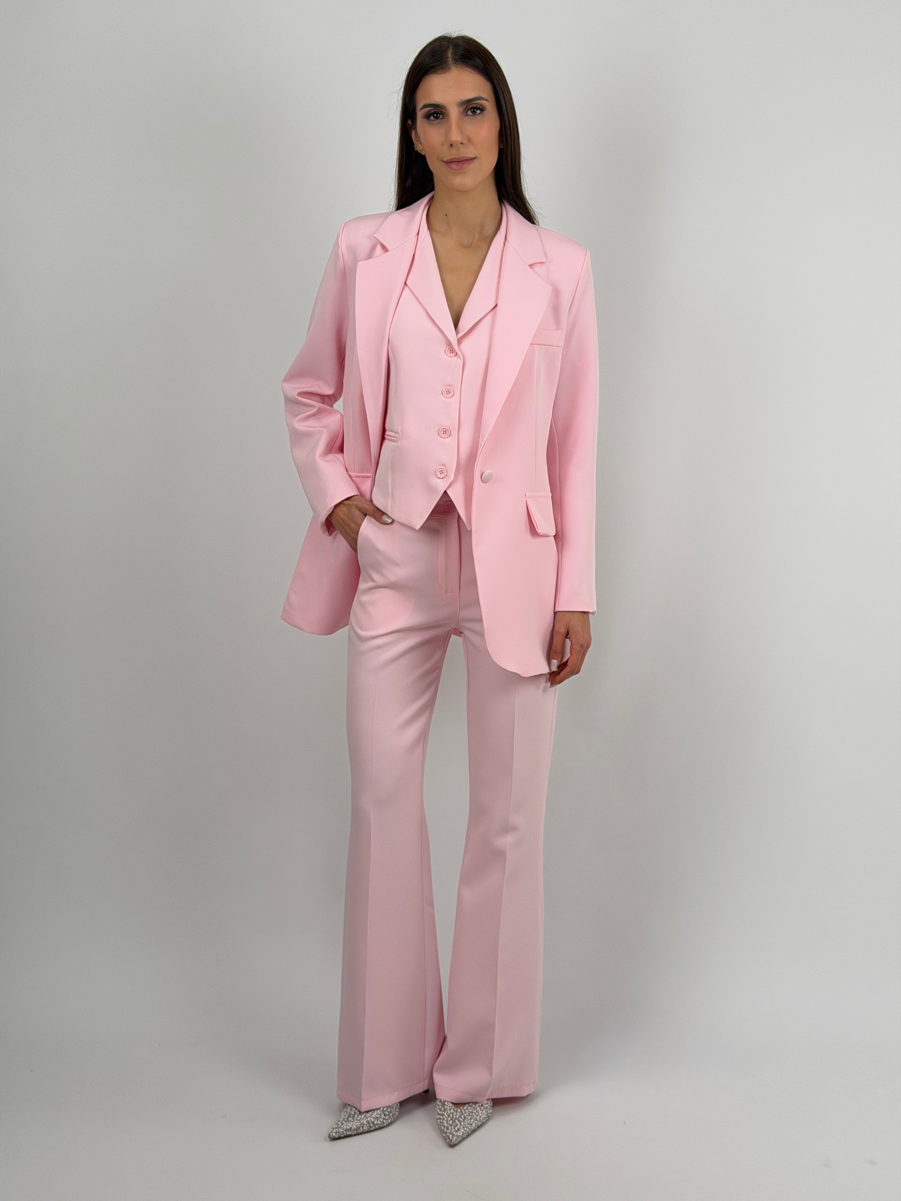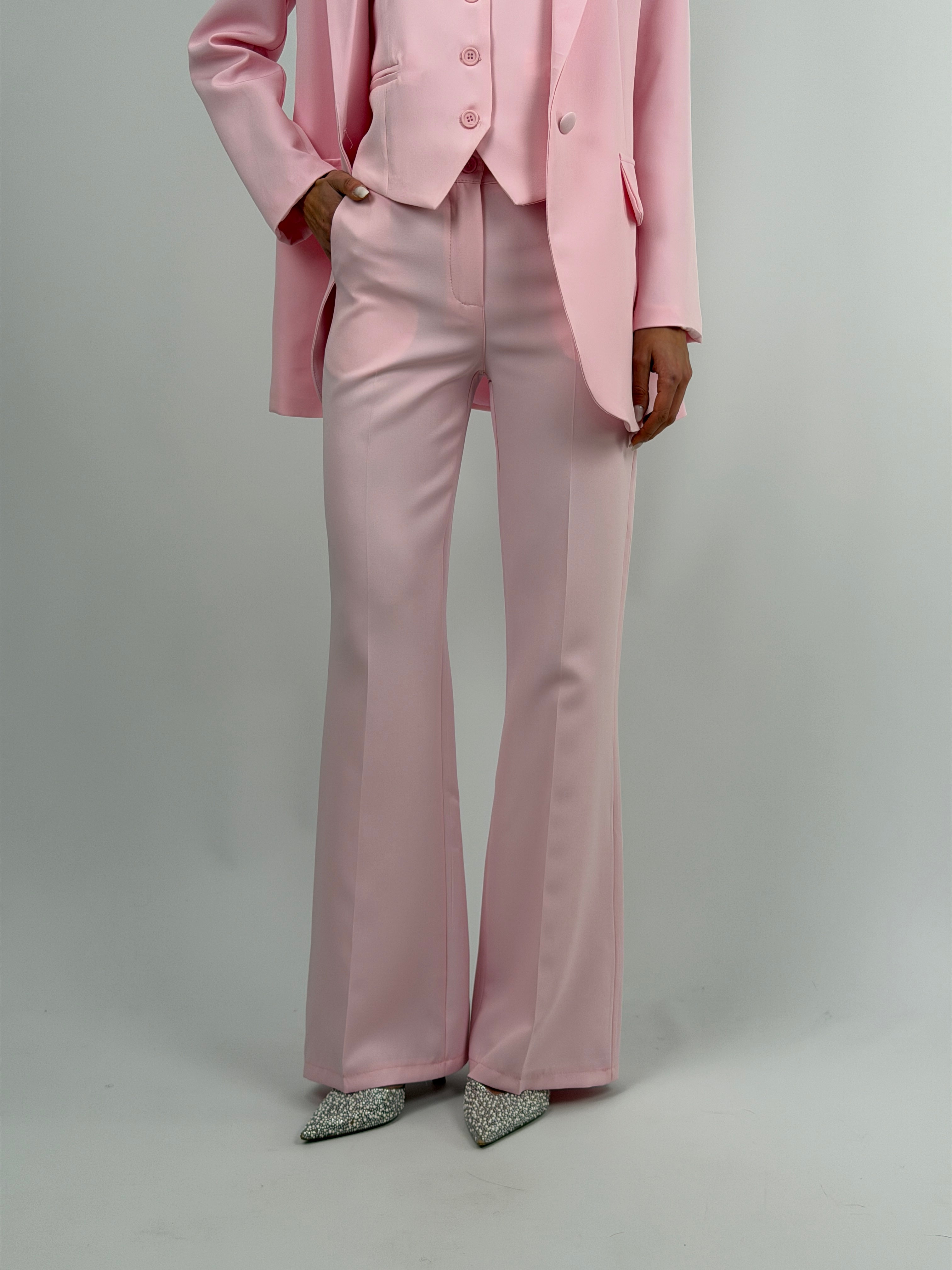 Pantalone rosa da completo modello flare con chiusura con zip e bottone, passanti per cintura e tasche laterali.
