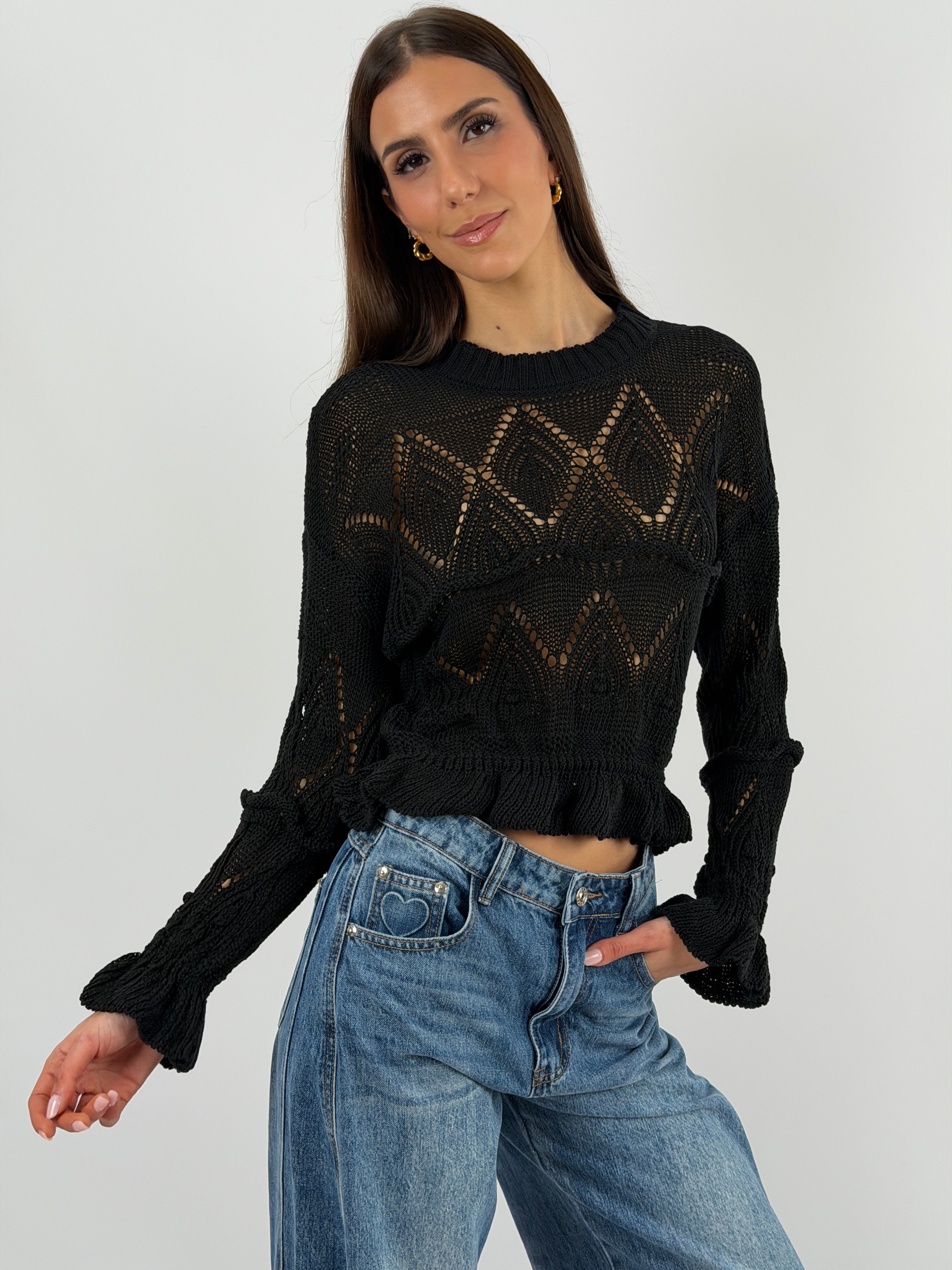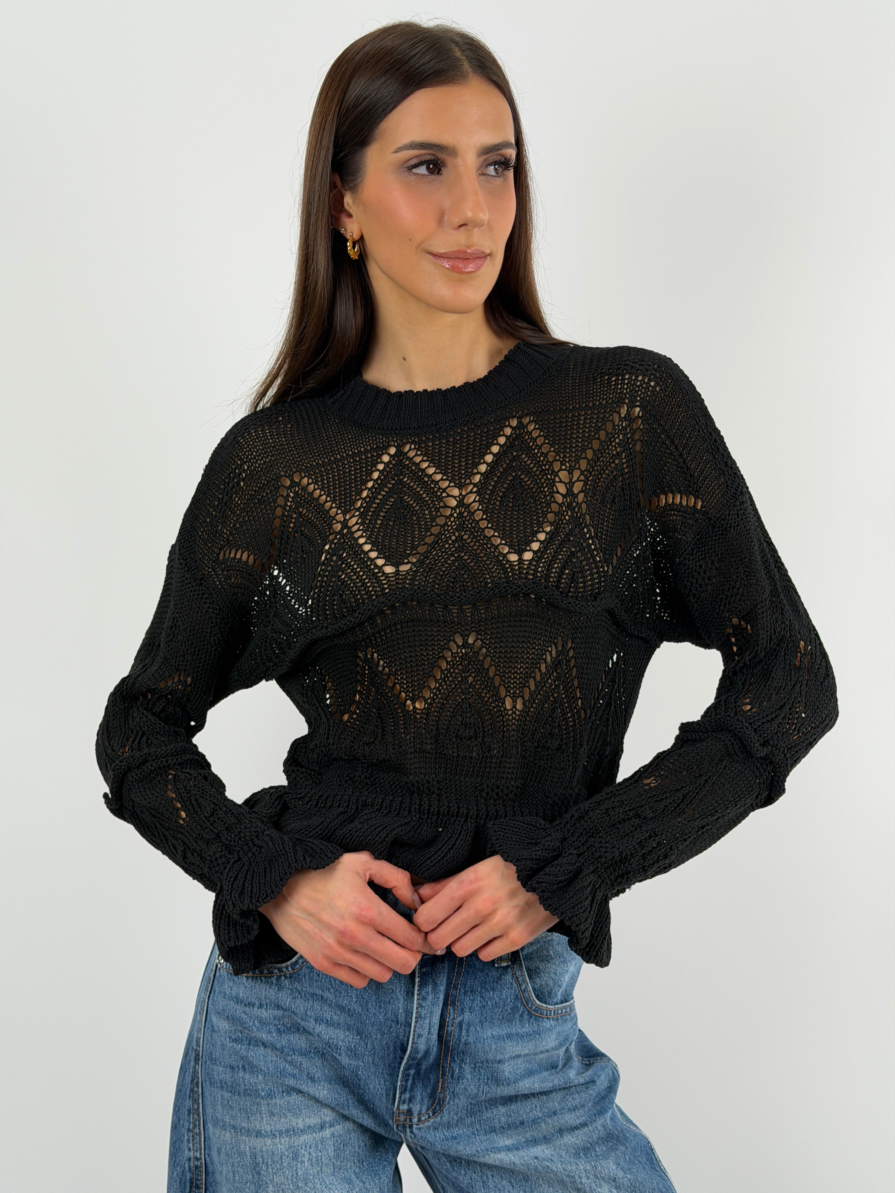 Maglioncino nero a girocollo con maniche lunghe in maglia con lavorazione traforata