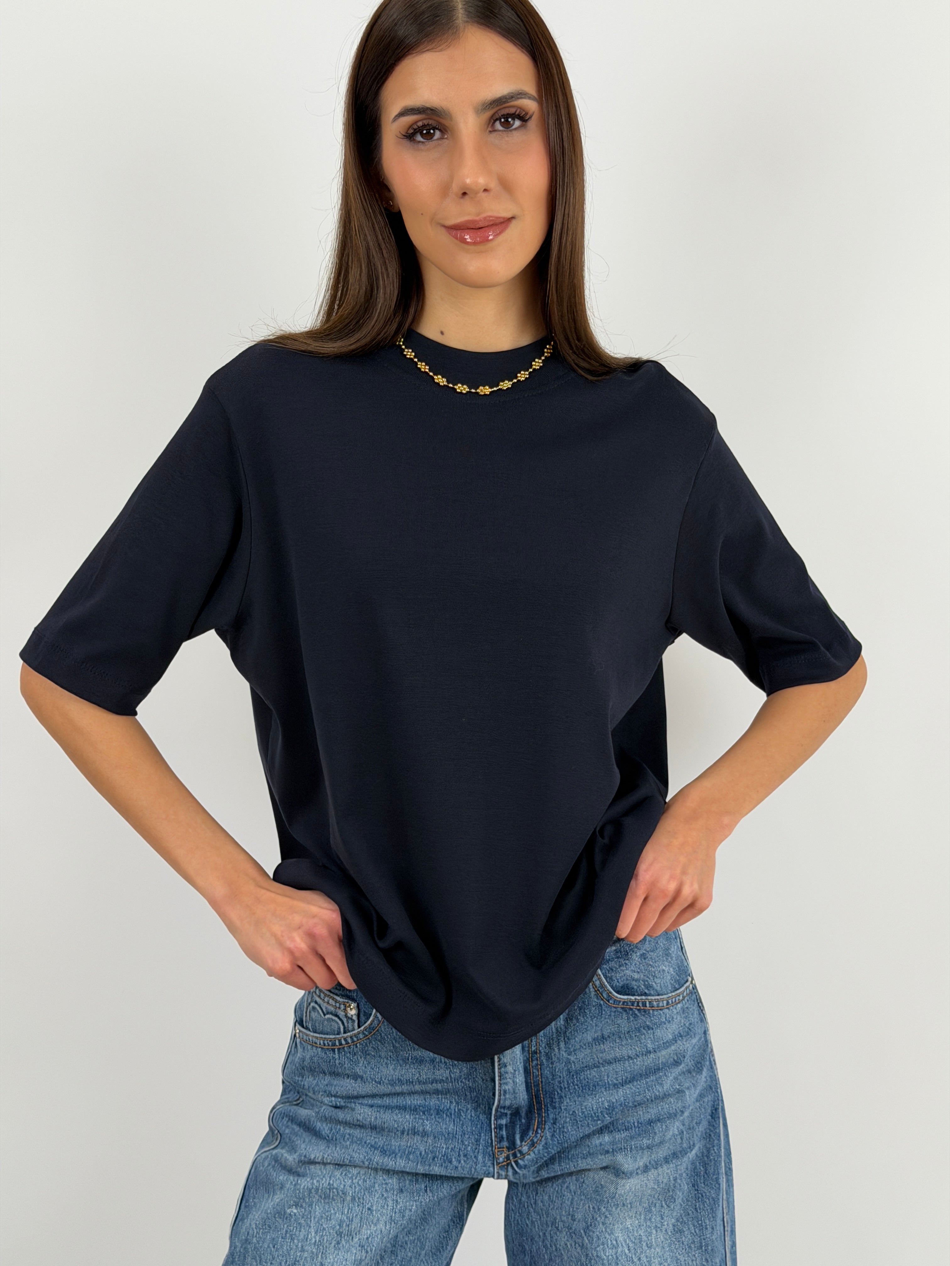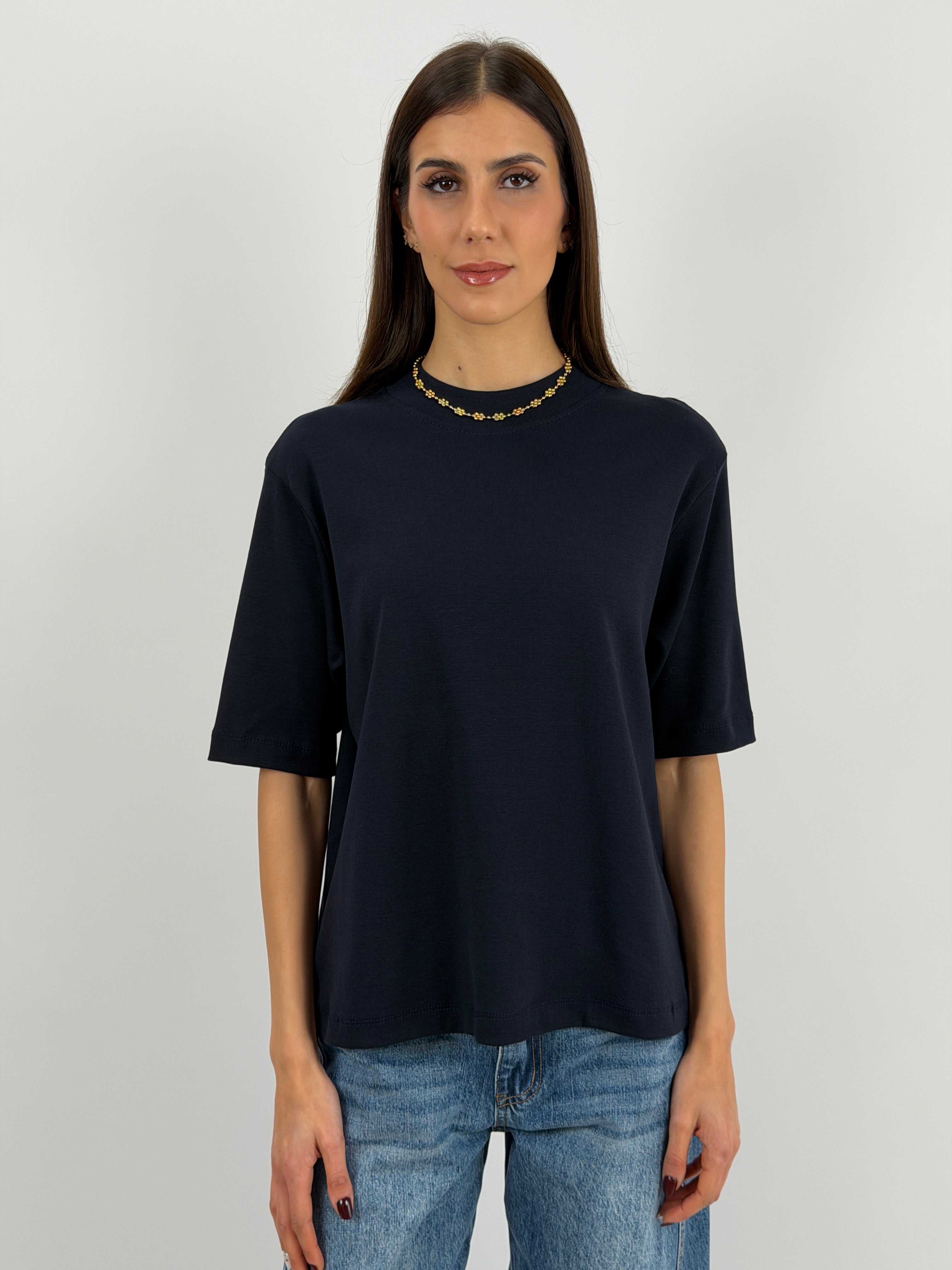 Black cotton T-shirt with wide short sleeves and a high collar.