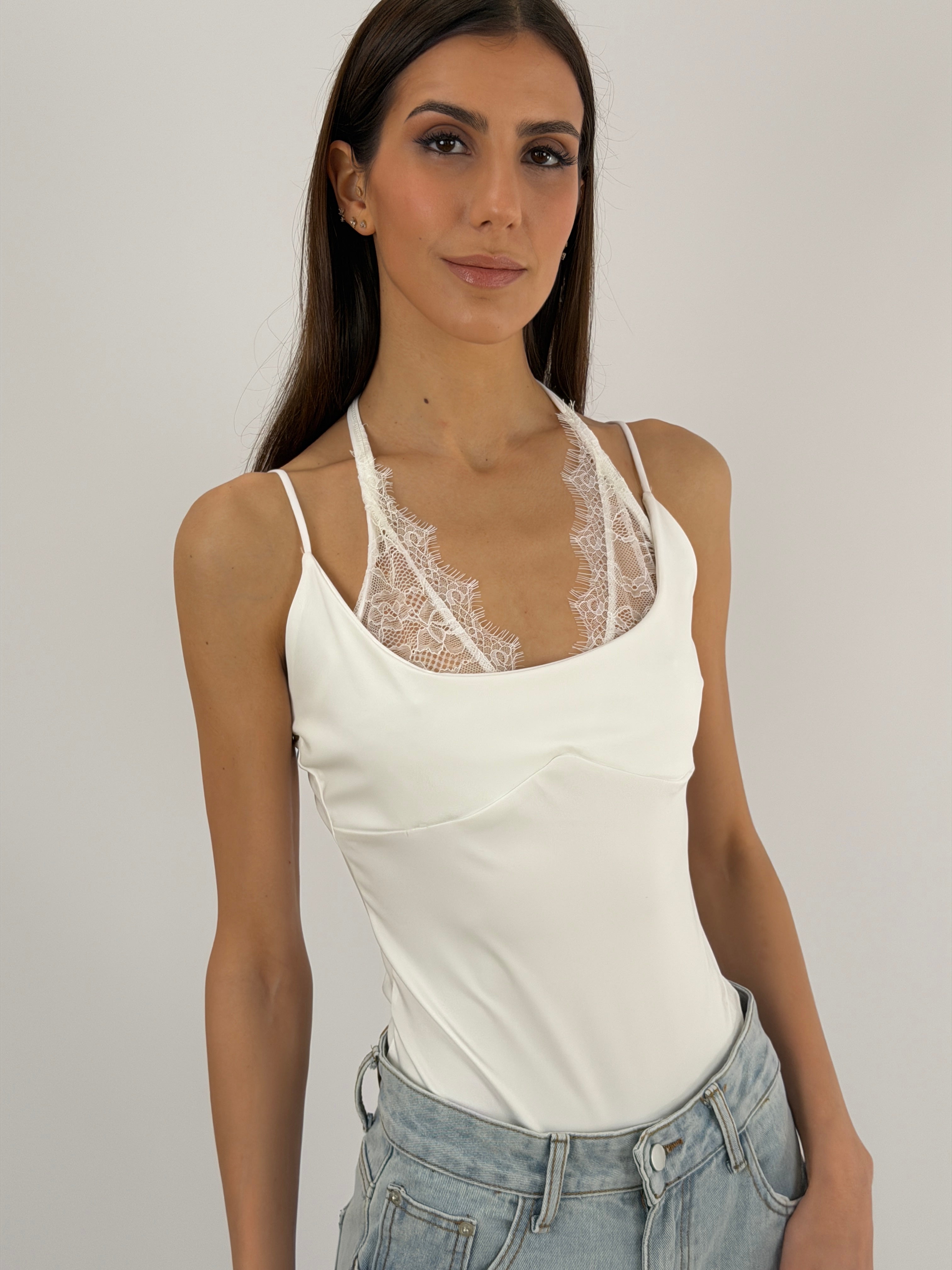 Body bianco in lycra elasticizzata con doppio stato in pizzo allacciato al collo, spalline sottili e regolabili e chiusura con gancetti.