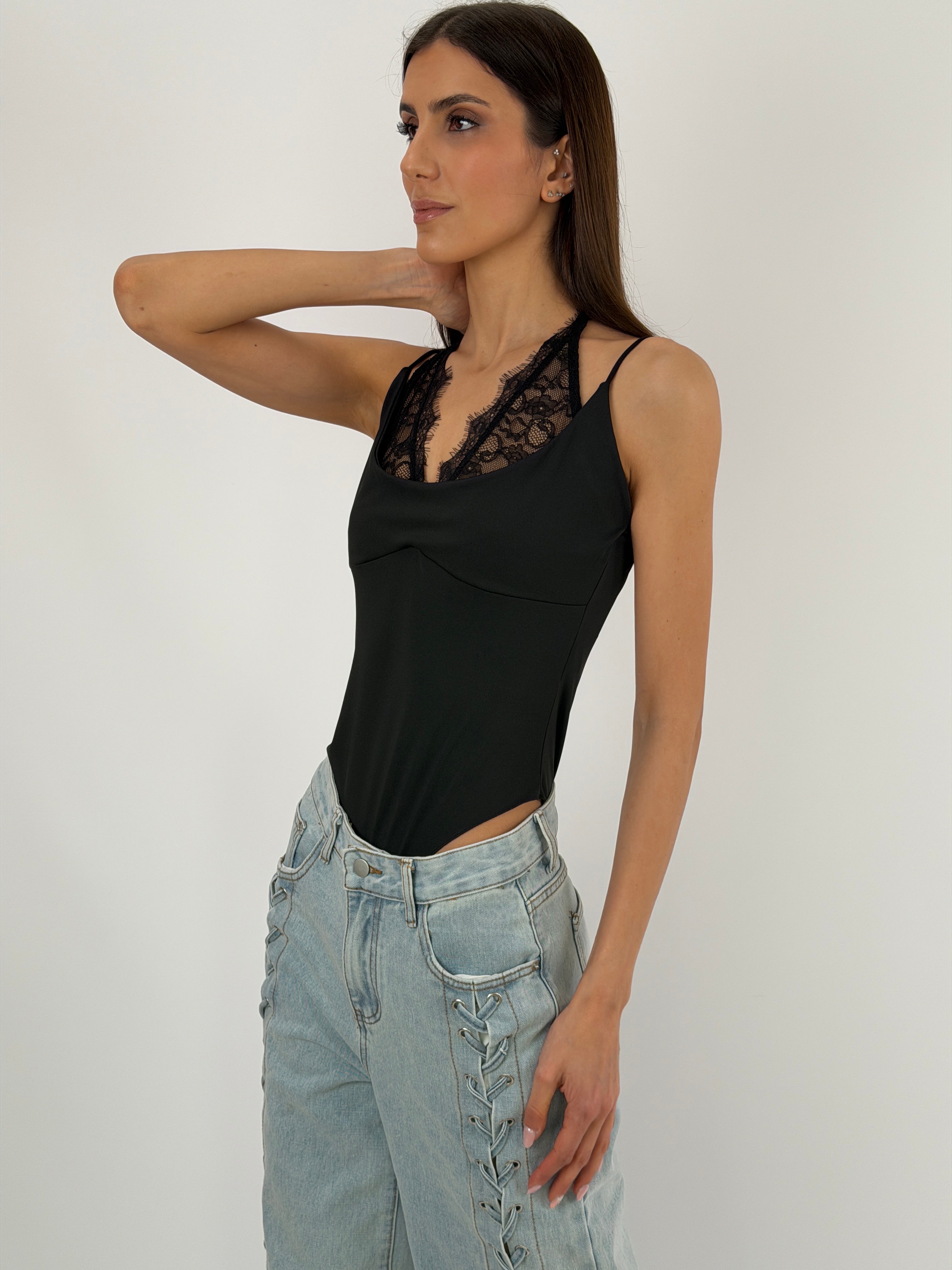 Body nero in lycra elasticizzata con doppio stato in pizzo allacciato al collo, spalline sottili e regolabili e chiusura con gancetti.