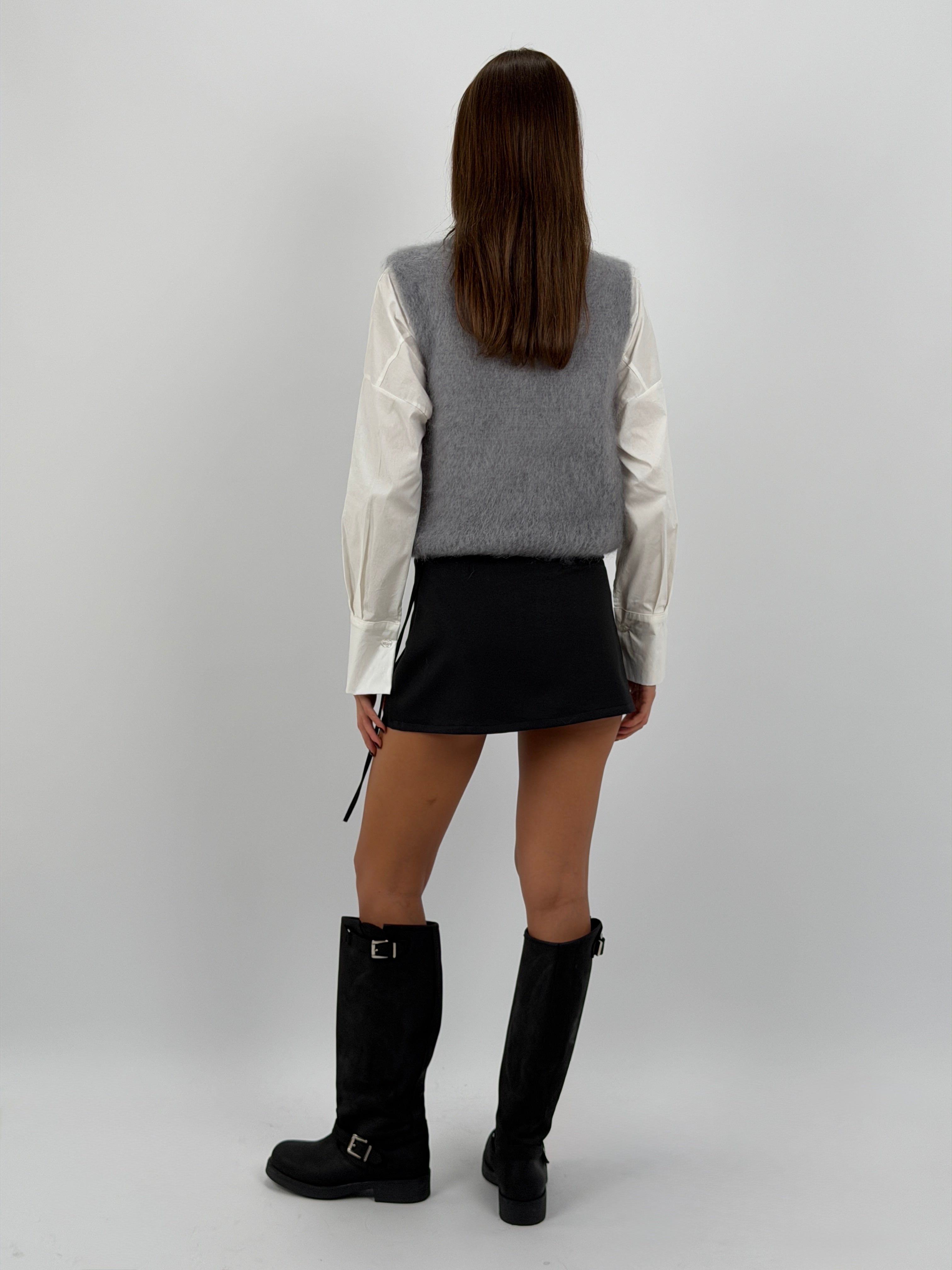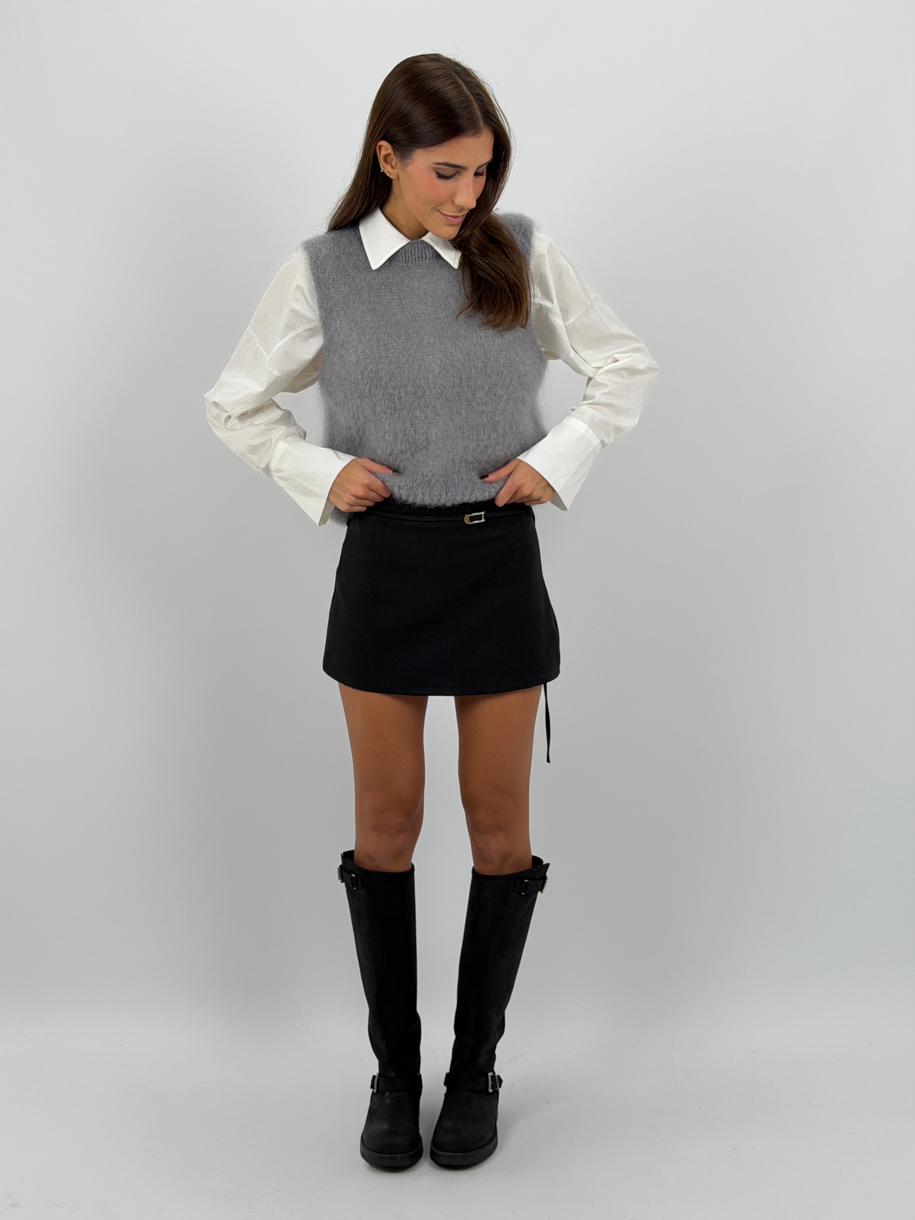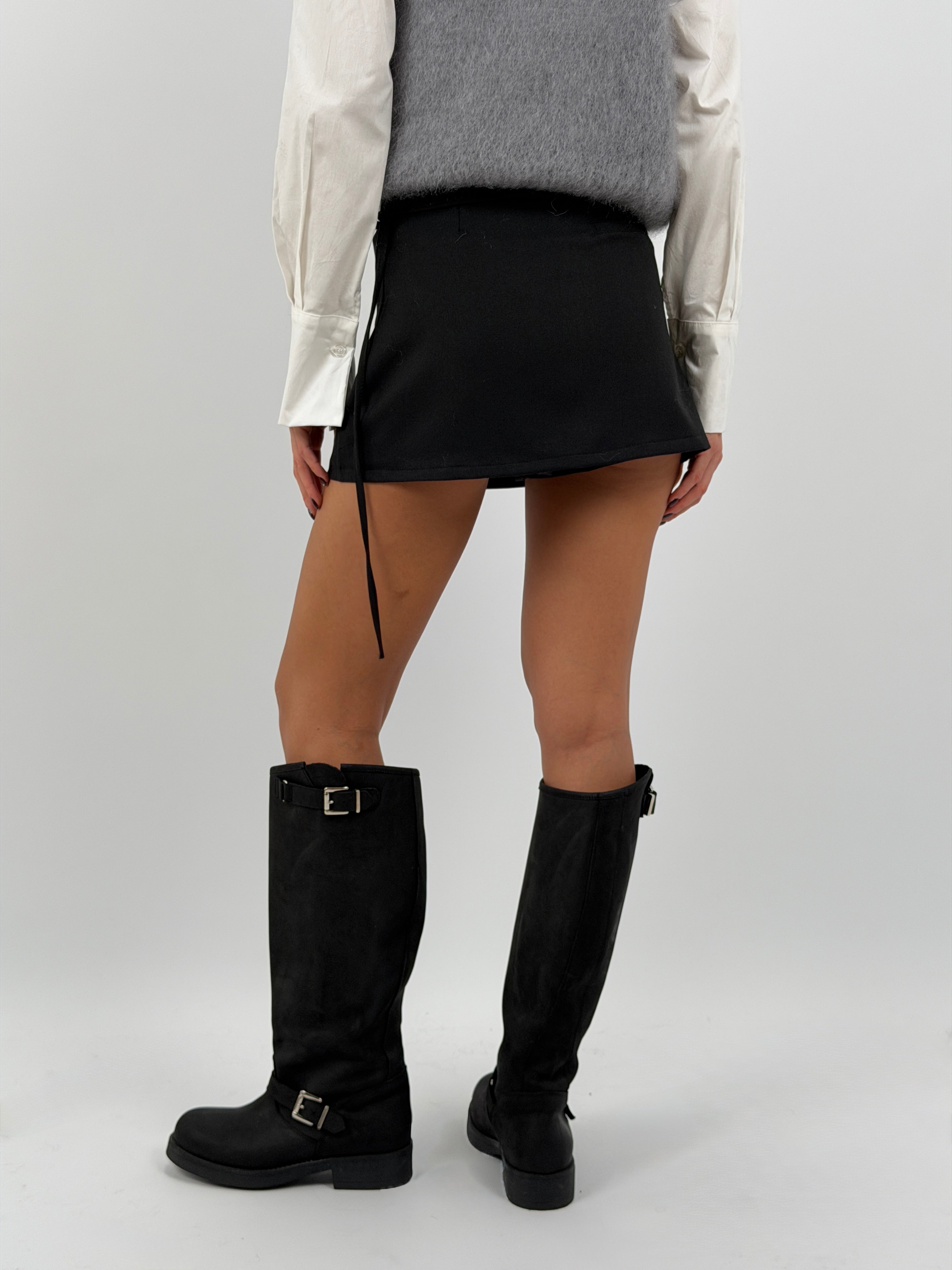 Gonna nera corta con pantaloncino interno e cintura sottile con fibbia metallica.