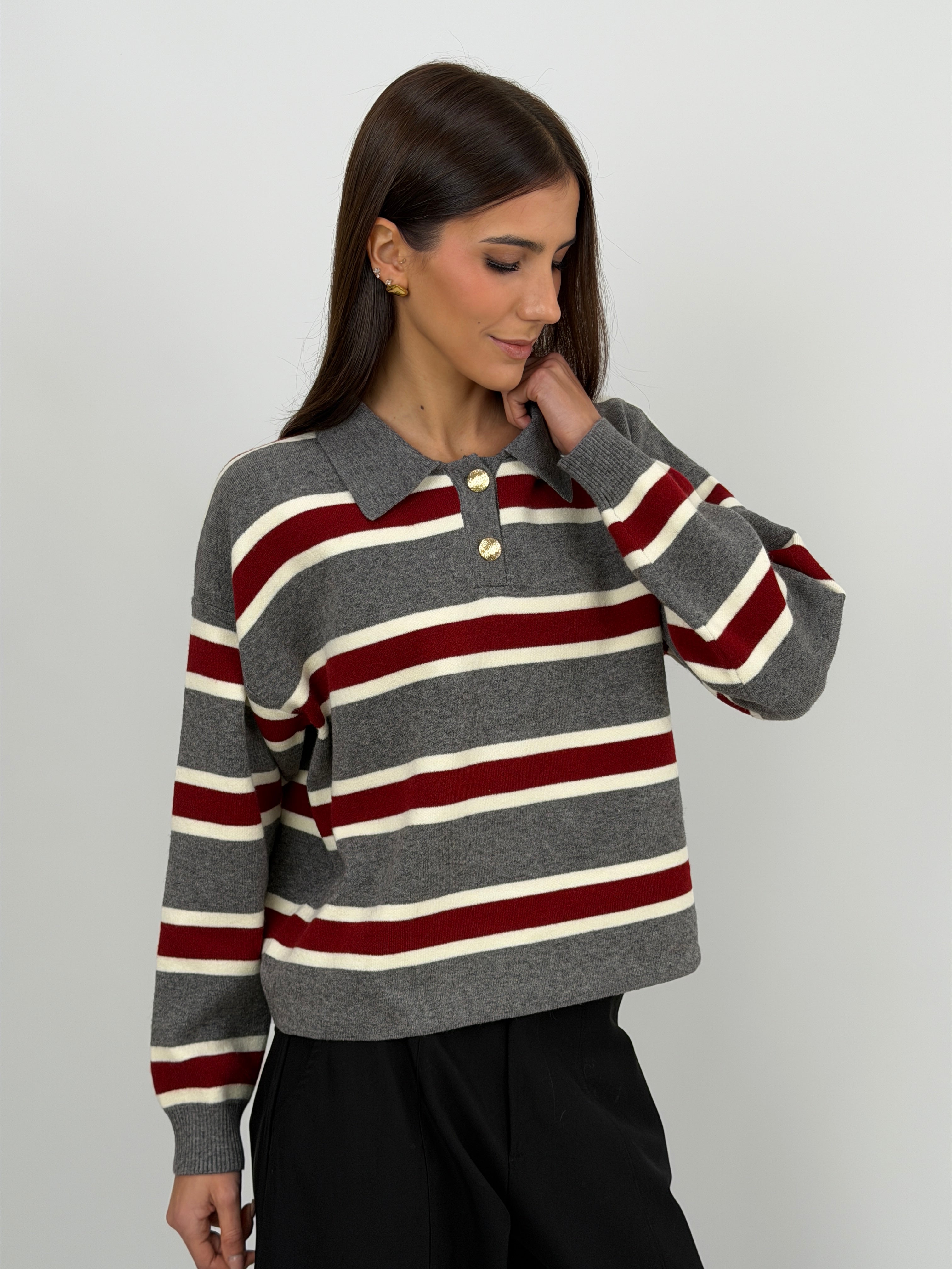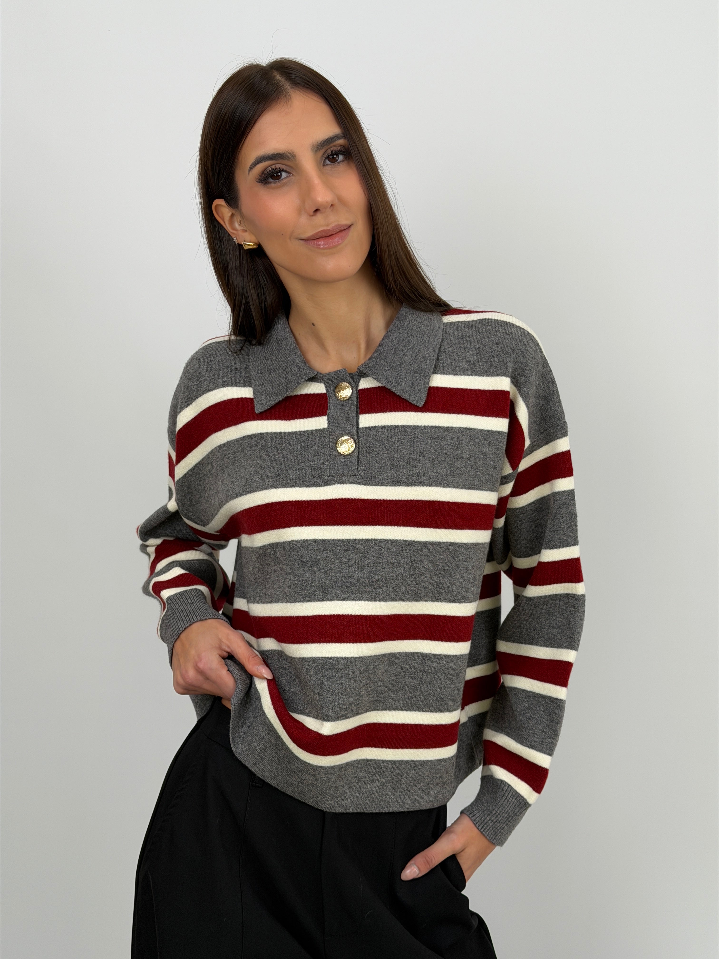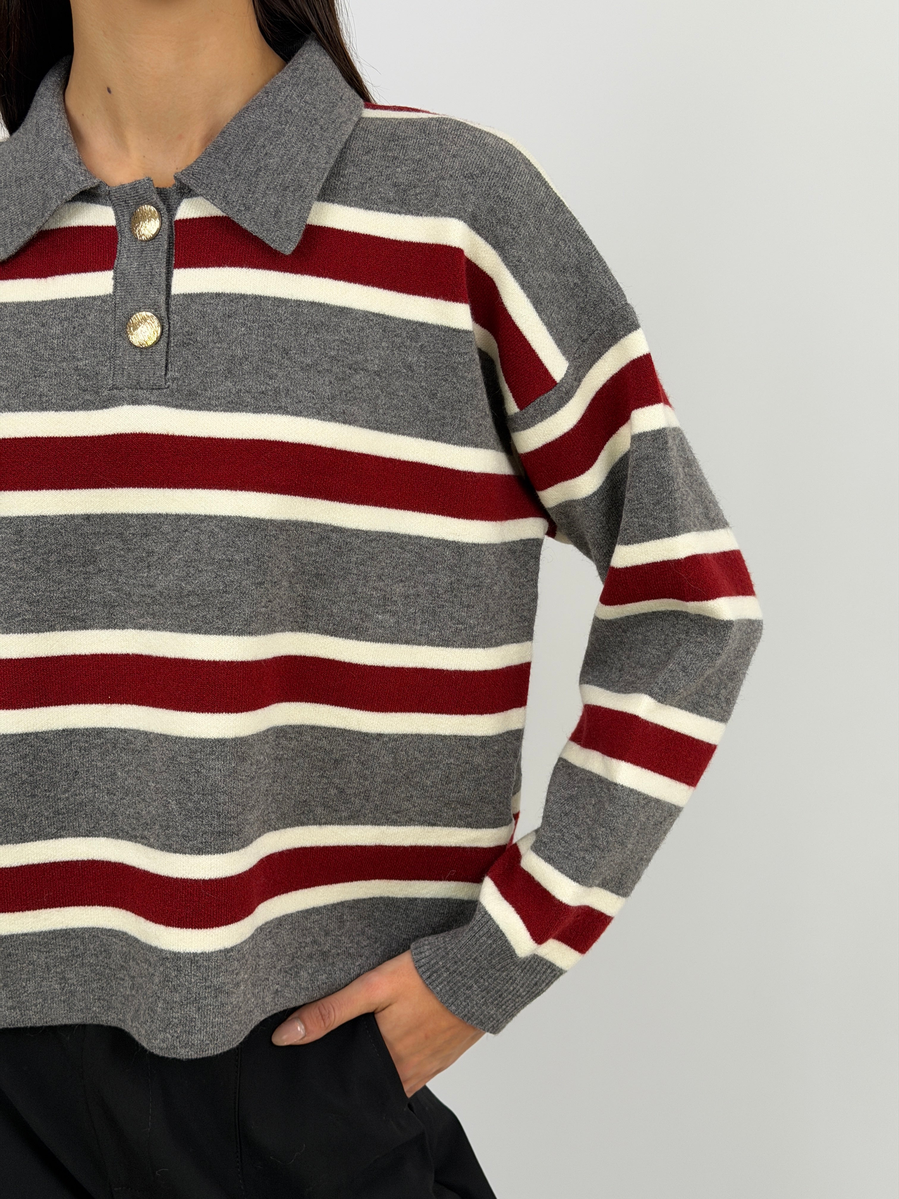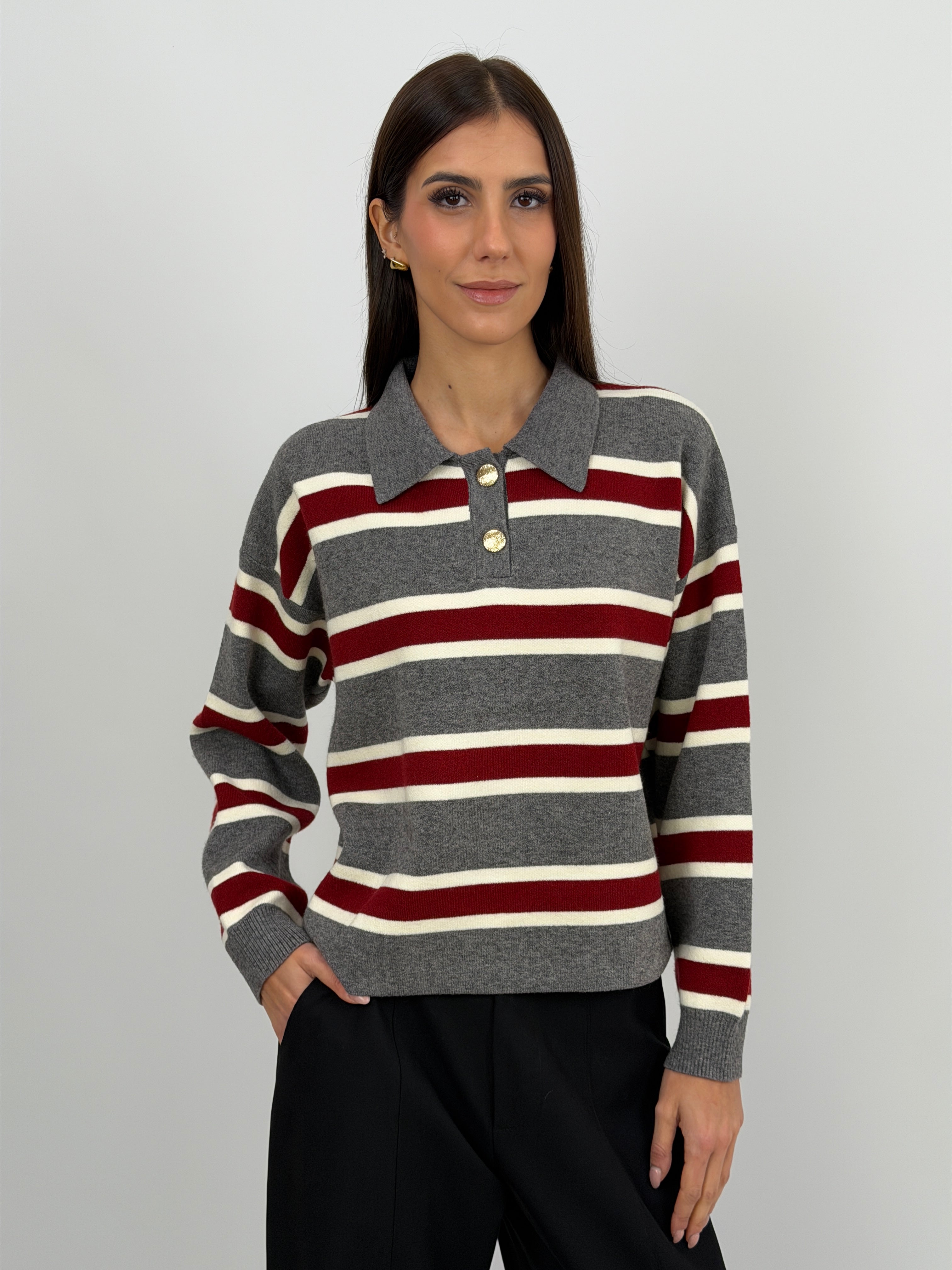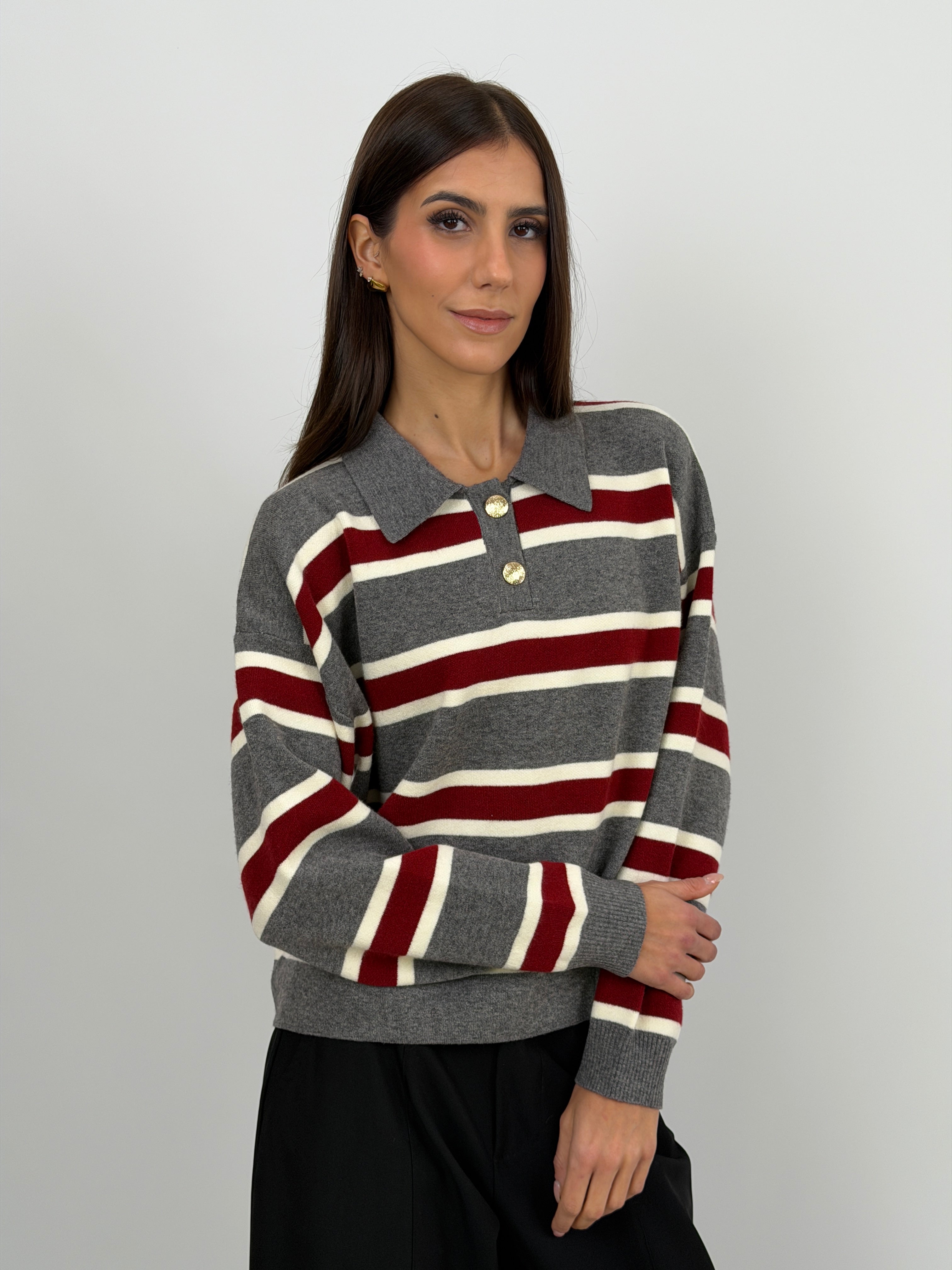 Maglia polo grigio a righe bordeaux e bianche, con colletto classico e chiusura frontale con bottoni gioiello. Tessuto a maglia morbido e linea casual.