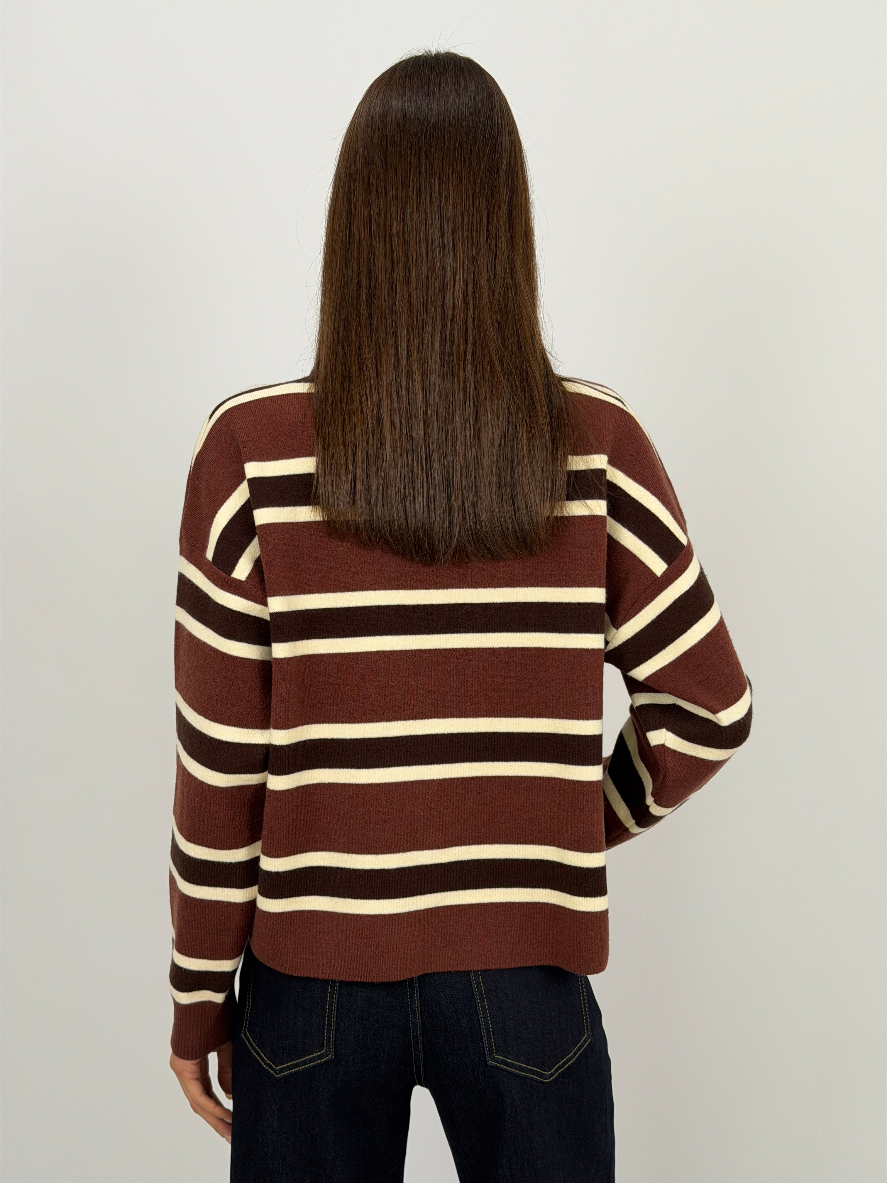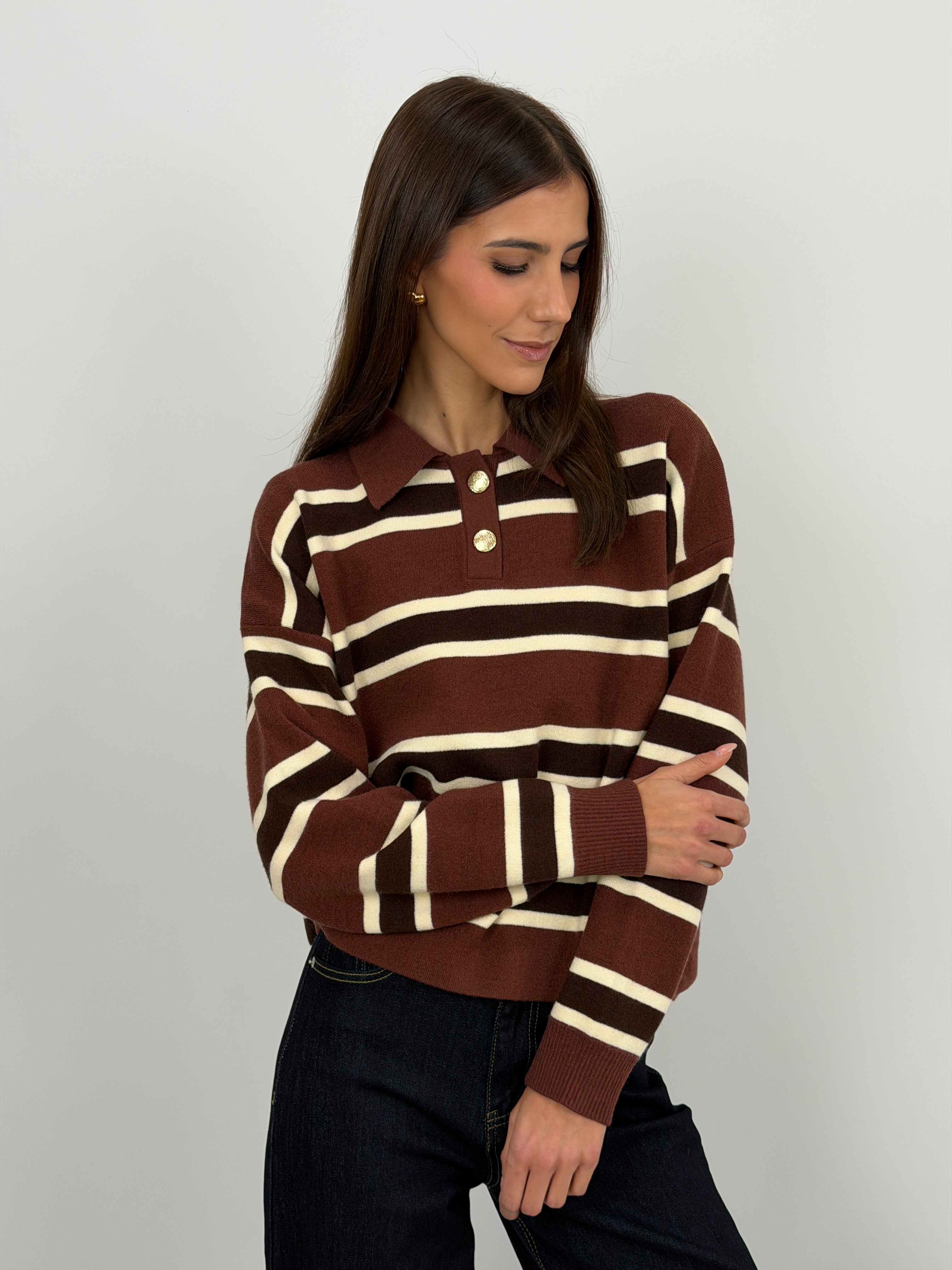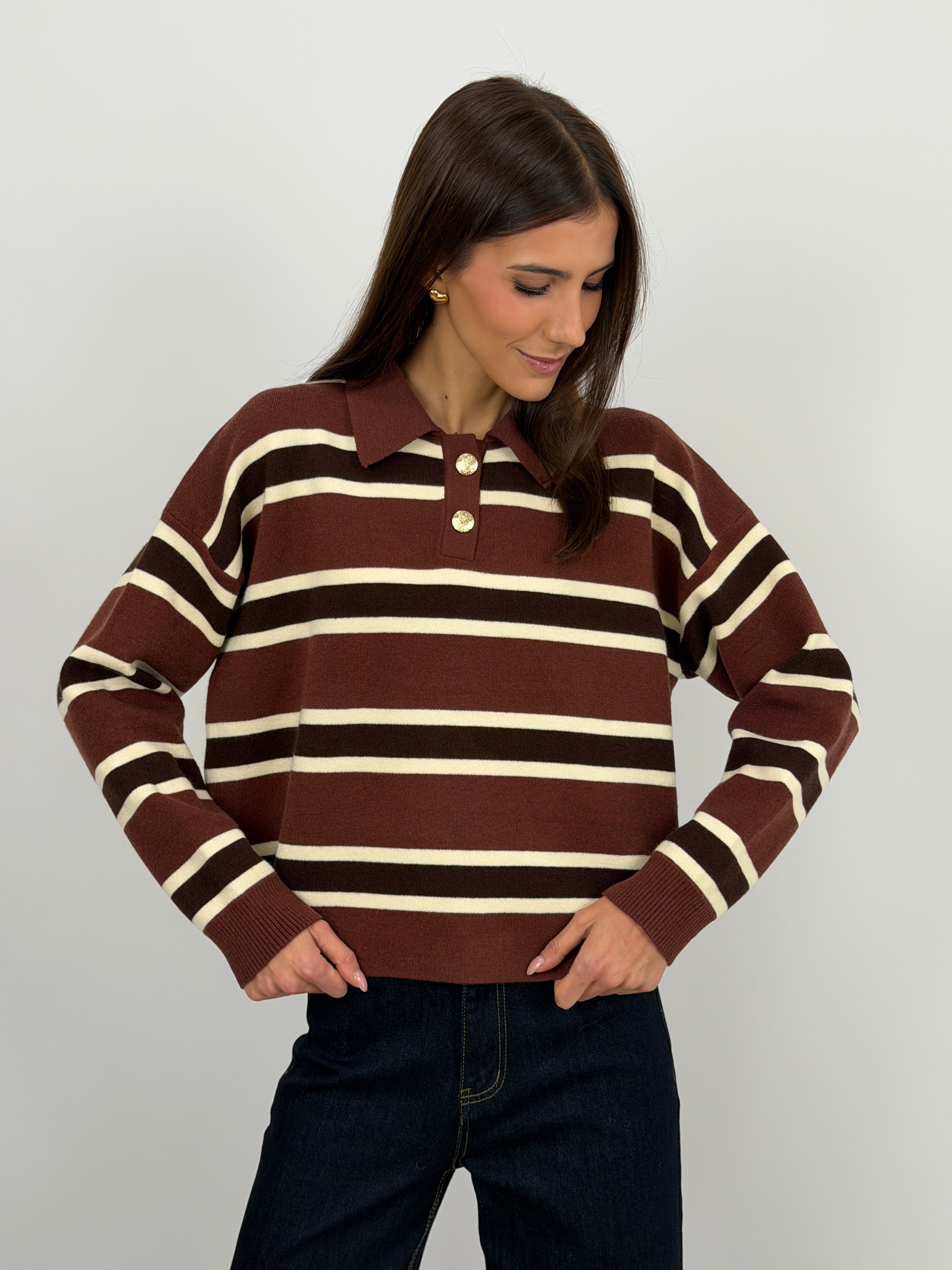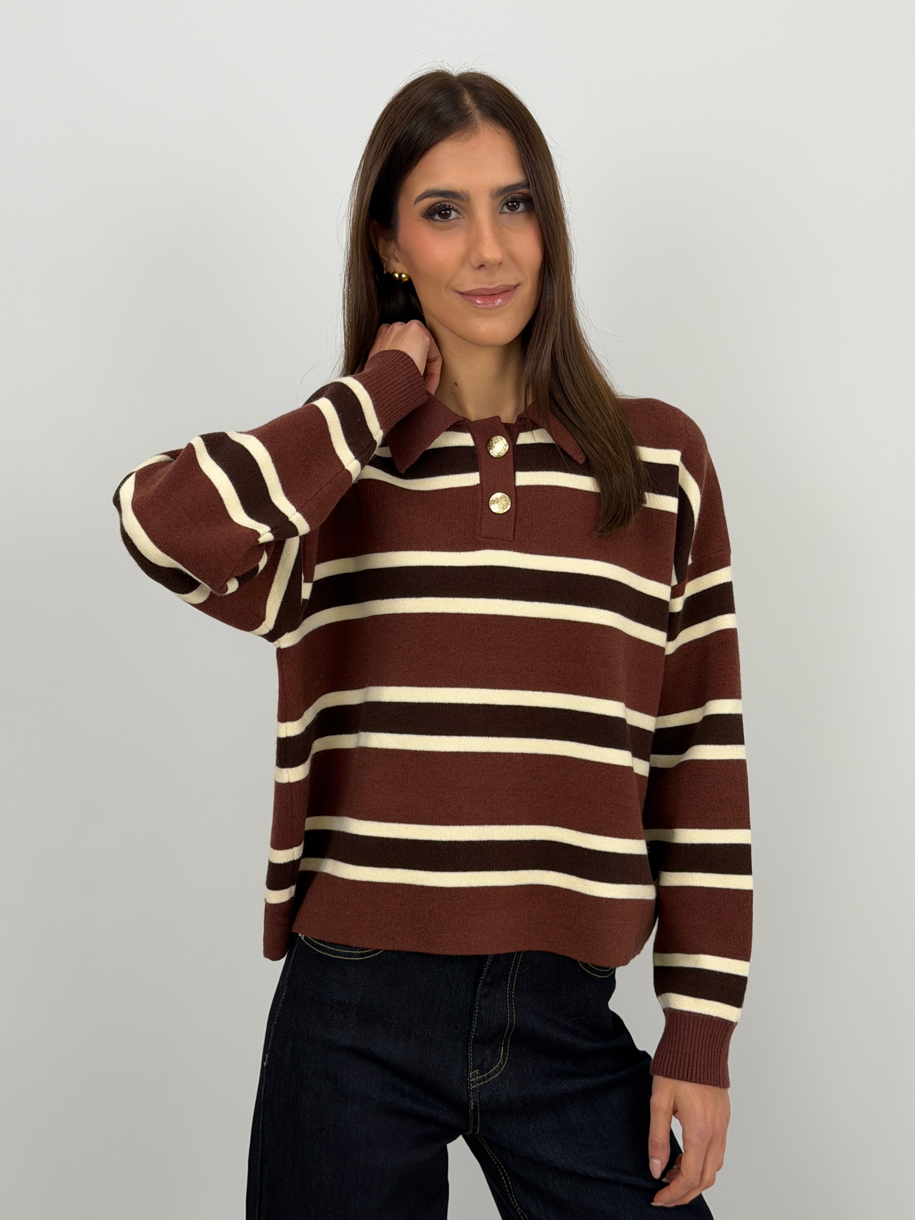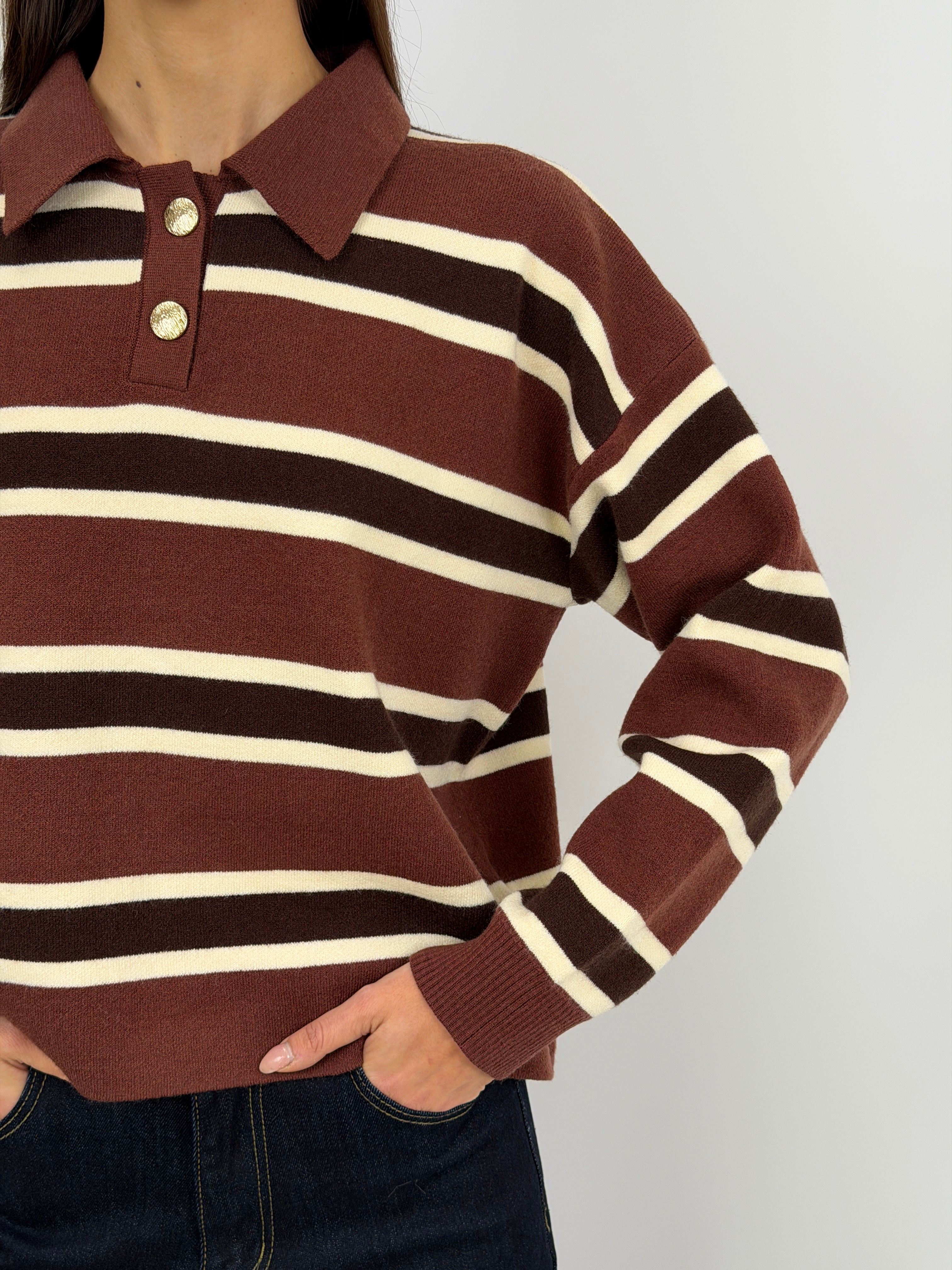 Maglia polo marrone a righe burgundy e bianche, con colletto classico e chiusura frontale con bottoni gioiello. Tessuto a maglia morbido e linea casual