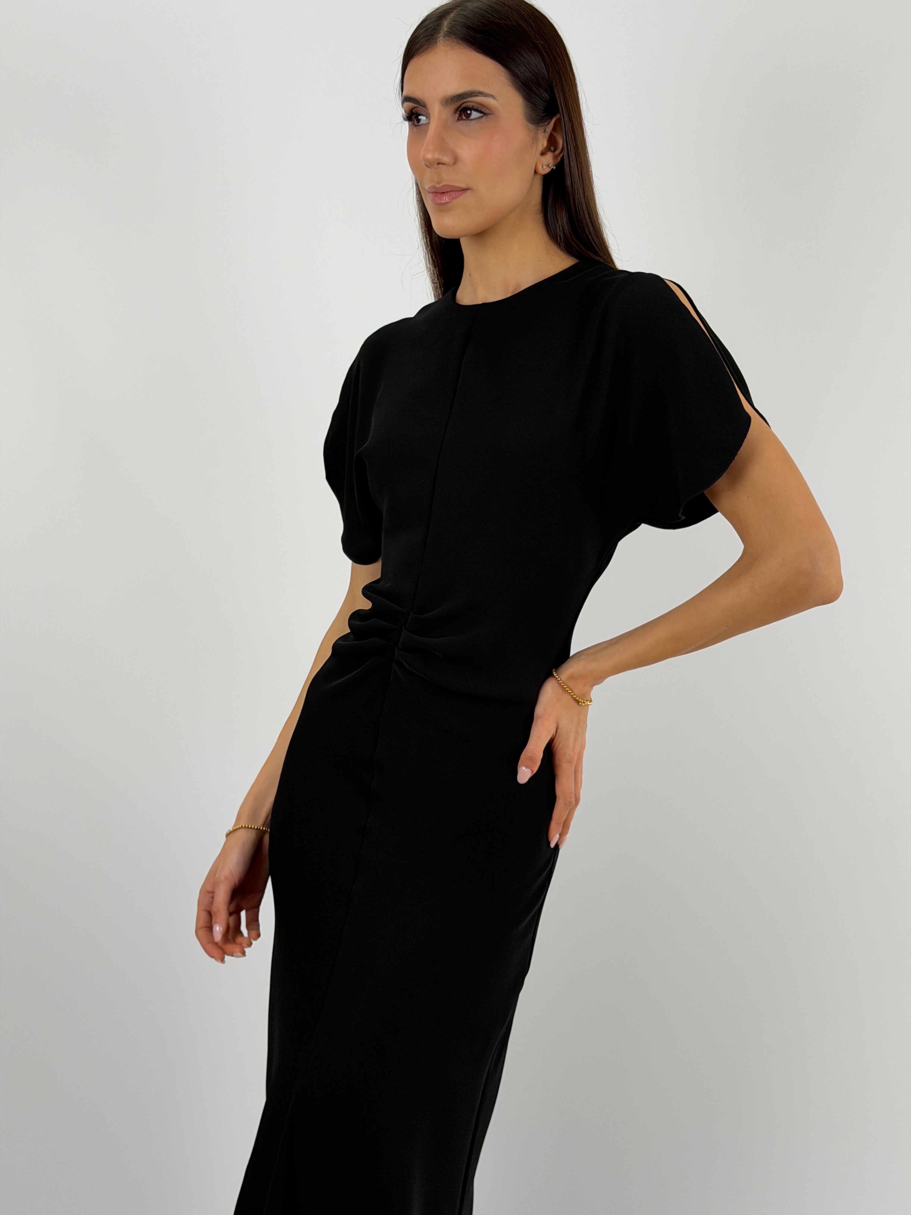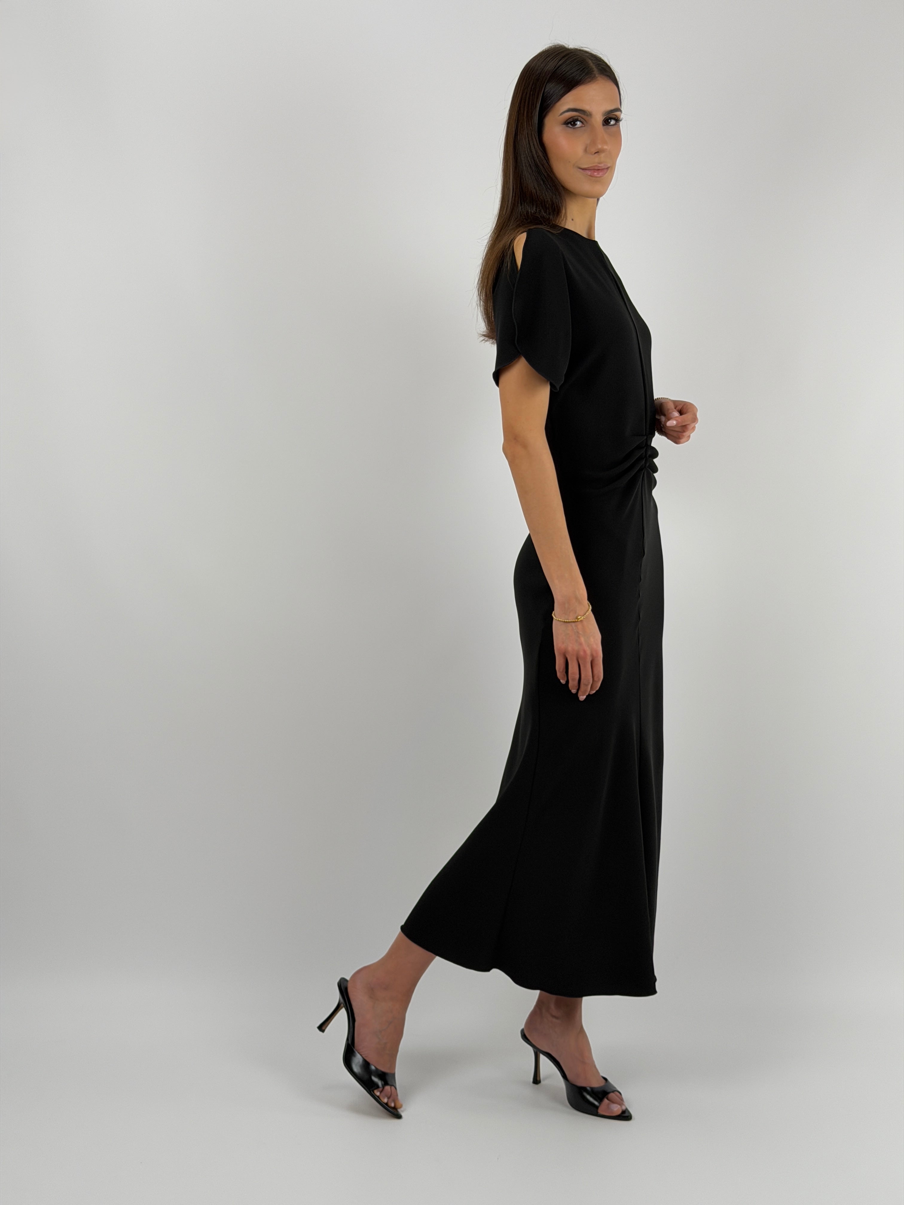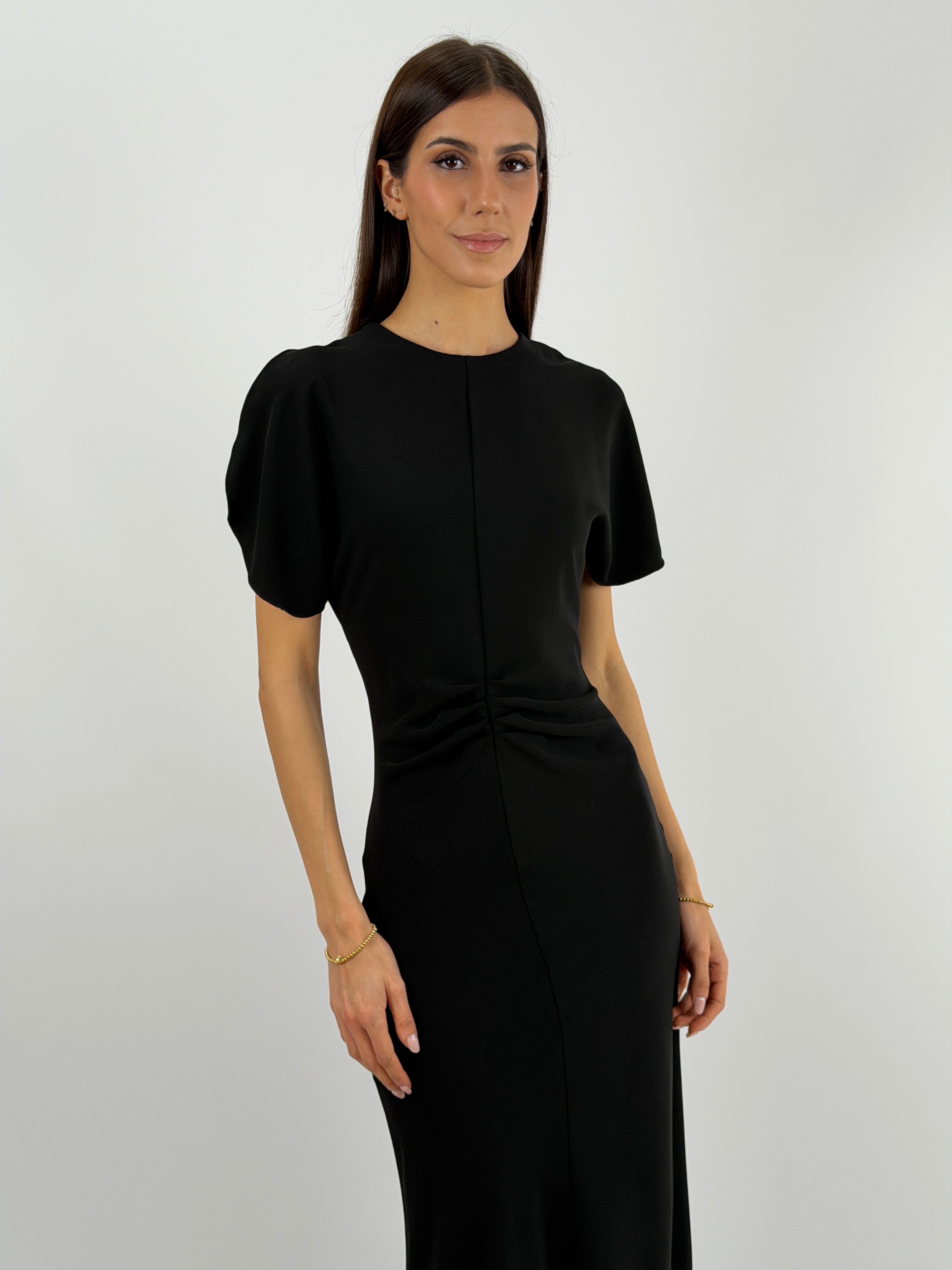Abito lungo Lumina nero con arricciatura frontale, manica corta aperta e chiusura con zip sul retro