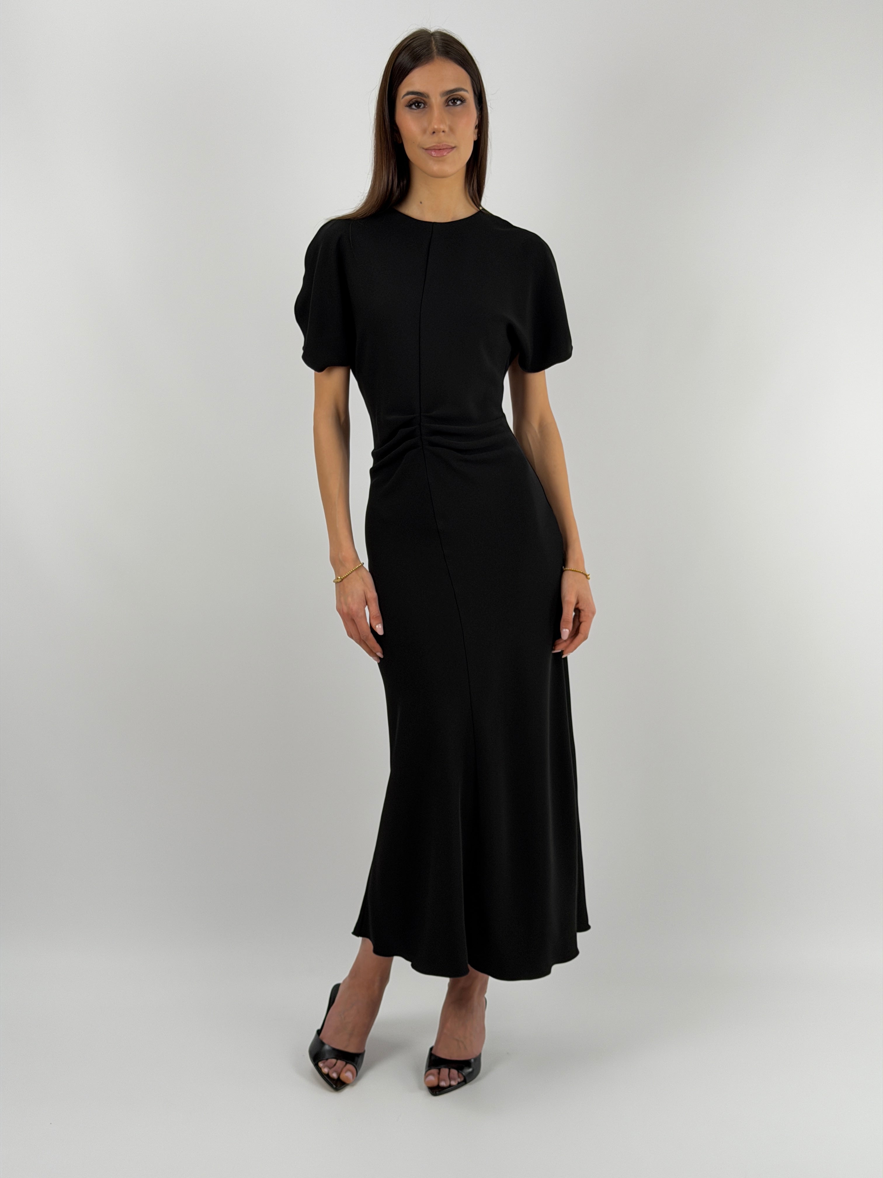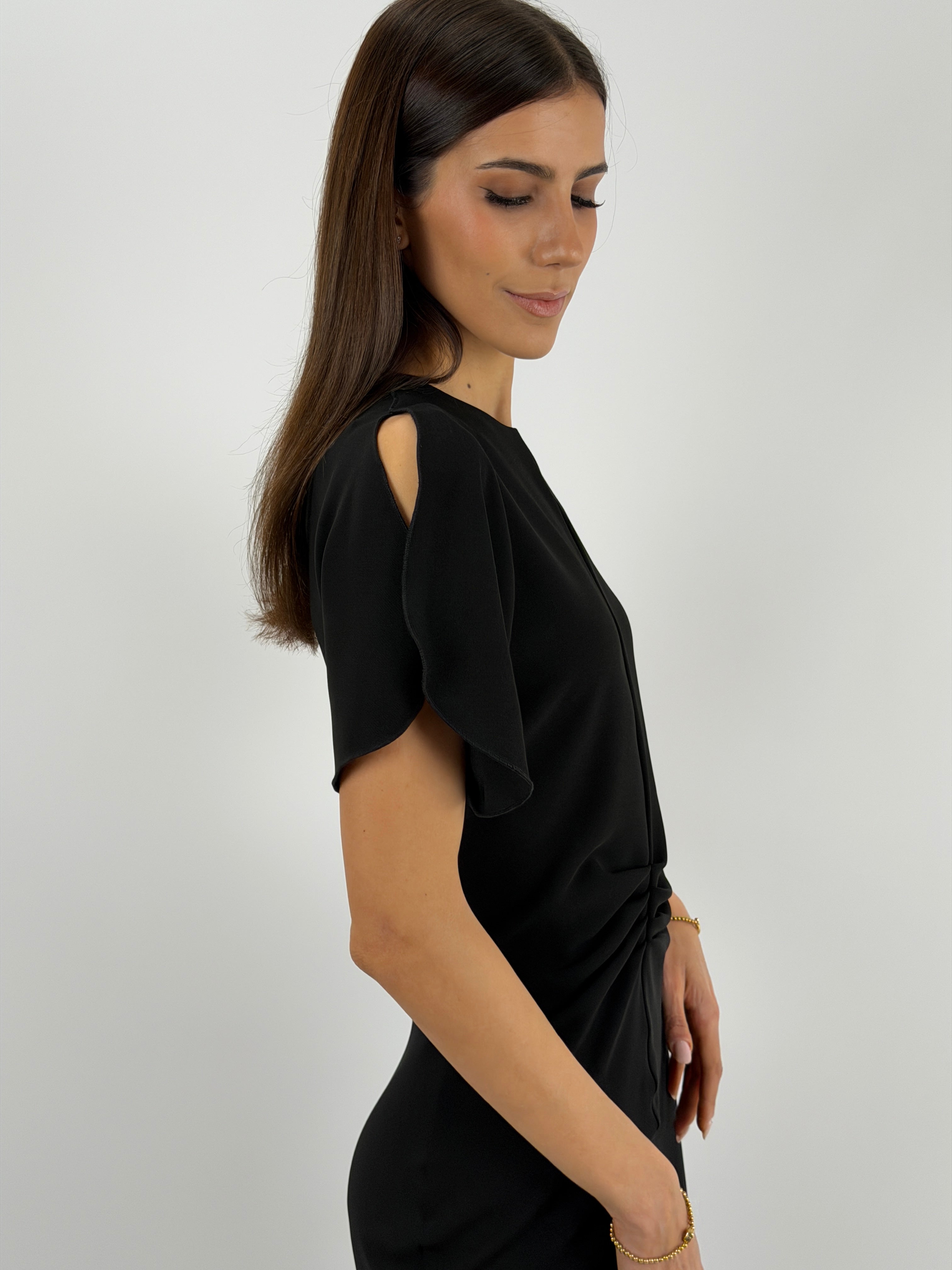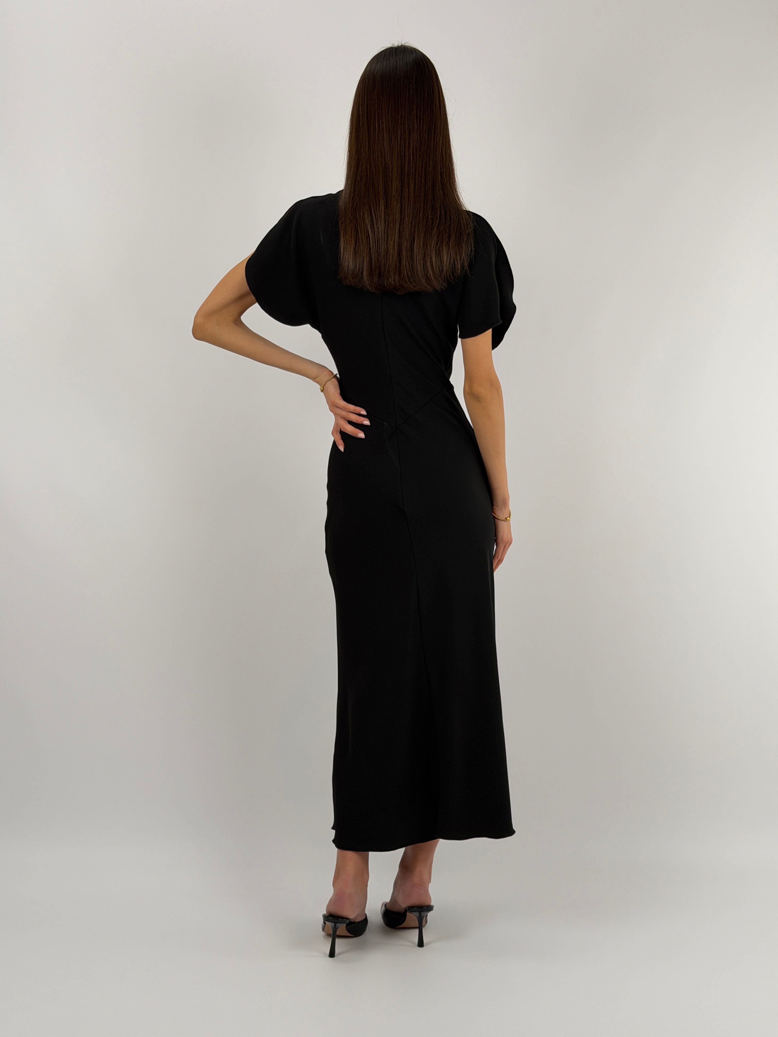 Abito lungo Lumina nero con arricciatura frontale, manica corta aperta e chiusura con zip sul retro