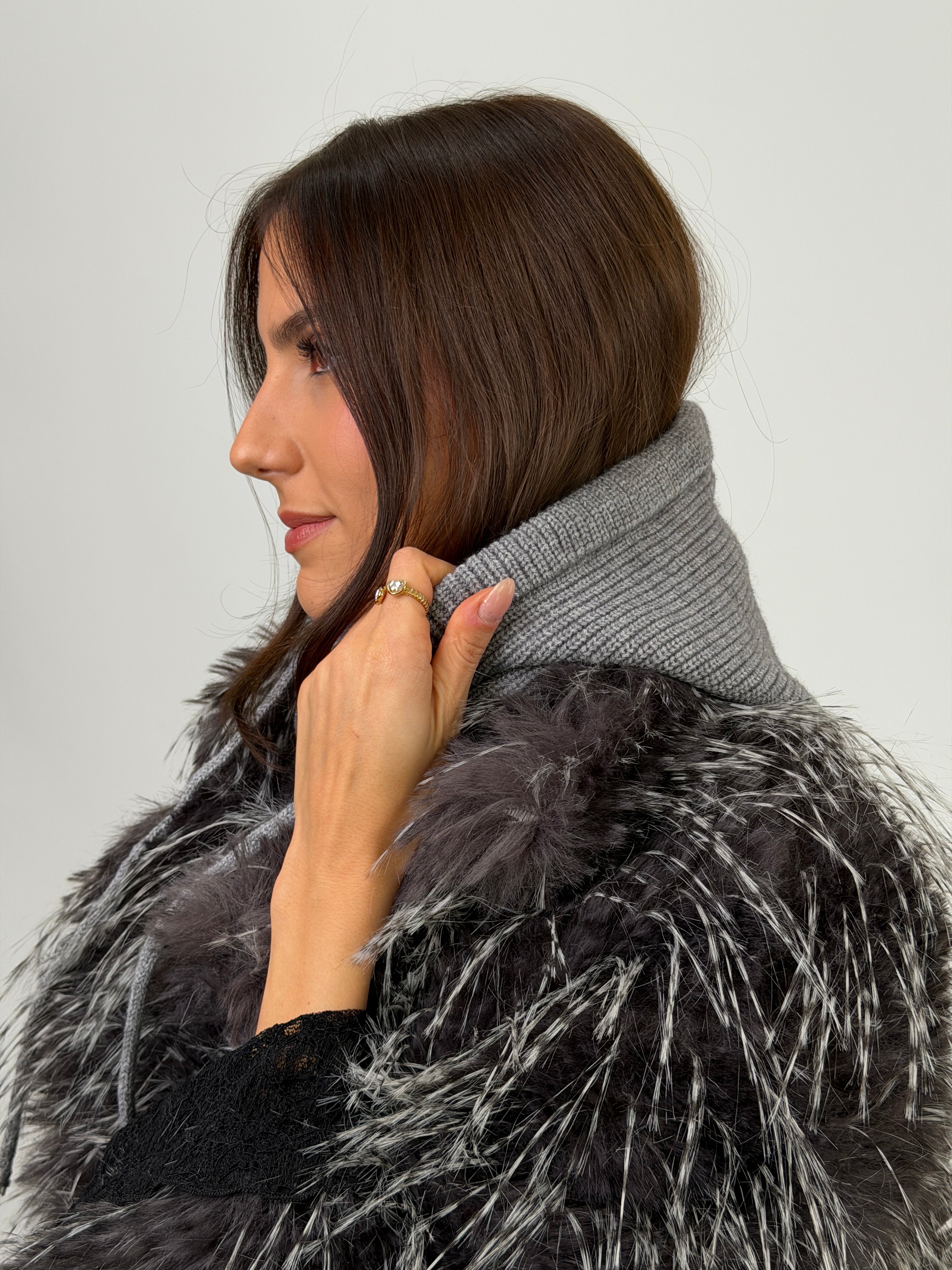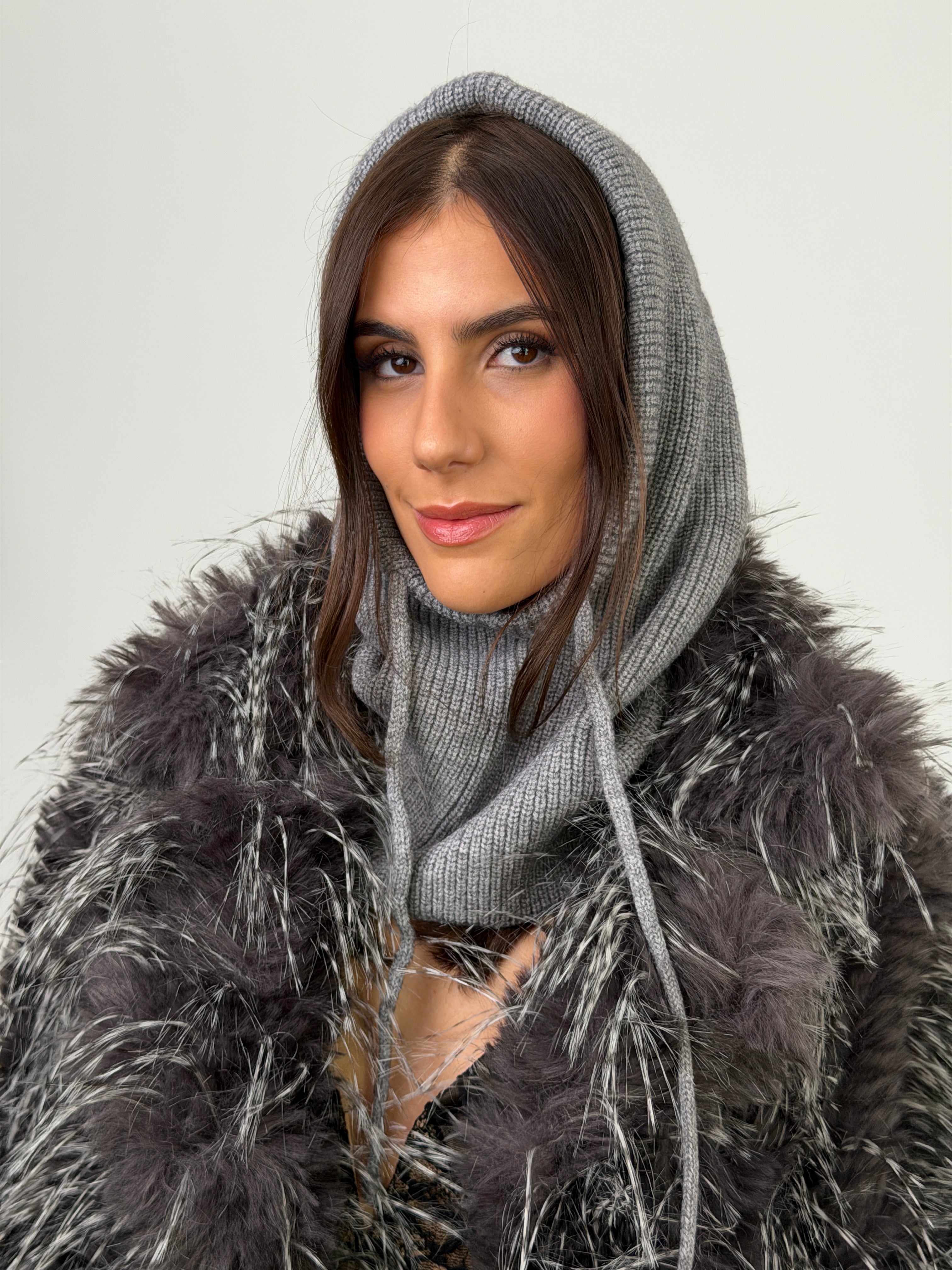 Cagoule en tricot côtelé beige avec cordon de serrage réglable. Élégant et pratique, c'est l'accessoire idéal pour vous protéger du froid avec style pendant l'hiver.