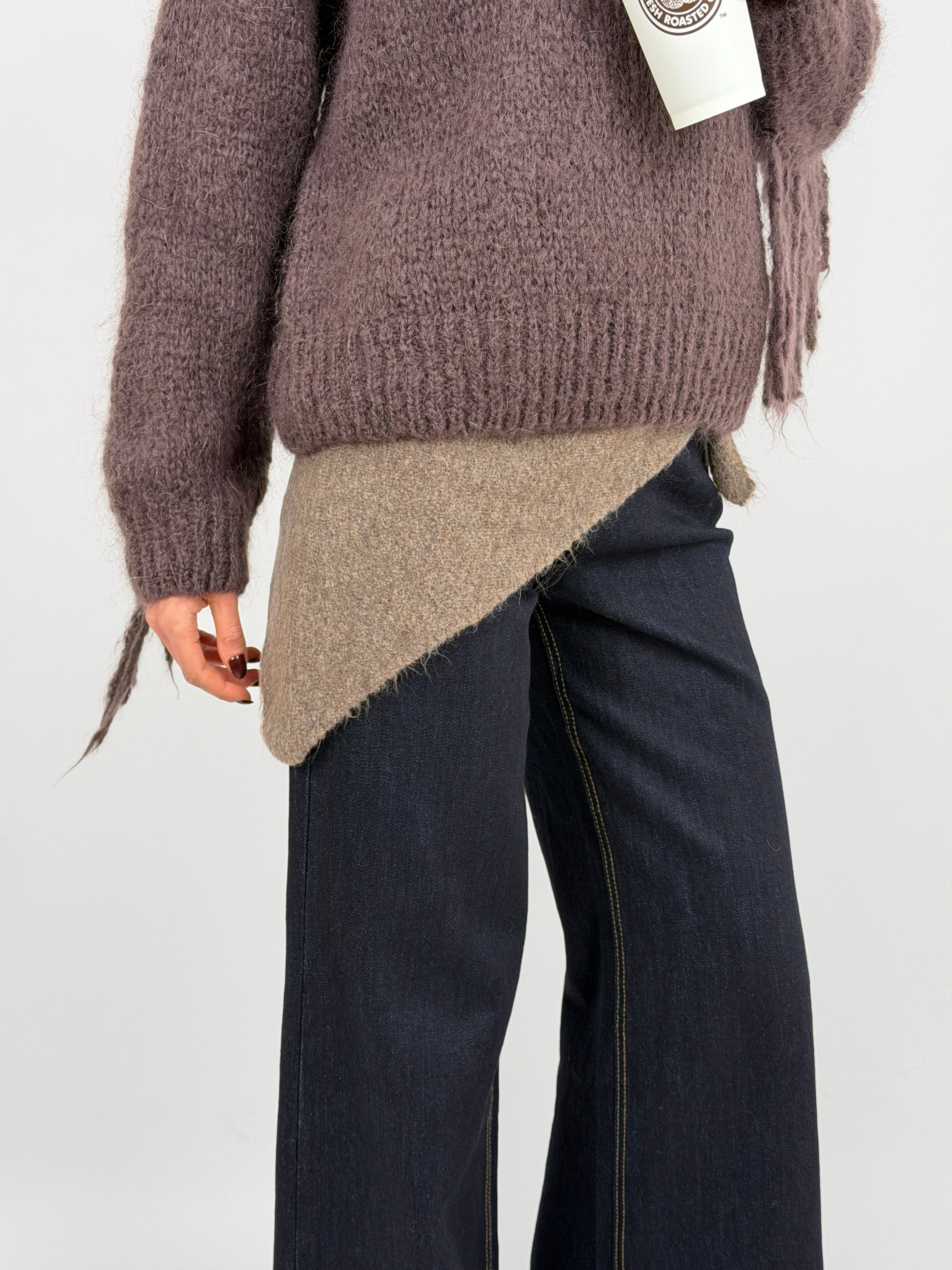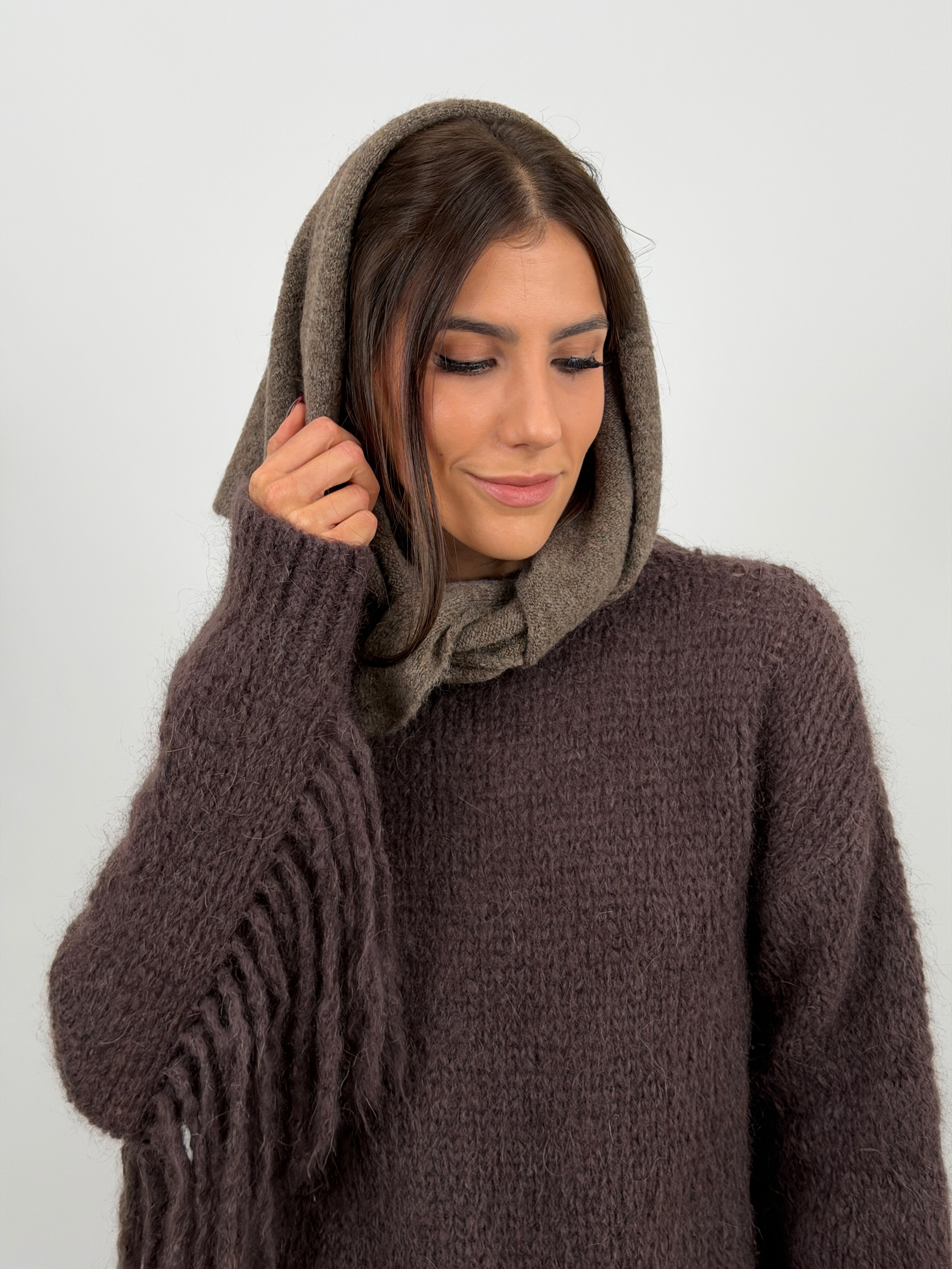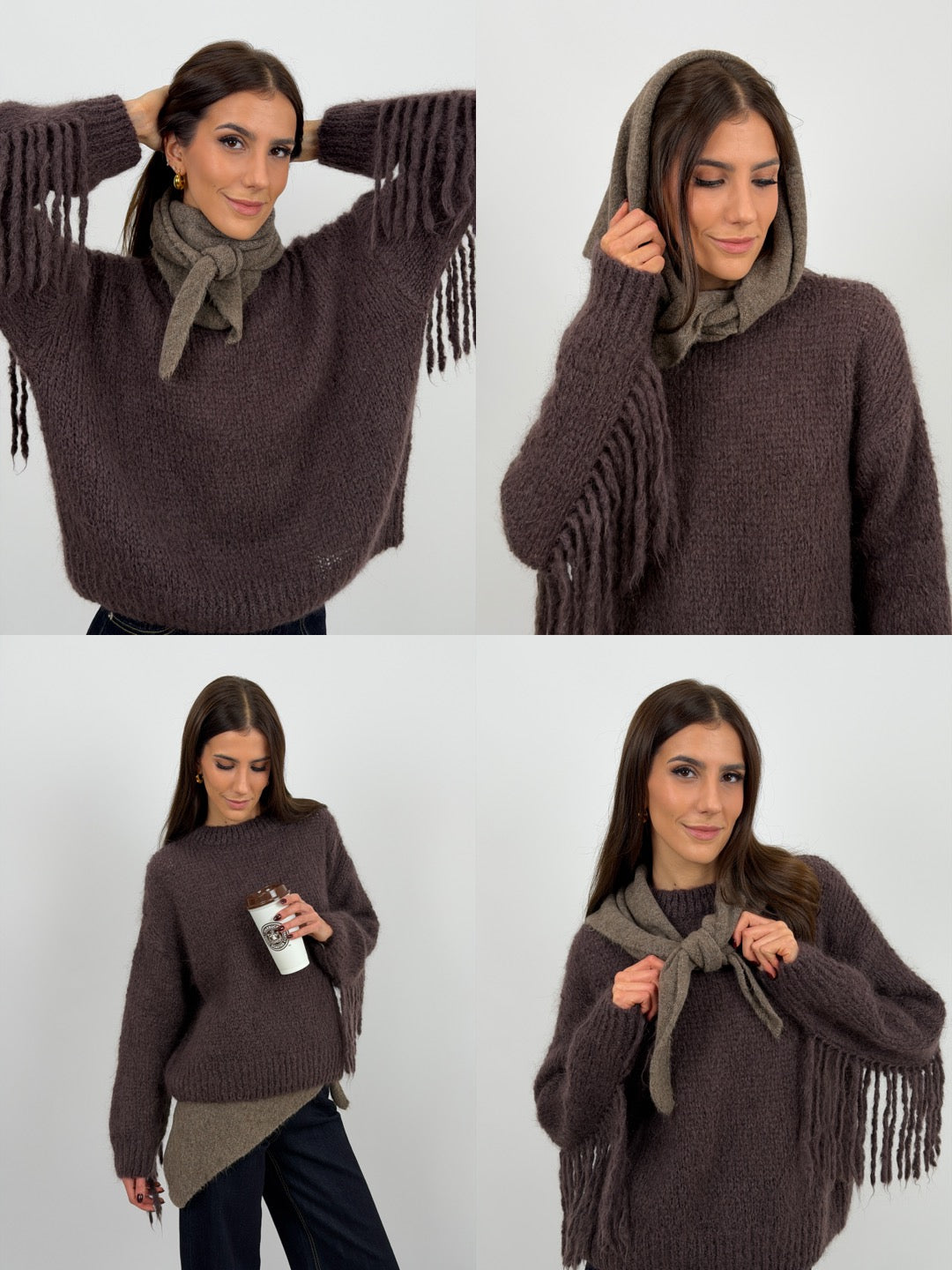 Sciarpa triangolare mocha mousse versatile da indossare in 4 modi diversi, morbida e avvolgente. Accessorio pratico e di tendenza.