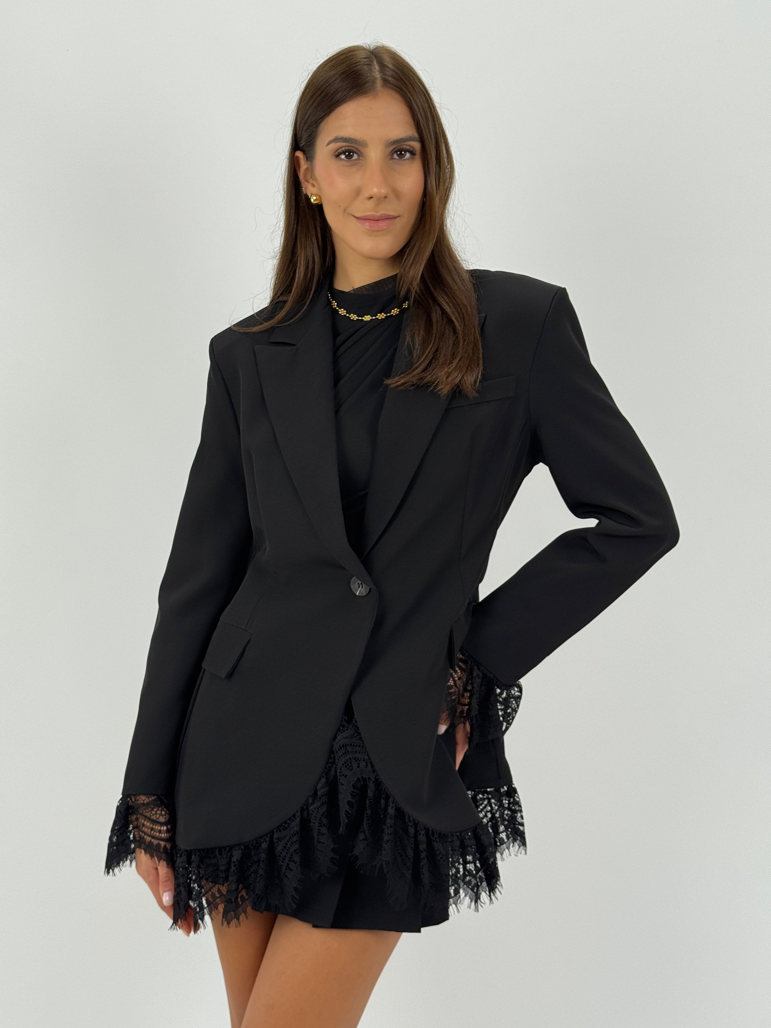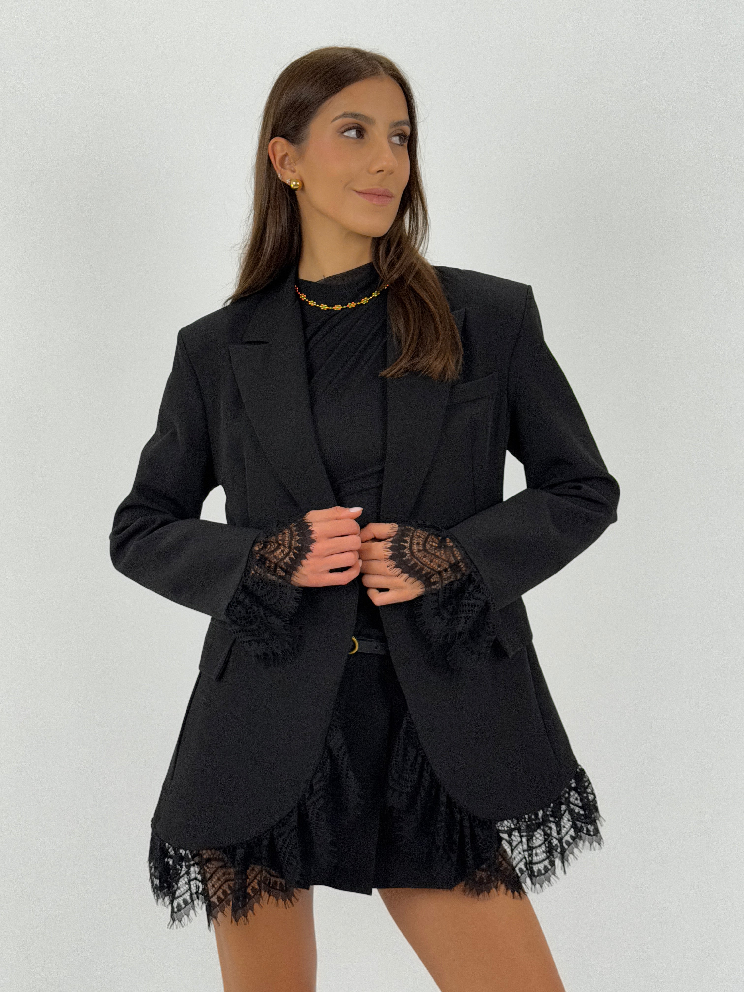 Giacca nera monopetto con raffinati inserti in pizzo tono su tono su polsi e fondo, con fodera interna.