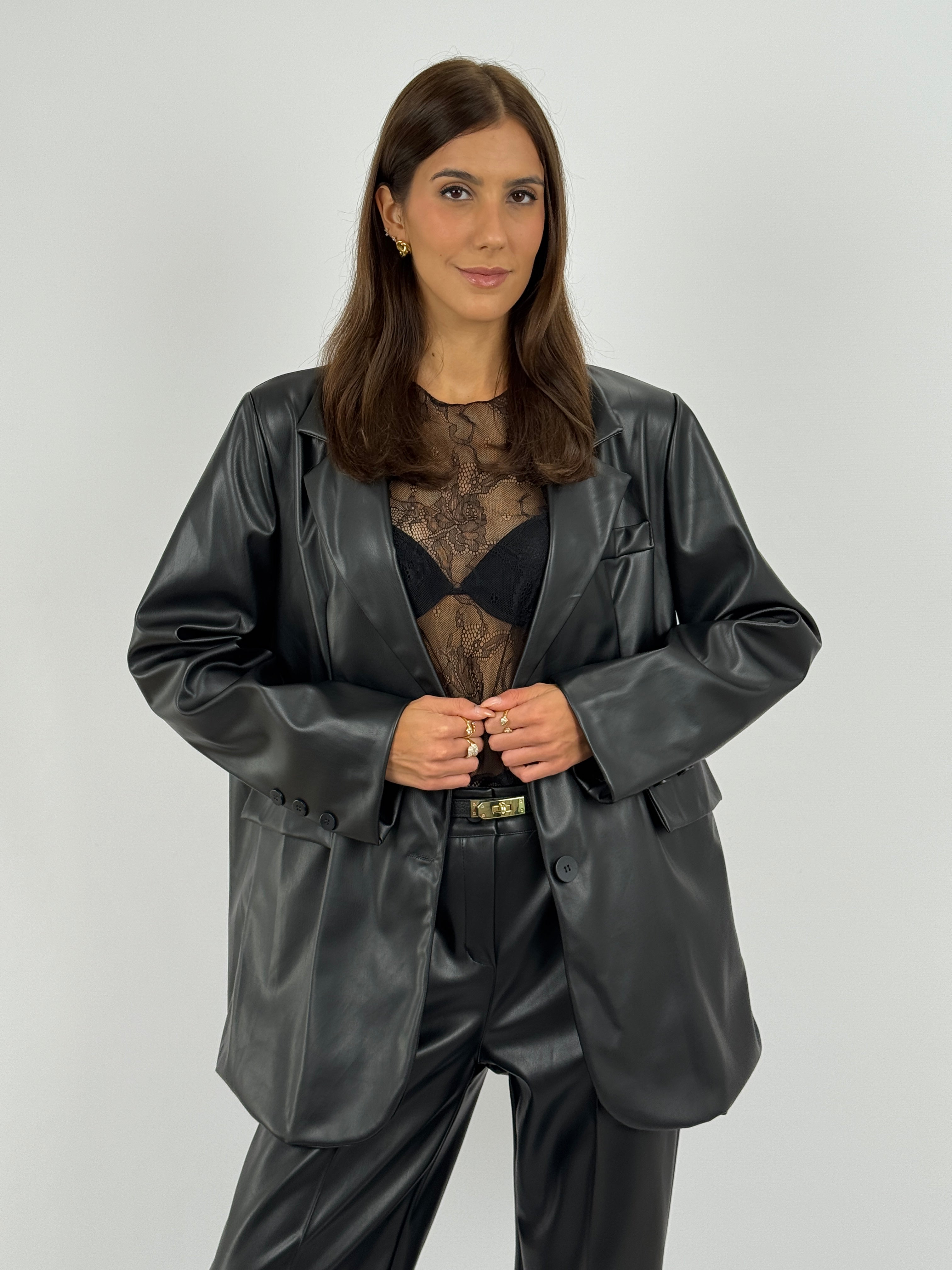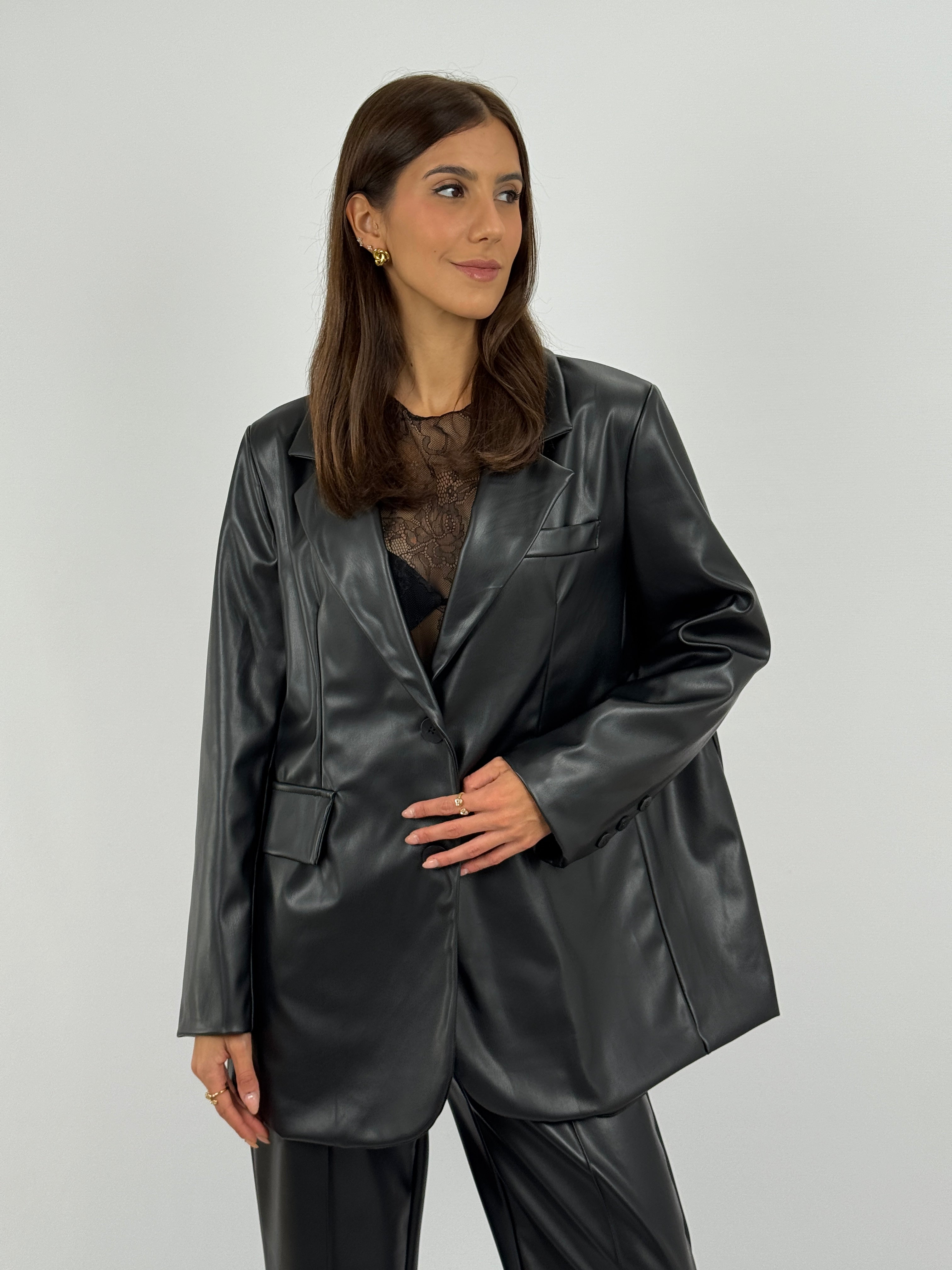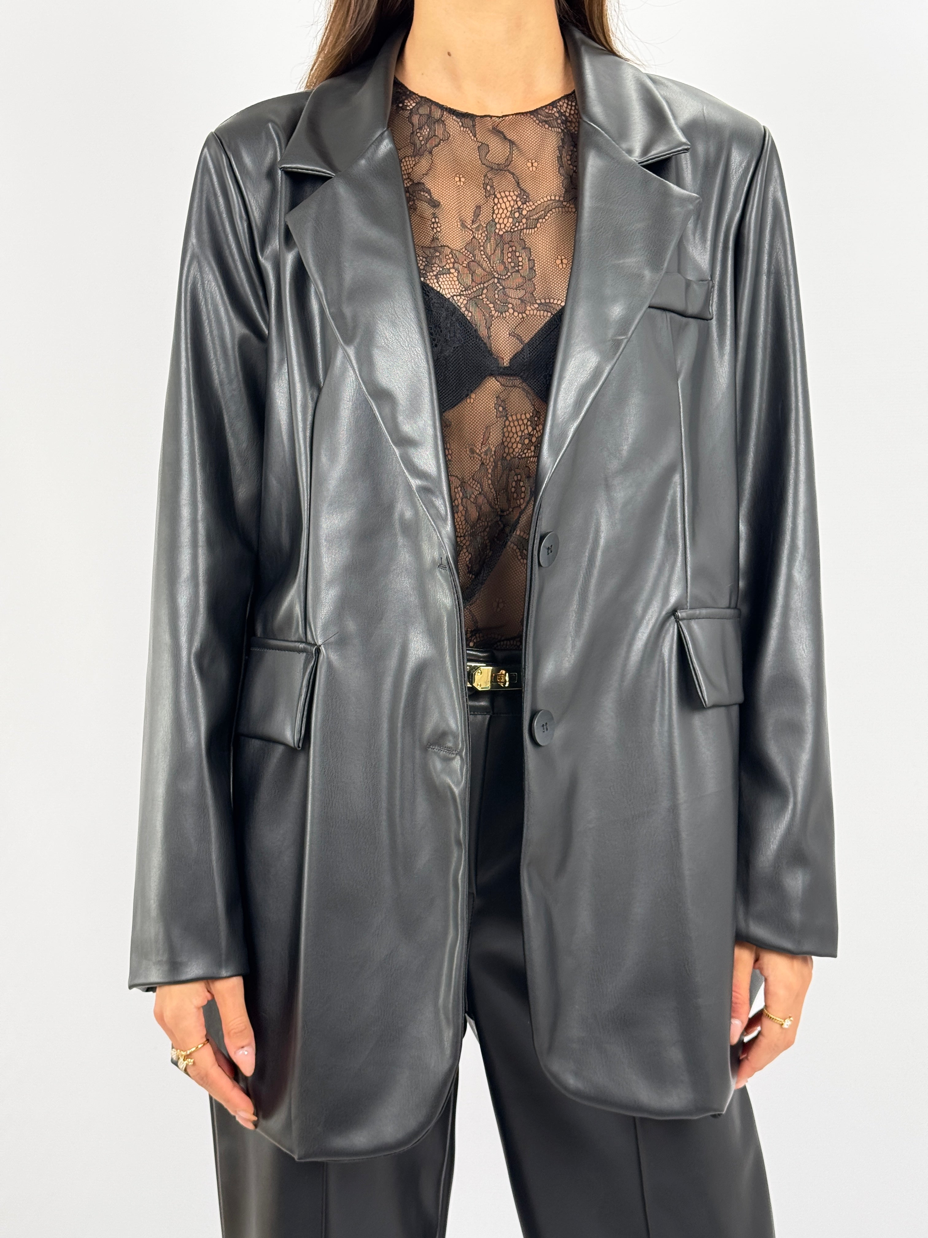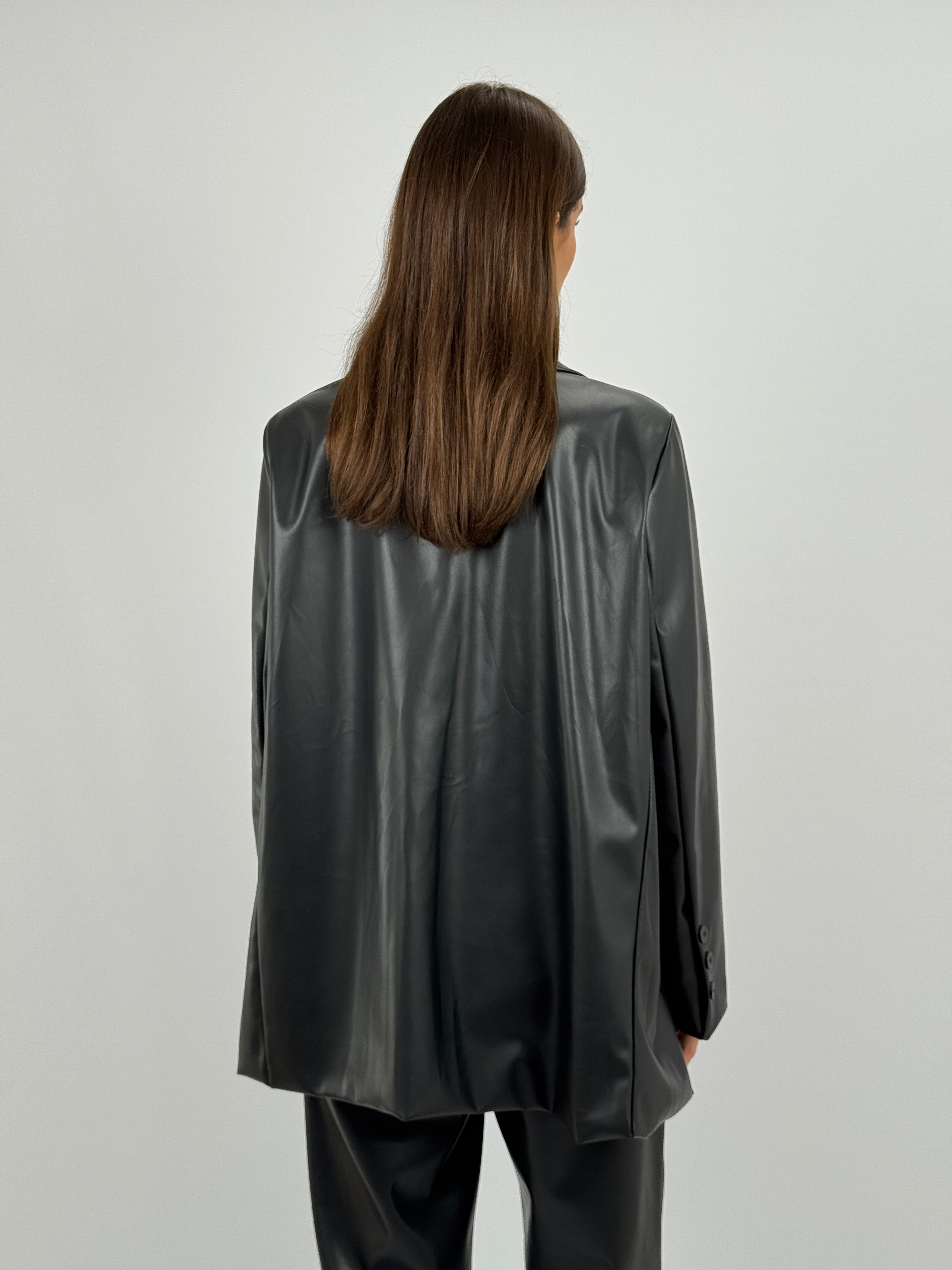Giacca nera oversize in pelle vegana con chiusura monopetto a bottoni e fodera interna. Linea morbida e struttura essenziale.