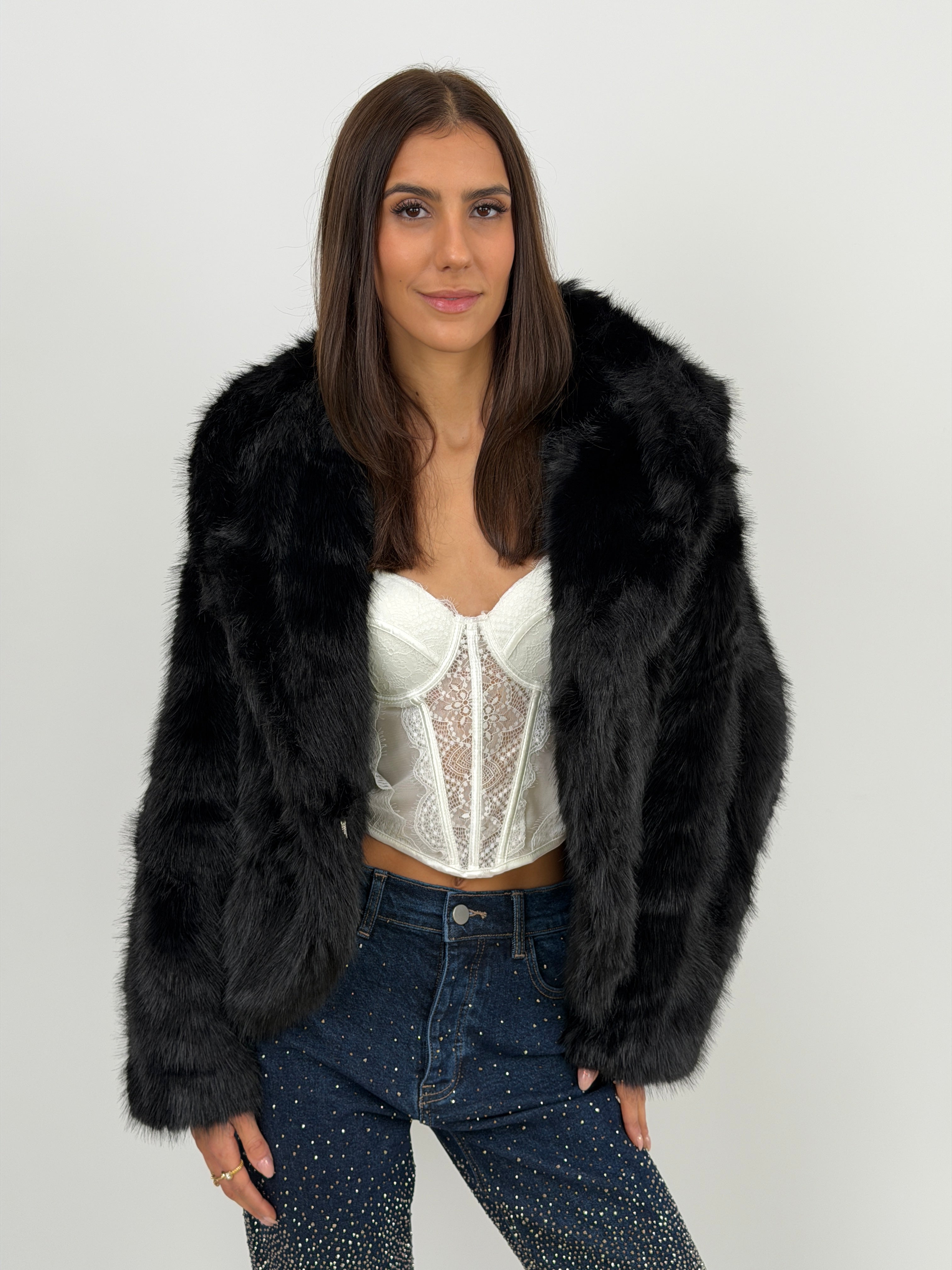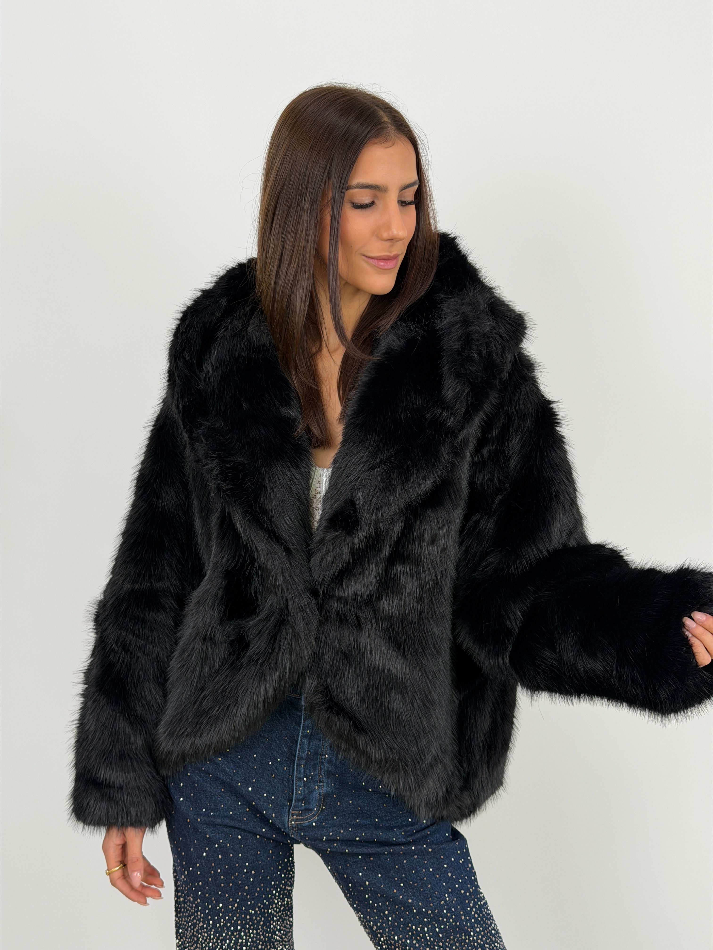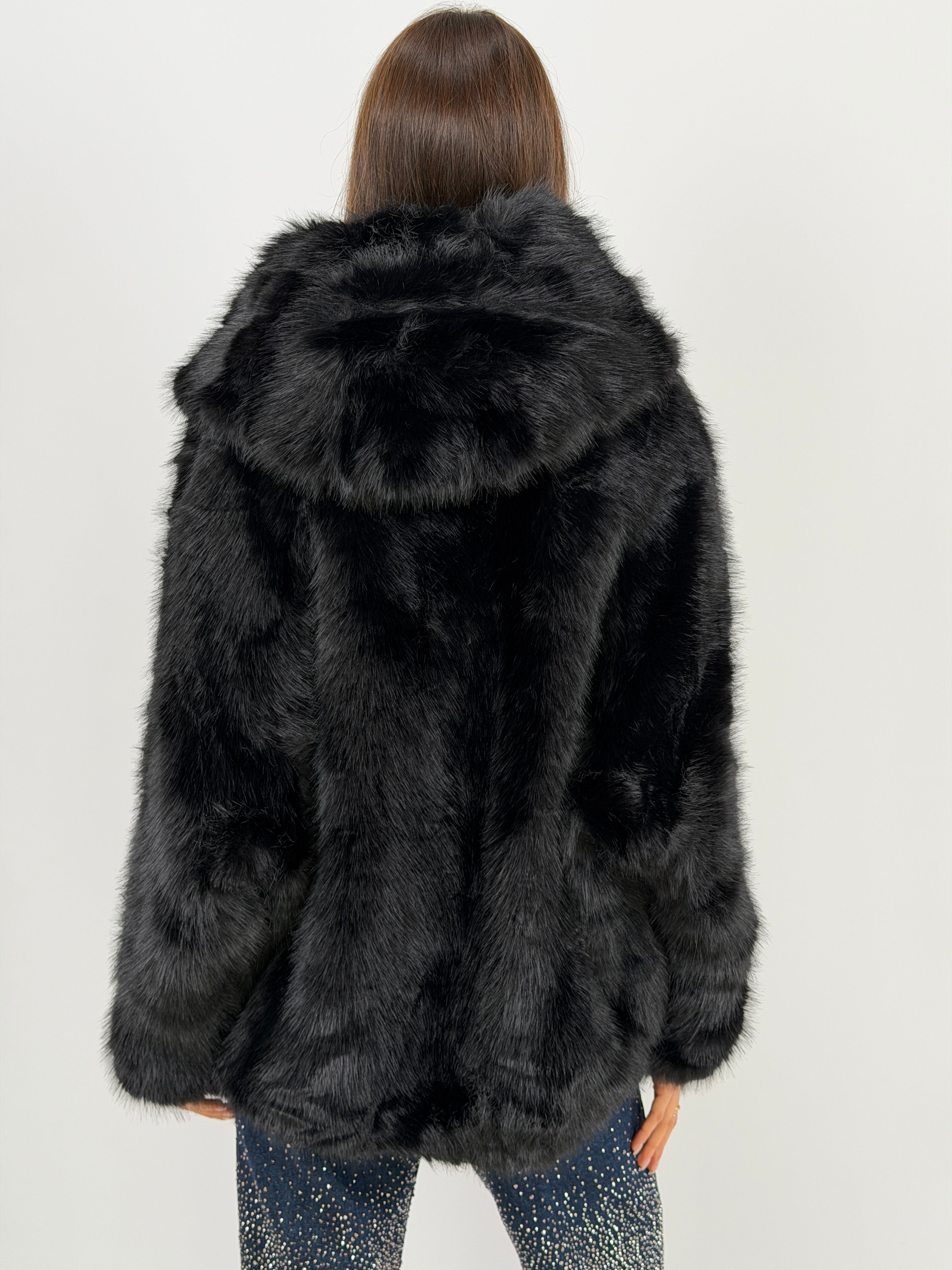 Morbida eco pelliccia nera dal taglio ampio con maxi cappuccio, chiusura frontale con gancetti, tasche laterali e fodera interna.