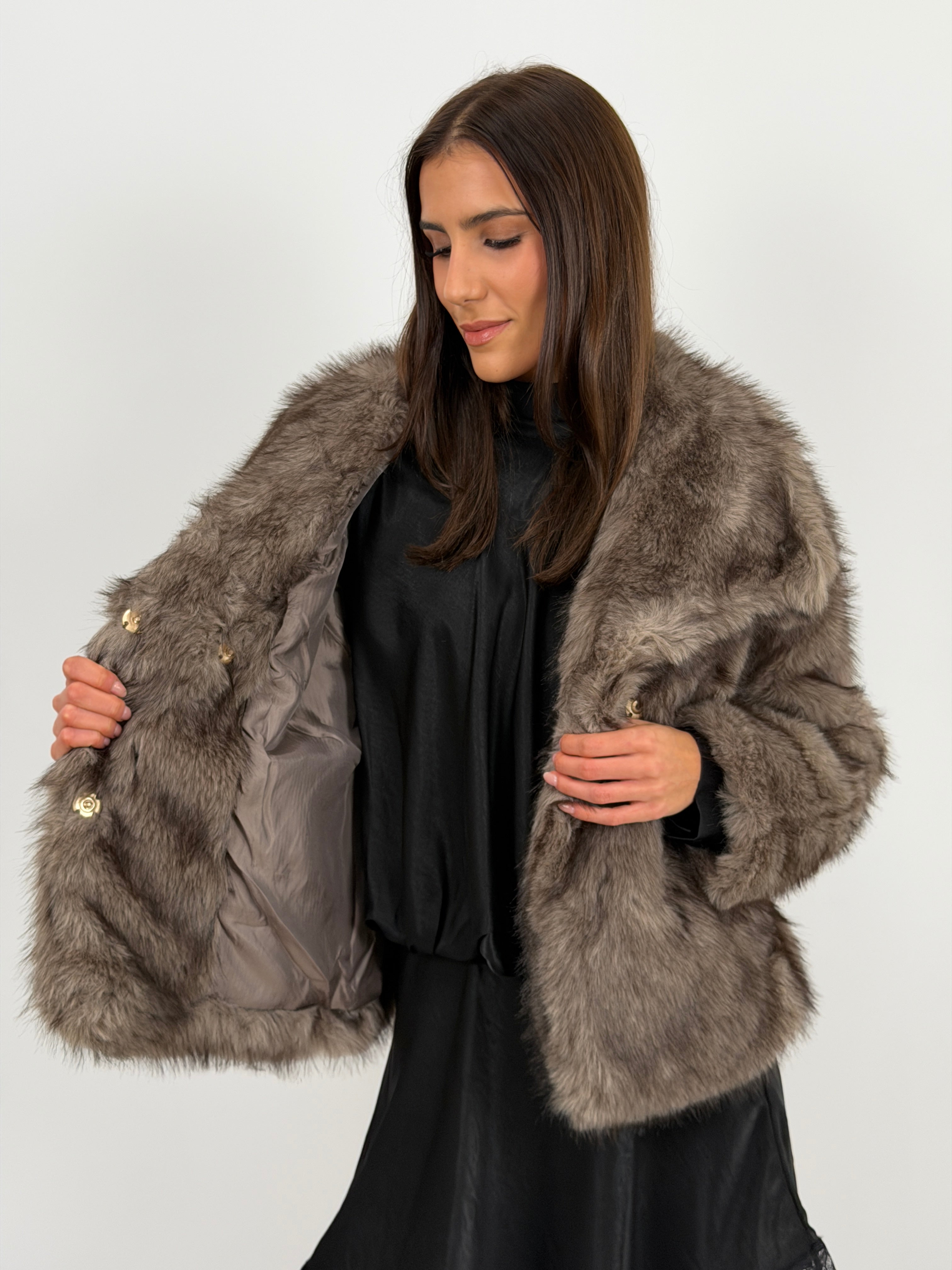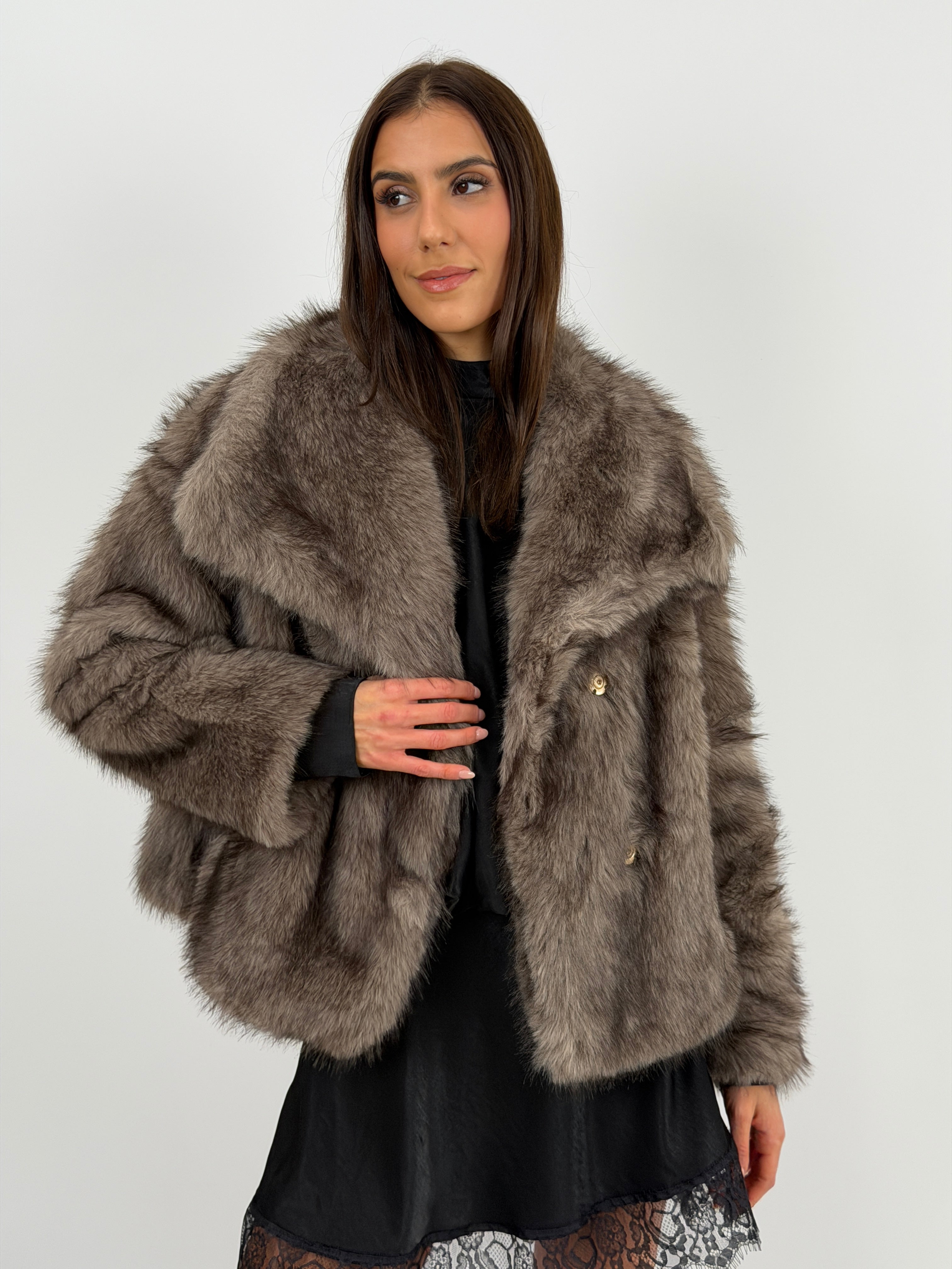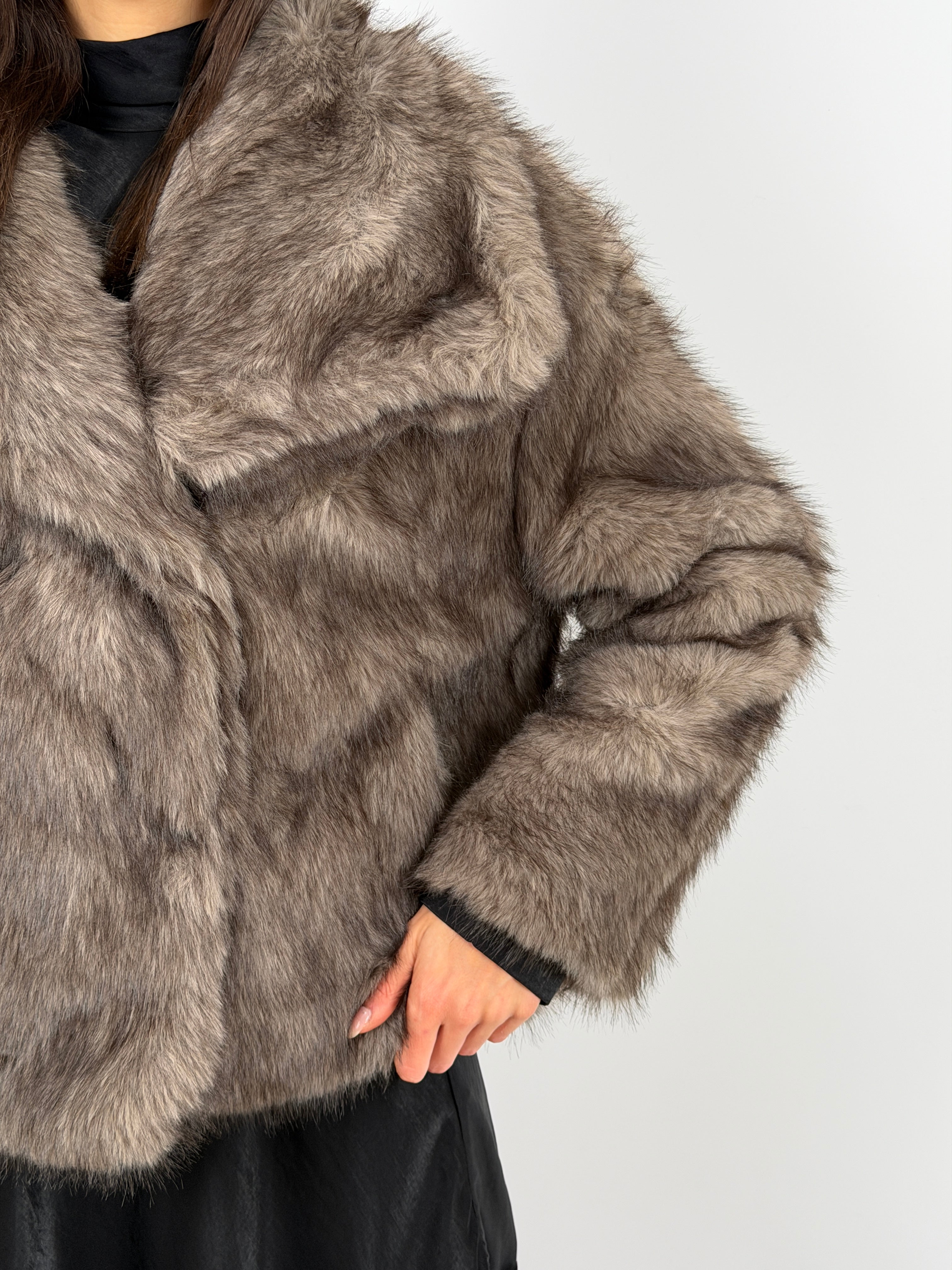 Eco pelliccia tortora morbida con collo ampio a revers, tasche laterali e fodera interna. Struttura avvolgente e tessuto soffice.